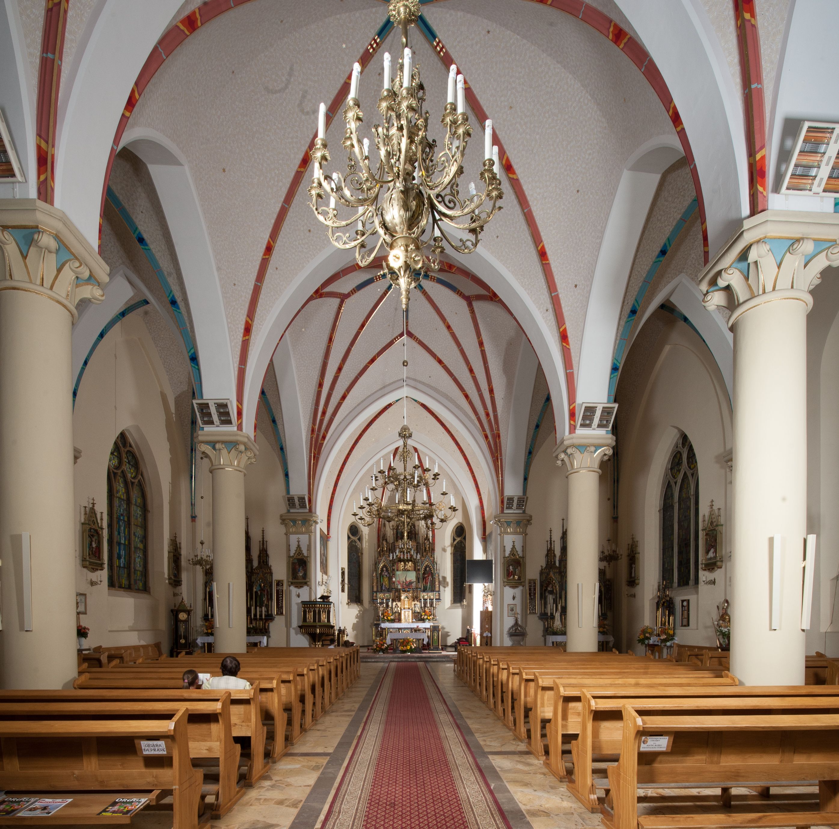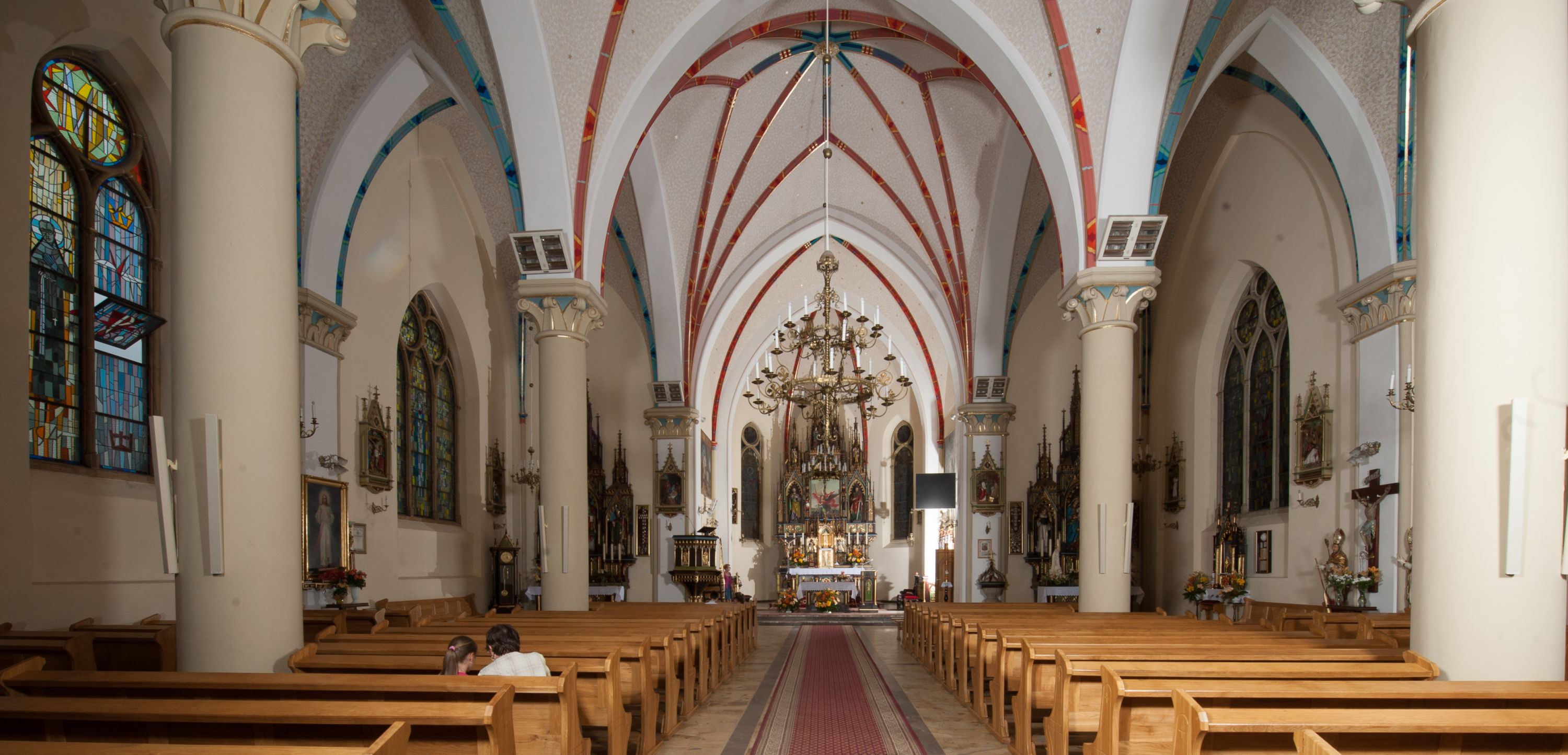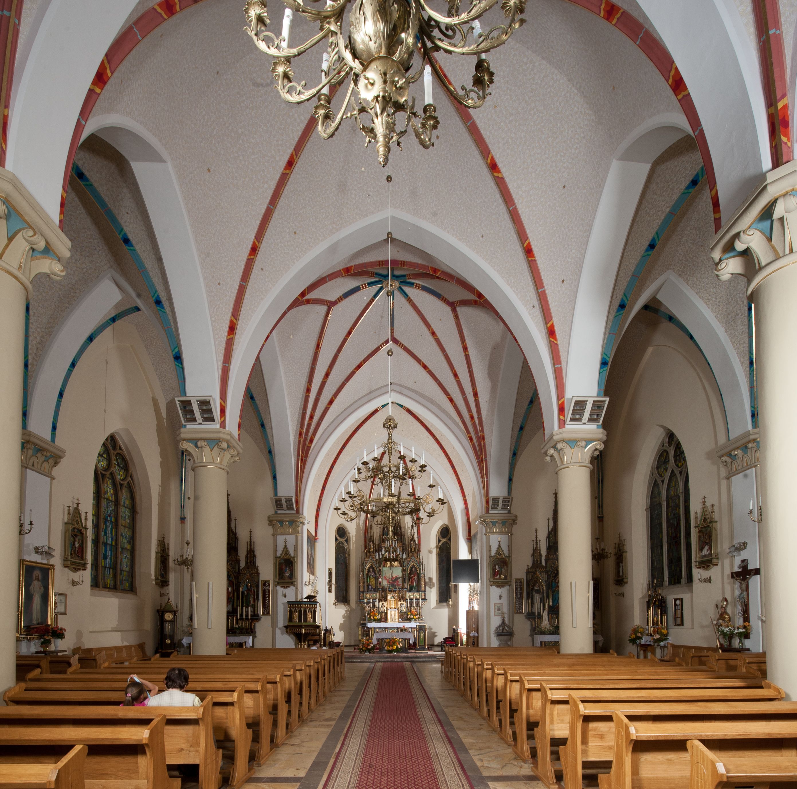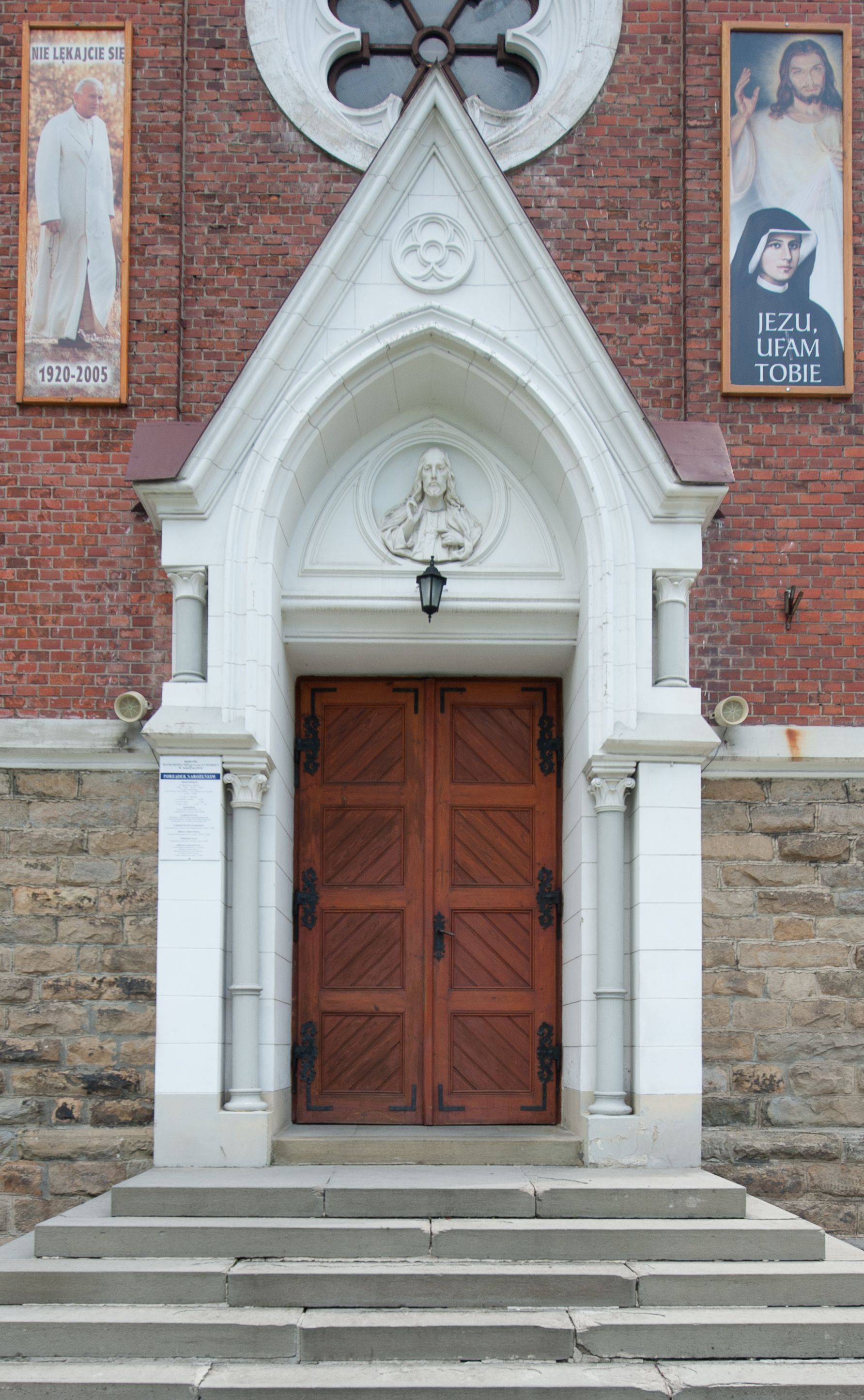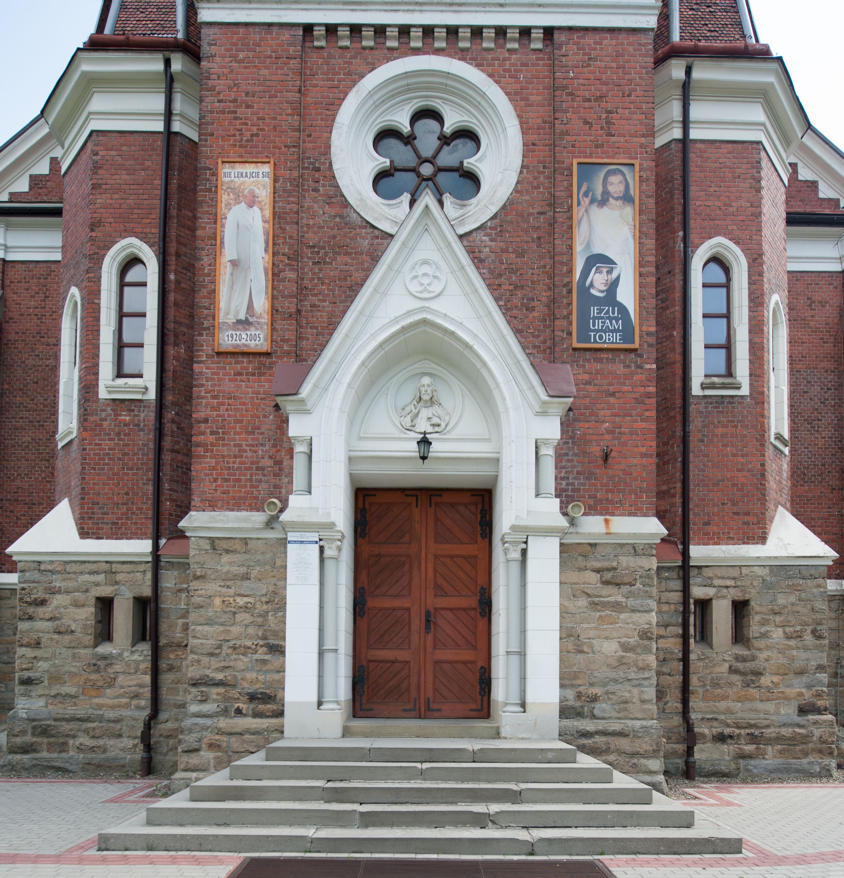 Kościół orientowany, składający się trójnawowej, czteroprzęsłowej pseudohali z transeptem oraz z jednoprzęsłowym, zamkniętym trójbocznie prezbiterium, przy którym od północy usytuowana jest zakrystia, a od południa skarbiec, zamknięte dwubocznie. Od fasady, na przedłużeniu nawy, usytuowana jest czteroboczna wieża, a przy niej ośmioboczne wieżyczki schodowe. Kościół ustawiony jest na wysokim, kamiennym cokole. Wieża trójkondygnacyjna: w dolnej kondygnacji ostrołukowy portal w obramieniu z kolumienkami i wimpergą, nad nim rozeta; w drugiej, ostrołukowe okno z maswerkiem; w trzeciej tryforium. Ściany wieży są zwieńczone szczytami, a wieżyczki schodowe ostrosłupowymi ceglanymi hełmami. Elewacje opięte są przyporami, zwieńczone gzymsem. Okna ostrołukowe z maswerkami, w tynkowanych na biało obramieniach. Dachy dwuspadowe, nad zakrystią i skarbcem pulpitowe, hełm wieży ostrosłupowy; pokrycie blachą. Empora organowa znajduje się w zachodnim przęśle nawy. Sklepienia krzyżowo-żebrowe, przy prezbiterium – gwiaździste. Nawy oddzielone kolumnami o kapitelach pączkowych; na ścianach naw bocznych pilastry. Chór muzyczny na kolumnach z kapitelami kostkowymi. Okna prostokątne zakończone ostrołukowo, w prezbiterium: jednodzielne, usytuowane w trzech ścianach zamknięcia chóru, z witrażami; w korpusie nawowym: trój- i dwudzielne, w pierwszych (wschodnich) trzech przęsłach z witrażami. Żebra sklepienne podkreślone polichromią. Portal główny zdobi tondo z płaskorzeźbą Najświętszego Serca Pana Jezusa.