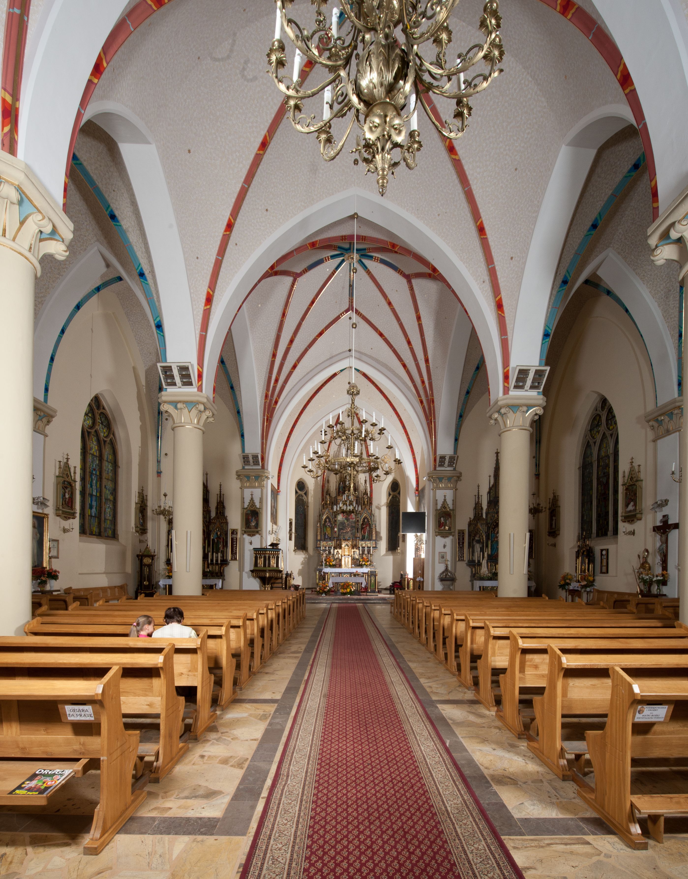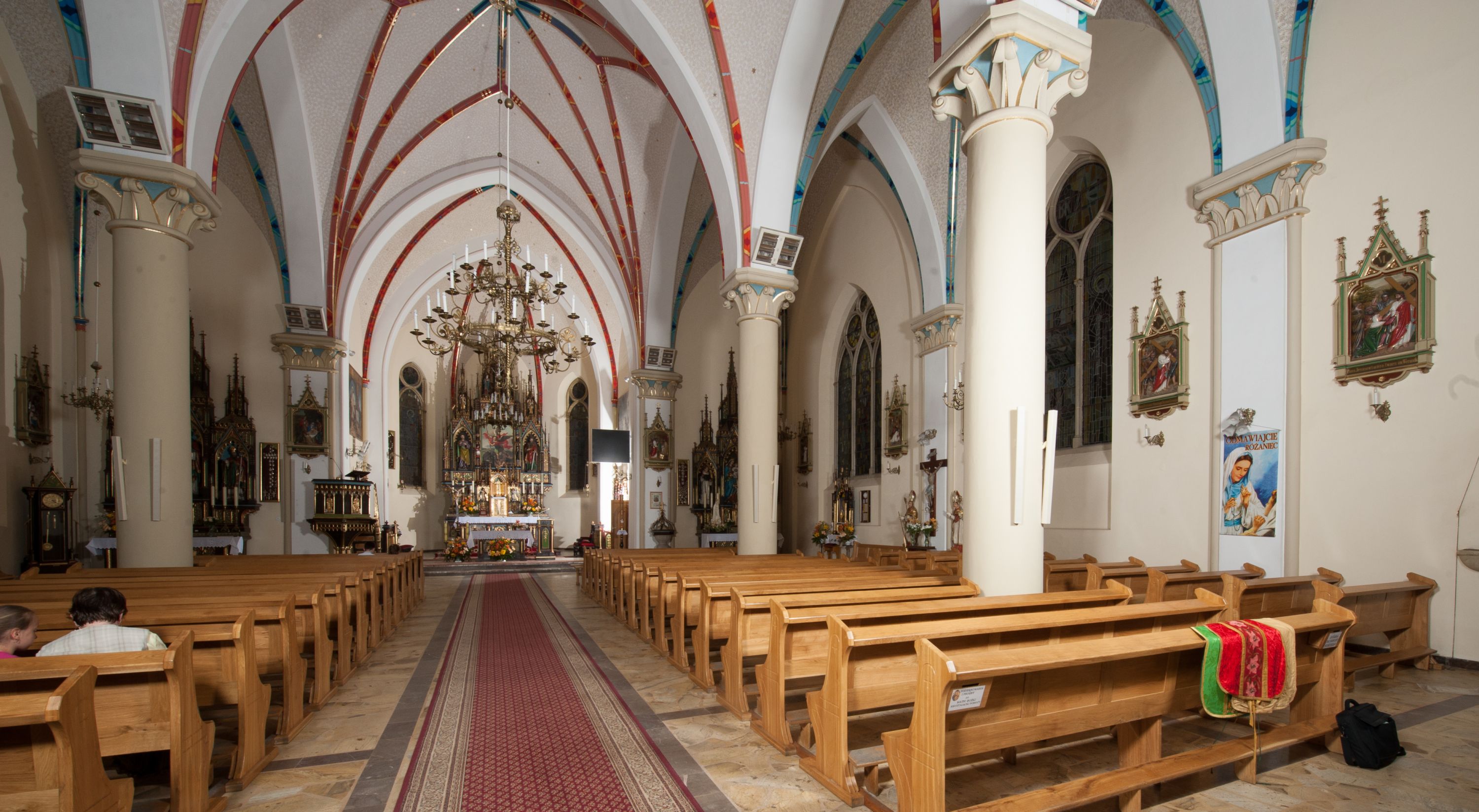 Główną część wyposażenia kościelnego stanowią wyżej wymienione ołtarze utrzymane w jednolitym, neogotyckim stylu, wykonane około 1903 roku w pracowni tyrolskiego rzeźbiarza Ferdinanda Stuflessera. Część obrazów i rzeźb została przeniesiona ze starej świątyni. Zachowało się wiele barokowych obrazów z drugiej połowy XVII wieku tj. „Zaślubiny św. Katarzyny”, „Męczeństwo św. Szczepana”, „Św. Anna Samotrzeć”, a także obraz Matka Boska Niepokalanie Poczęta (XVIII w.), barokowe rzeźby przedstawiające św. Stanisława Biskupa oraz św. Wojciecha. Ponadto w kościele znajdują się: barokowa, kamienna chrzcielnica, konfesjonał z XVIII wieku oraz trzy barokowe feretrony. Do nowego wyposażenia kościoła zaliczają się dwa nowe ołtarze: Pana Jezusa Miłosiernego oraz św. Jana Pawła II. Świątynię zdobią również witraże w prezbiterium: z postaciami aniołów oraz Matki Boskiej i św. Józefa; w nawach, od południa: św. Jana Pawła II, św. Brata Alberta i Najświętsze Serce Pana Jezusa, od północy: św. Faustyny Kowalskiej, św. Maksymiliana Marii Kolbego i Matki Boskiej Bolesnej.