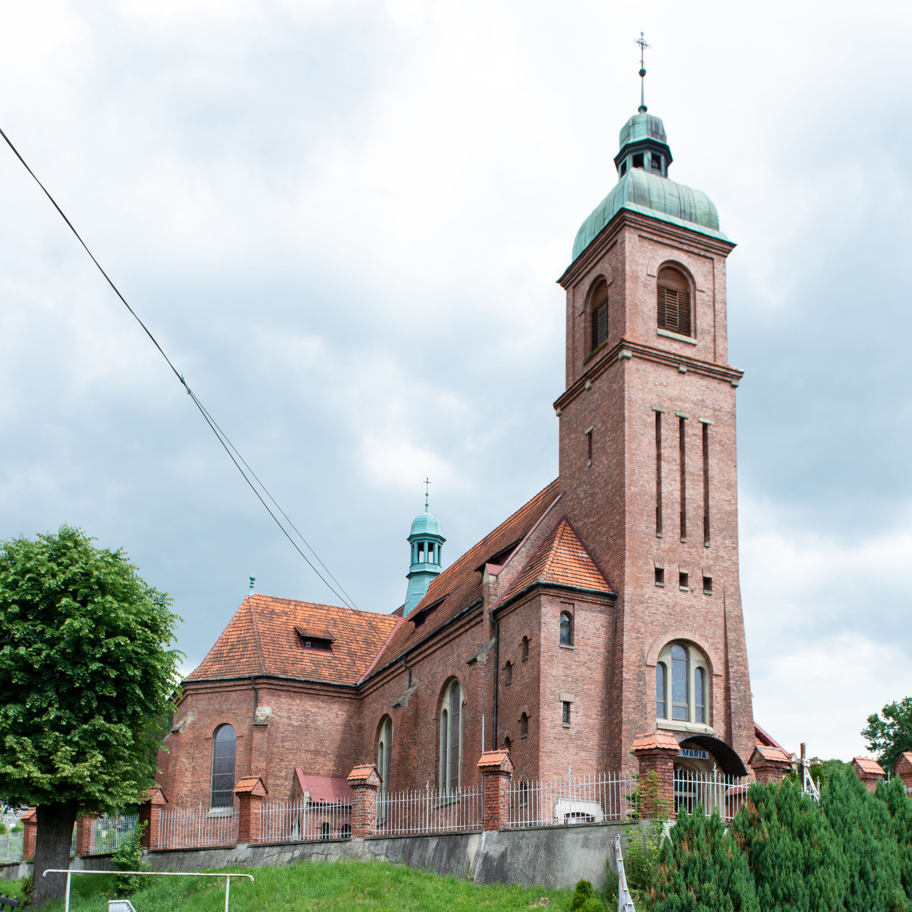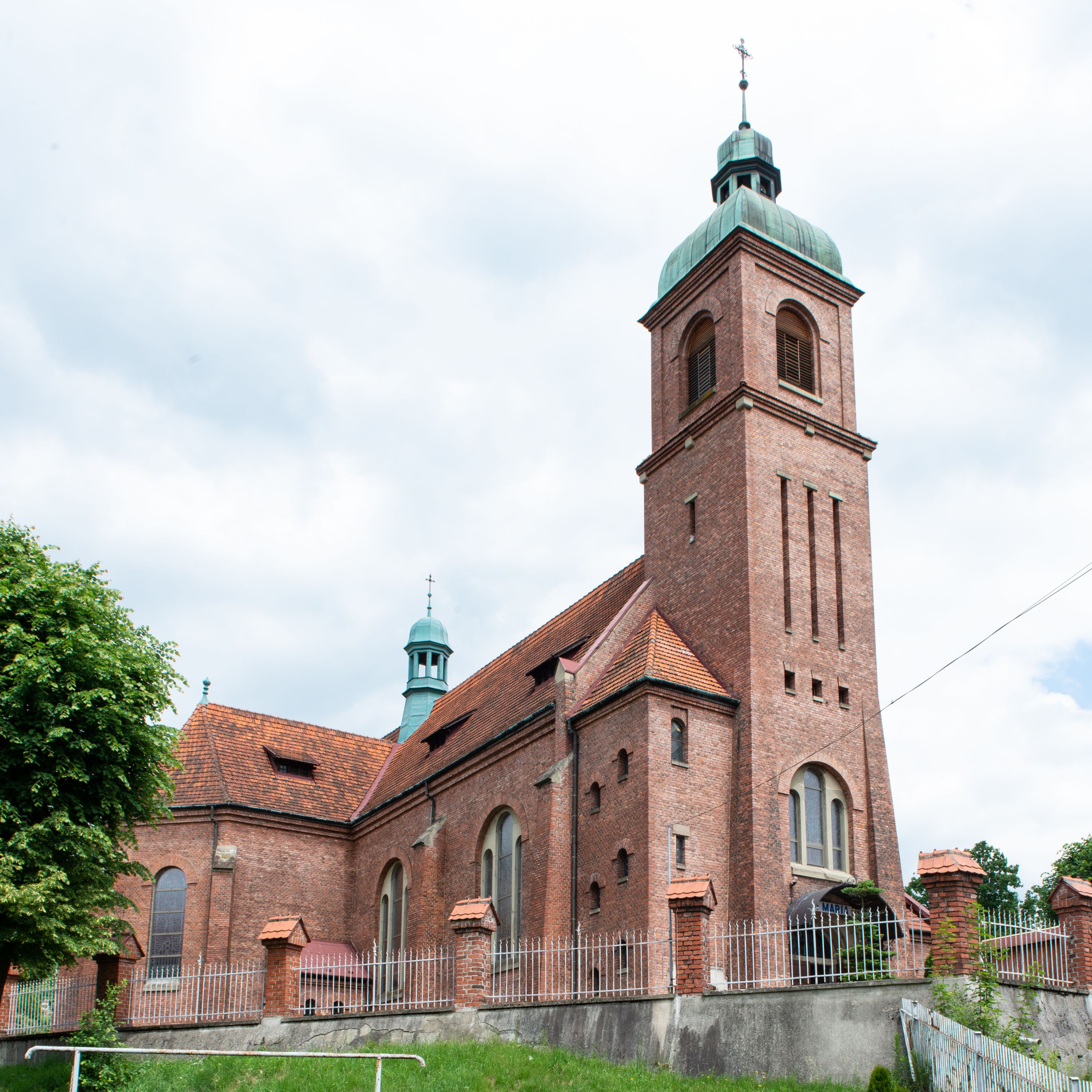 Kościół na planie krzyża łacińskiego, jednonawowy, z transeptem, zamknięty trójbocznym prezbiterium od północy i dobudowaną do niego zakrystią; na skrzyżowaniu nawy głównej i ramion transeptu wieżyczka na sygnaturkę. Fasadę tworzy masywna wieża, zwieńczona hełmem pokrytym blachą miedzianą. Główne wejście do kościoła od strony południowej, poprzez neoromański portal; wejścia boczne zlokalizowane od wschodu i zachodu, na styku nawy głównej i transeptu poprzez niewielkie kruchty. W oknach, w nawie współczesne witraże przedstawiające tajemnice różańca świętego; w prezbiterium Chrystusa ukrzyżowanego, św. Jana Pawła II i kardynała Stefana Wyszyńskiego, a w transepcie świętych zakonników: M. M. Alacoque, brata Alberta i siostrę Faustynę oraz św. Maksymiliana Marię Kolbego i bł. księdza Jerzego Popiełuszkę.