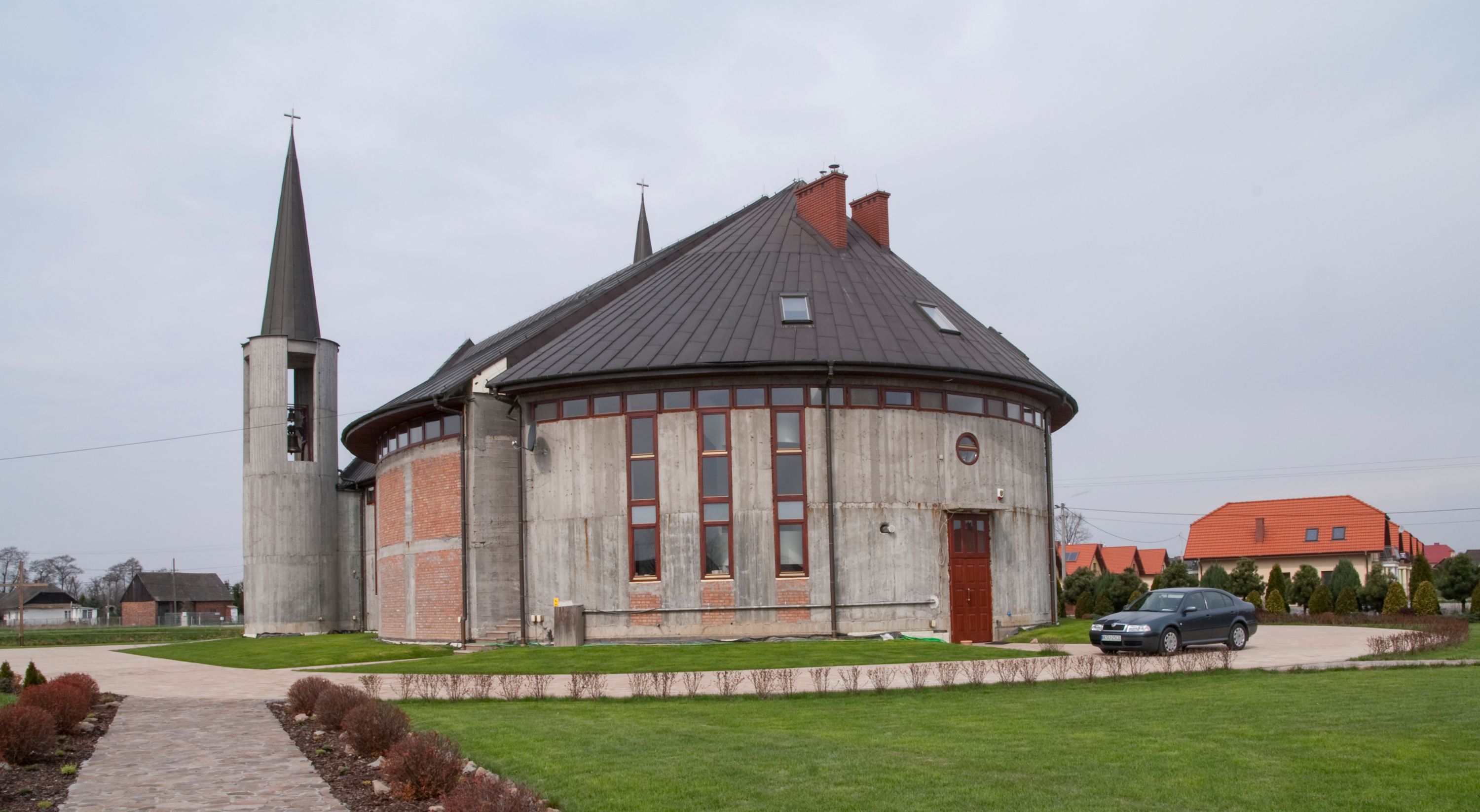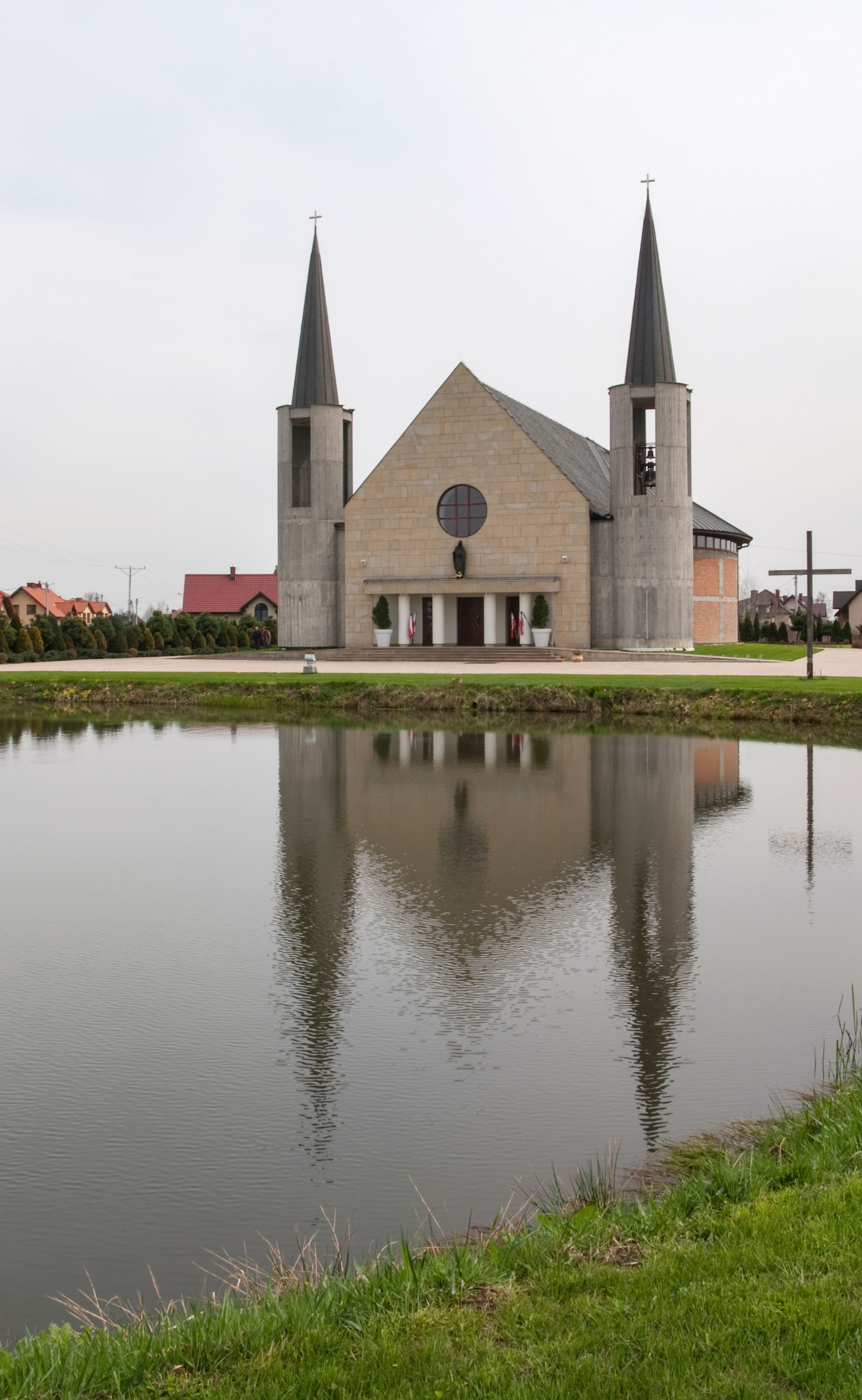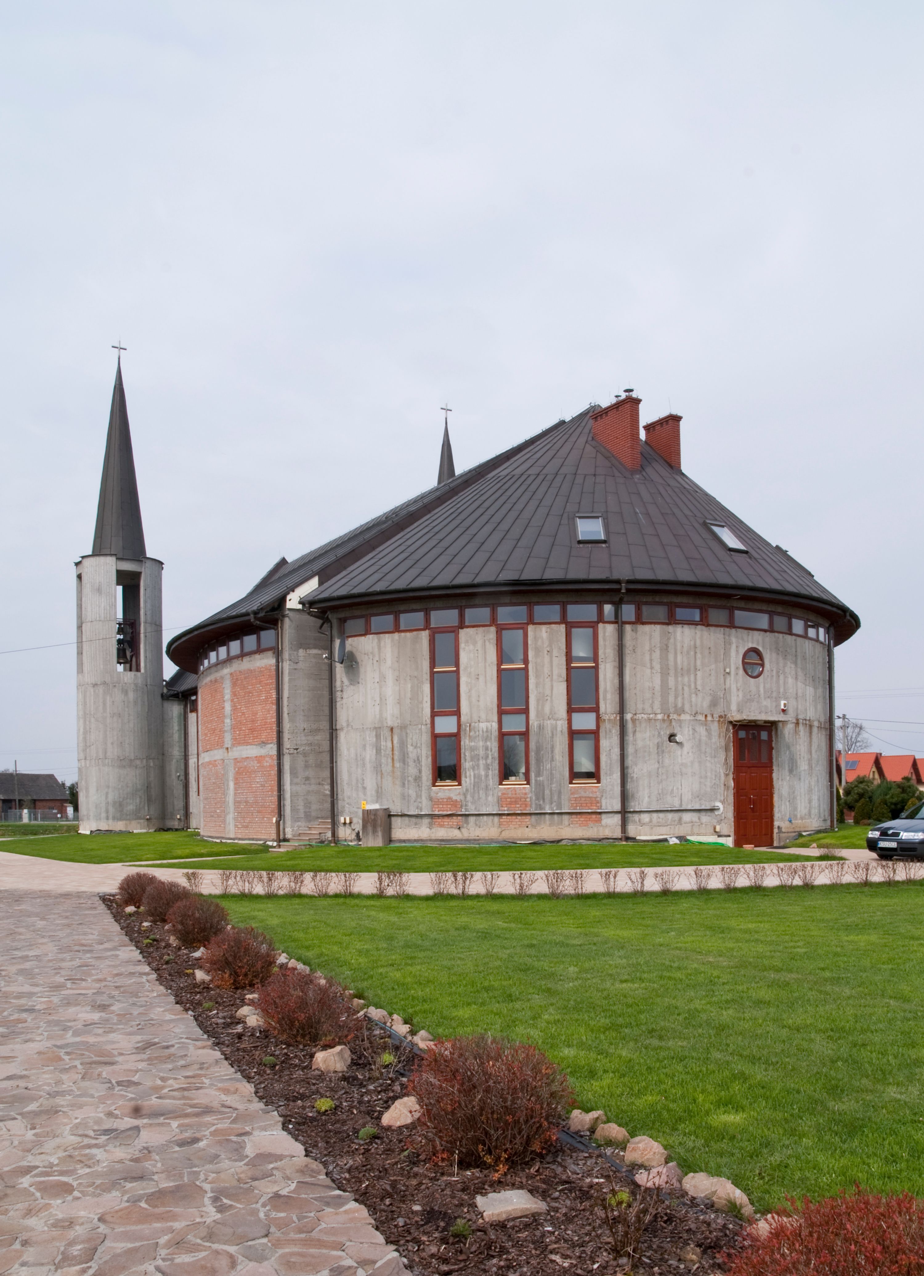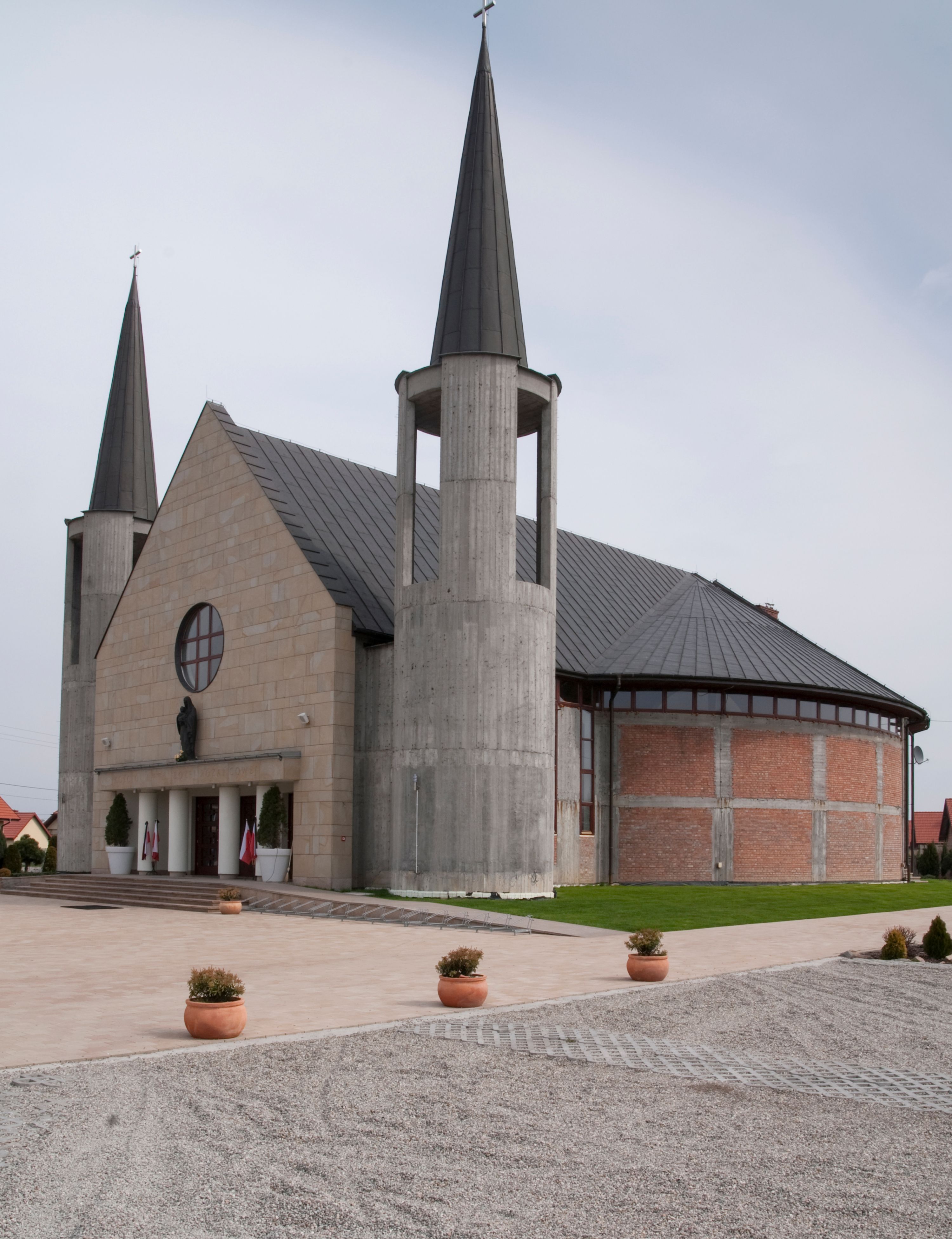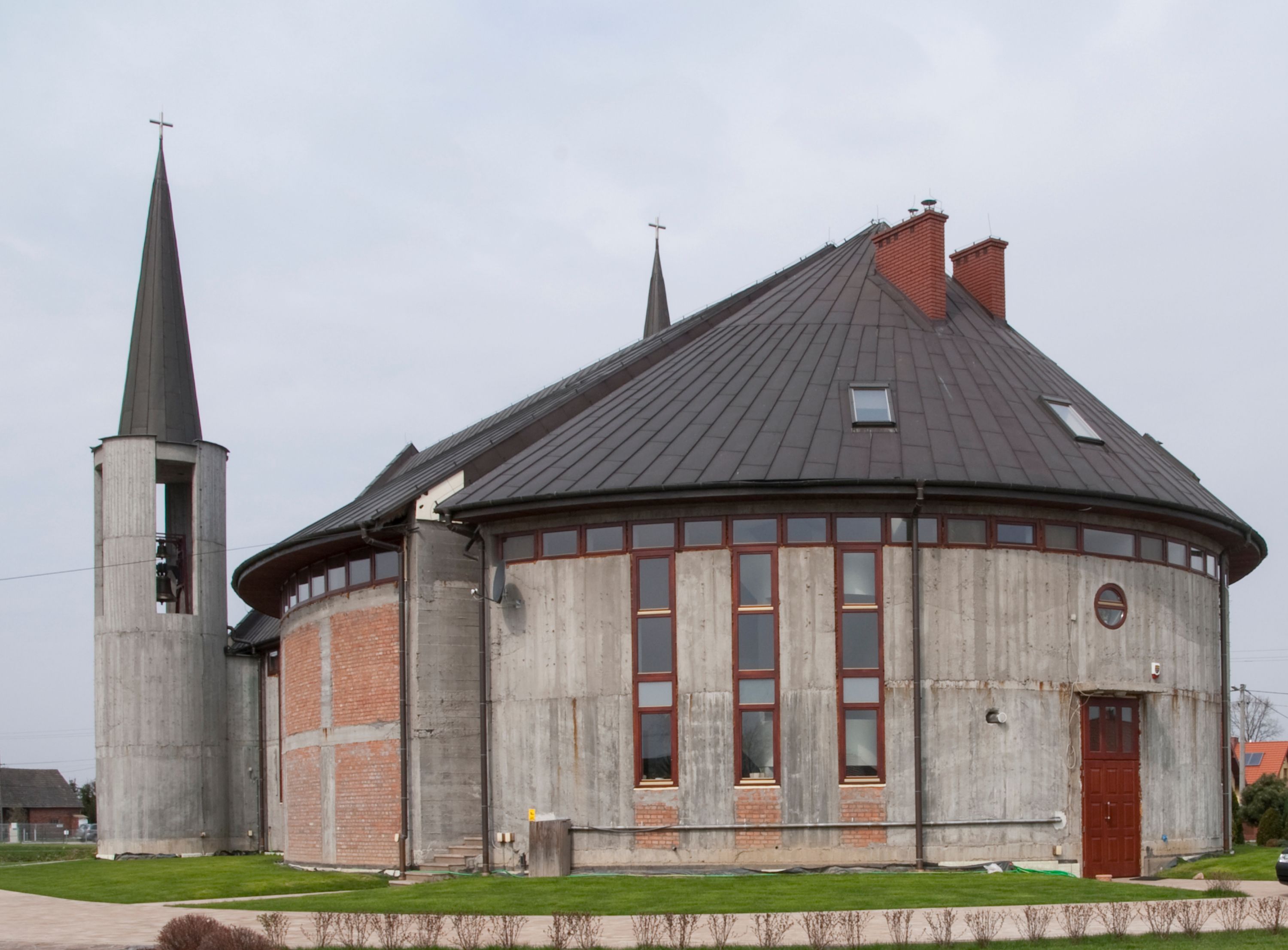 Kościół usytuowany na dużej działce o nieregularnym kształcie. Świątynia otoczona trawnikiem, w którym wydzielono niewielkie klomby kwiatowe i ciągi komunikacyjne. Kościół orientowany, jednonawowy, jednoprzestrzenny z prezbiterium zamkniętym od zewnątrz szeroką absydą. Ściany boczne nawy od strony wschodniej założone na planie odcinka koła. Wnętrze jednoprzestrzenne, z widoczną konstrukcją otwartej więźby dachowej. Widoczne, drewniane belki wspierające się na 12 kolumnach, ustawionych w dwa rzędy, w układzie powtarzających rytm ścian. Prezbiterium na trójstopniowym wzniesieniu, oddzielone od nawy ścianą tęczową, zamknięte prostą ścianą. Od strony zachodniej chór muzyczny konstrukcji żelbetowej o pełnym, prostym parapecie, wsparty na dwóch okrągłych filarach. Po cztery pionowe okna łączące się w górnych partiach z świetlikiem obiegającym całą nawę. Mury zakończone uproszczonym gzymsem. W północno-zachodnim narożu niewielka kaplica Jana Pawła II, założona na planie koła. Fasada kościoła z trójkątną ścianą szczytową wyłożoną okładziną kamienną z umieszczonym w osi dużym okrągłym oknem, ujęta dwoma betonowymi wieżami na planie koła. W górnej części wieże z prześwitami na dzwony, nakryte strzelistymi, ostrosłupowymi dachami. W przyziemiu portyk wejściowy w formie czterech kolumn dźwigających masywny gzyms z napisem: „KOŚCIÓŁ MATKI BOSKIEJ RÓŻAŃCOWEJ”, powyżej rzeźba Madonny z Dzieciątkiem.
