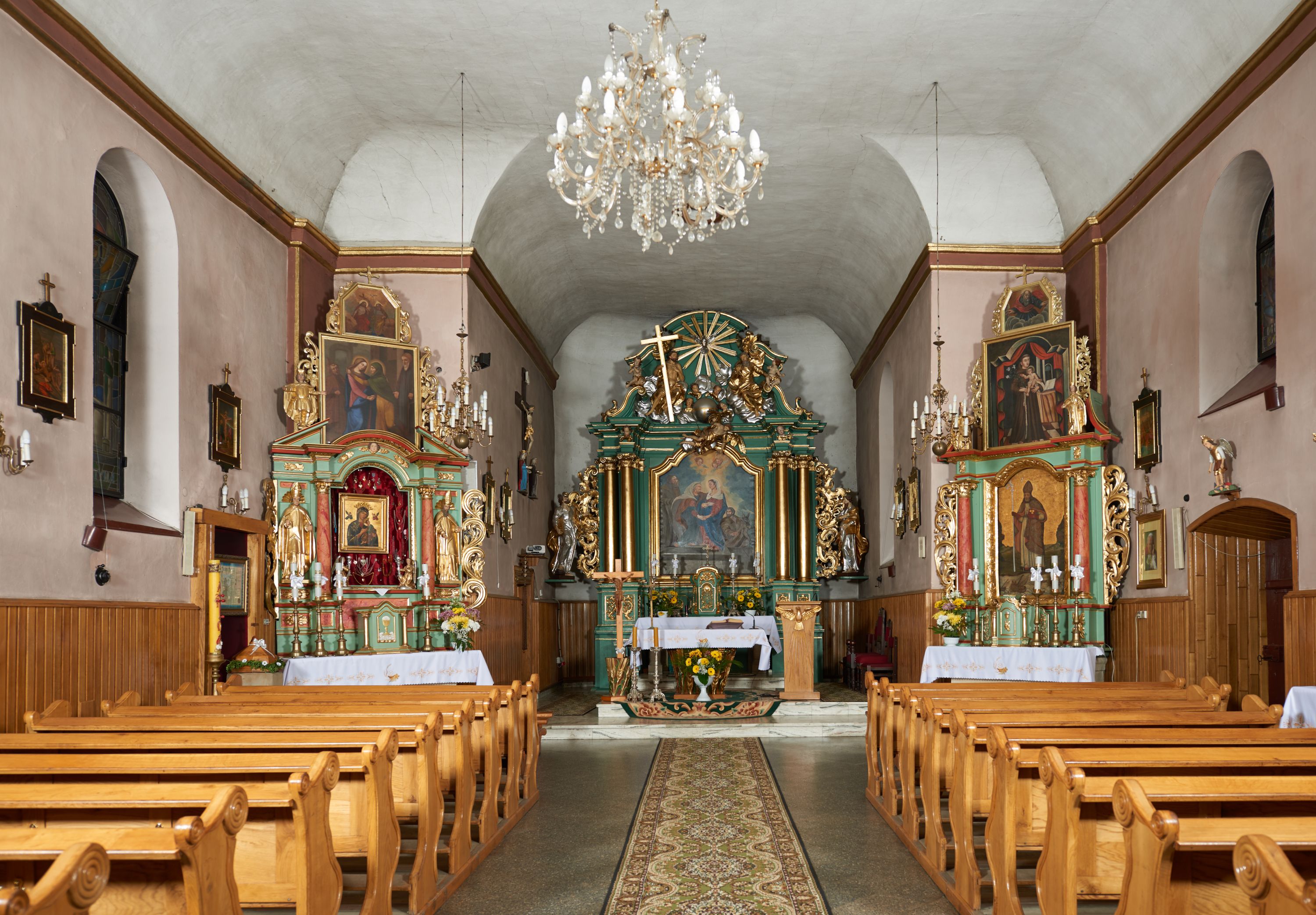 Nawa i prezbiterium przykryte stropem z głęboką fasetą imitującą sklepienie zwierciadlane, z oddzielającym je od partii ścian gzymsem.