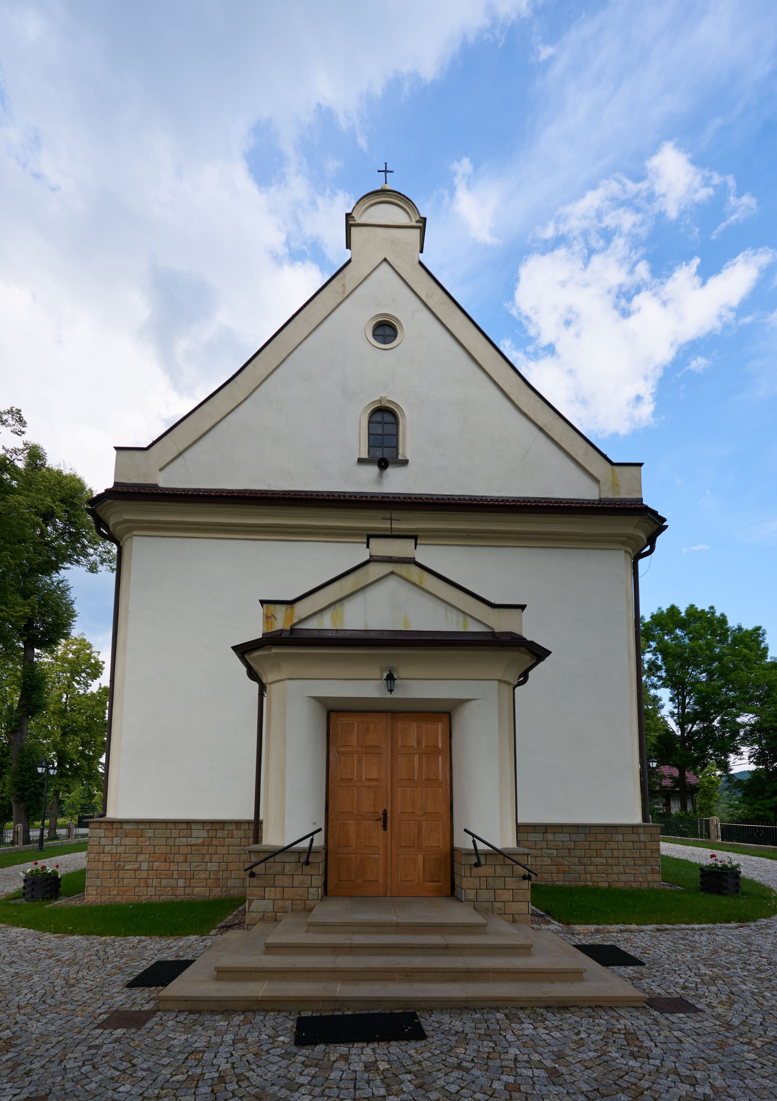 Fasada została zakomponowana z dwóch części. Ściana kościoła jest zwieńczona trójkątnym szczytem ujętym niewysokimi murkami i zakończonym półokrągło, a przed jej lico wychodzi prostopadłościenna kruchta z małym, trójkątnym szczytem opracowanym podobnie jak szczyt fasady.