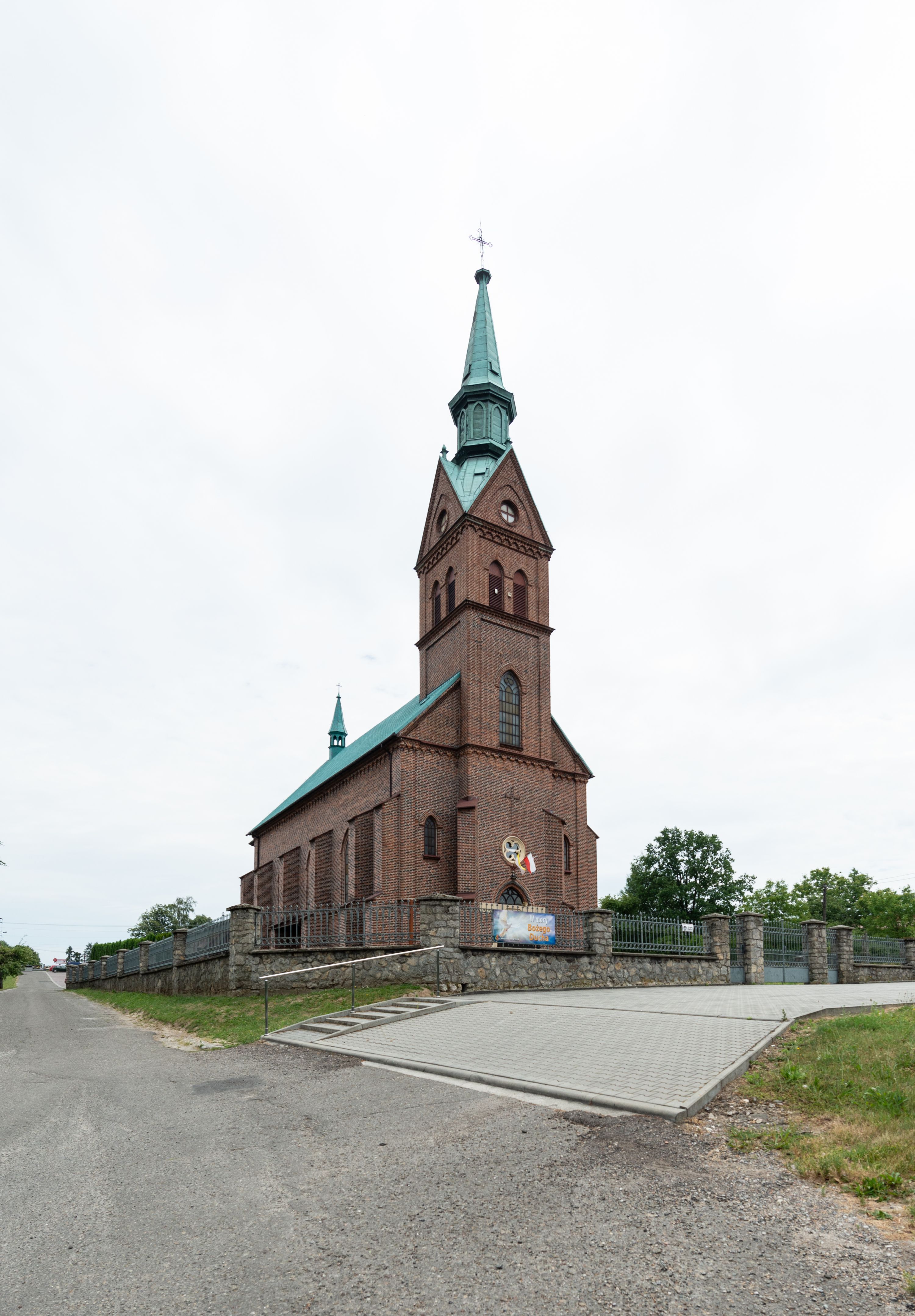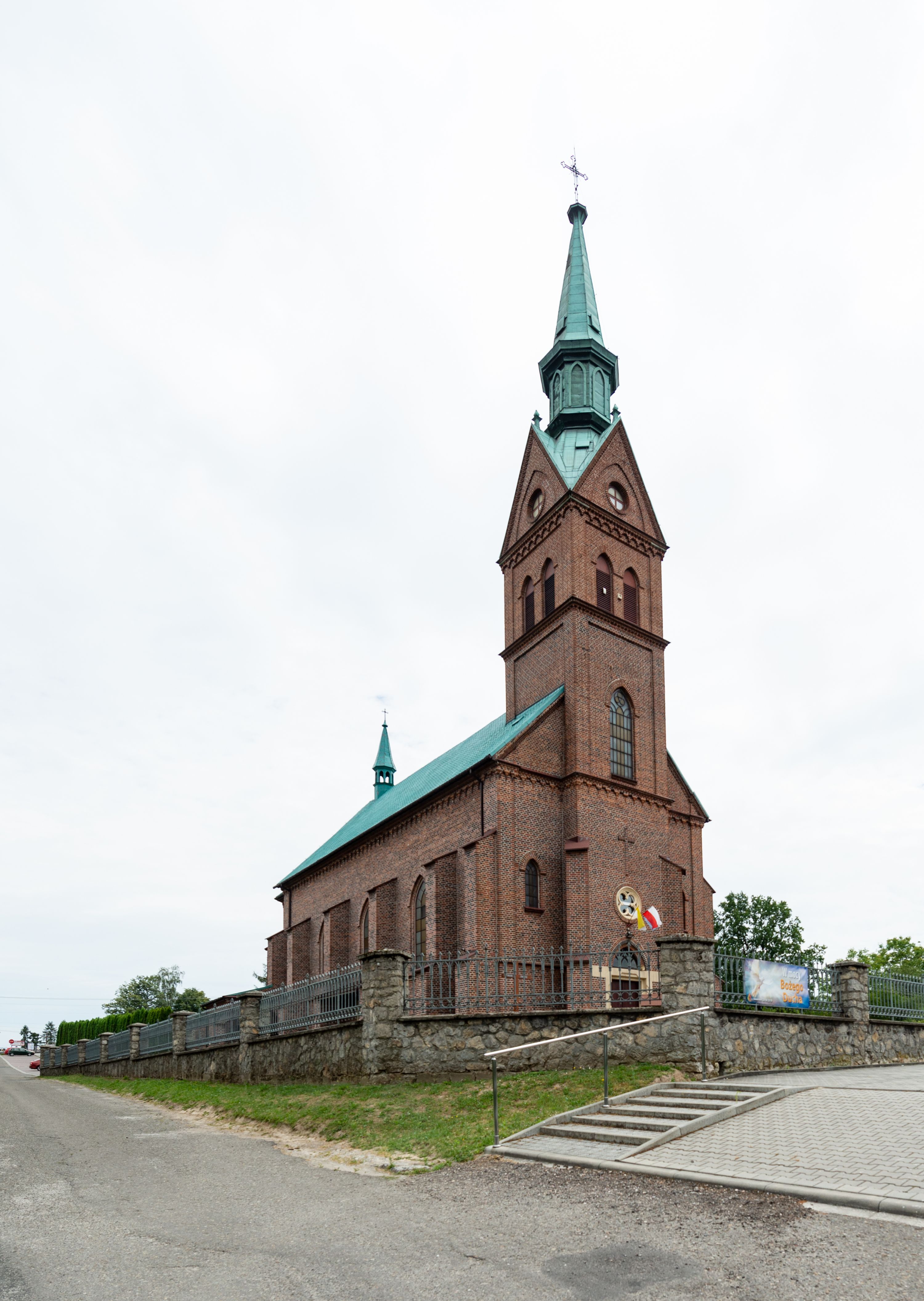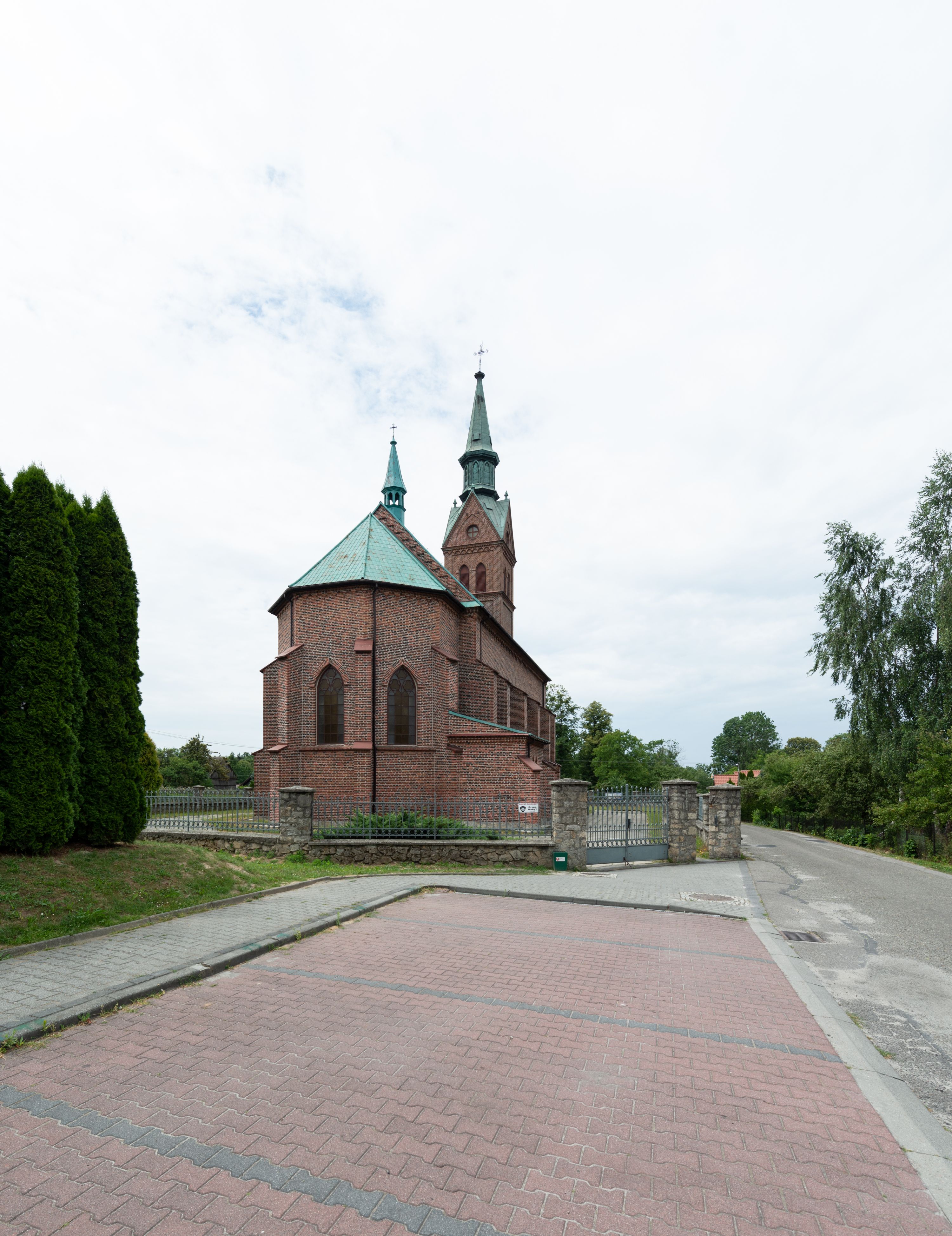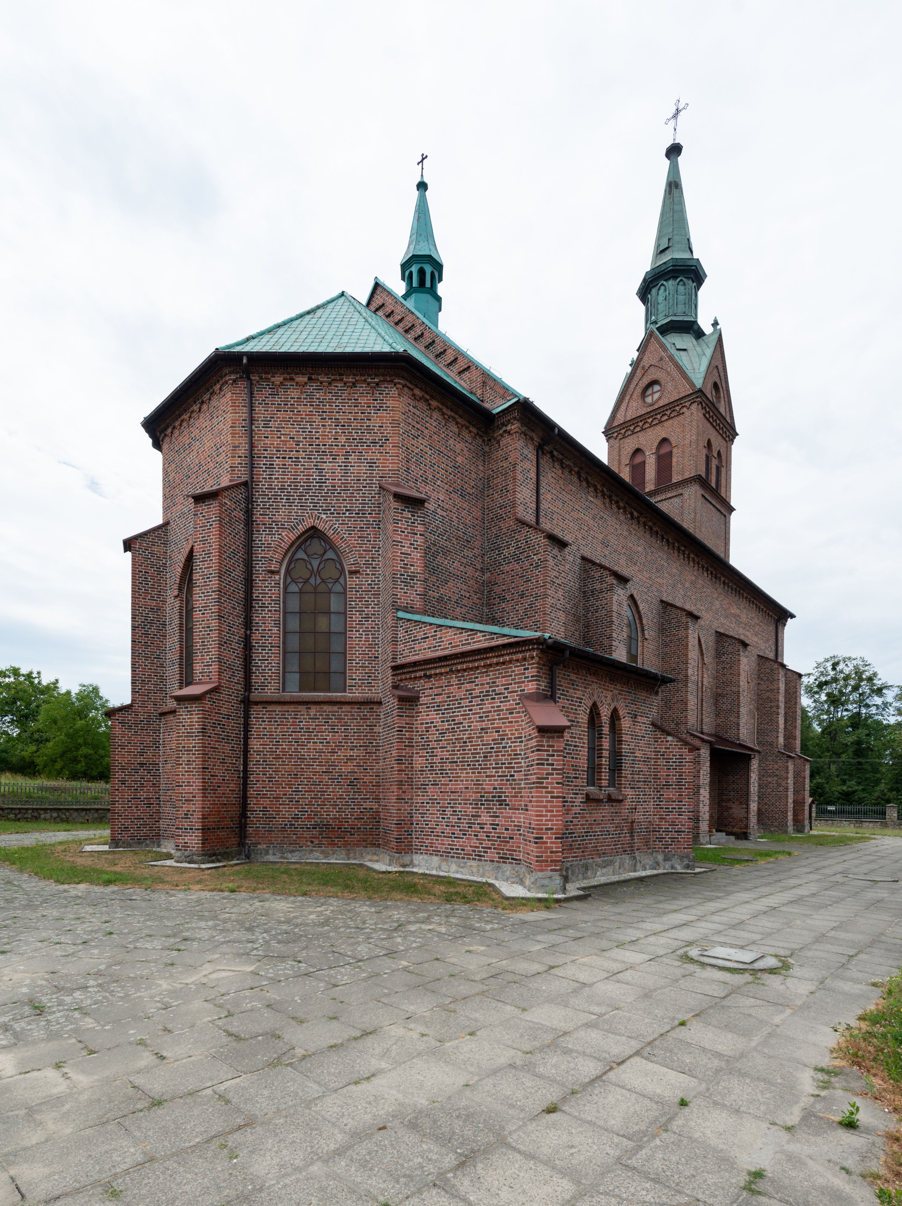 Kościół ceglany, na planie prostokąta z węższym i niższym prezbiterium z zakrystią od północy i wieżą od zachodu. Kościół orientowany, jednonawowy, czteroprzęsłowy z węższym, jednoprzęsłowym prezbiterium zamkniętym trójbocznie, z kruchtą w przyziemiu wieży. Nawa artykułowana półfilarami o ściętych narożach, przechodzącymi w zamknięte łukiem ostrym gurty krzyżowo-żebrowego sklepienia. W nawie i prezbiterium okna prostokątne zamknięte łukiem ostrym – pięć w prezbiterium, po trzy z każdej strony nawy. Węższe okna w przęśle chóru, kolejne w fasadzie. Główne wejście od wschodu, drugie od zachodu. Chór muzyczny w czwartym przęśle nawy, wsparty na wielobocznych filarach, podtrzymujących ostrołukowe arkady, z parapetem ozdobionym blendami. Ściany w dolnej partii pokryte drewnianą boazerią, wyżej malowane na kremowo, w partiach sklepienia polichromia podkreślająca elementy konstrukcji fragmentami stylizowanej wici i dekoracji floralnej; na belce tęczowej anioły niosące plakiety z symbolami świętych sakramentów. Fasada trójosiowa, z ryzalitem szerokości wieży oszkarpowanym na narożach. Podziały poziome przeprowadzone przy pomocy gzymsów. Na osi ostrołukowe wejście, powyżej wypełniony maswerkiem okulus. Następna kondygnacja jest częścią czworobocznej wieży, wypełniono ją dużym oknem w kształcę stojącego prostokąta zamkniętego łukiem ostrym. Boczne osie z małymi oknami powtarzającymi kształt pozostałych, zamknięte trójkątnym przyczółkiem przerwanym na wieżę. Najwyższa kondygnacja wieży przepruta z każdej strony parą okien w kształcie stojących prostokątów umieszczonych w ostrołukowych niszach. Wieńczący ją gzyms dekorowany zygzakiem, powyżej trójkątne szczyty z ostrołukową blendą z okulusem w centrum. Elewacje boczne i prezbiterium oszkarpowane, przeprute oknami. Hełm wieży w formie latarni zakończonej stożkiem z kupą i krzyżem, nawa przekryta dachem dwuspadowym, prezbiterium wielobocznym, zakrystia i wejście od zachodu pulpitowymi.