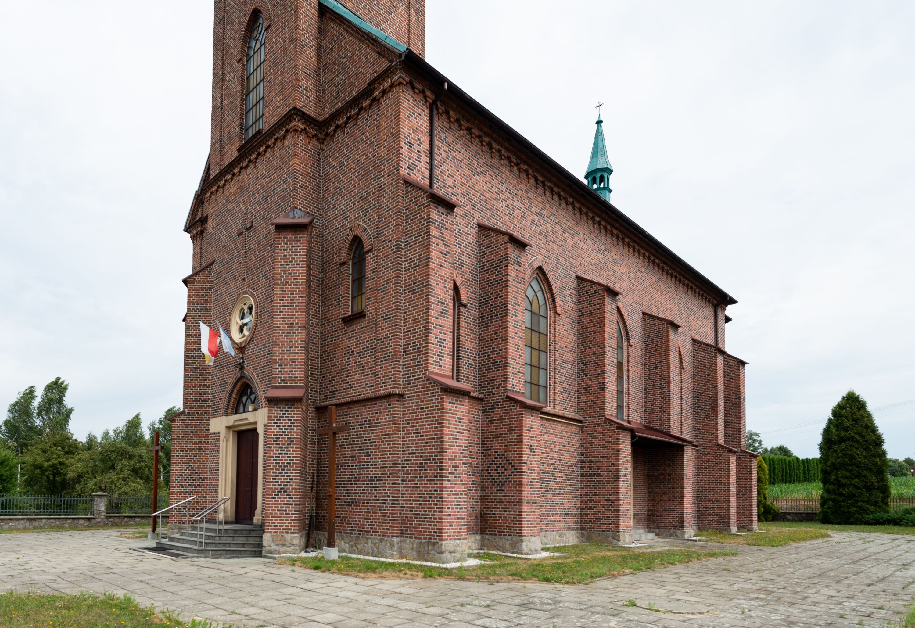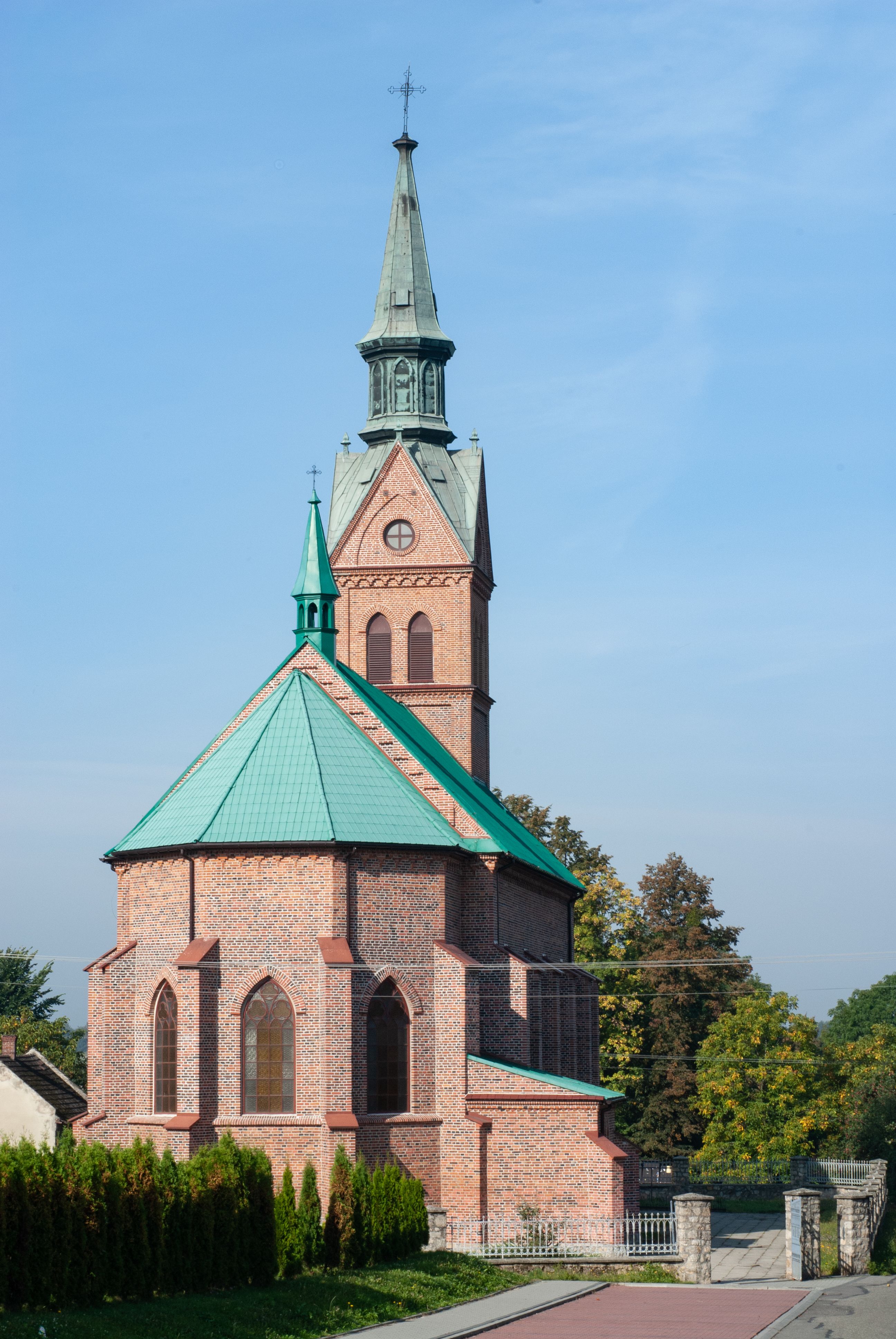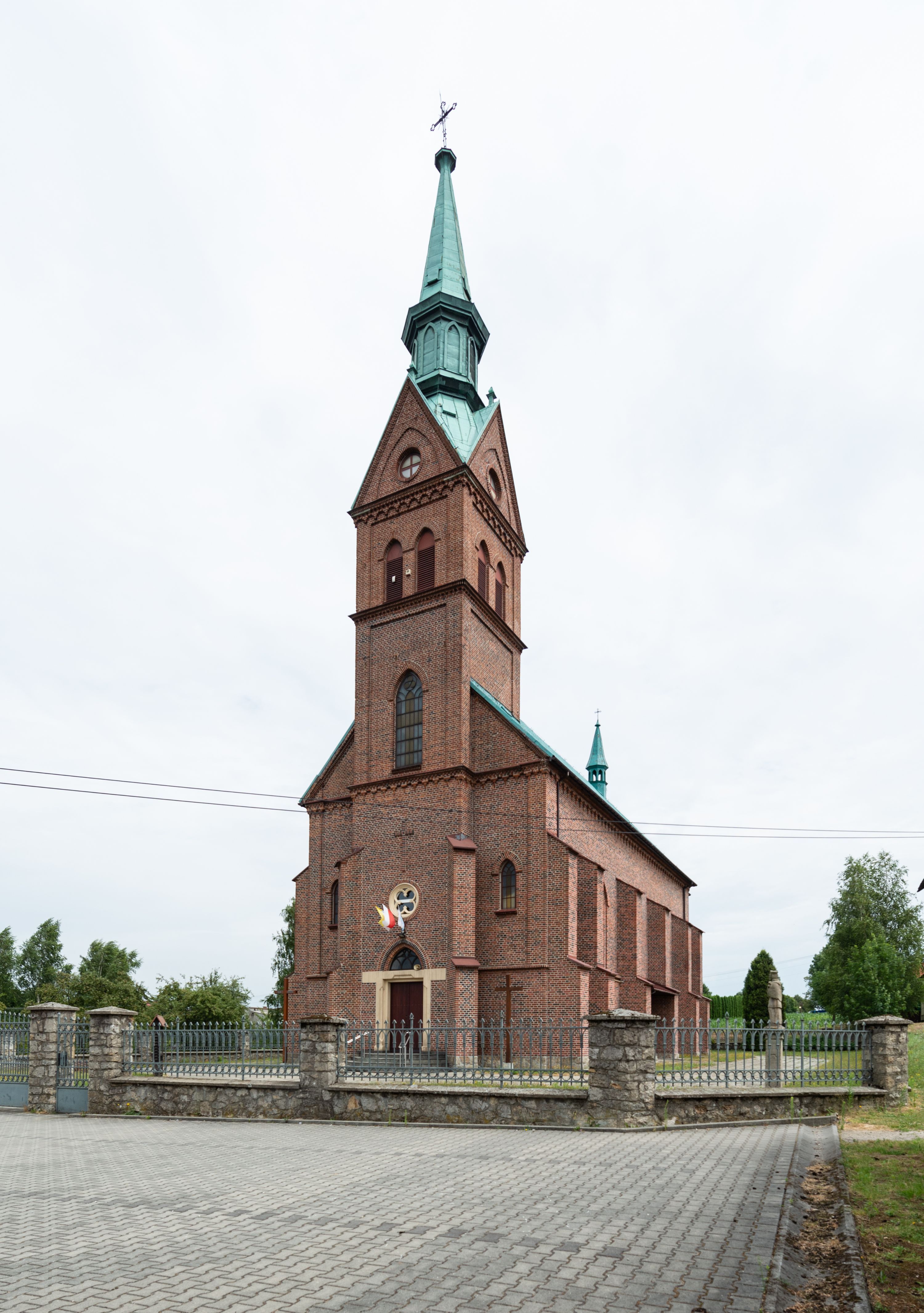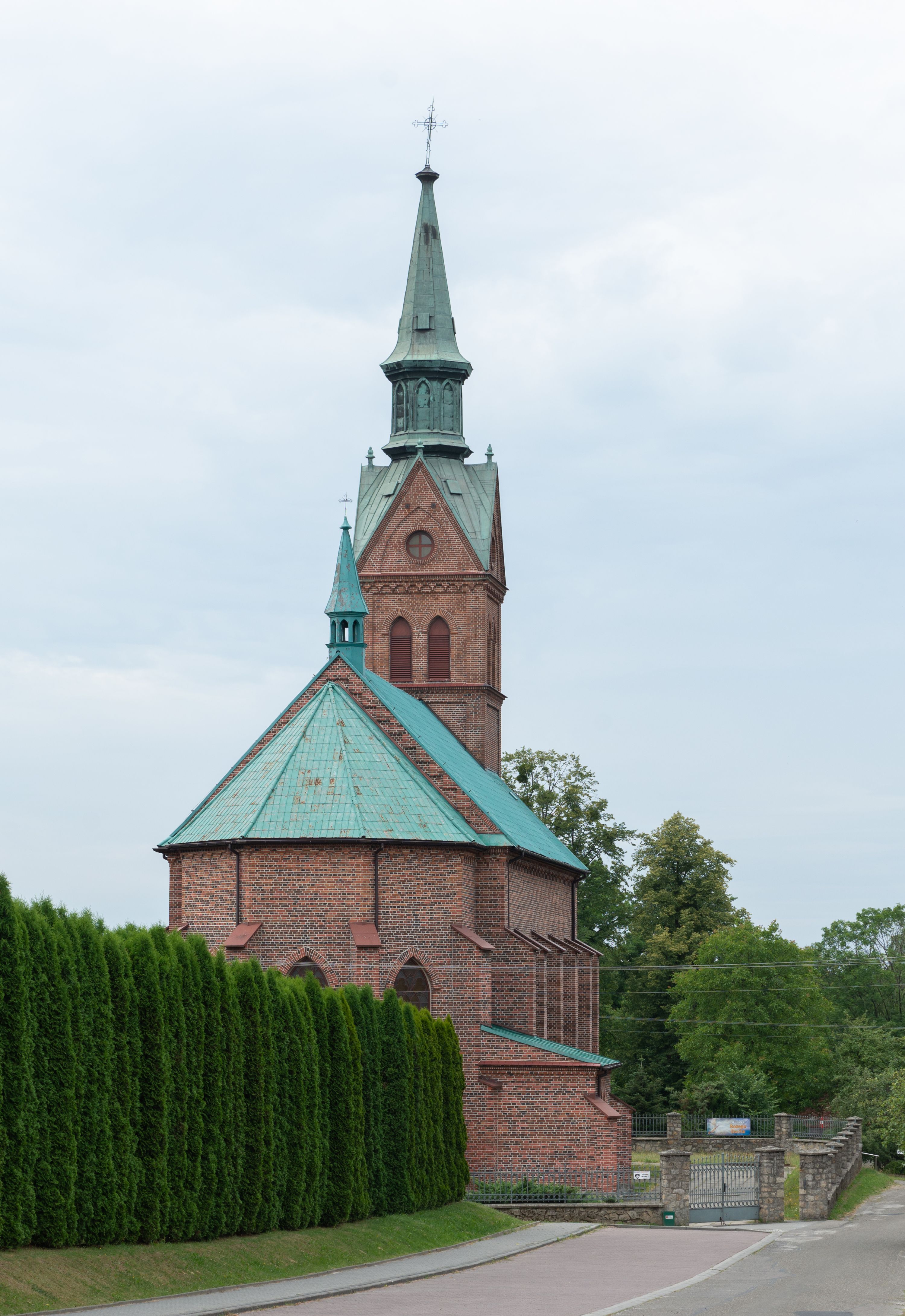 Kościół ceglany, na planie prostokąta z węższym i niższym prezbiterium z zakrystią od północy i wieżą od zachodu. Kościół orientowany, jednonawowy, czteroprzęsłowy z węższym, jednoprzęsłowym prezbiterium zamkniętym trójbocznie, z kruchtą w przyziemiu wieży. Nawa artykułowana półfilarami o ściętych narożach, przechodzącymi w zamknięte łukiem ostrym gurty krzyżowo-żebrowego sklepienia. W nawie i prezbiterium okna prostokątne zamknięte łukiem ostrym – pięć w prezbiterium, po trzy z każdej strony nawy. Węższe okna w przęśle chóru, kolejne w fasadzie. Główne wejście od wschodu, drugie od zachodu. Chór muzyczny w czwartym przęśle nawy, wsparty na wielobocznych filarach, podtrzymujących ostrołukowe arkady, z parapetem ozdobionym blendami. Ściany w dolnej partii pokryte drewnianą boazerią, wyżej malowane na kremowo, w partiach sklepienia polichromia podkreślająca elementy konstrukcji fragmentami stylizowanej wici i dekoracji floralnej; na belce tęczowej anioły niosące plakiety z symbolami świętych sakramentów. Fasada trójosiowa, z ryzalitem szerokości wieży oszkarpowanym na narożach. Podziały poziome przeprowadzone przy pomocy gzymsów. Na osi ostrołukowe wejście, powyżej wypełniony maswerkiem okulus. Następna kondygnacja jest częścią czworobocznej wieży, wypełniono ją dużym oknem w kształcę stojącego prostokąta zamkniętego łukiem ostrym. Boczne osie z małymi oknami powtarzającymi kształt pozostałych, zamknięte trójkątnym przyczółkiem przerwanym na wieżę. Najwyższa kondygnacja wieży przepruta z każdej strony parą okien w kształcie stojących prostokątów umieszczonych w ostrołukowych niszach. Wieńczący ją gzyms dekorowany zygzakiem, powyżej trójkątne szczyty z ostrołukową blendą z okulusem w centrum. Elewacje boczne i prezbiterium oszkarpowane, przeprute oknami. Hełm wieży w formie latarni zakończonej stożkiem z kupą i krzyżem, nawa przekryta dachem dwuspadowym, prezbiterium wielobocznym, zakrystia i wejście od zachodu pulpitowymi.