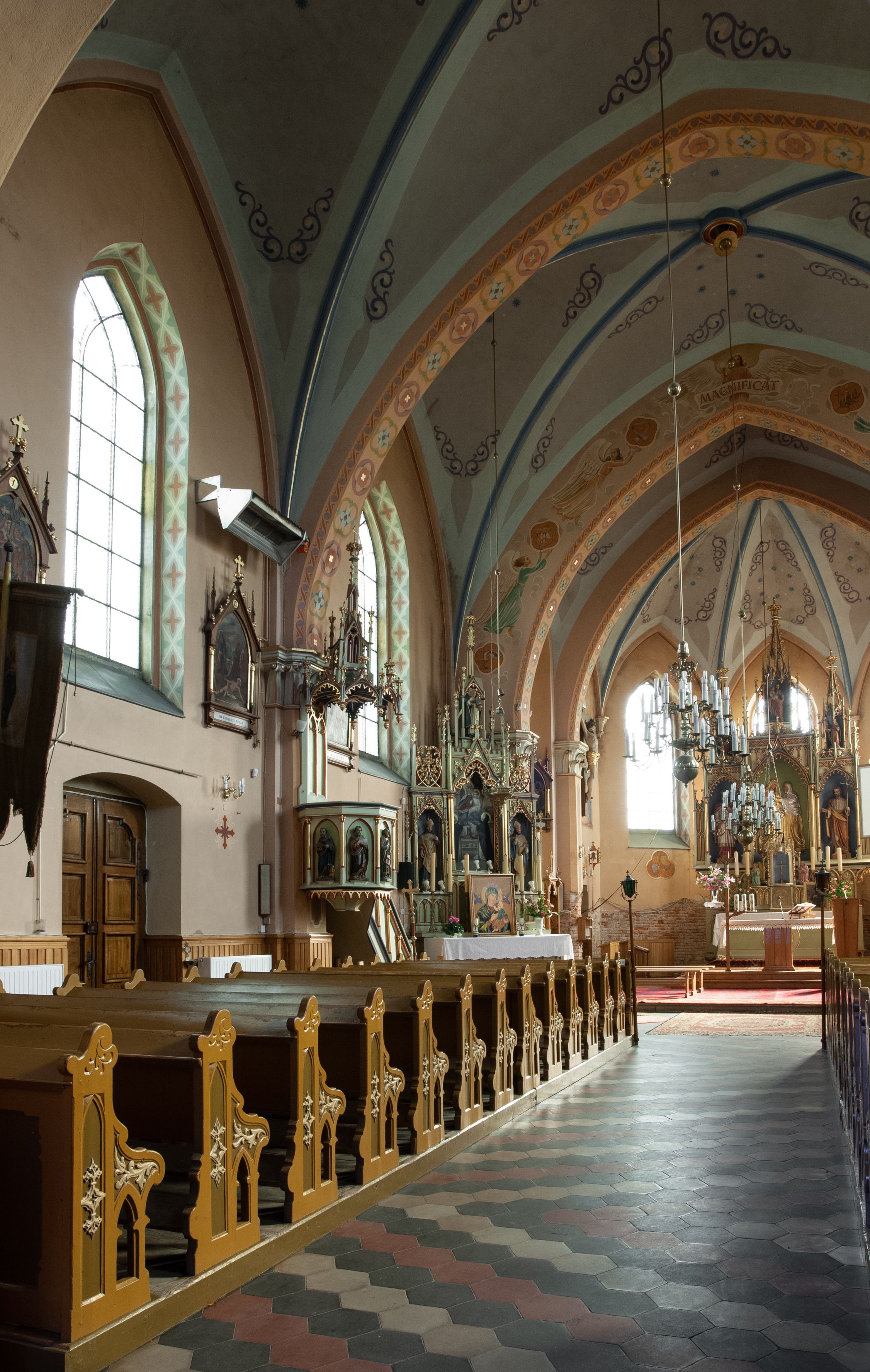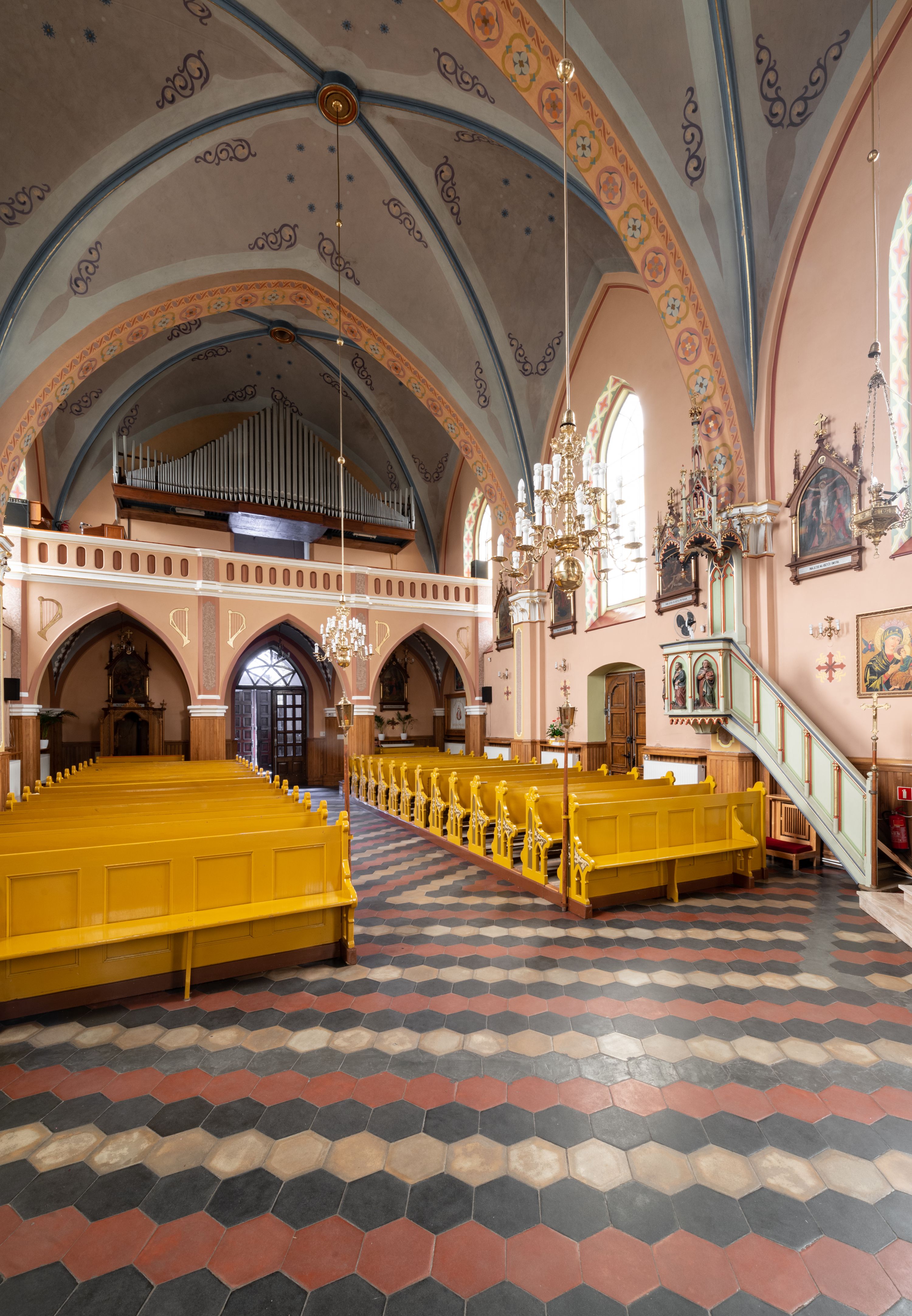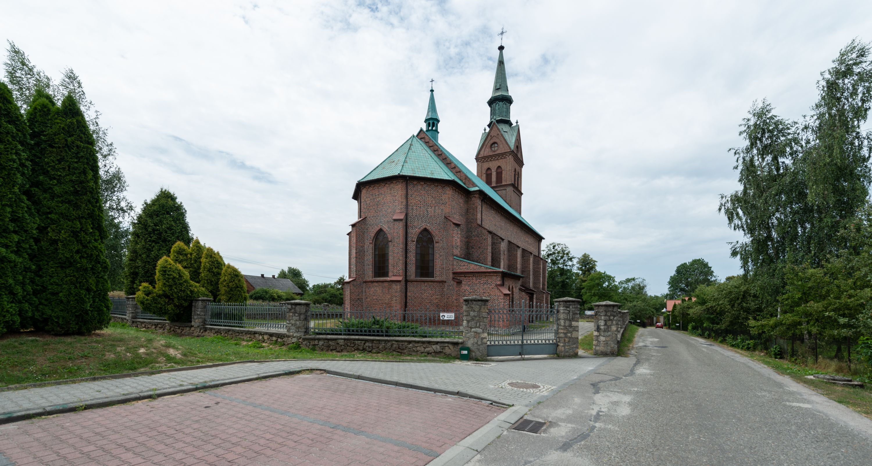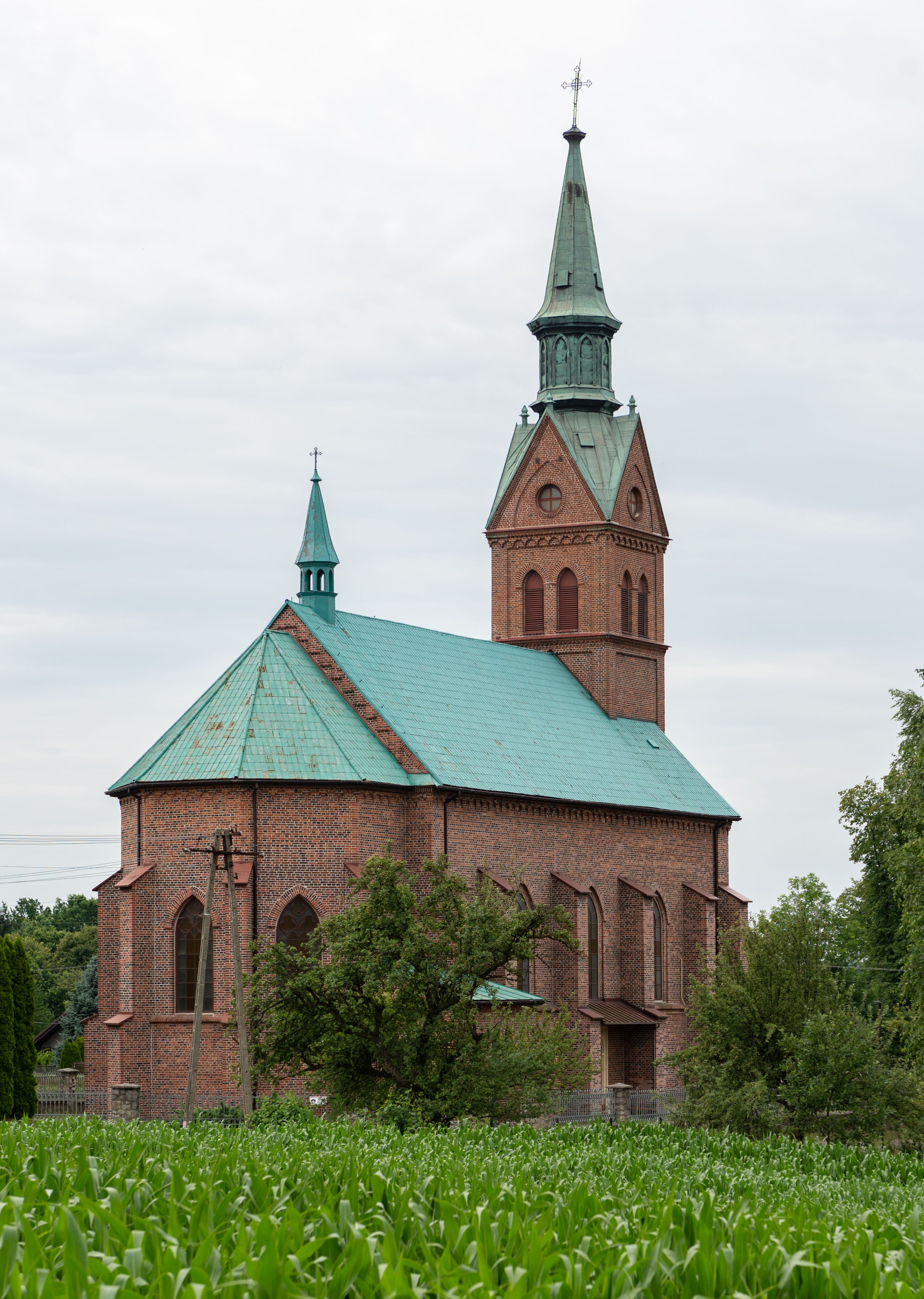 Kościół ceglany, na planie prostokąta z węższym i niższym prezbiterium z zakrystią od północy i wieżą od zachodu. Kościół orientowany, jednonawowy, czteroprzęsłowy z węższym, jednoprzęsłowym prezbiterium zamkniętym trójbocznie, z kruchtą w przyziemiu wieży. Nawa artykułowana półfilarami o ściętych narożach, przechodzącymi w zamknięte łukiem ostrym gurty krzyżowo-żebrowego sklepienia. W nawie i prezbiterium okna prostokątne zamknięte łukiem ostrym – pięć w prezbiterium, po trzy z każdej strony nawy. Węższe okna w przęśle chóru, kolejne w fasadzie. Główne wejście od wschodu, drugie od zachodu. Chór muzyczny w czwartym przęśle nawy, wsparty na wielobocznych filarach, podtrzymujących ostrołukowe arkady, z parapetem ozdobionym blendami. Ściany w dolnej partii pokryte drewnianą boazerią, wyżej malowane na kremowo, w partiach sklepienia polichromia podkreślająca elementy konstrukcji fragmentami stylizowanej wici i dekoracji floralnej; na belce tęczowej anioły niosące plakiety z symbolami świętych sakramentów. Fasada trójosiowa, z ryzalitem szerokości wieży oszkarpowanym na narożach. Podziały poziome przeprowadzone przy pomocy gzymsów. Na osi ostrołukowe wejście, powyżej wypełniony maswerkiem okulus. Następna kondygnacja jest częścią czworobocznej wieży, wypełniono ją dużym oknem w kształcę stojącego prostokąta zamkniętego łukiem ostrym. Boczne osie z małymi oknami powtarzającymi kształt pozostałych, zamknięte trójkątnym przyczółkiem przerwanym na wieżę. Najwyższa kondygnacja wieży przepruta z każdej strony parą okien w kształcie stojących prostokątów umieszczonych w ostrołukowych niszach. Wieńczący ją gzyms dekorowany zygzakiem, powyżej trójkątne szczyty z ostrołukową blendą z okulusem w centrum. Elewacje boczne i prezbiterium oszkarpowane, przeprute oknami. Hełm wieży w formie latarni zakończonej stożkiem z kupą i krzyżem, nawa przekryta dachem dwuspadowym, prezbiterium wielobocznym, zakrystia i wejście od zachodu pulpitowymi.