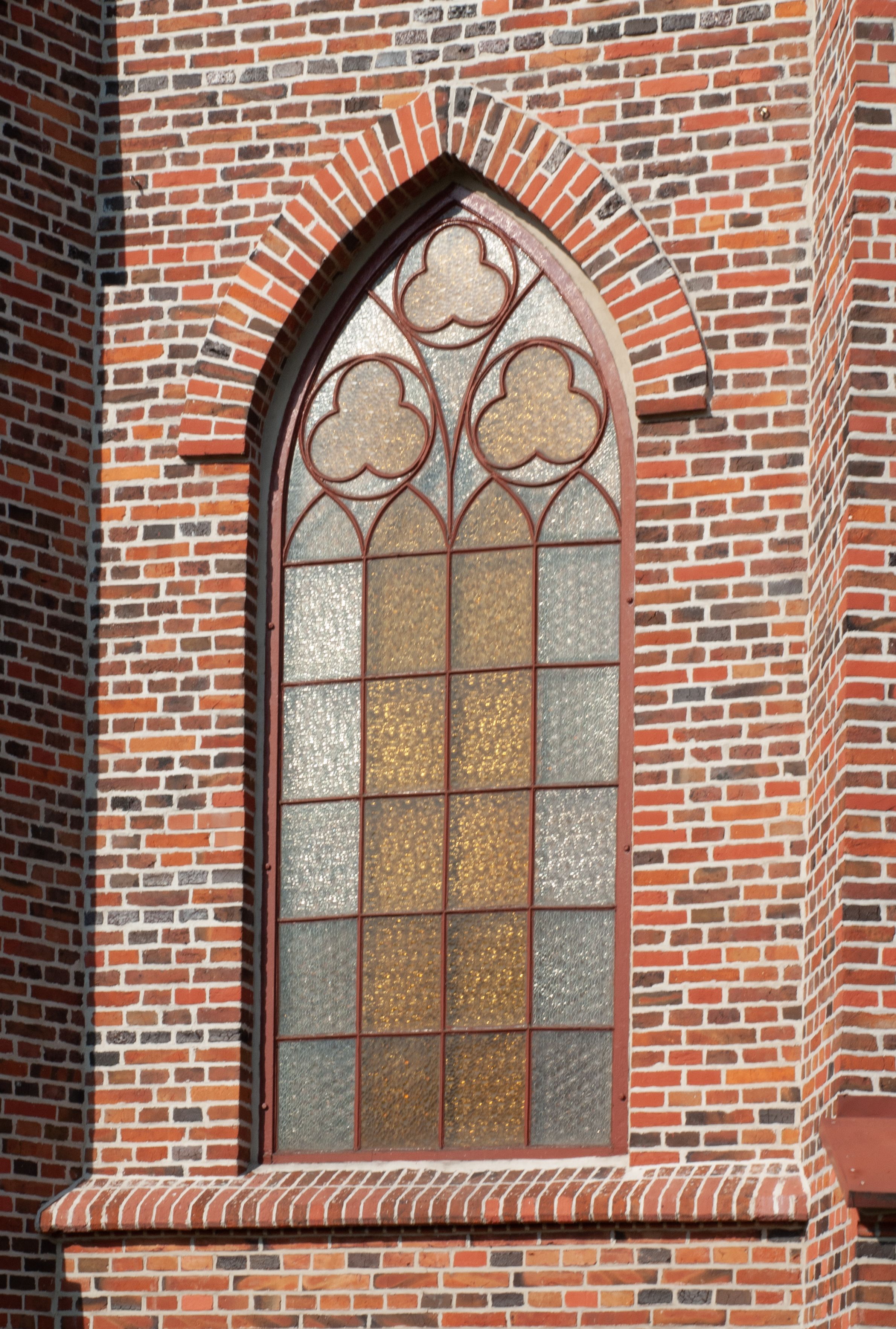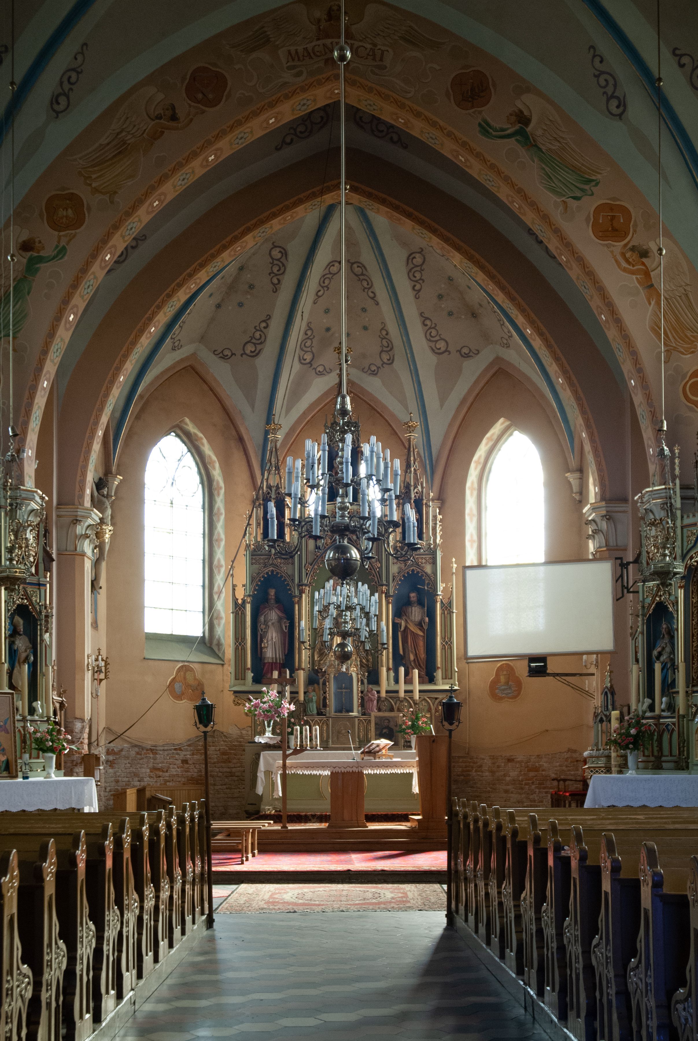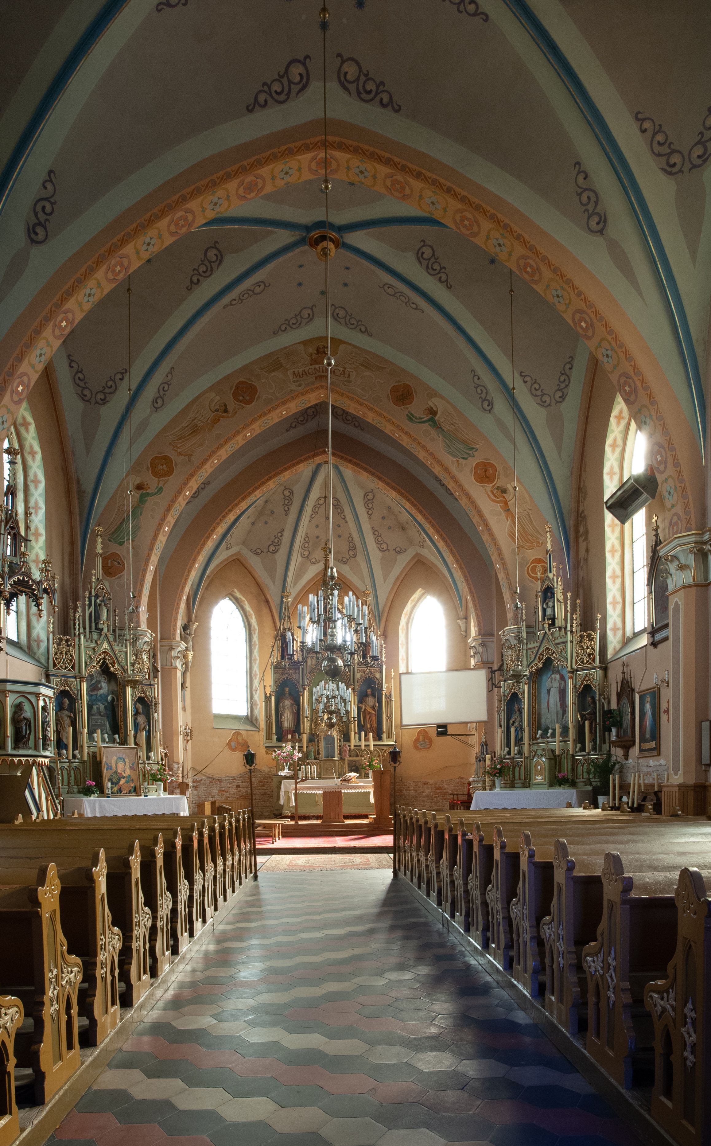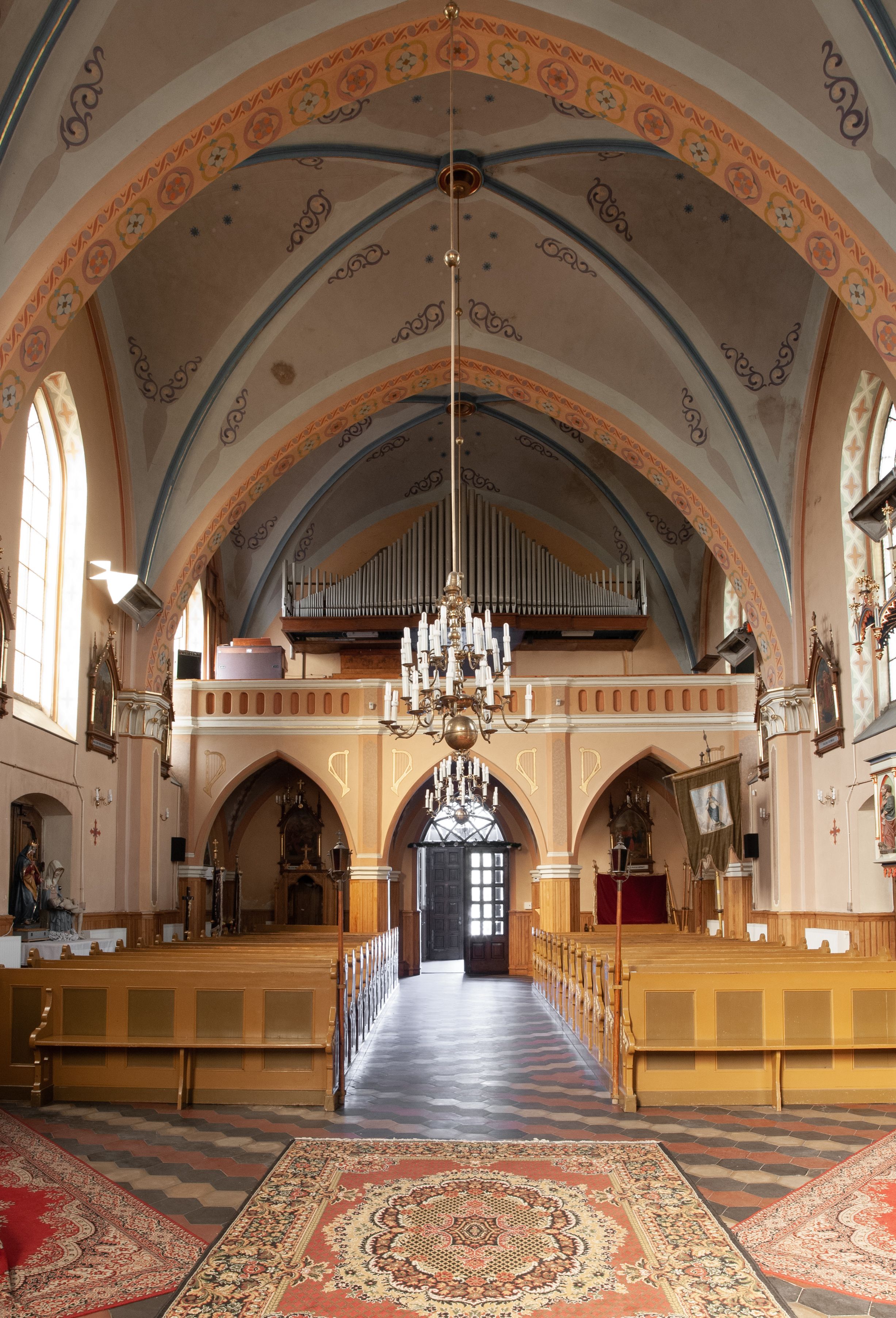 Kościół ceglany, na planie prostokąta z węższym i niższym prezbiterium z zakrystią od północy i wieżą od zachodu. Kościół orientowany, jednonawowy, czteroprzęsłowy z węższym, jednoprzęsłowym prezbiterium zamkniętym trójbocznie, z kruchtą w przyziemiu wieży. Nawa artykułowana półfilarami o ściętych narożach, przechodzącymi w zamknięte łukiem ostrym gurty krzyżowo-żebrowego sklepienia. W nawie i prezbiterium okna prostokątne zamknięte łukiem ostrym – pięć w prezbiterium, po trzy z każdej strony nawy. Węższe okna w przęśle chóru, kolejne w fasadzie. Główne wejście od wschodu, drugie od zachodu. Chór muzyczny w czwartym przęśle nawy, wsparty na wielobocznych filarach, podtrzymujących ostrołukowe arkady, z parapetem ozdobionym blendami. Ściany w dolnej partii pokryte drewnianą boazerią, wyżej malowane na kremowo, w partiach sklepienia polichromia podkreślająca elementy konstrukcji fragmentami stylizowanej wici i dekoracji floralnej; na belce tęczowej anioły niosące plakiety z symbolami świętych sakramentów. Fasada trójosiowa, z ryzalitem szerokości wieży oszkarpowanym na narożach. Podziały poziome przeprowadzone przy pomocy gzymsów. Na osi ostrołukowe wejście, powyżej wypełniony maswerkiem okulus. Następna kondygnacja jest częścią czworobocznej wieży, wypełniono ją dużym oknem w kształcę stojącego prostokąta zamkniętego łukiem ostrym. Boczne osie z małymi oknami powtarzającymi kształt pozostałych, zamknięte trójkątnym przyczółkiem przerwanym na wieżę. Najwyższa kondygnacja wieży przepruta z każdej strony parą okien w kształcie stojących prostokątów umieszczonych w ostrołukowych niszach. Wieńczący ją gzyms dekorowany zygzakiem, powyżej trójkątne szczyty z ostrołukową blendą z okulusem w centrum. Elewacje boczne i prezbiterium oszkarpowane, przeprute oknami. Hełm wieży w formie latarni zakończonej stożkiem z kupą i krzyżem, nawa przekryta dachem dwuspadowym, prezbiterium wielobocznym, zakrystia i wejście od zachodu pulpitowymi.