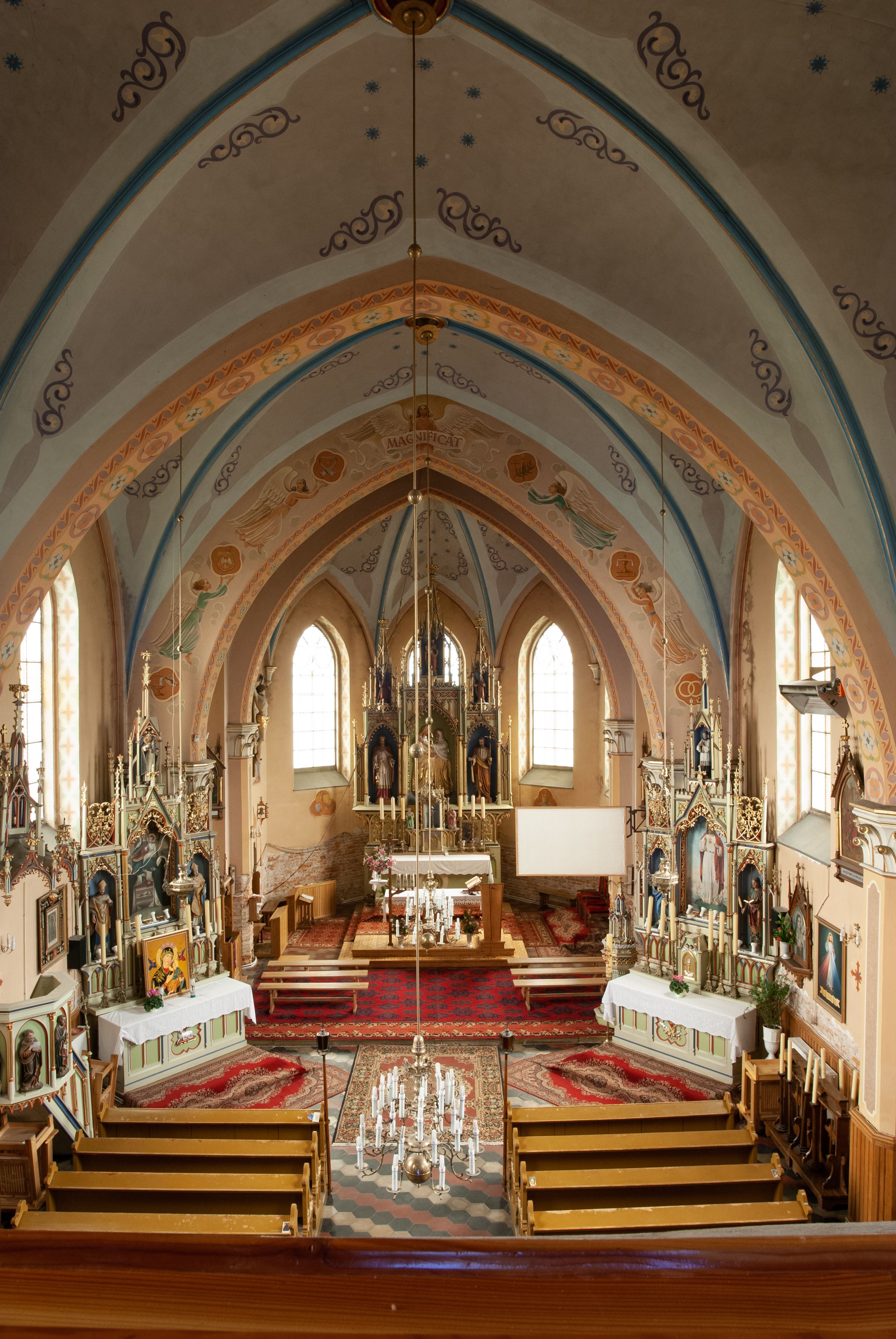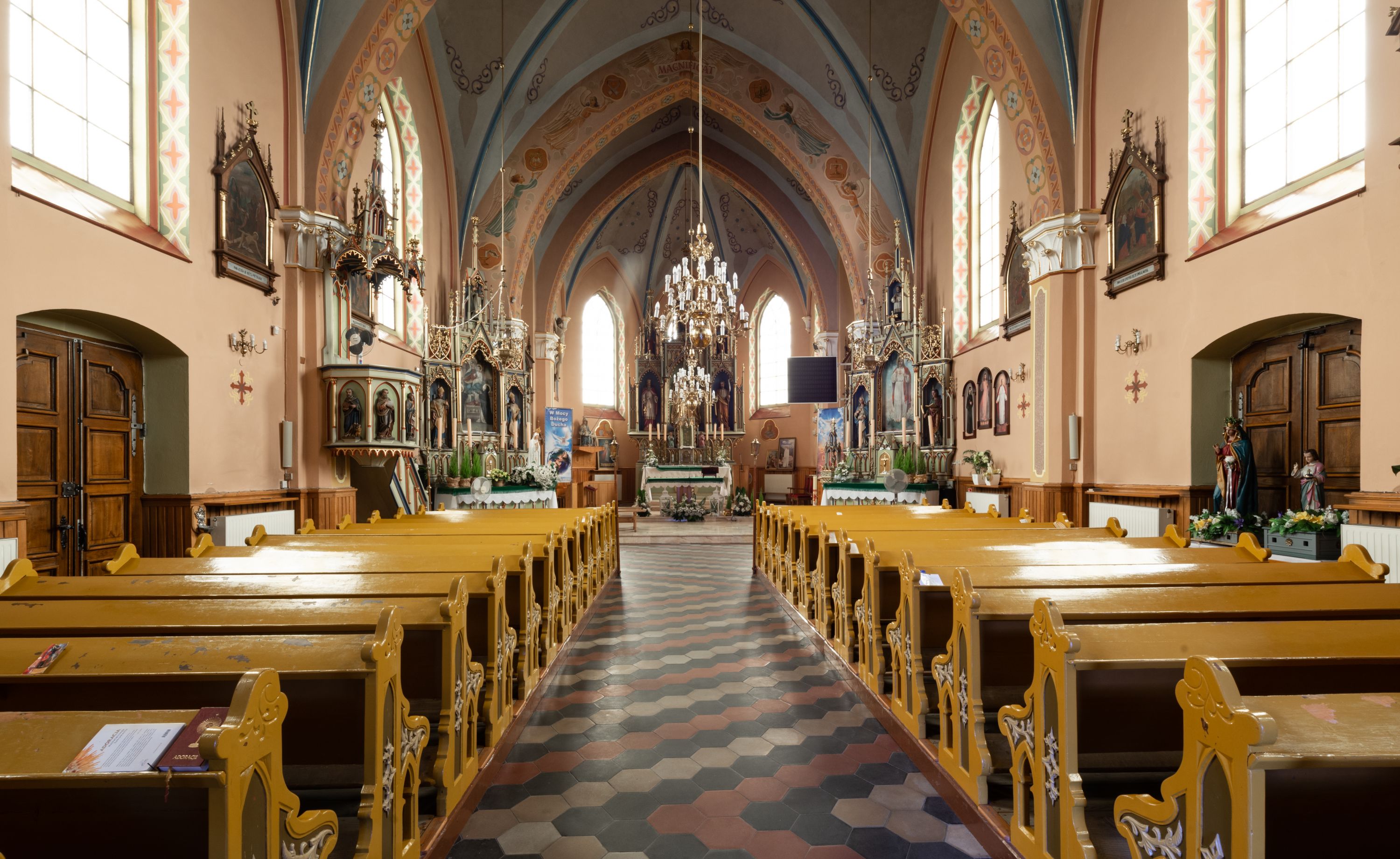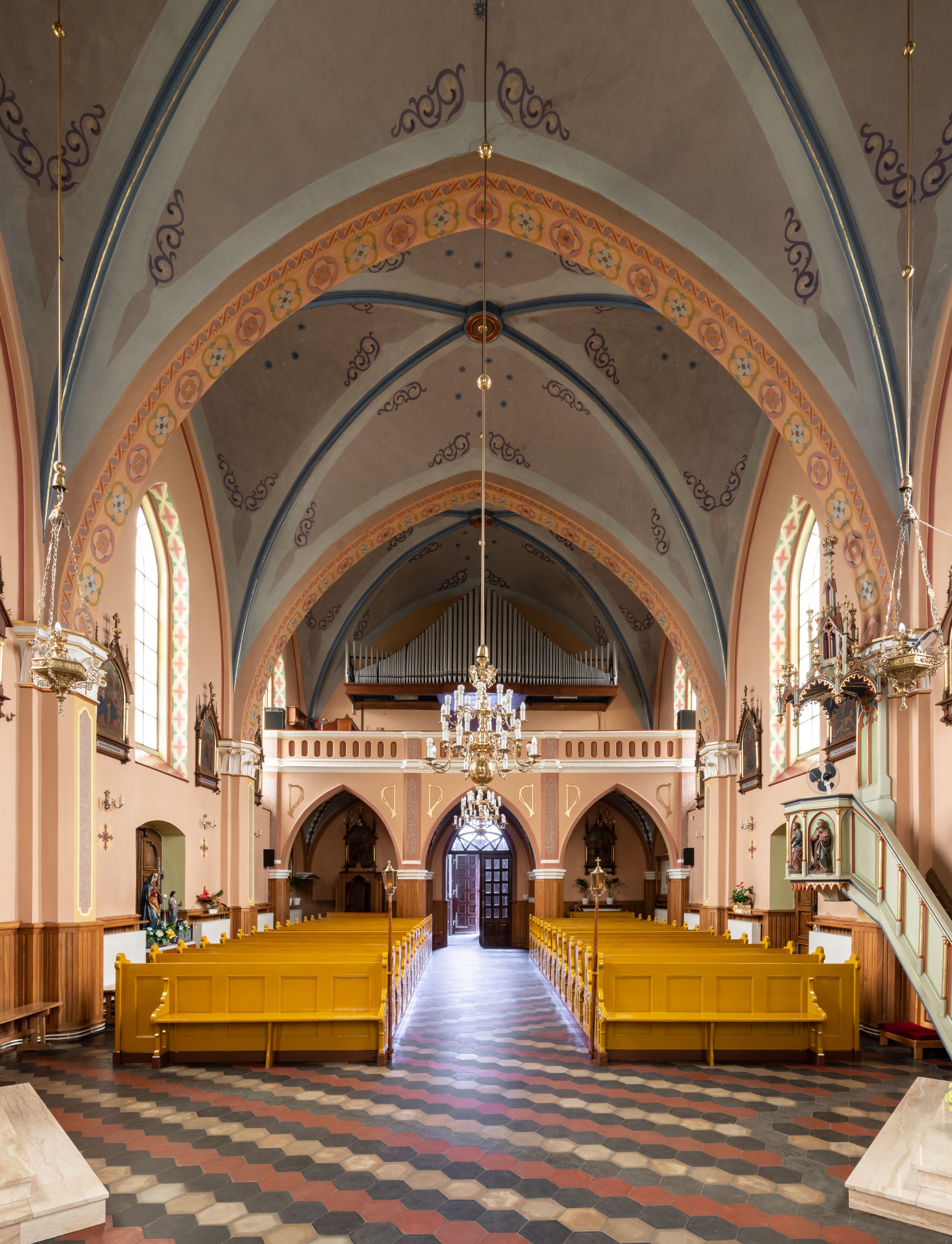 Do najciekawszych elementów wyposażenia należą zespół neogotyckich ołtarzy wraz z amboną oraz kolekcja dziewiętnastowiecznych feretronów. W otoczeniu kościoła znajduje się kamienna figura św. Jana Nepomucena z 1788 roku.