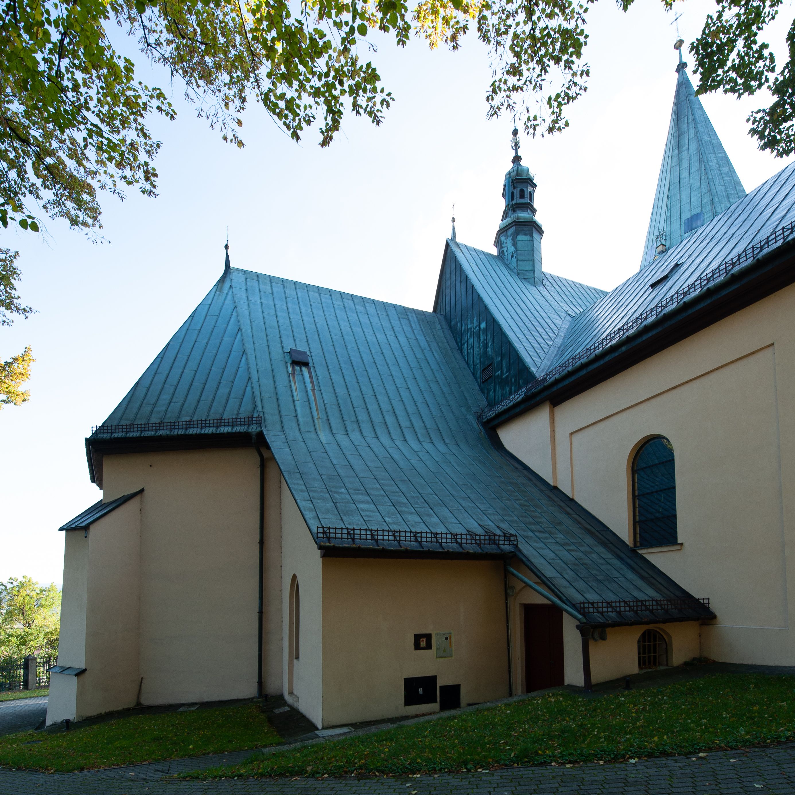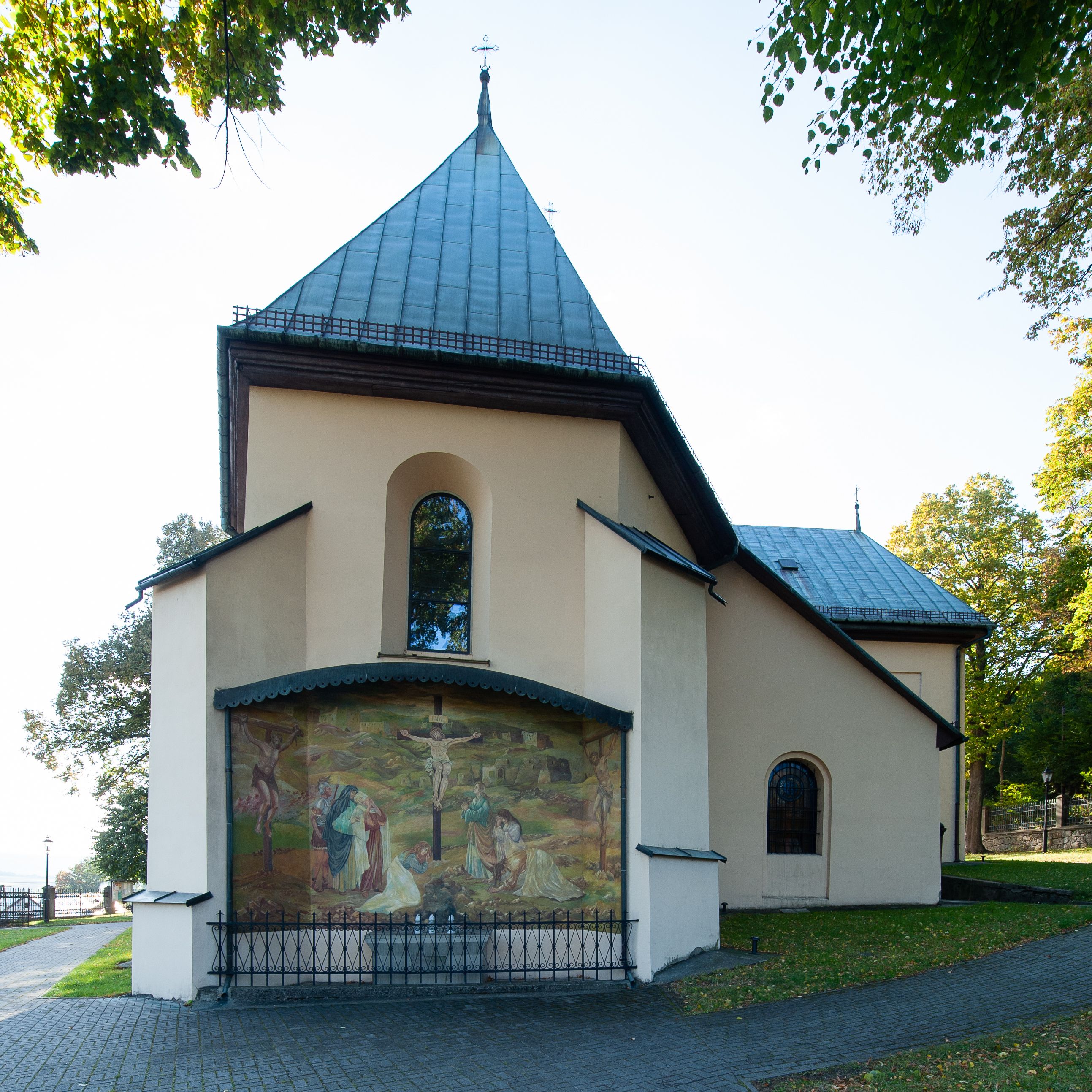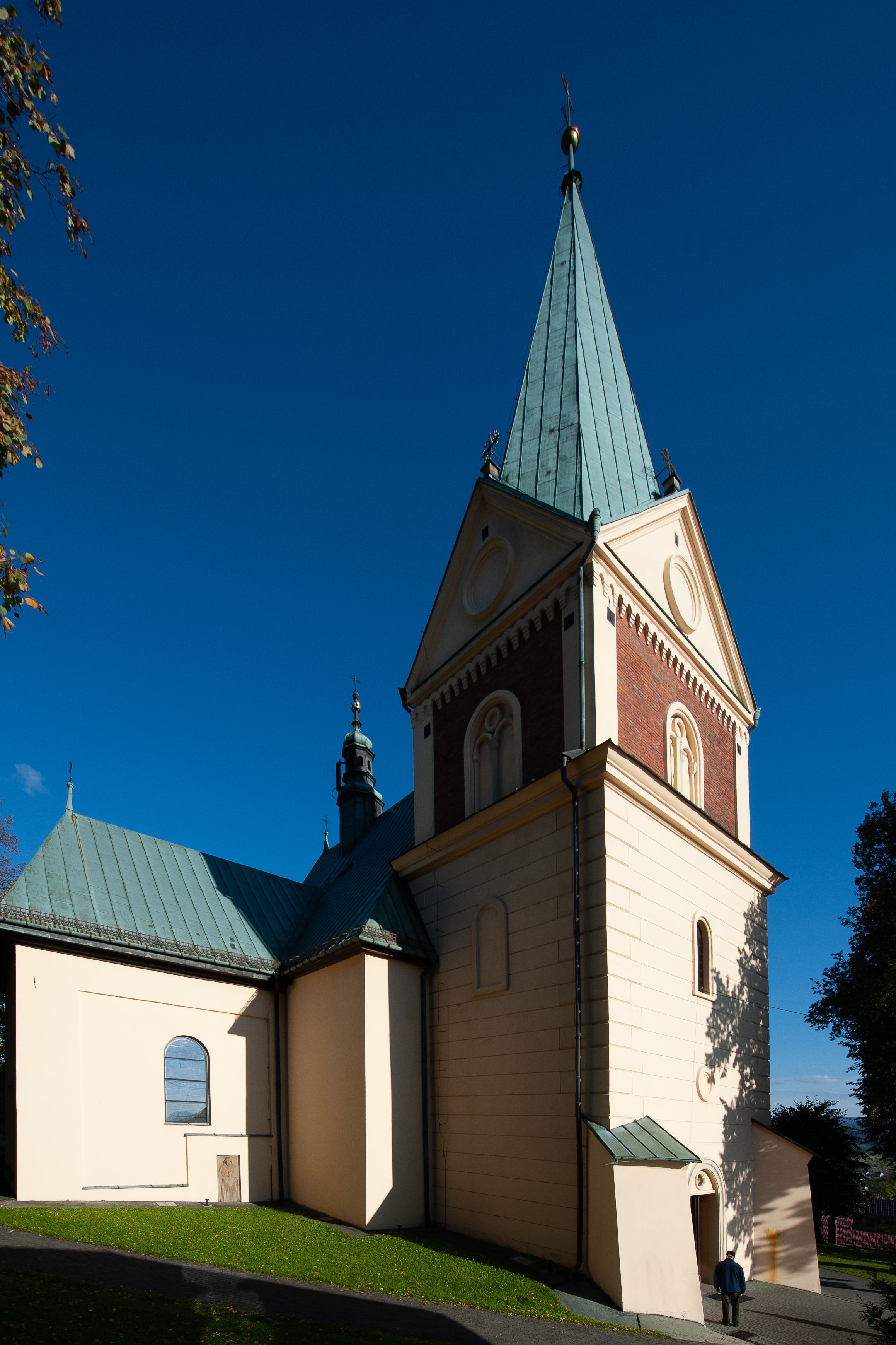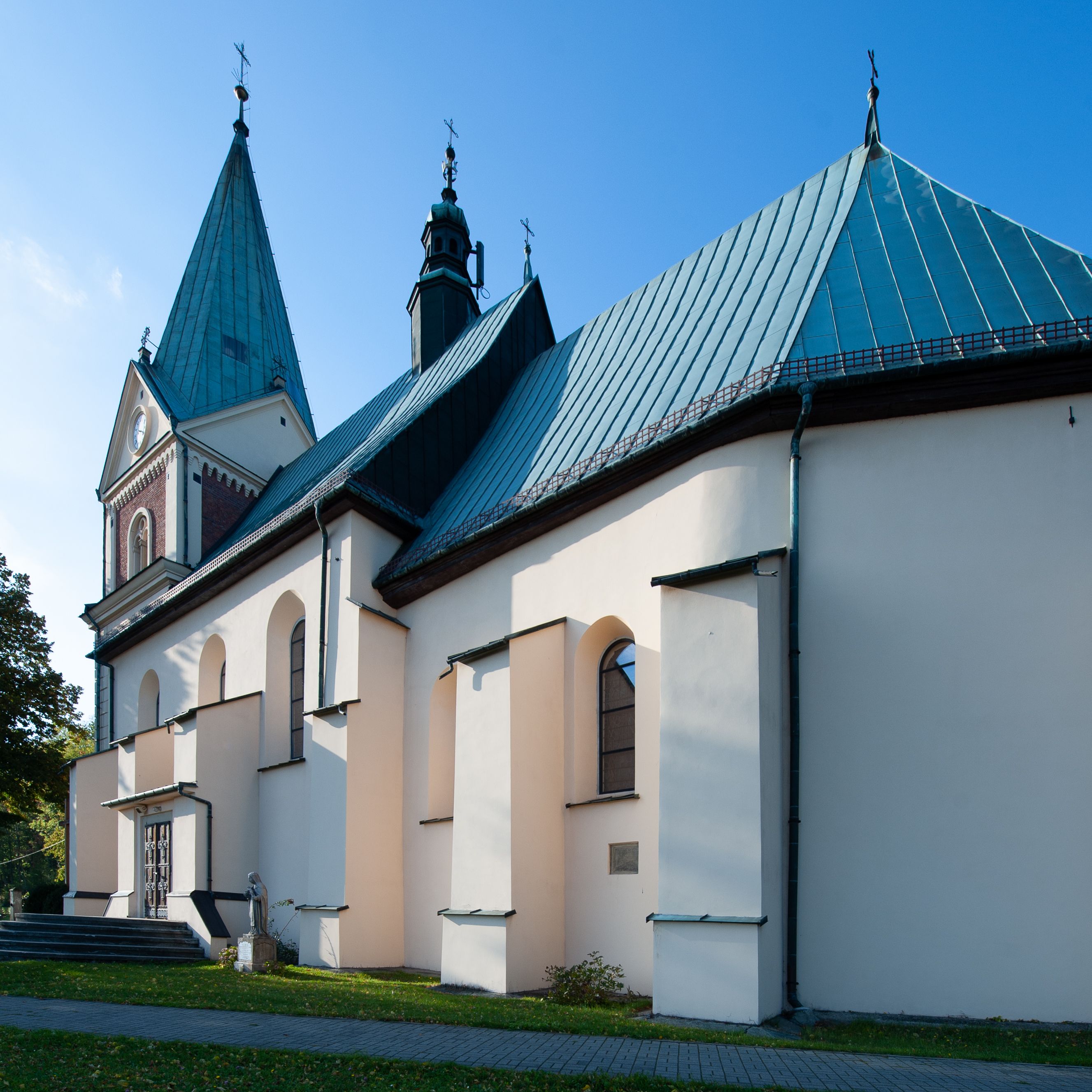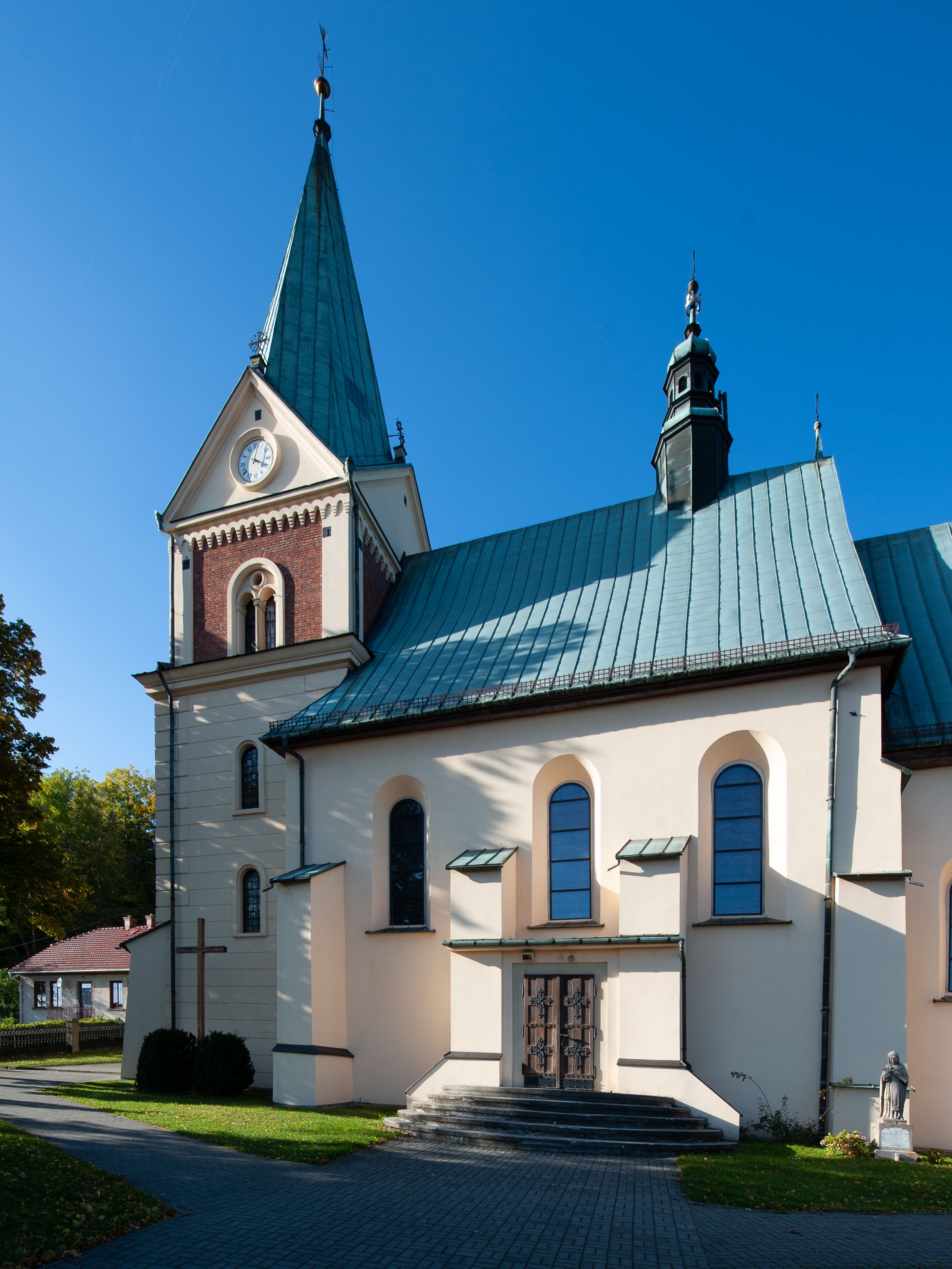 Kościół orientowany, jednonawowy, z krótkim zakończonym wielobocznie prezbiterium, przy którym od północy zakrystia z nowszym przedsionkiem; przy nawie od północy prostokątna kaplica Różańcowa (1712 r.), od zachodu wieża na rzucie kwadratu, od południa drewniana kruchta. Wewnątrz stropy. Arkada tęczy szeroka półkolista. Zewnątrz mury opięte przyporami, tynkowane. Dachy dwuspadowe i pulpitowe. Na kalenicy dachu nawy wieżyczka na sygnaturkę z datą 1878. Okna prostokątne zamknięte półkoliście. Dwa portale kamienne prostokątne. Wieża dołem gotycka, nadbudowana w stylu pseudoromańskim; trójkondygnacyjna, dołem z narożnikami artykułowanymi boniowaniem, narożniki górnej kondygnacji ujęte lizenami połączonymi fryzem arkadkowym. Elewacje wieży zwieńczone trójkątnymi szczytami i ostrosłupowym hełmem krytym blachą.