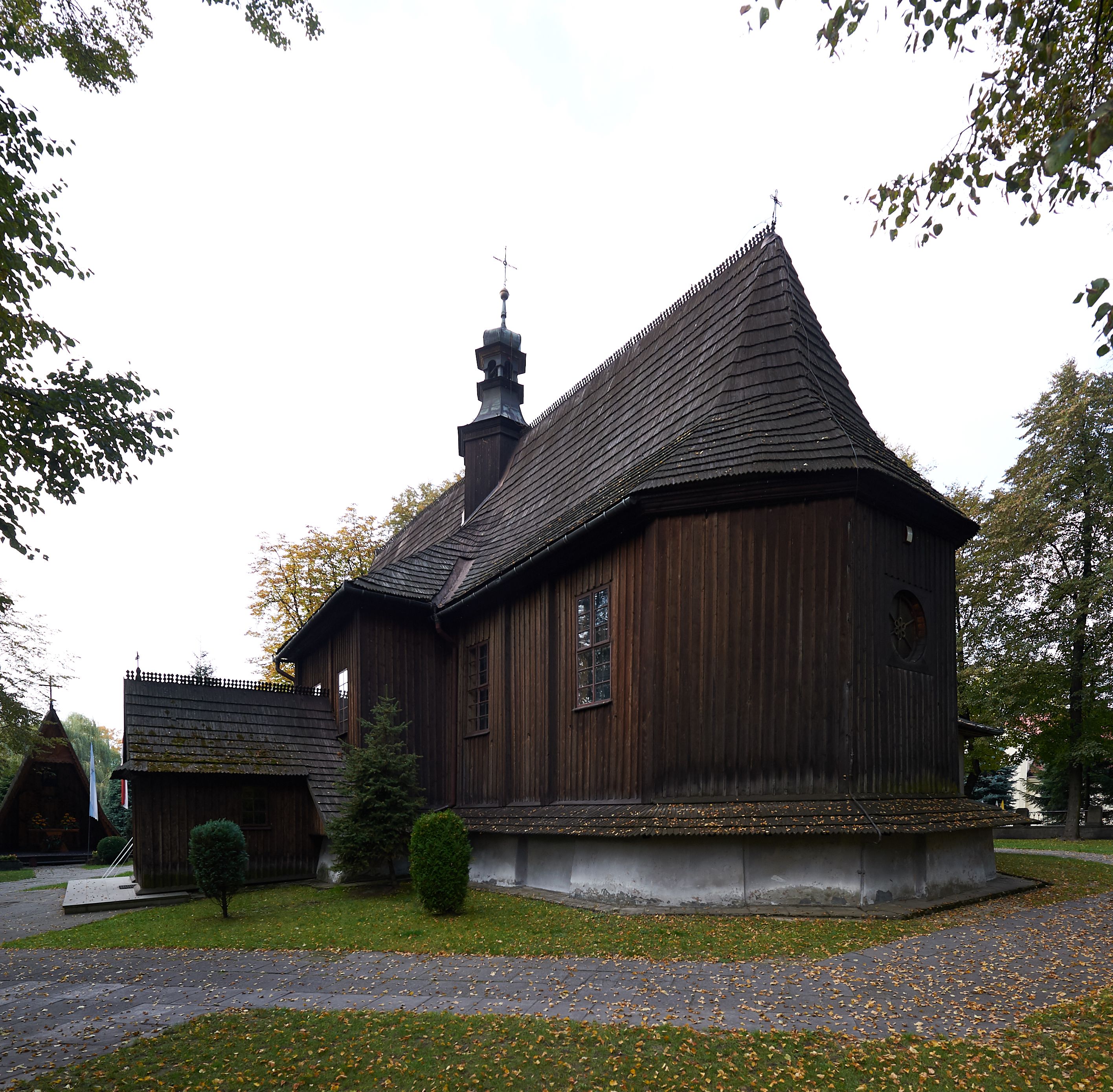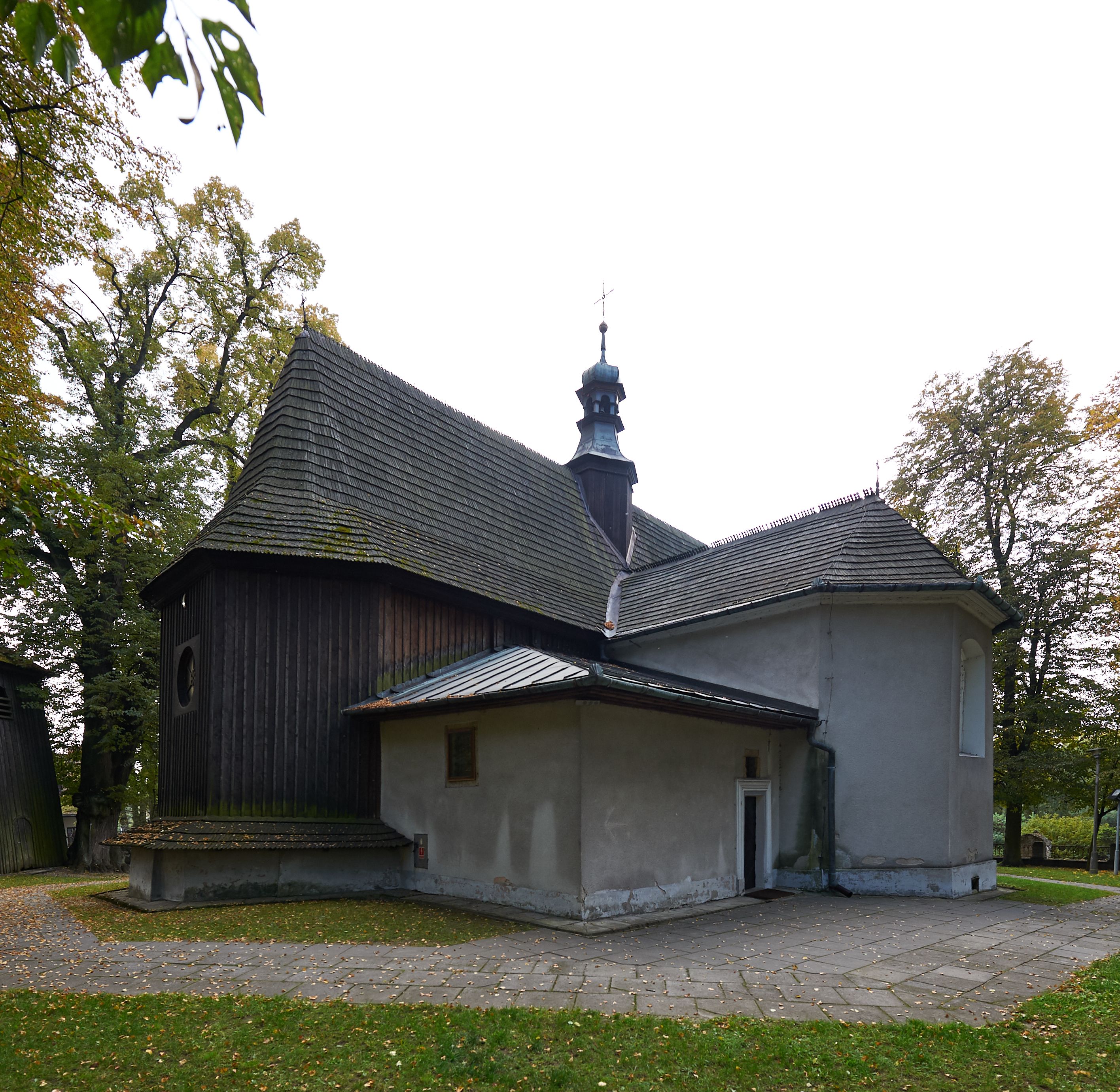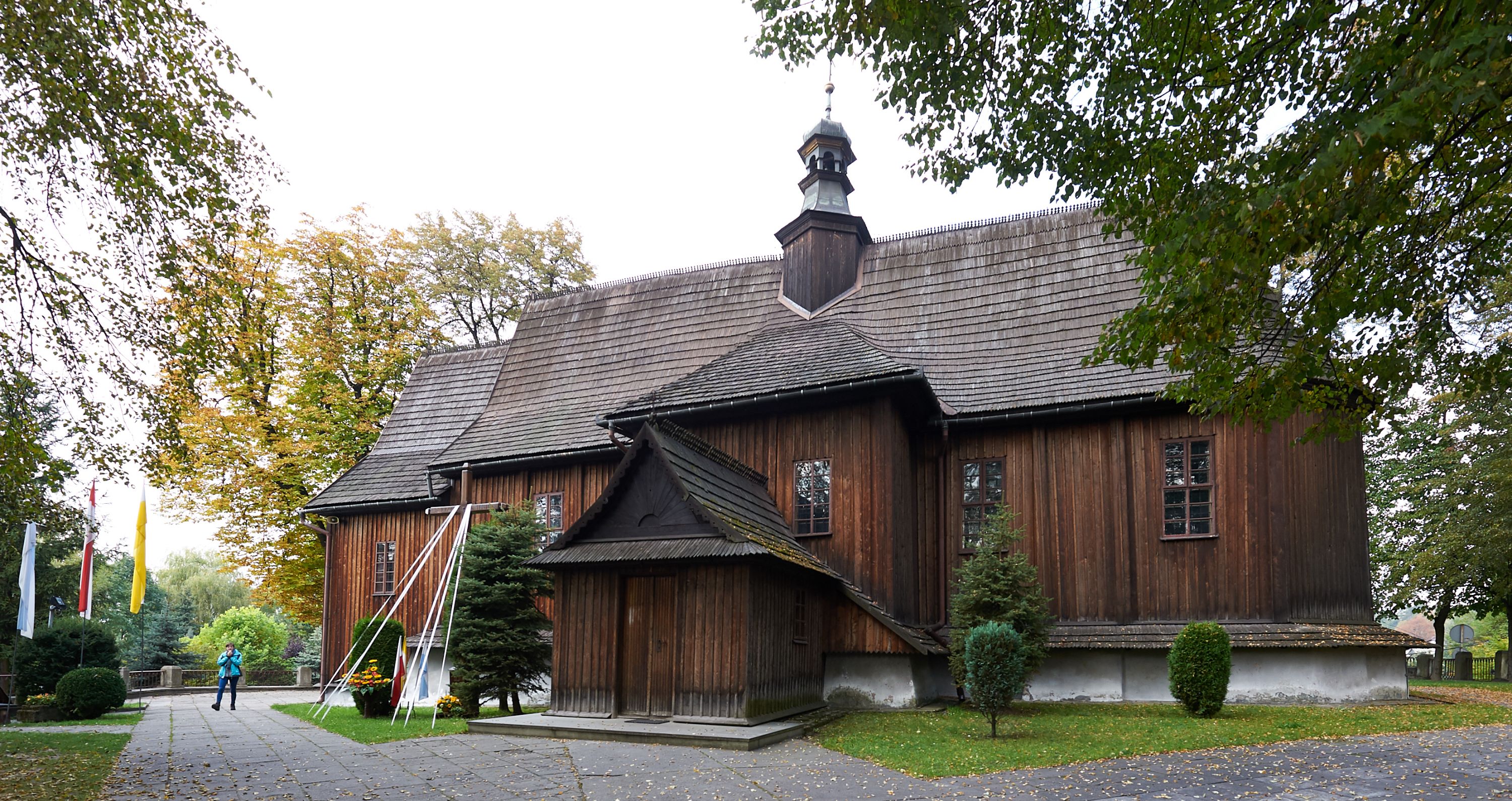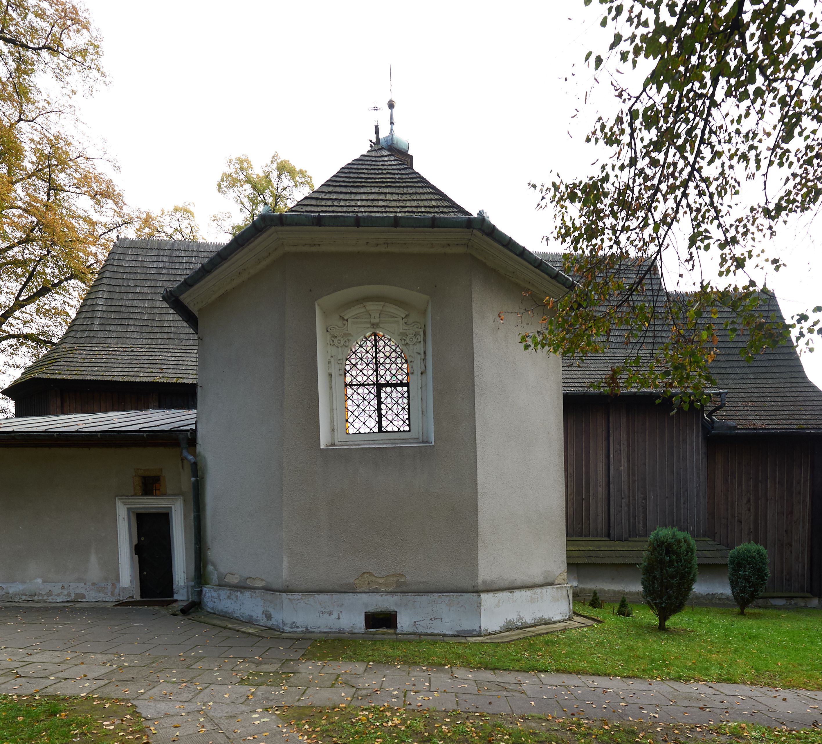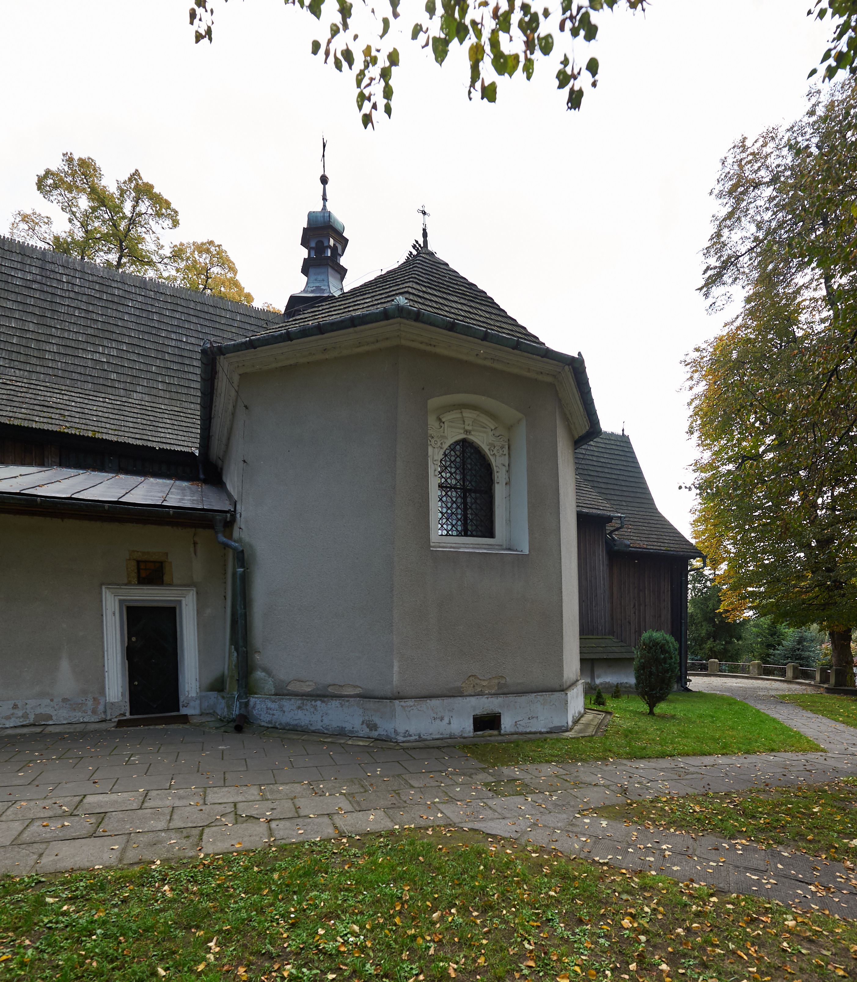 Rzadki przykład drewnianej świątyni na rzucie krzyża łacińskiego i murowaną kaplicą grobową.