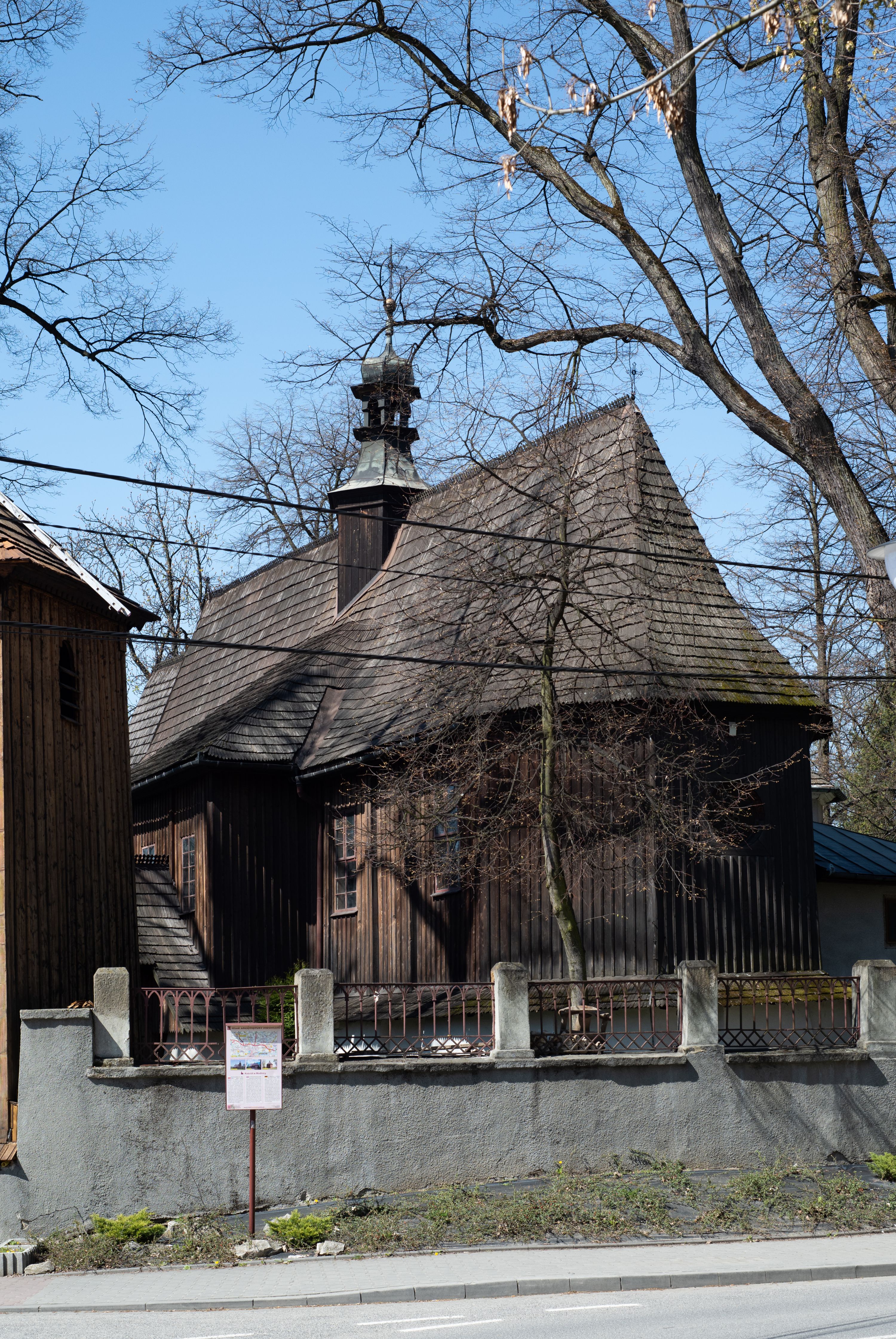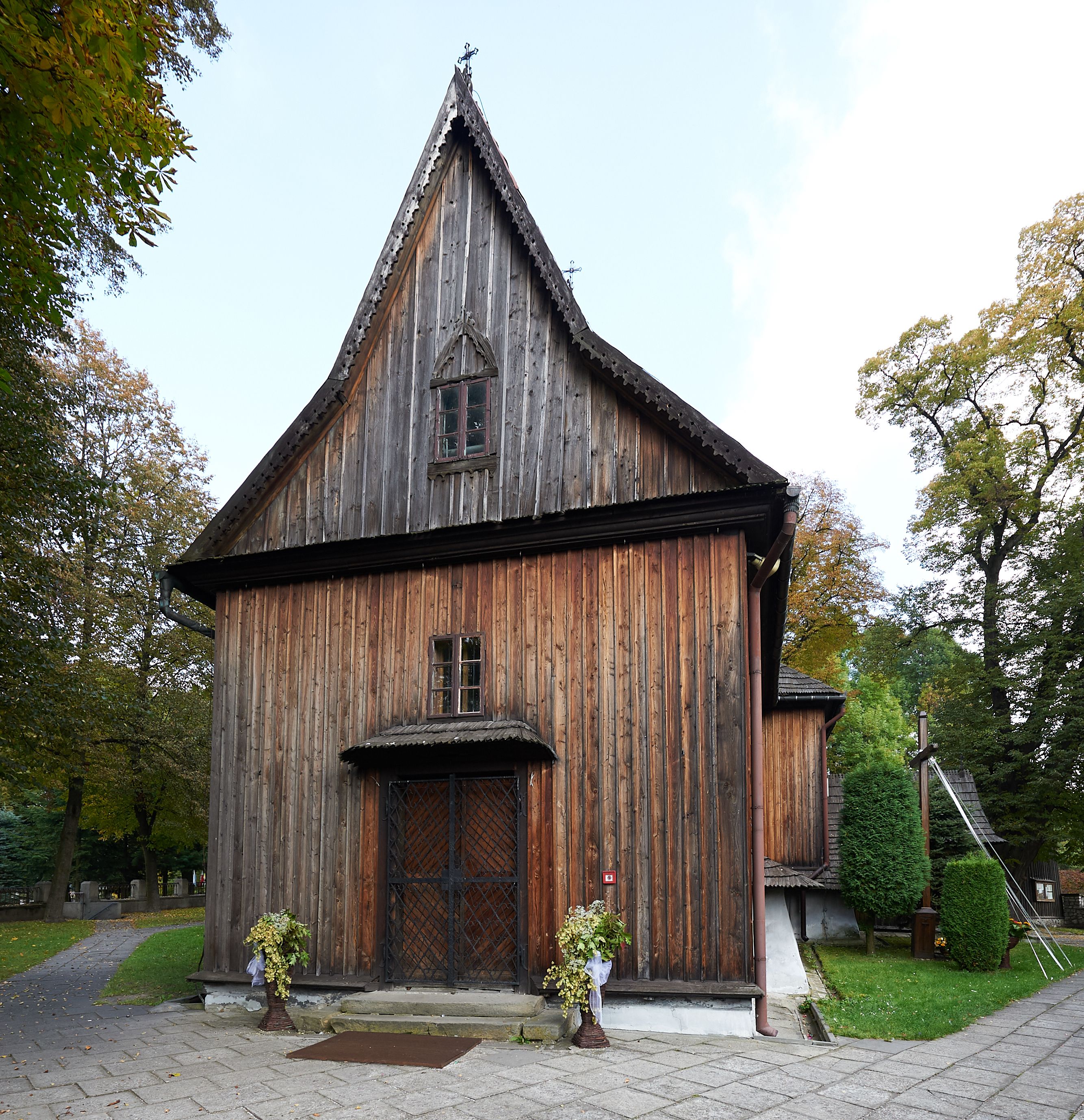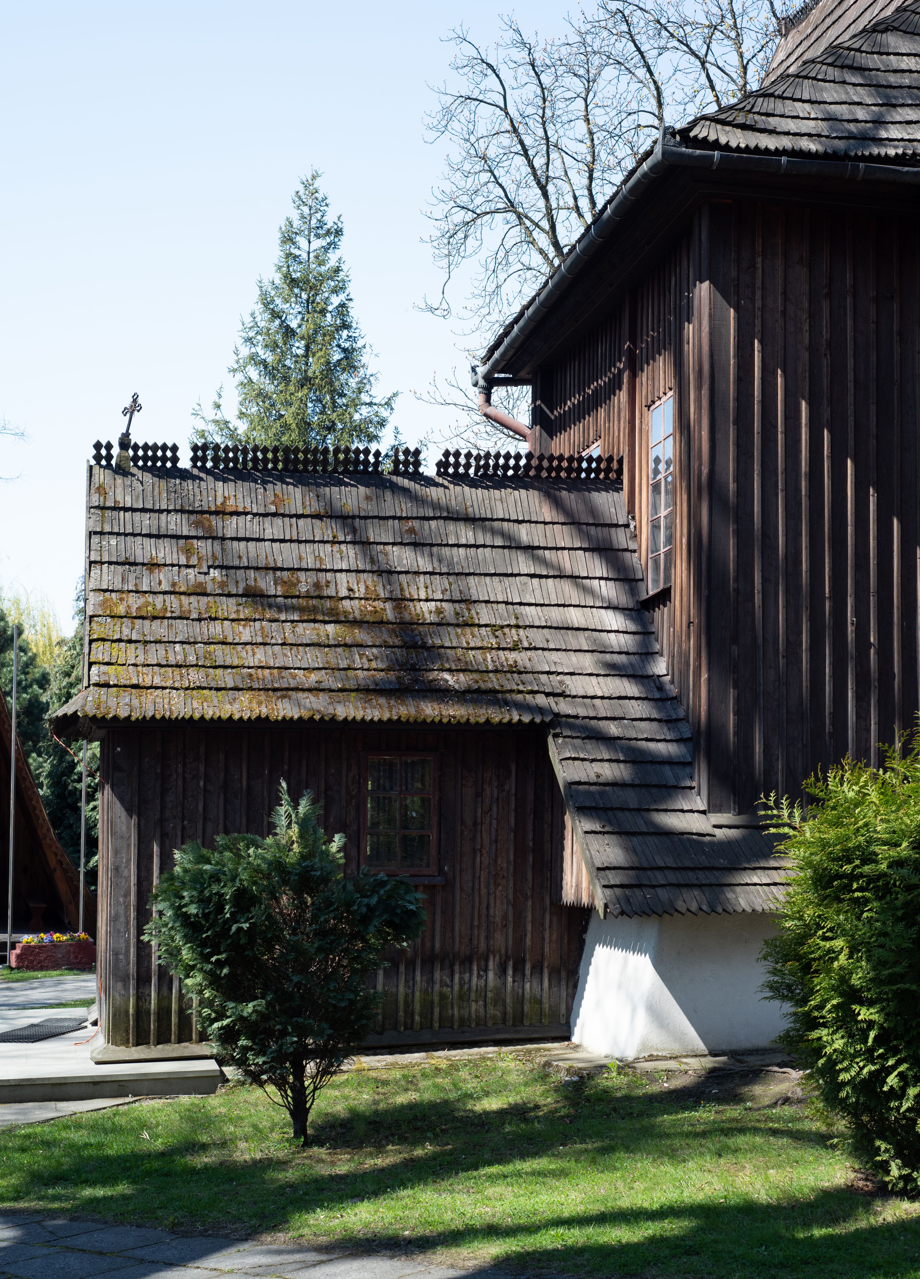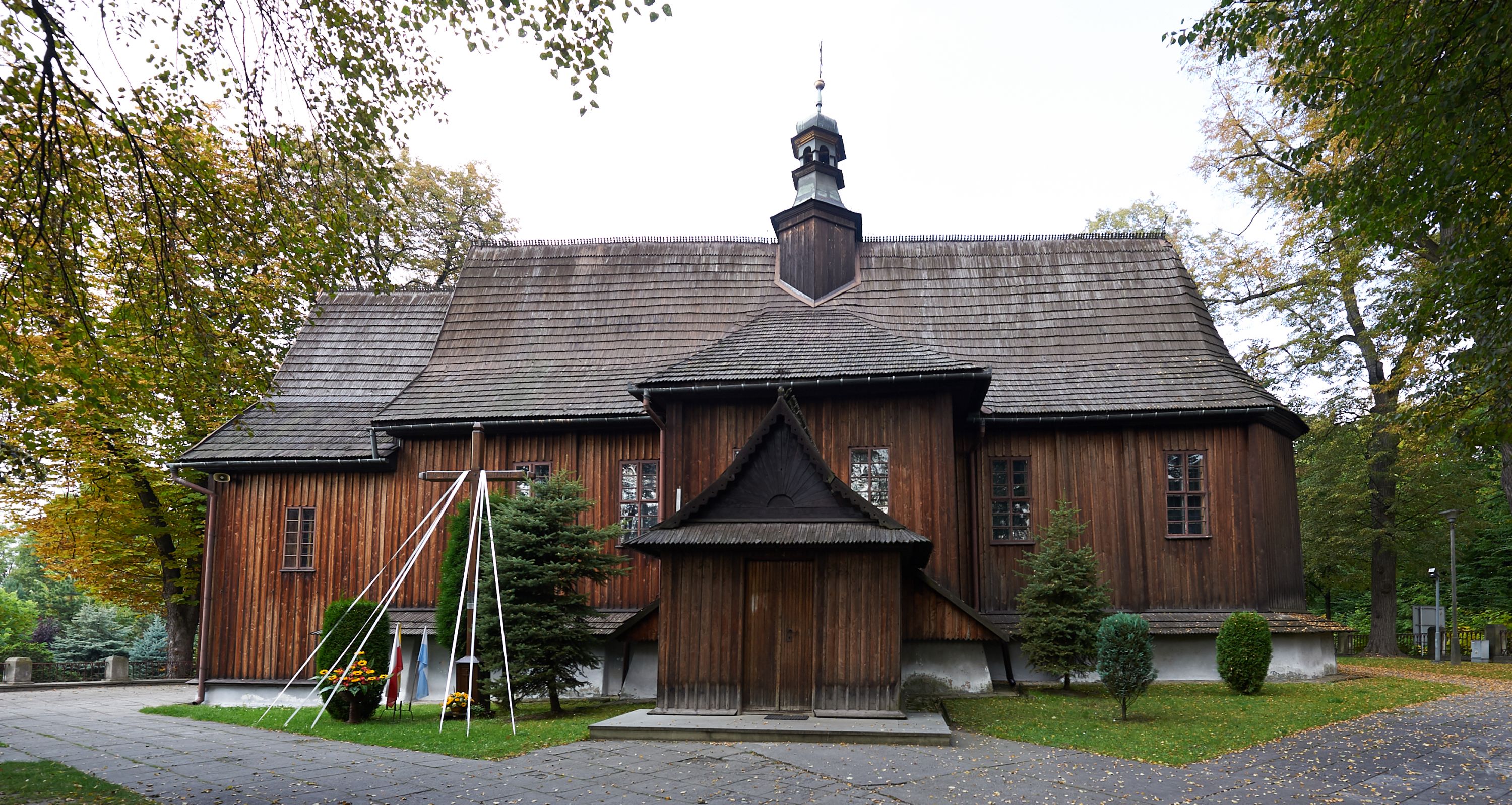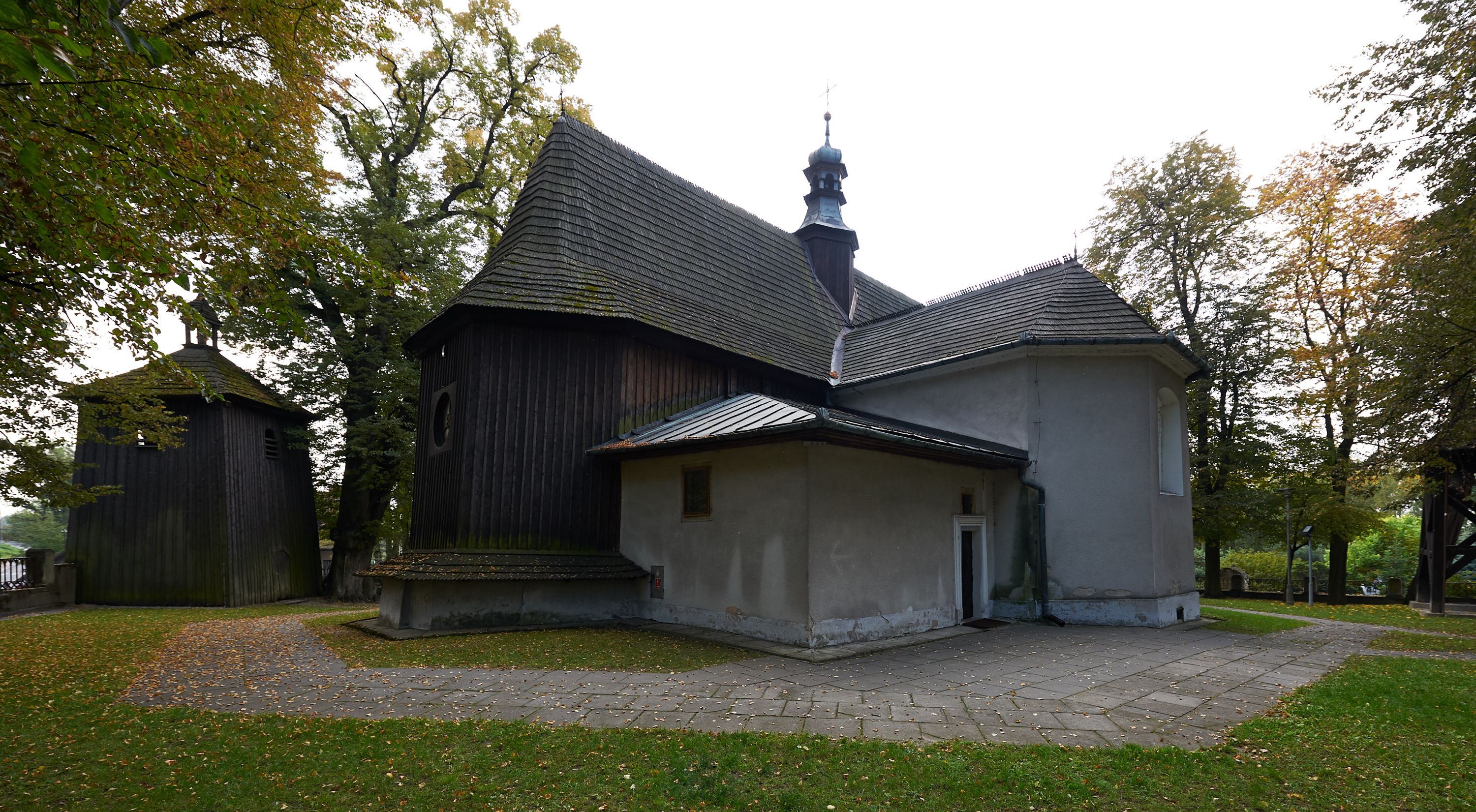 Rzadki przykład drewnianej świątyni na rzucie krzyża łacińskiego i murowaną kaplicą grobową.