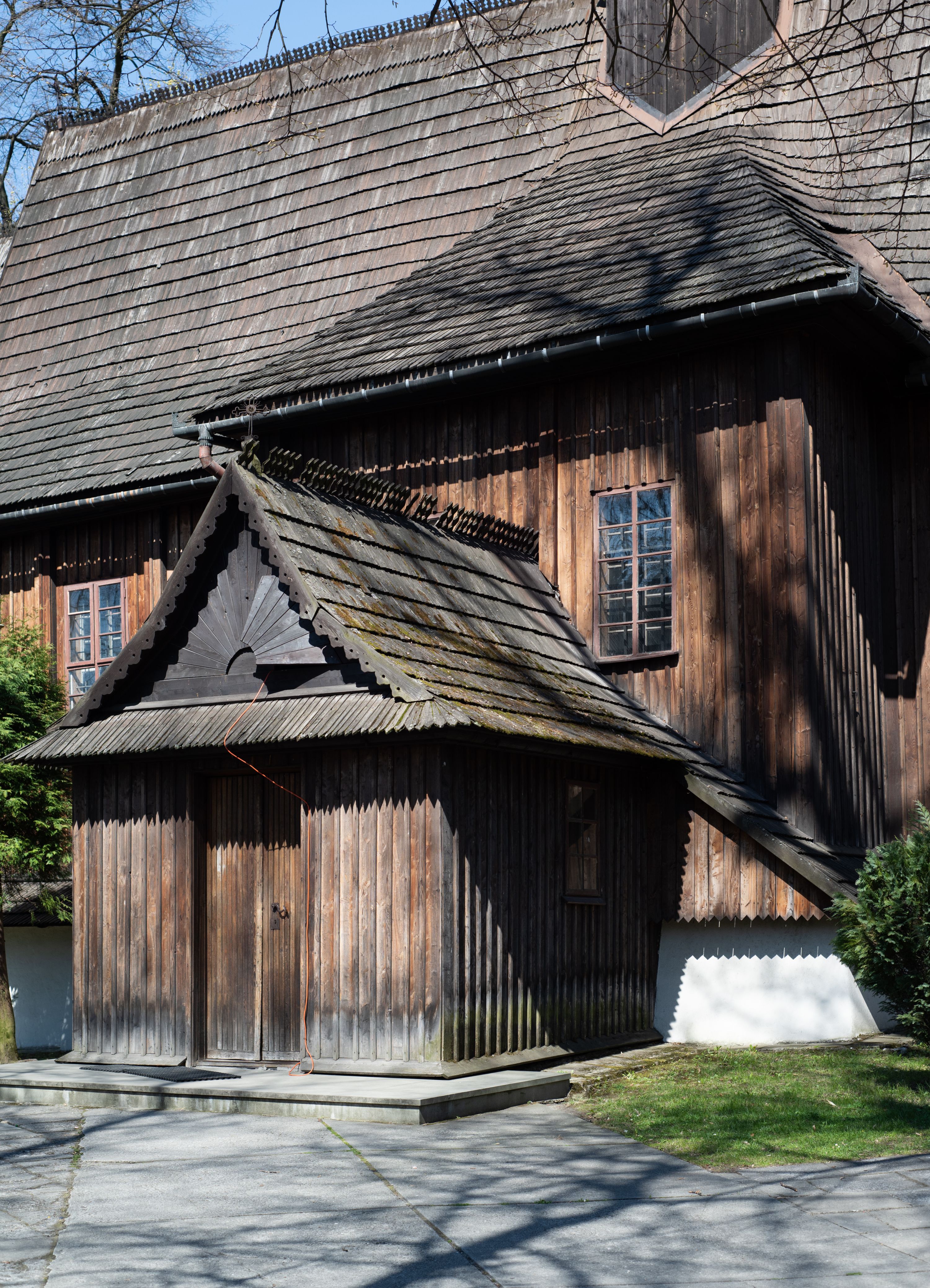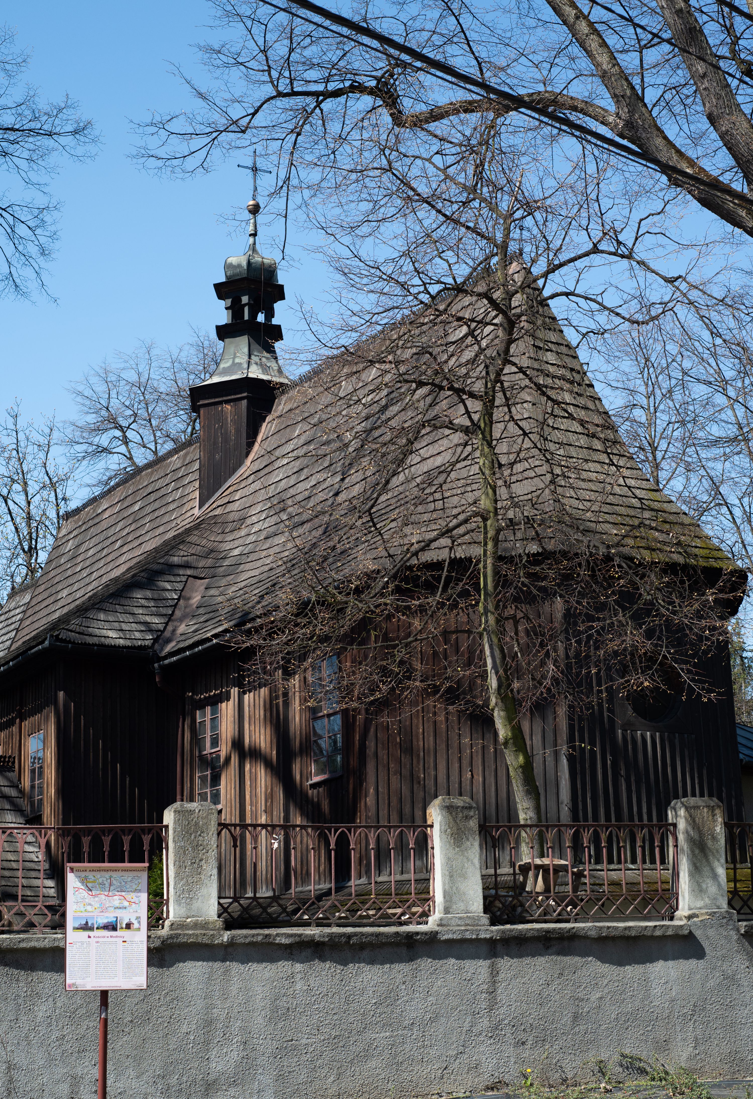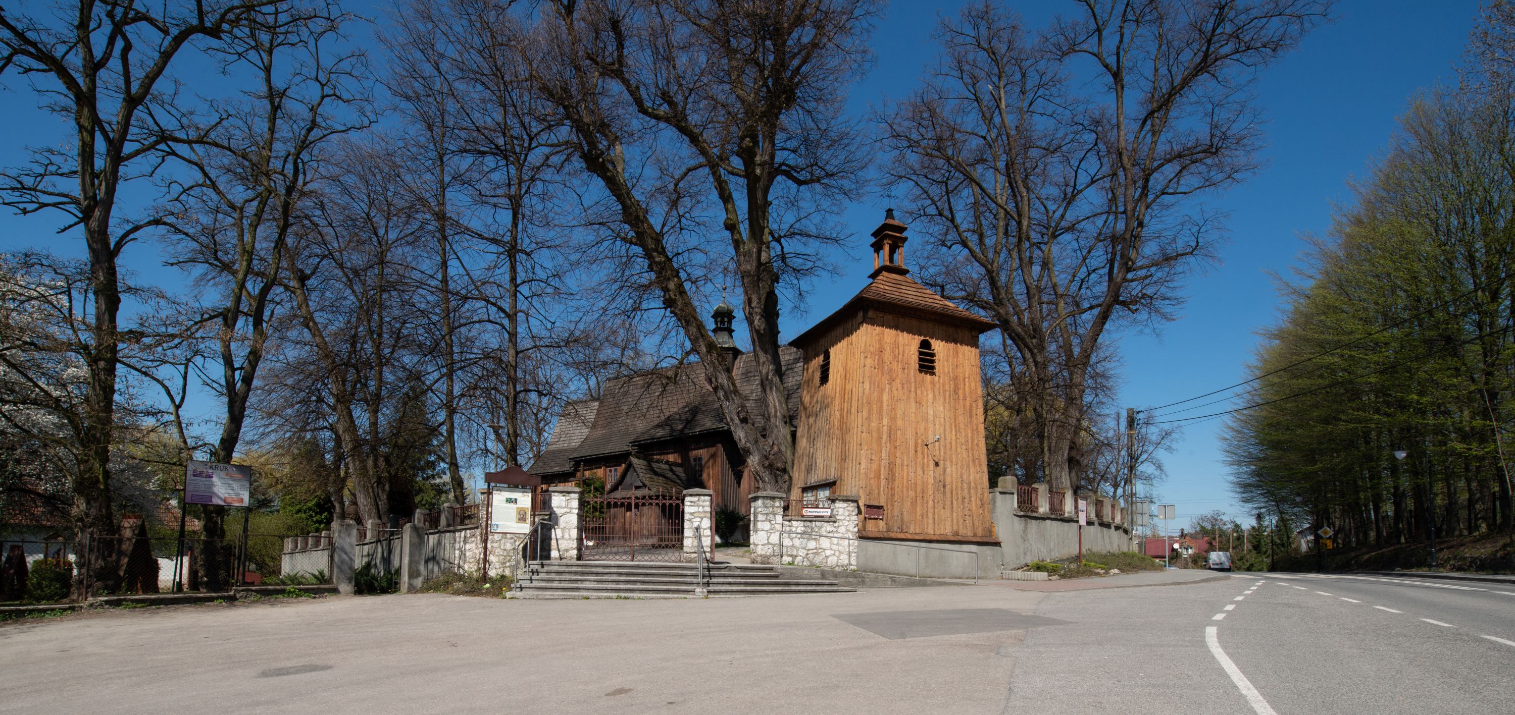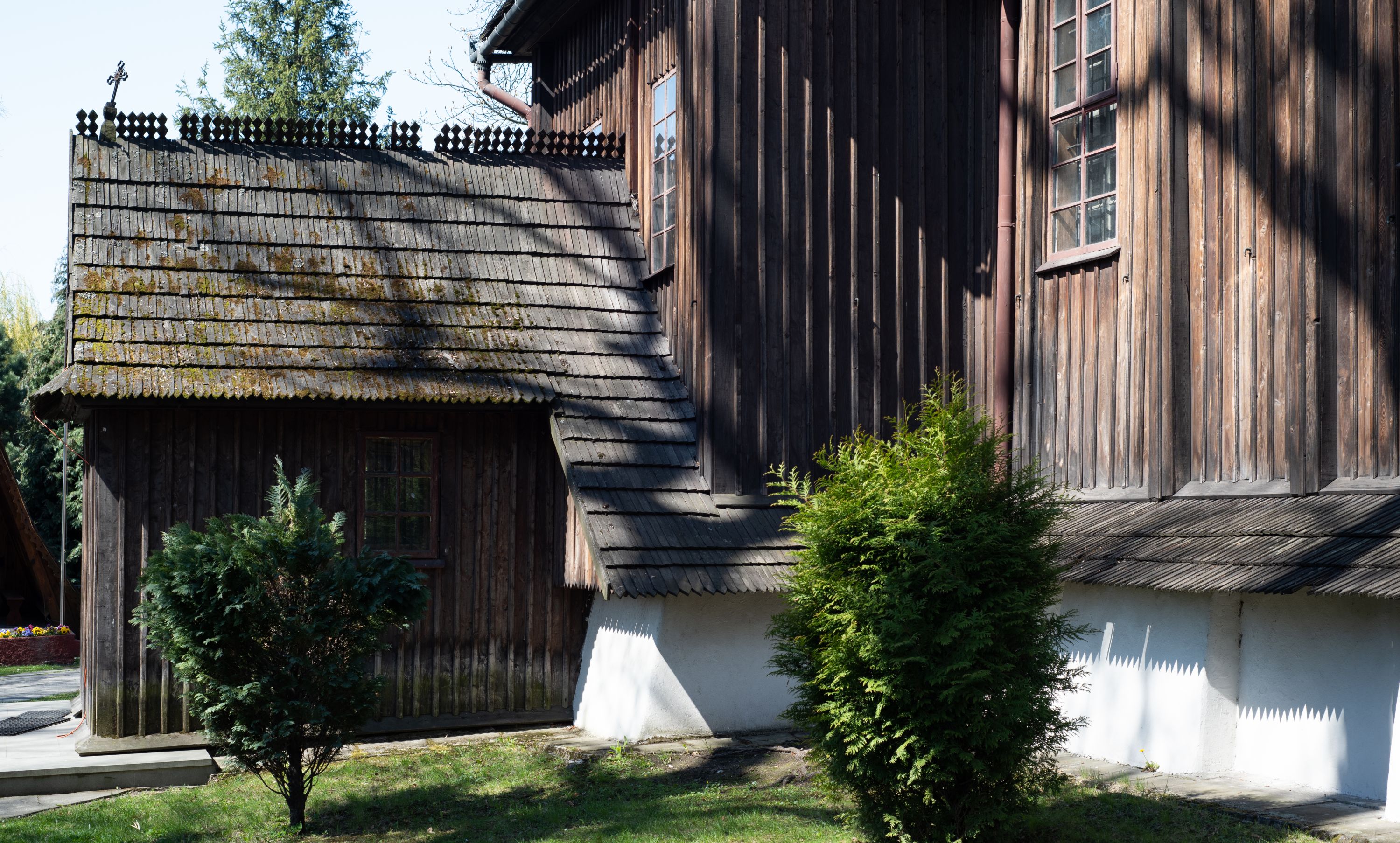 Rzadki przykład drewnianej świątyni na rzucie krzyża łacińskiego i murowaną kaplicą grobową.