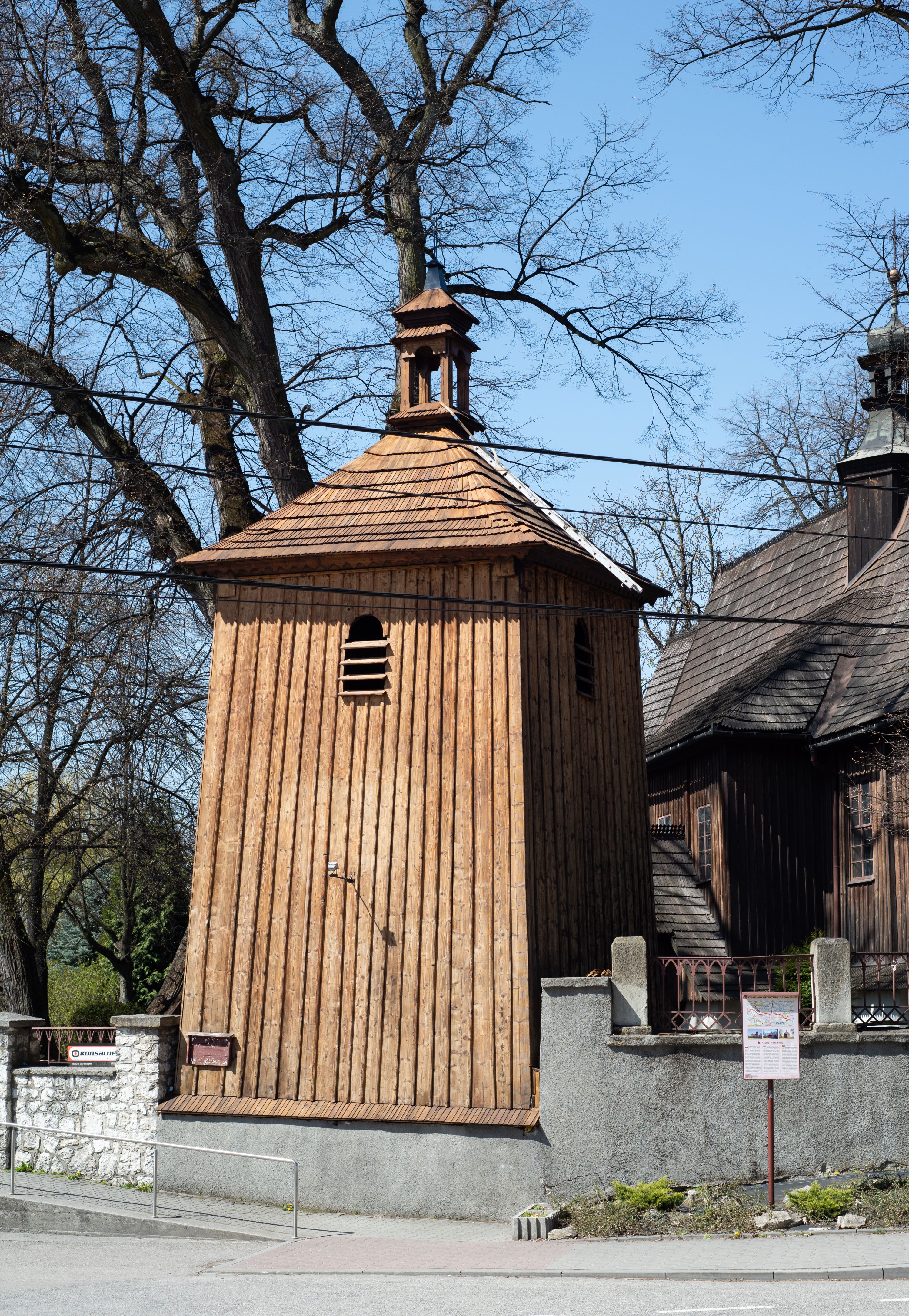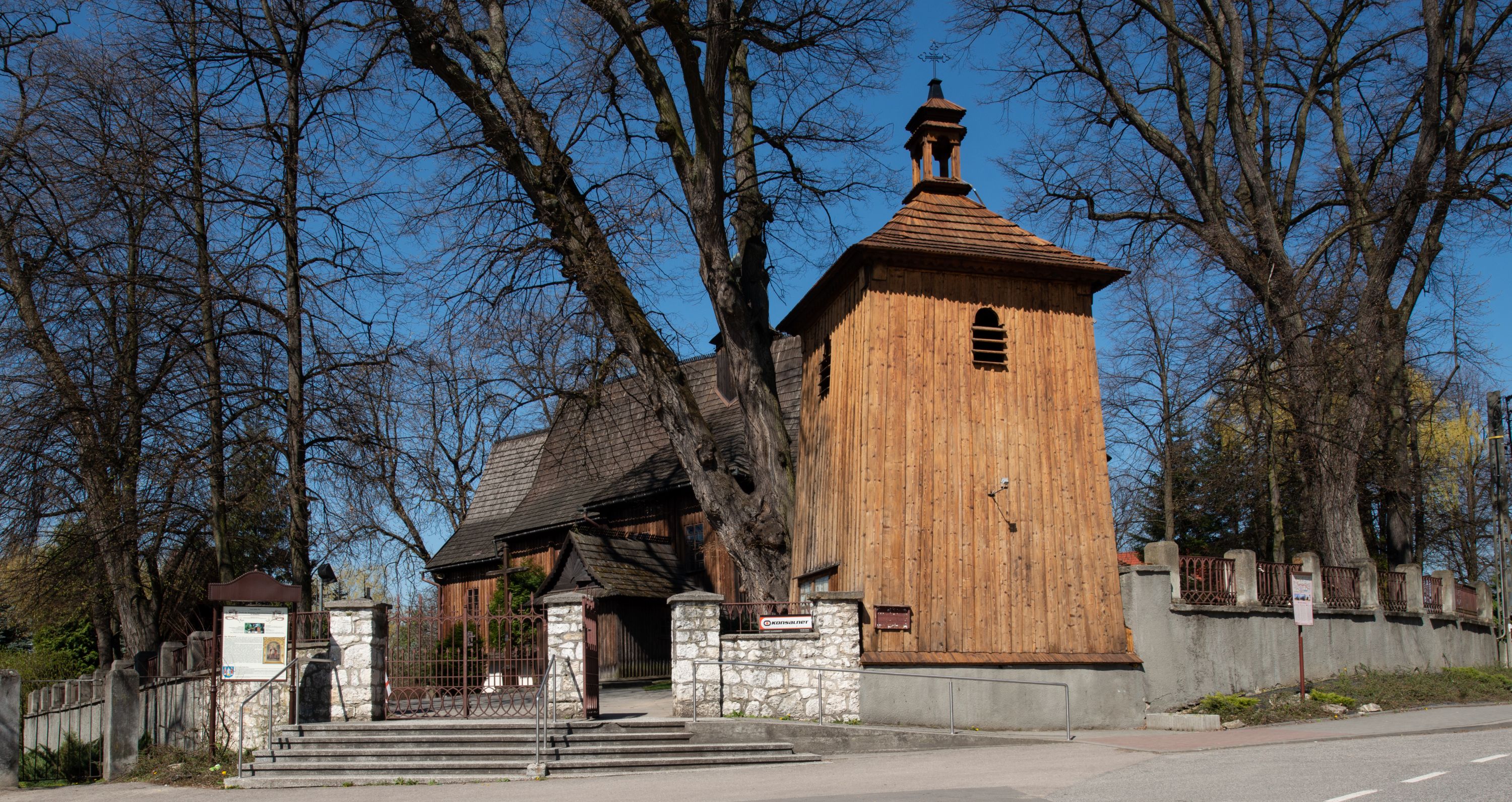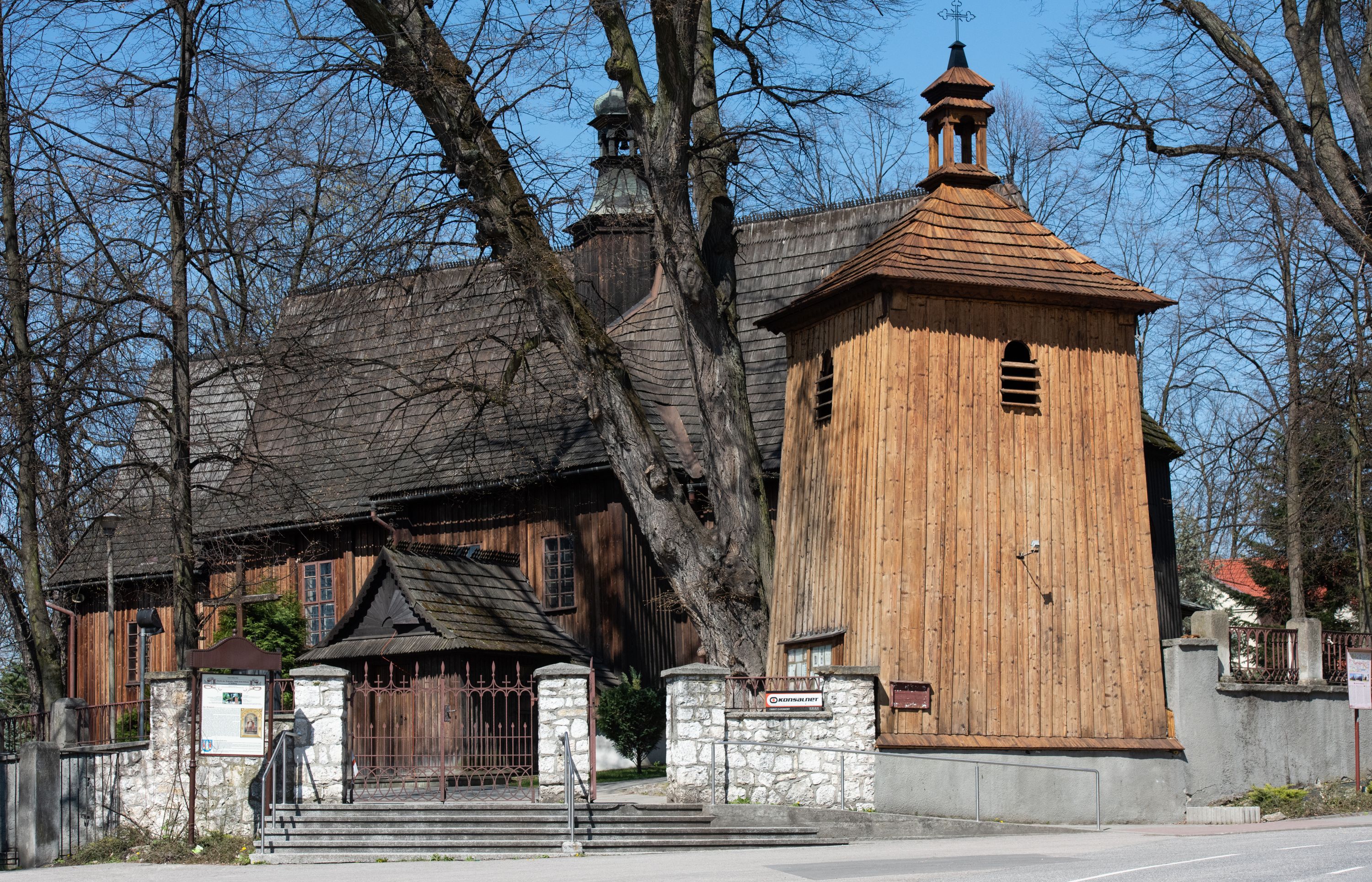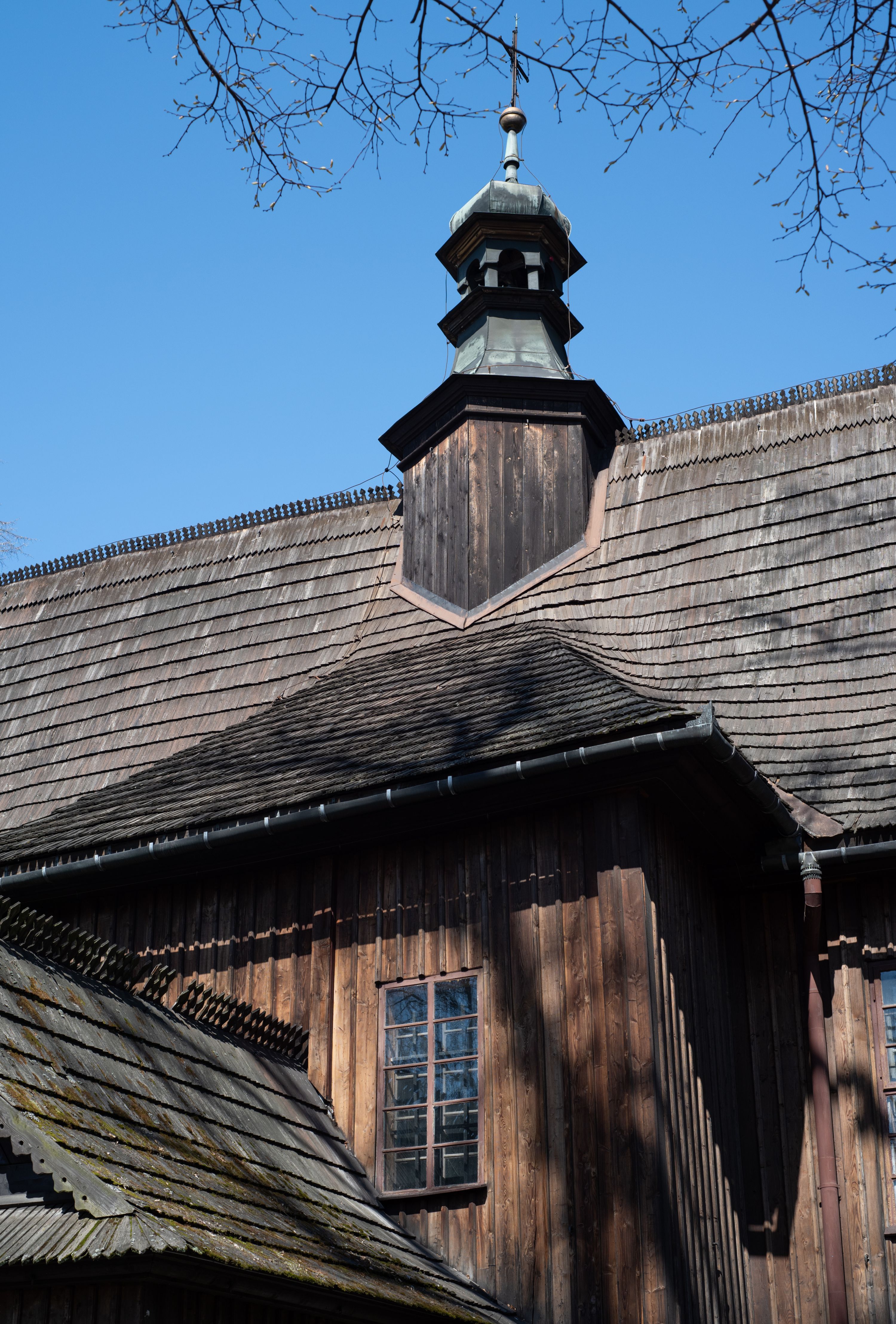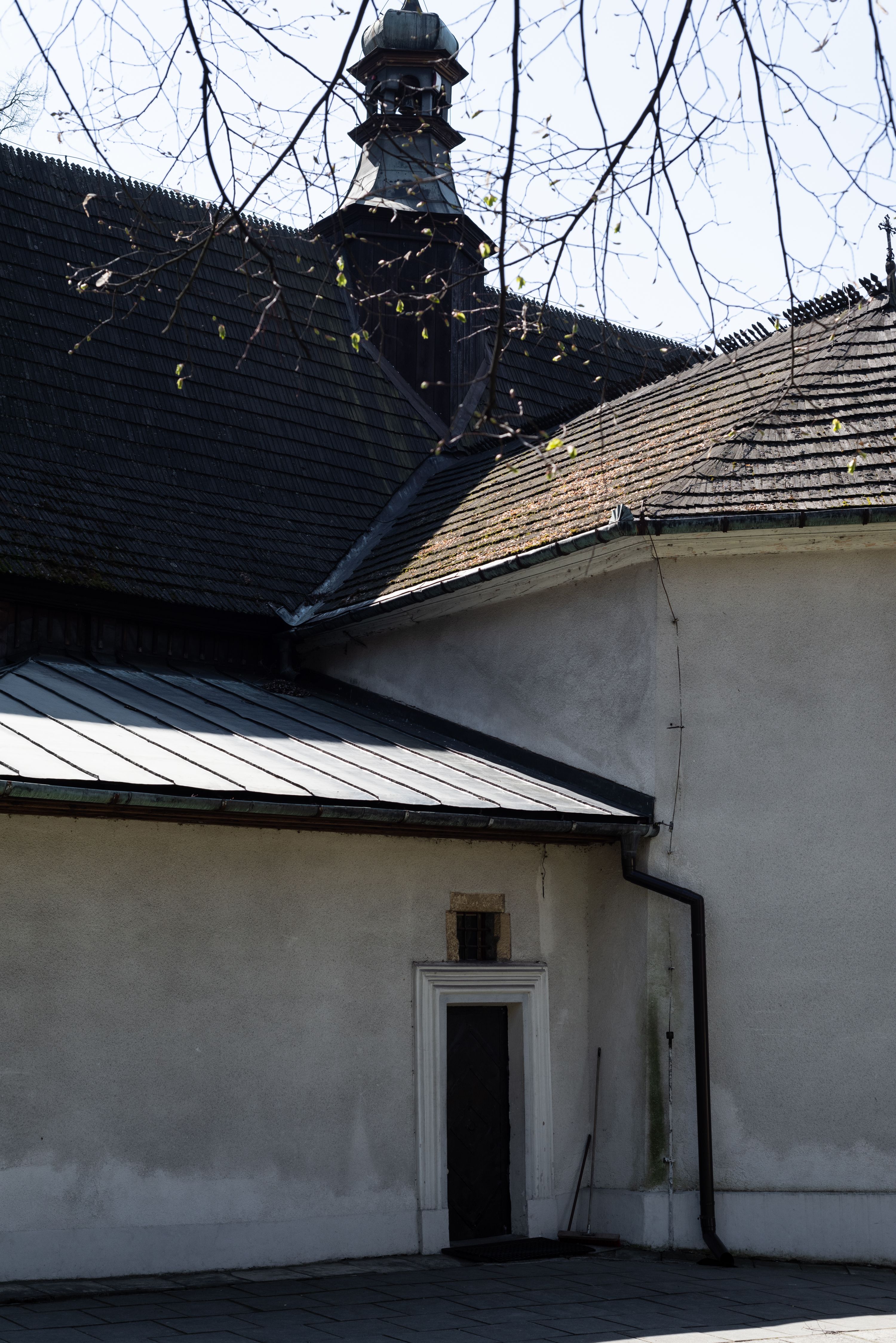 Rzadki przykład drewnianej świątyni na rzucie krzyża łacińskiego i murowaną kaplicą grobową.