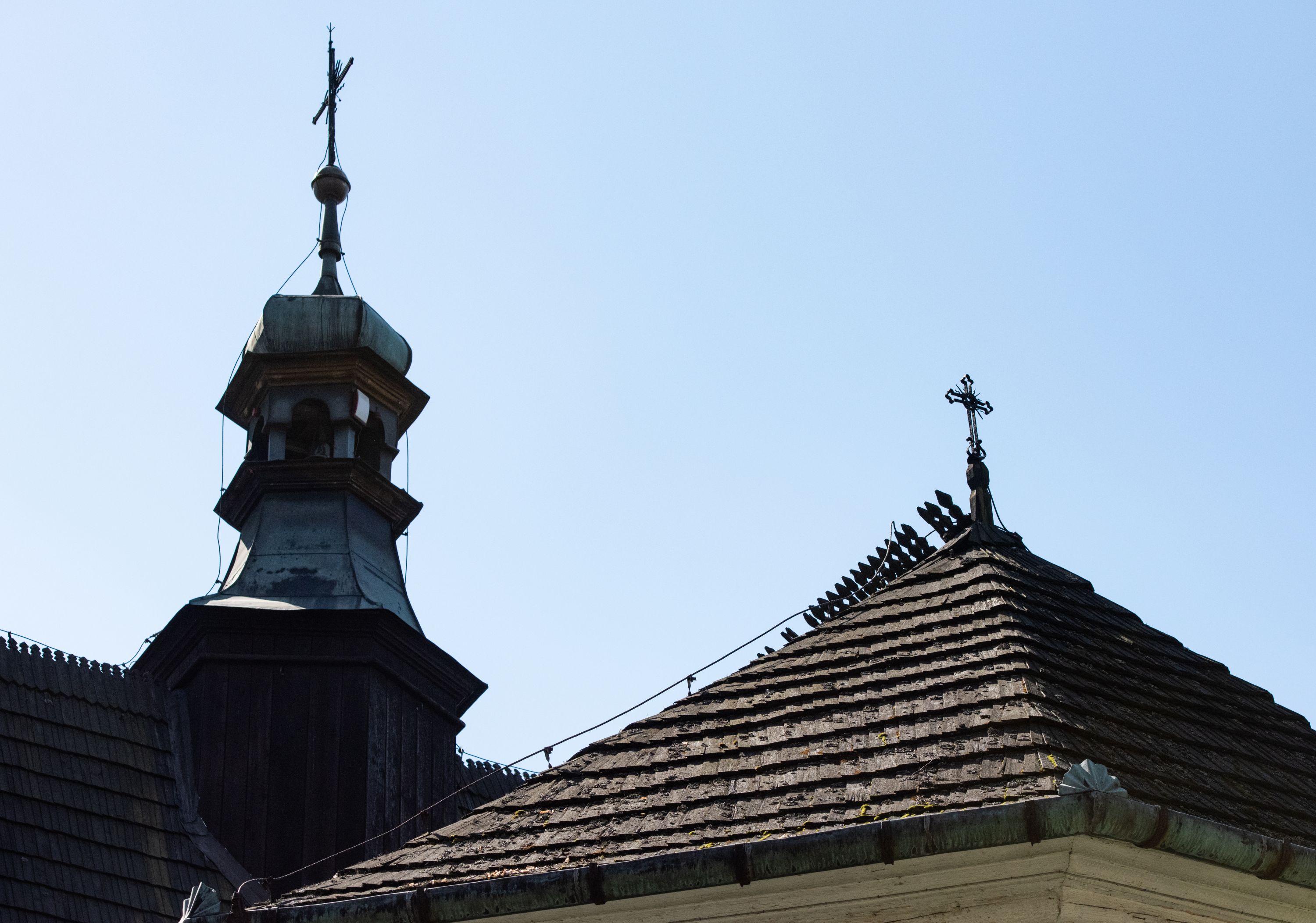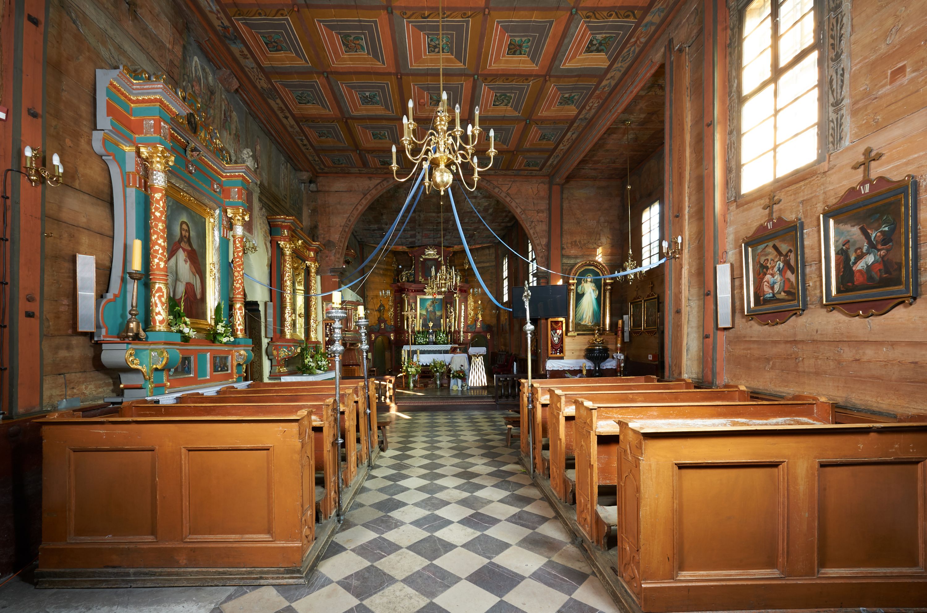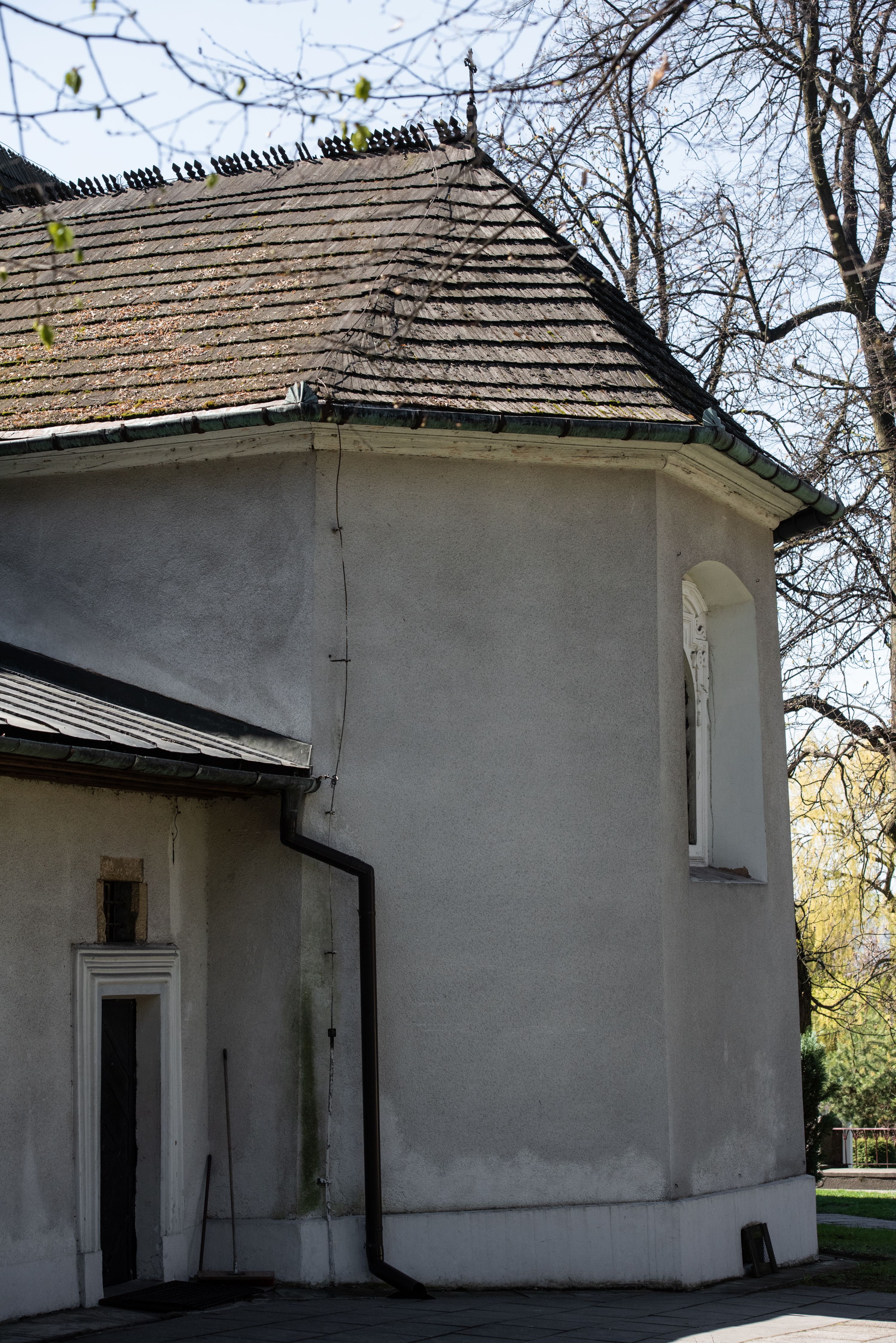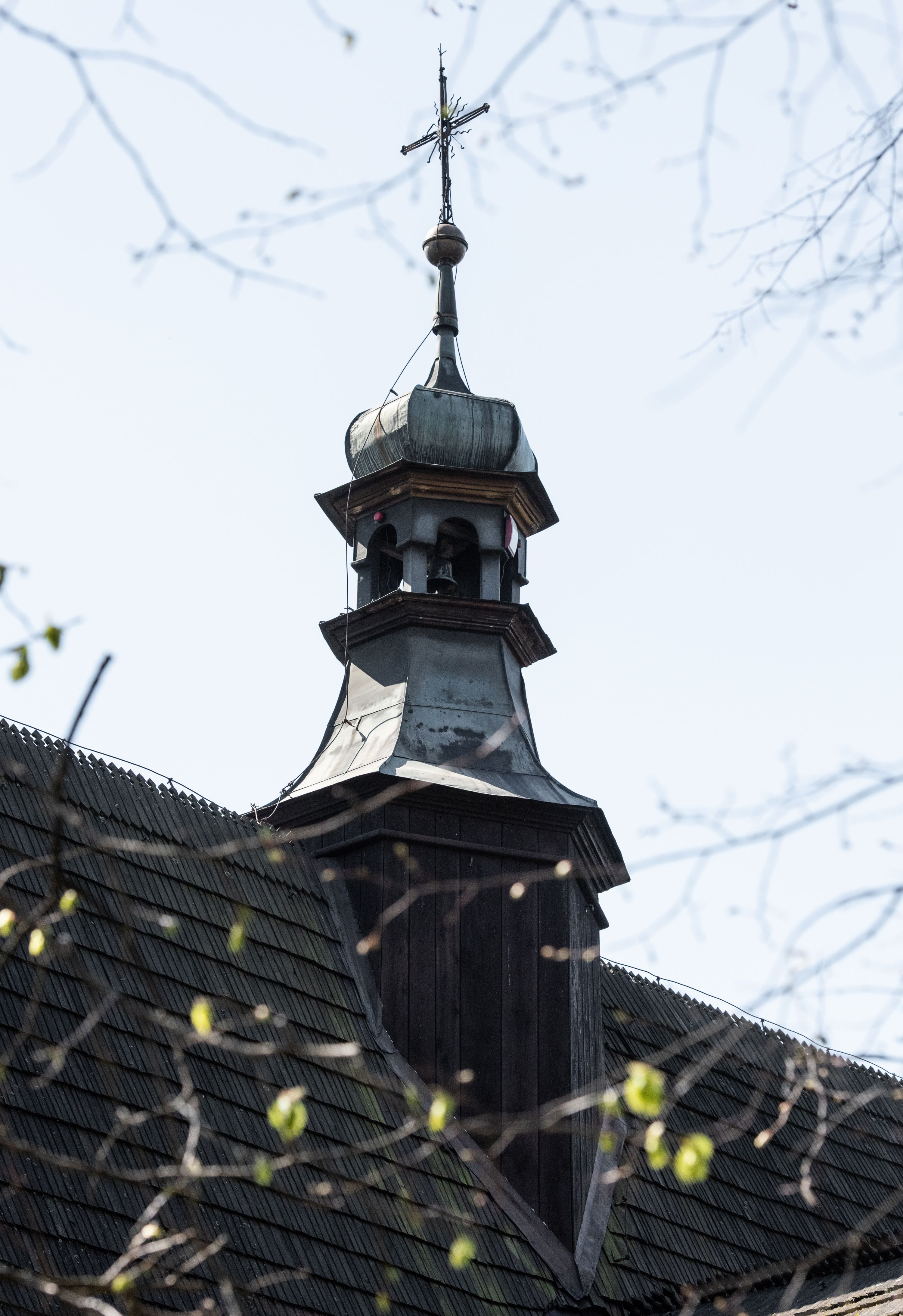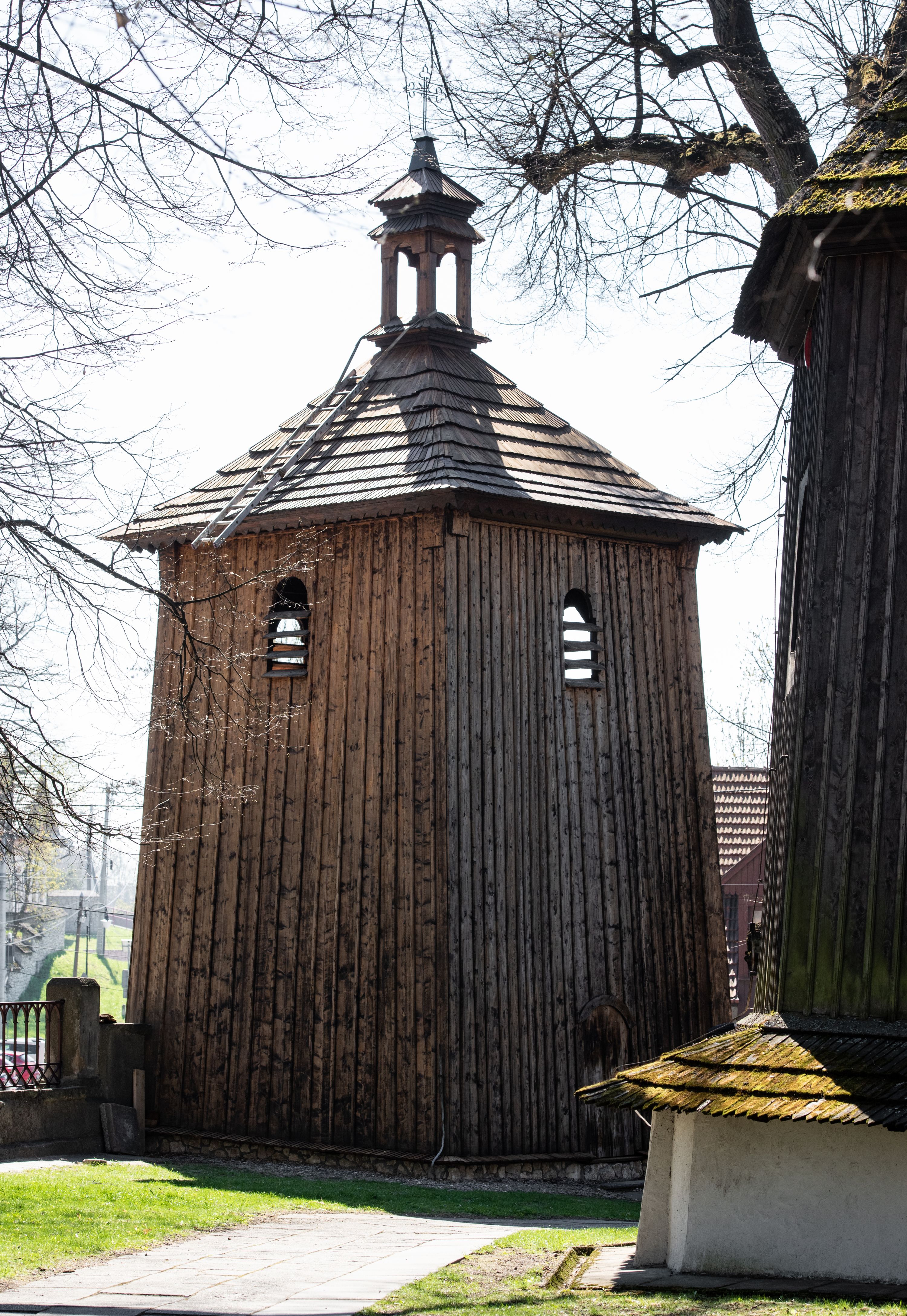 Rzadki przykład drewnianej świątyni na rzucie krzyża łacińskiego i murowaną kaplicą grobową.