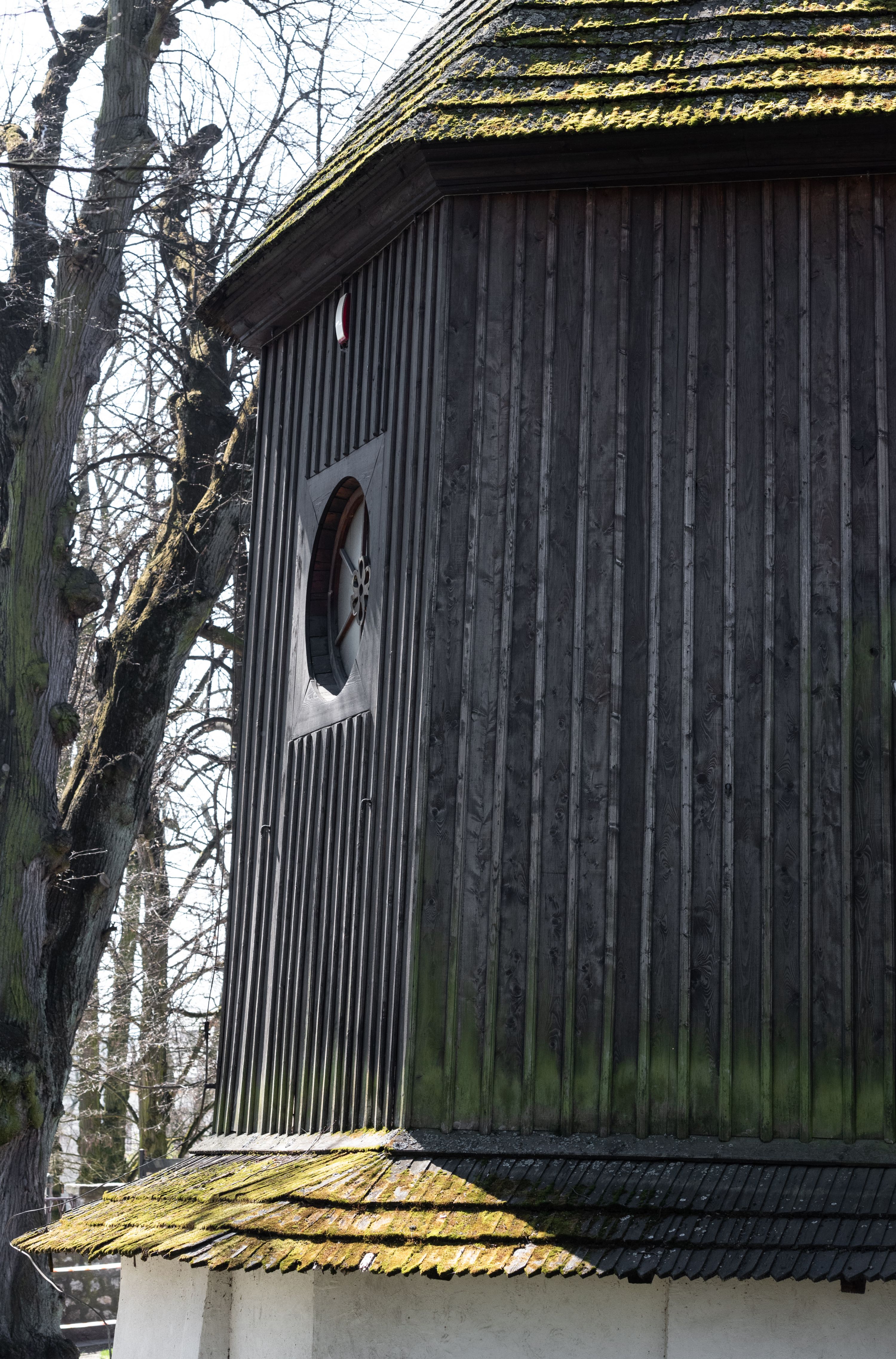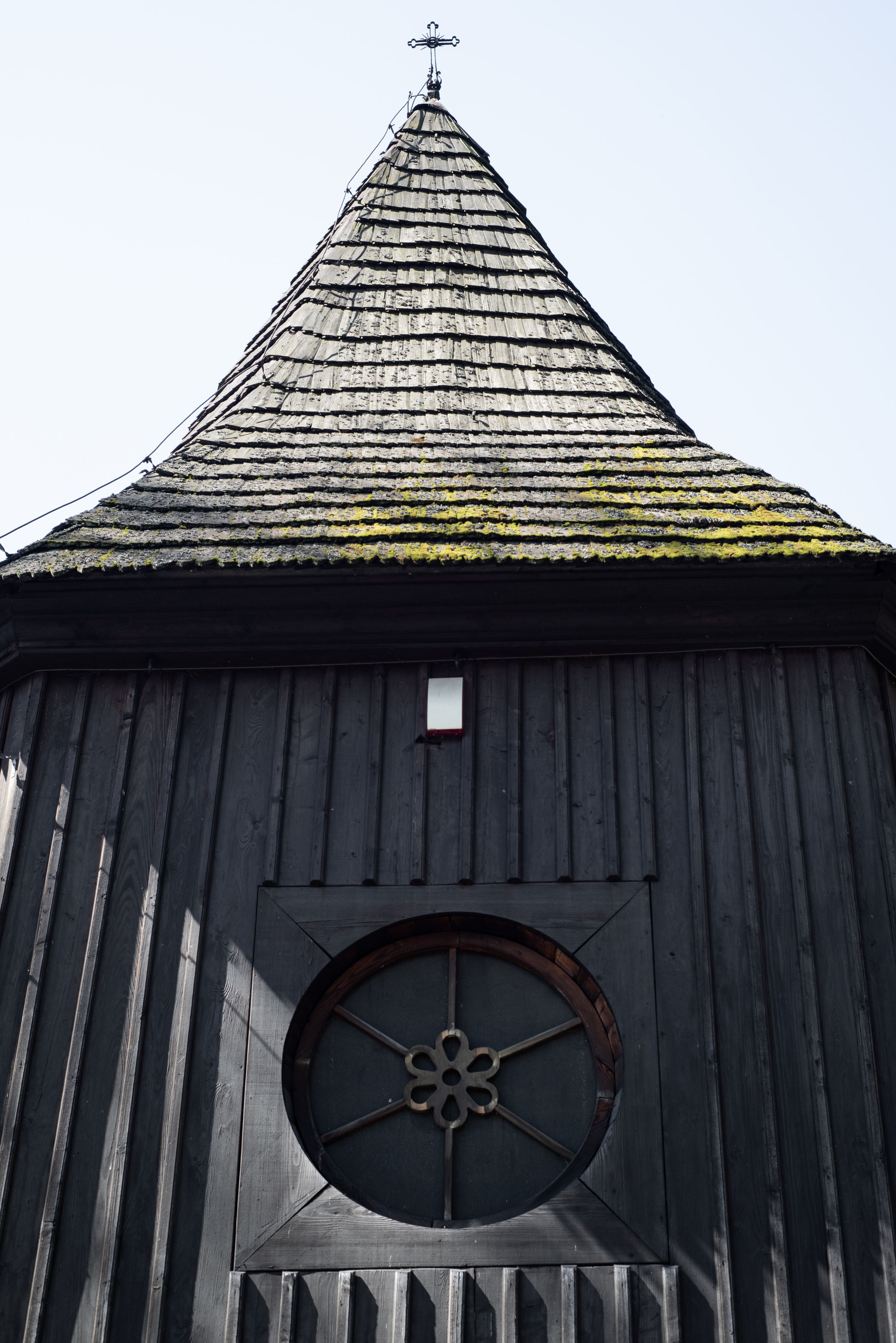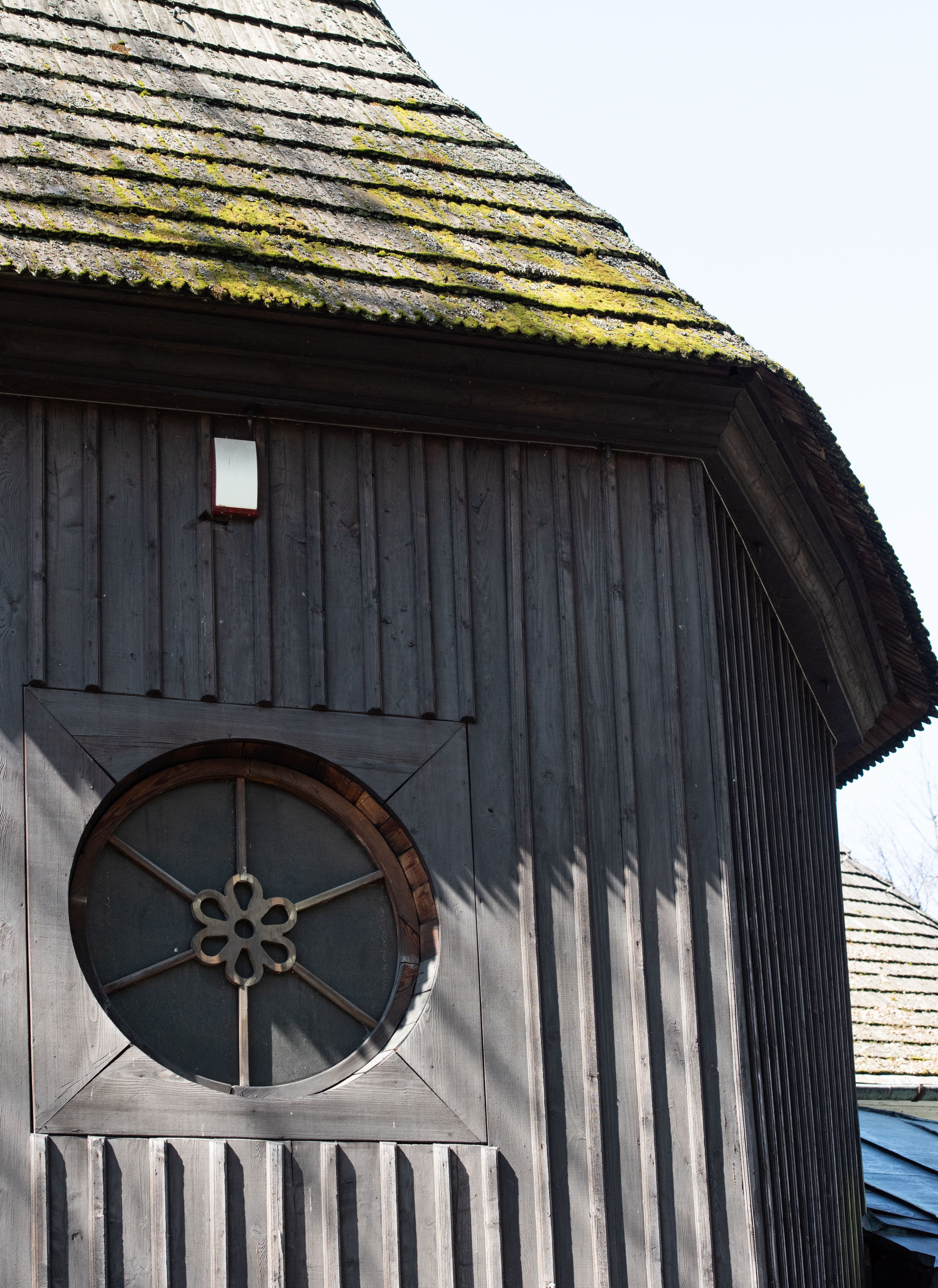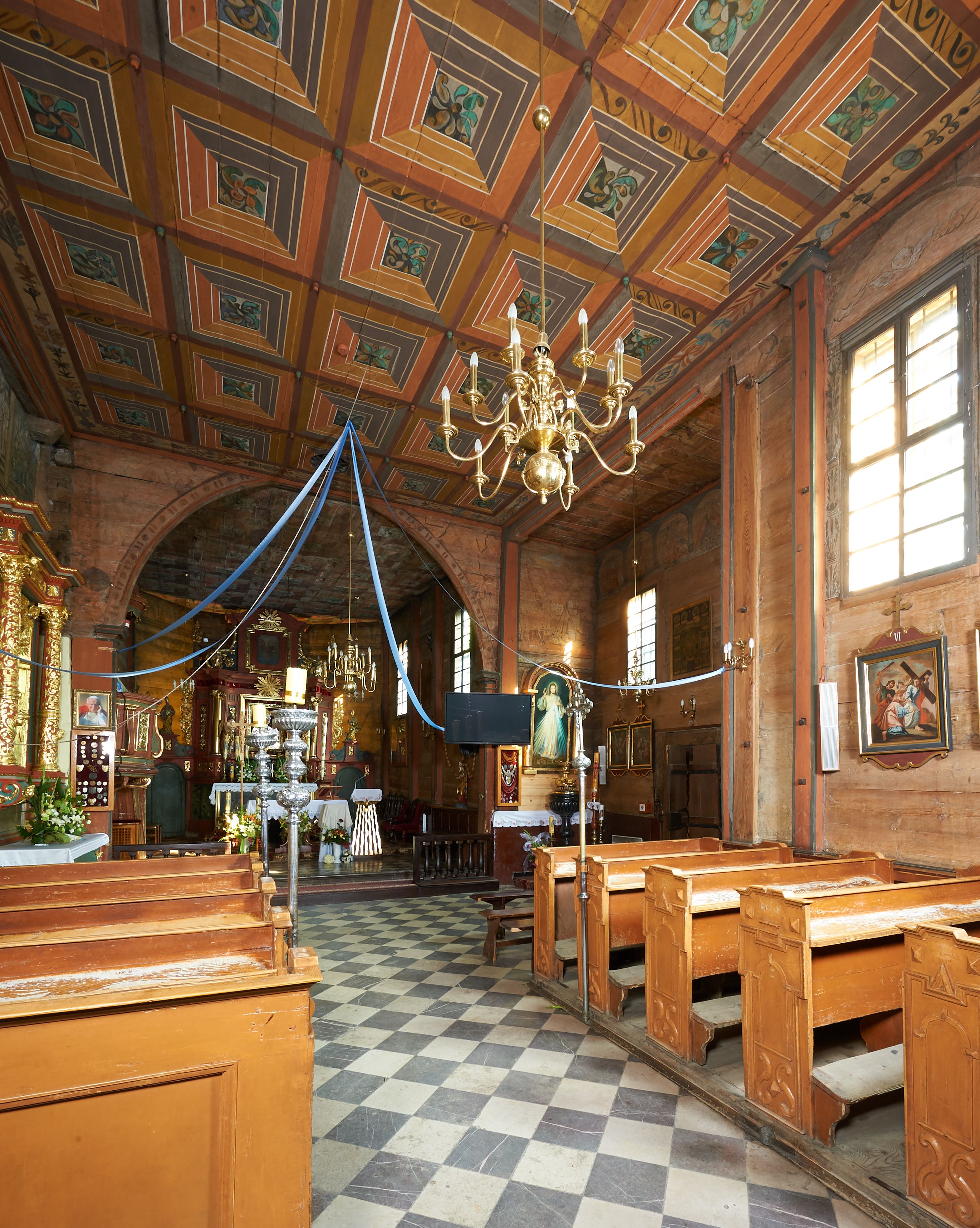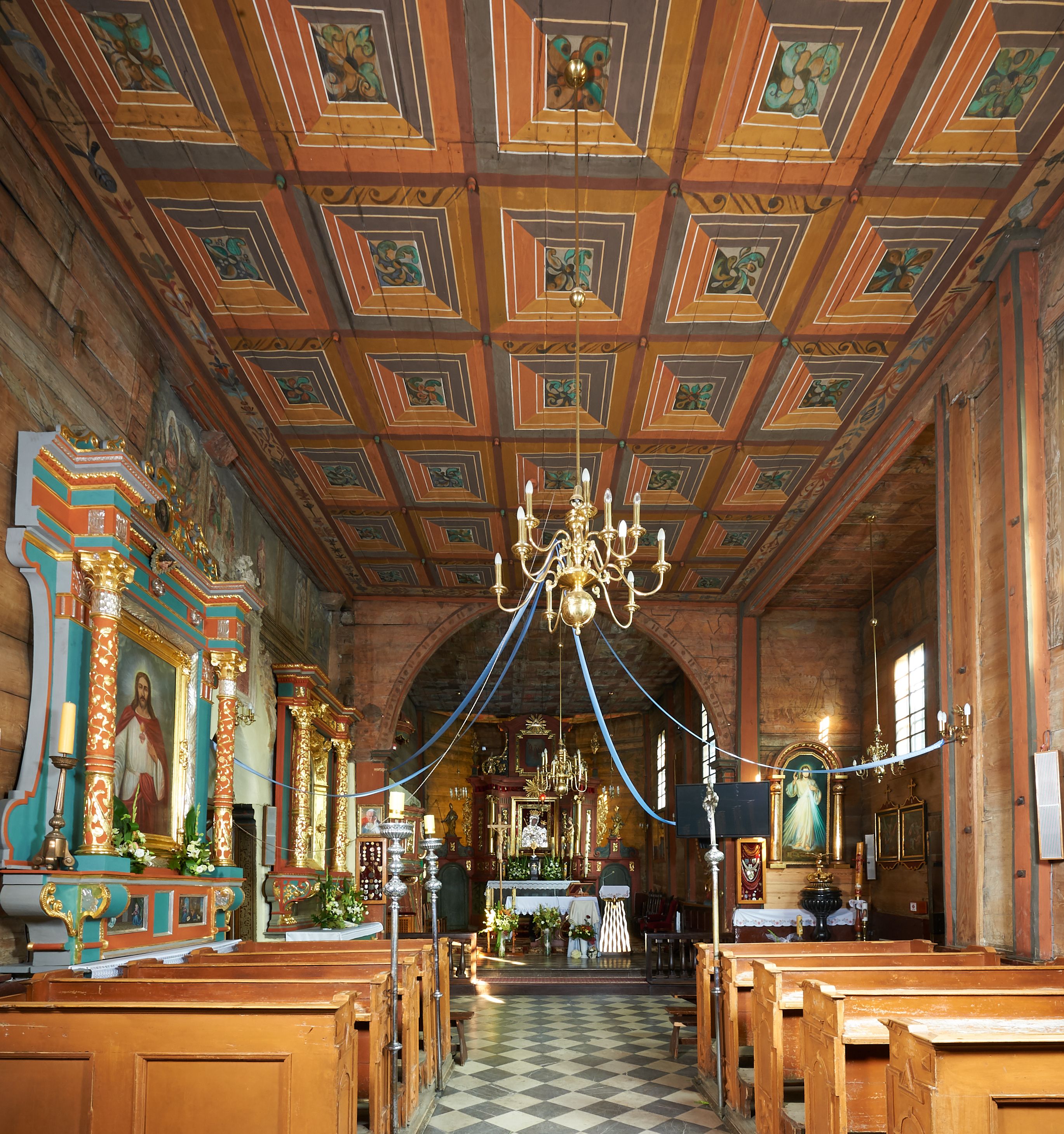 Rzadki przykład drewnianej świątyni na rzucie krzyża łacińskiego i murowaną kaplicą grobową.