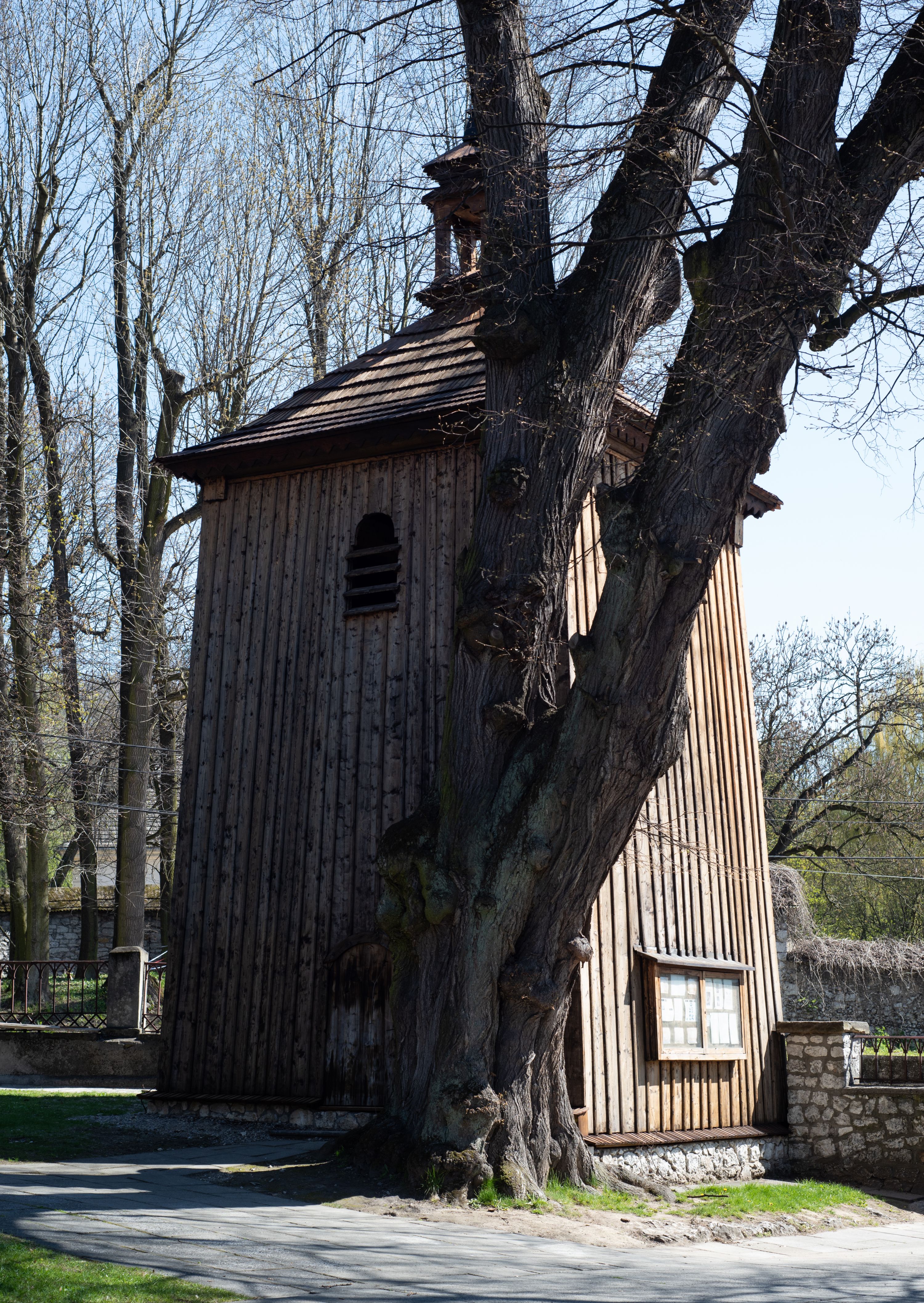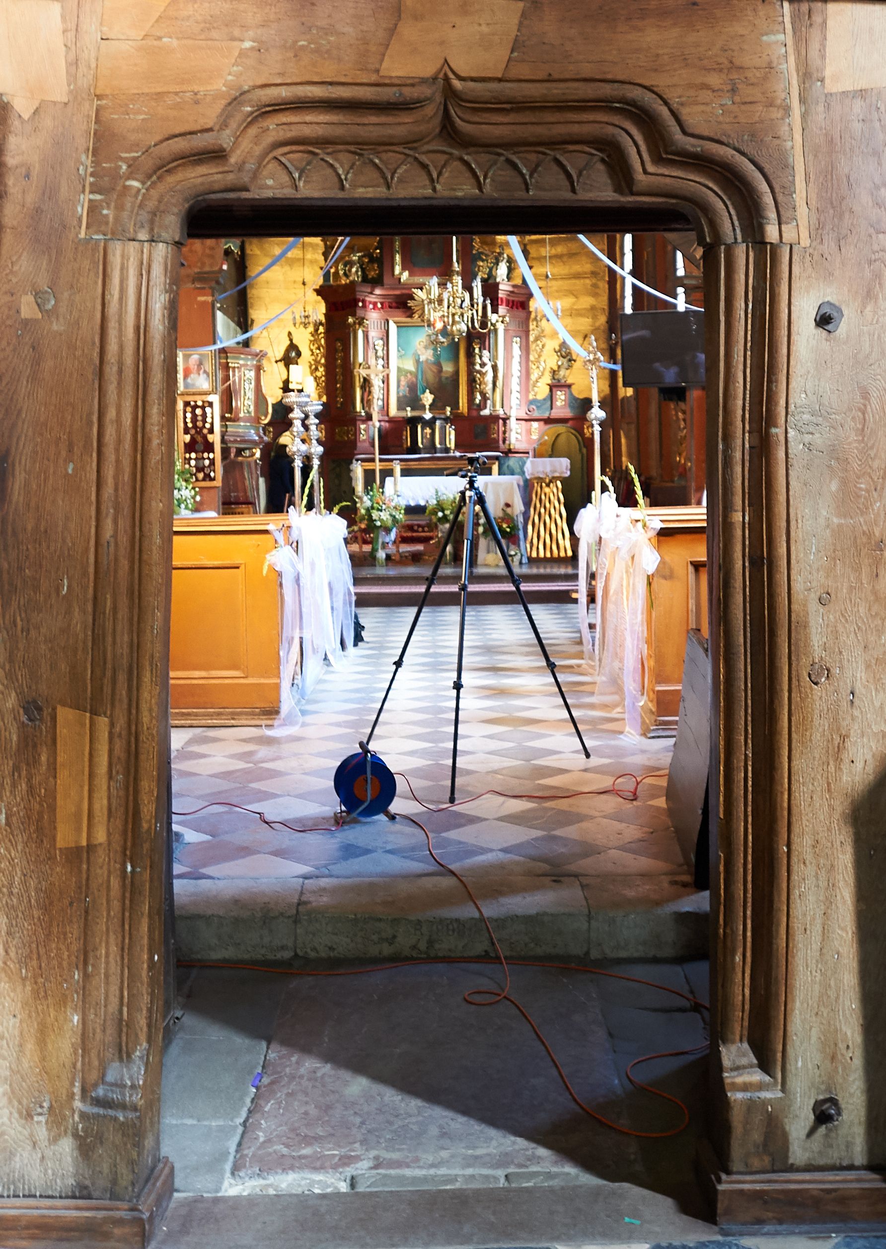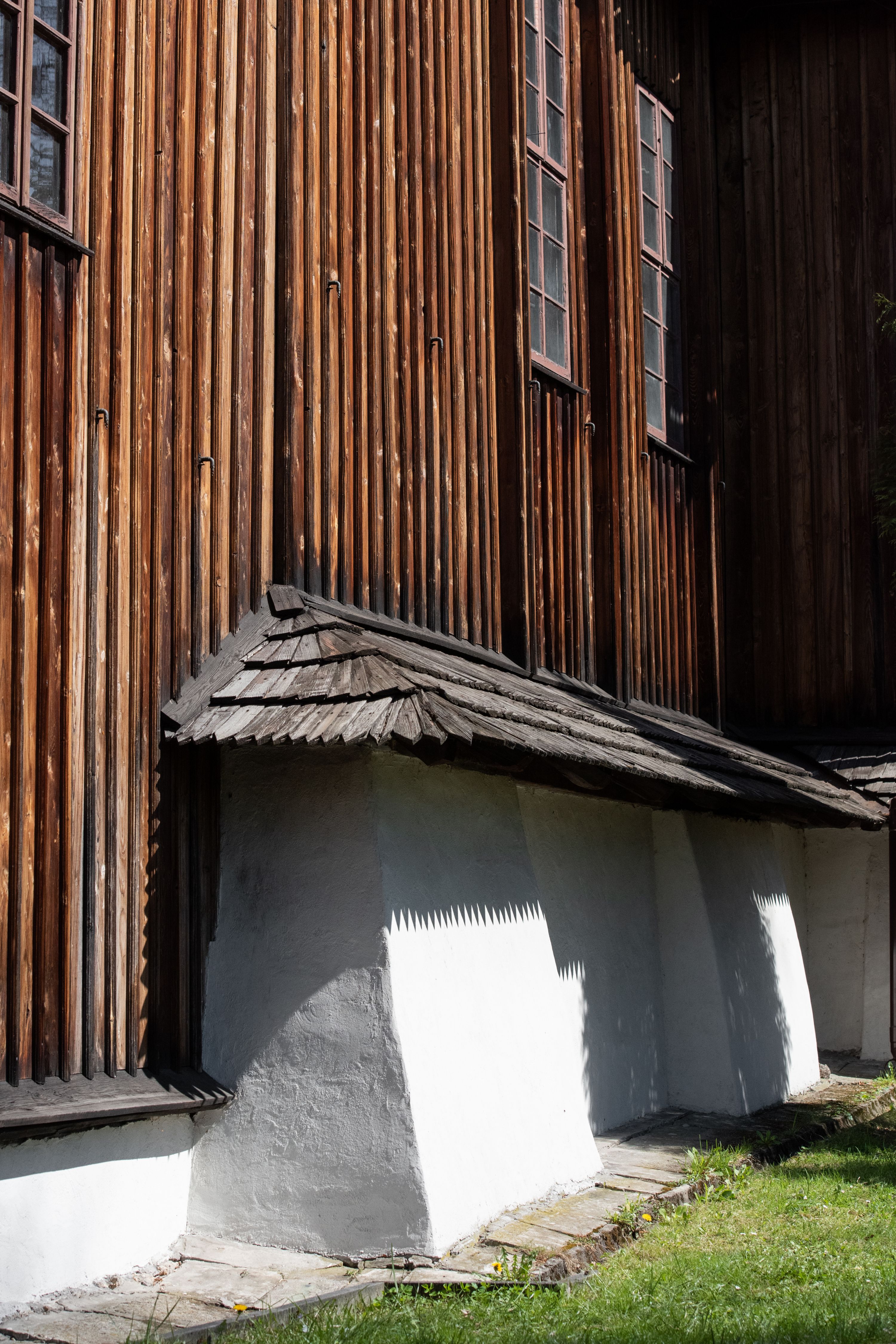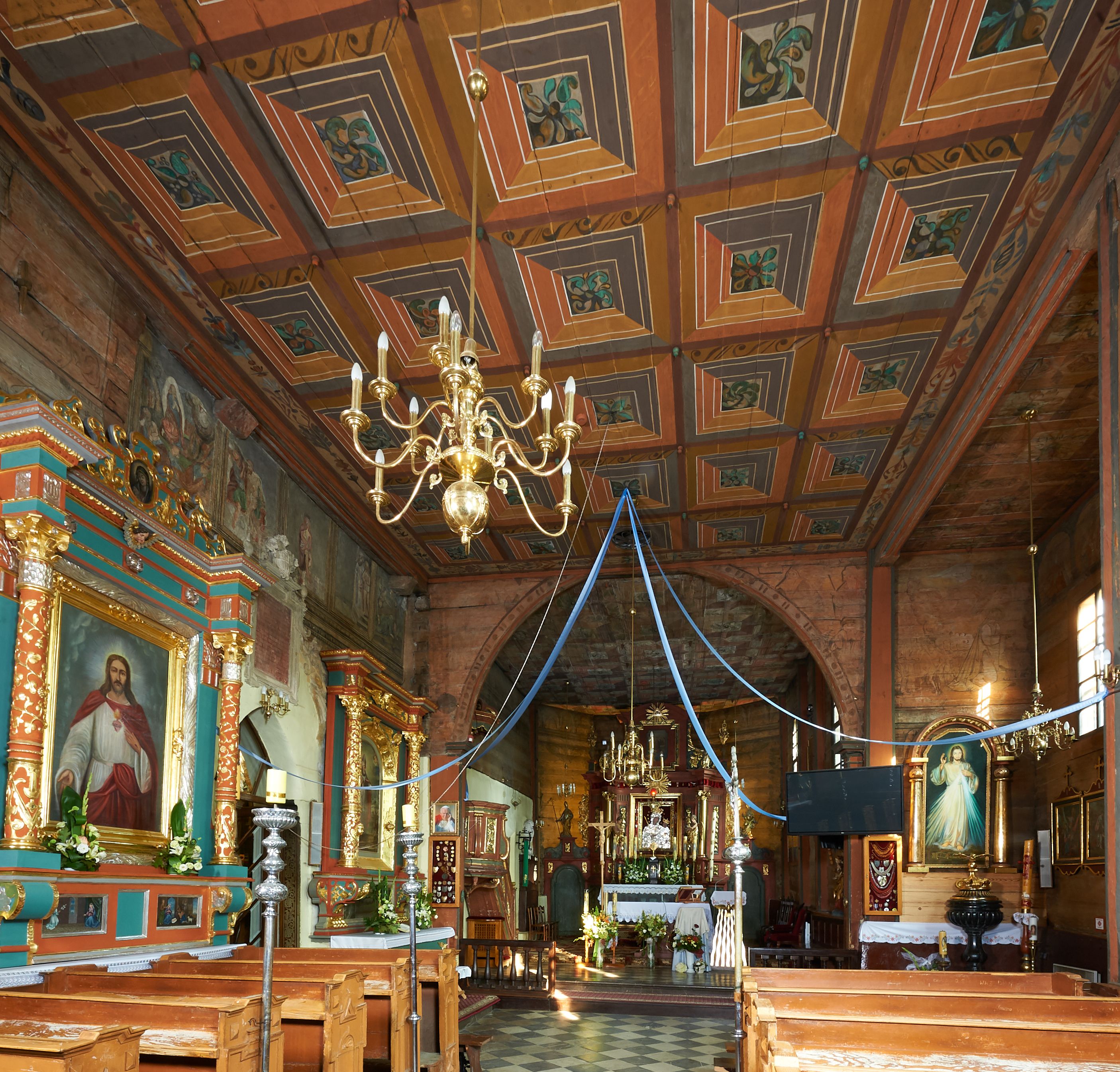 Rzadki przykład drewnianej świątyni na rzucie krzyża łacińskiego i murowaną kaplicą grobową.