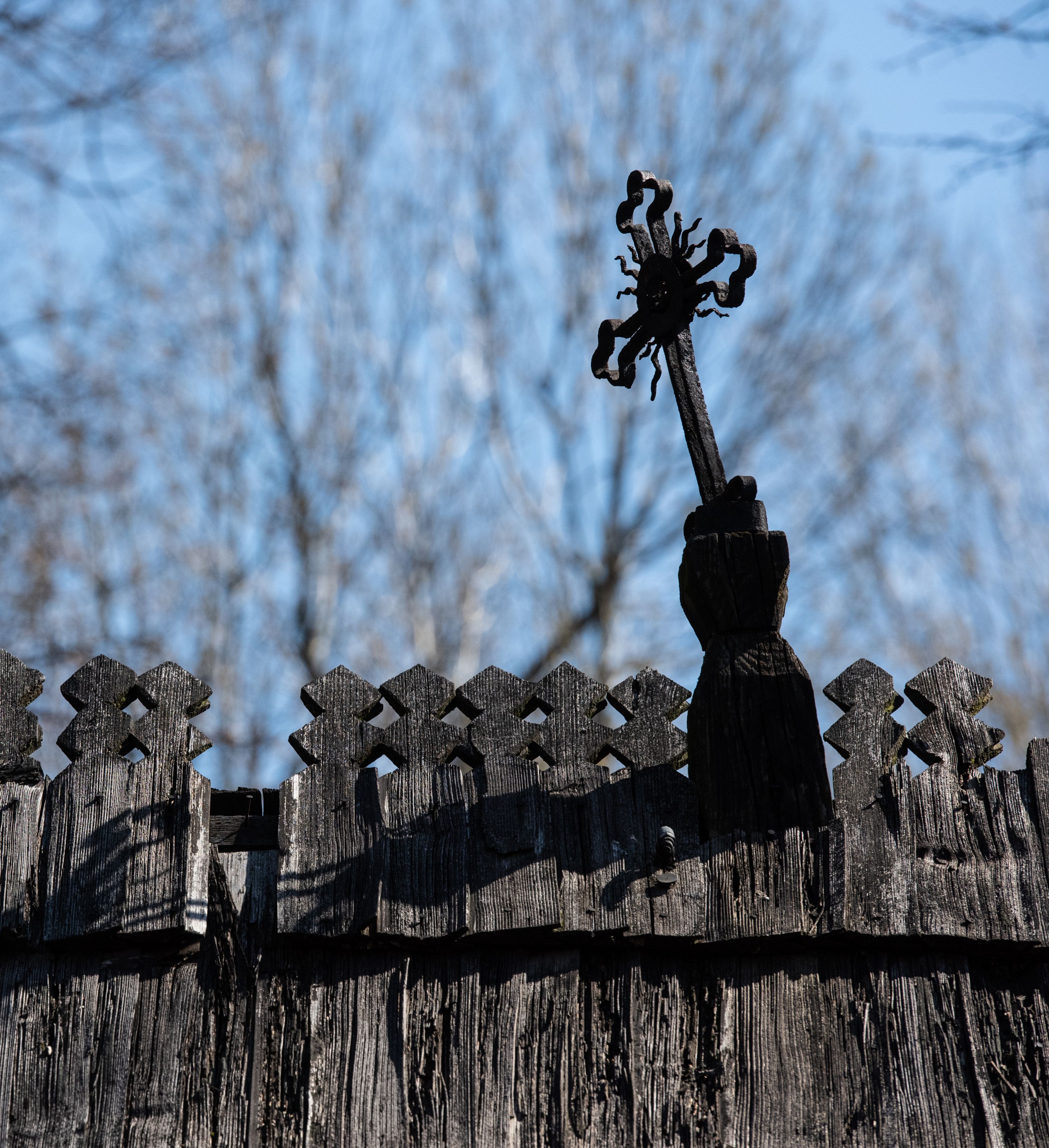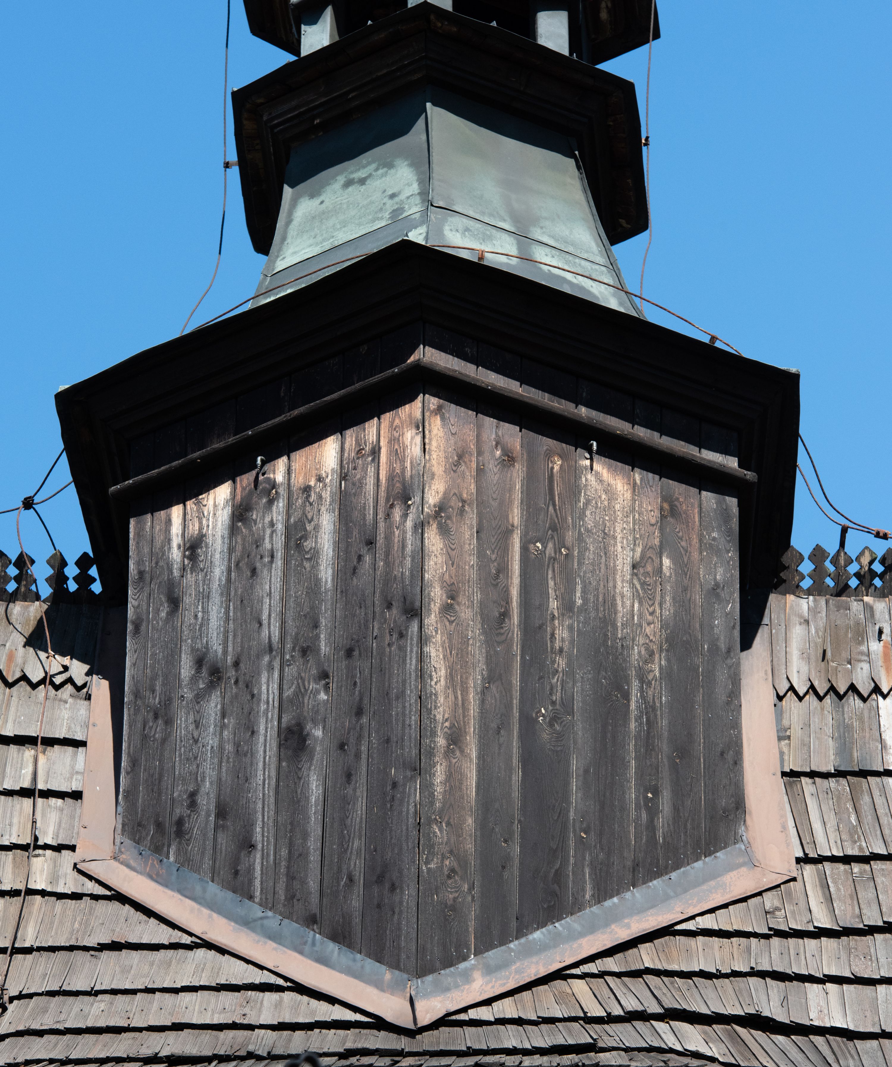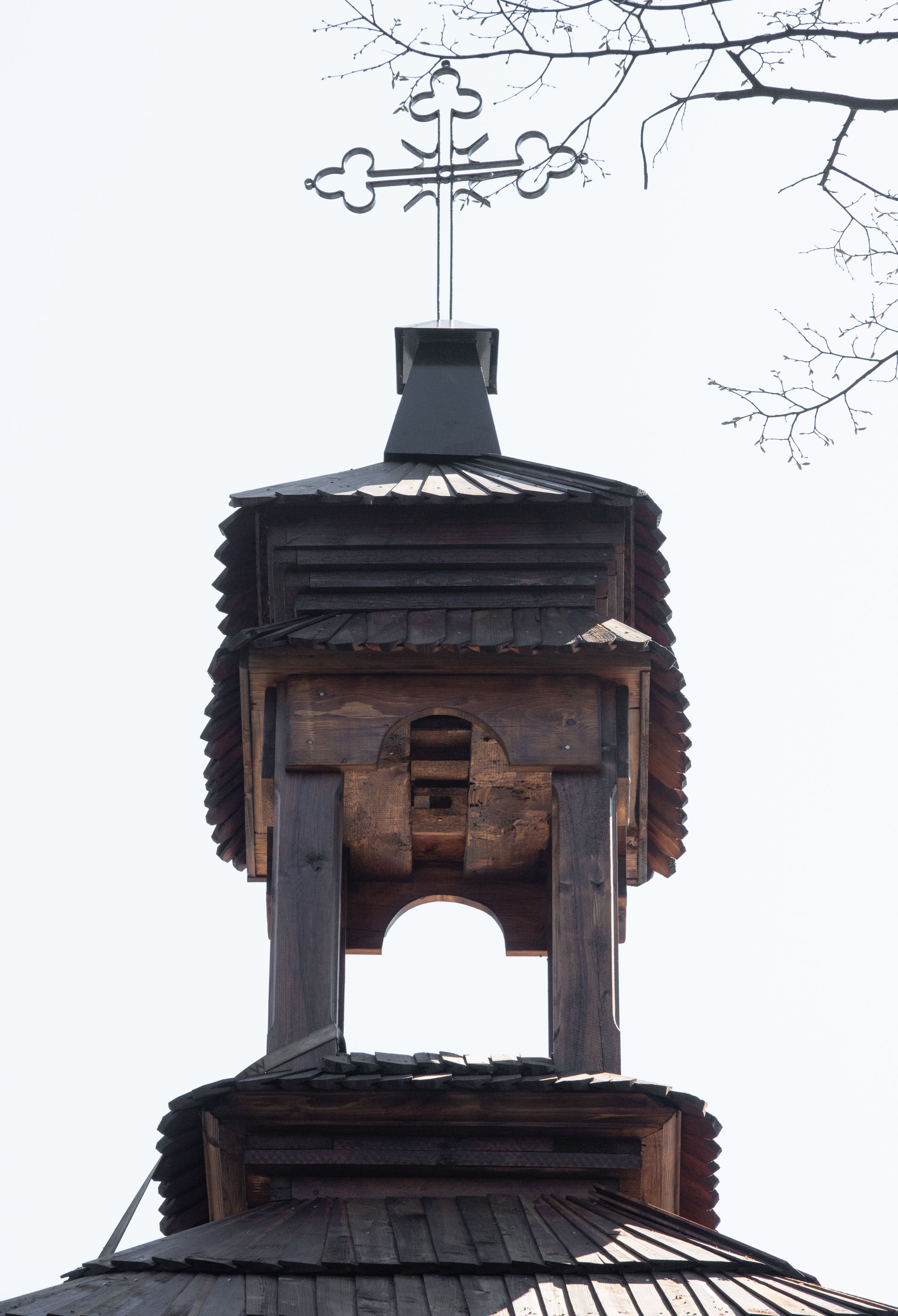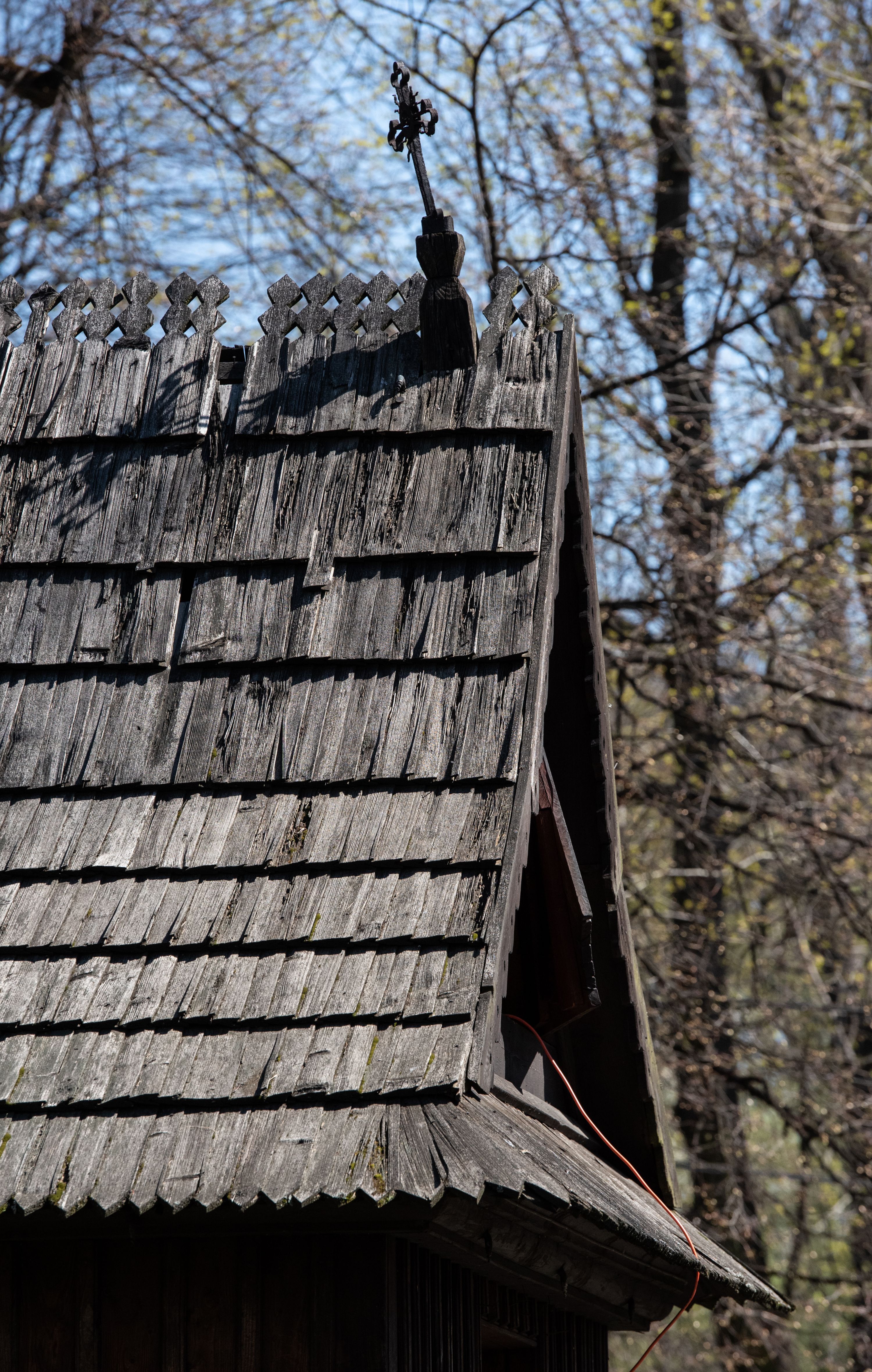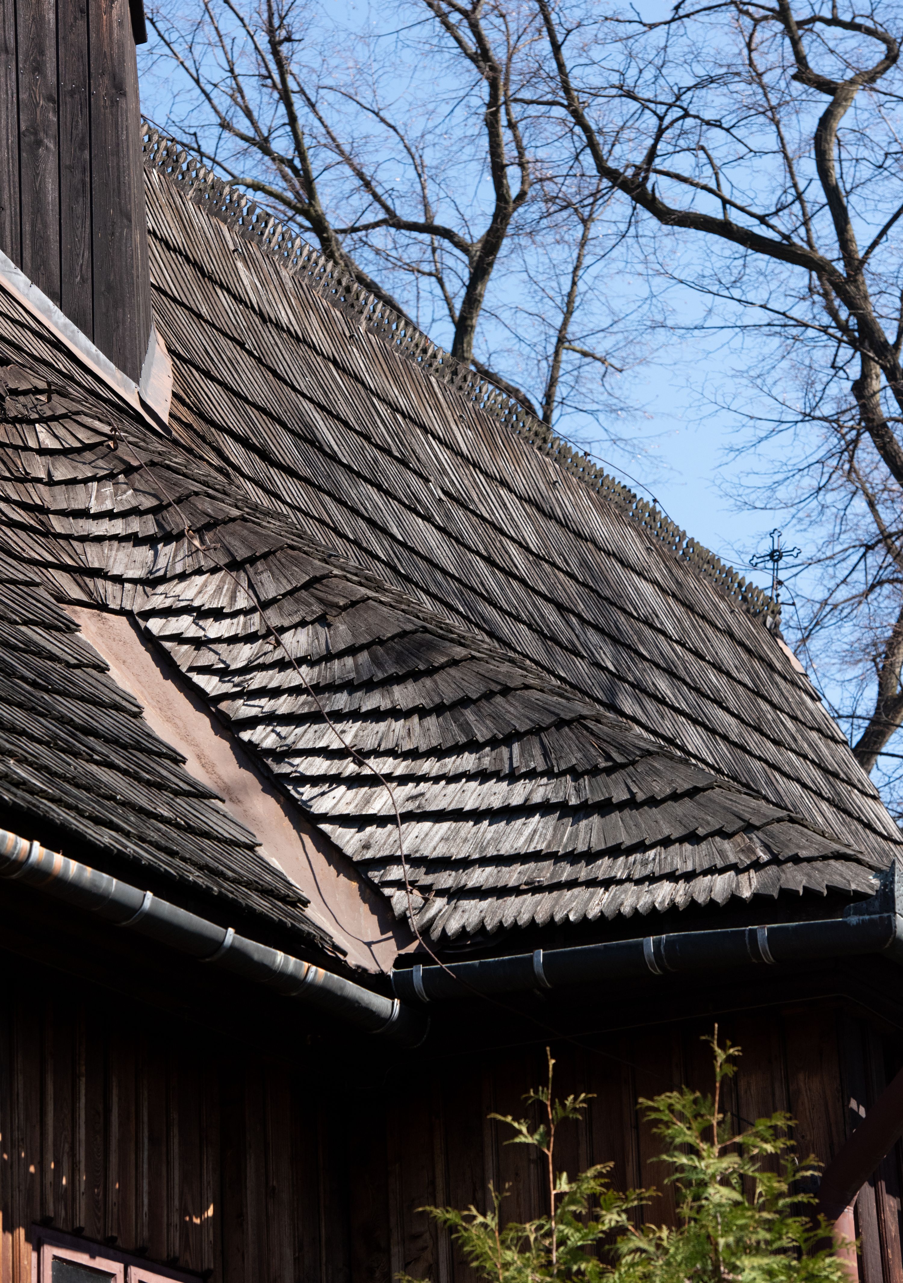 Rzadki przykład drewnianej świątyni na rzucie krzyża łacińskiego i murowaną kaplicą grobową.