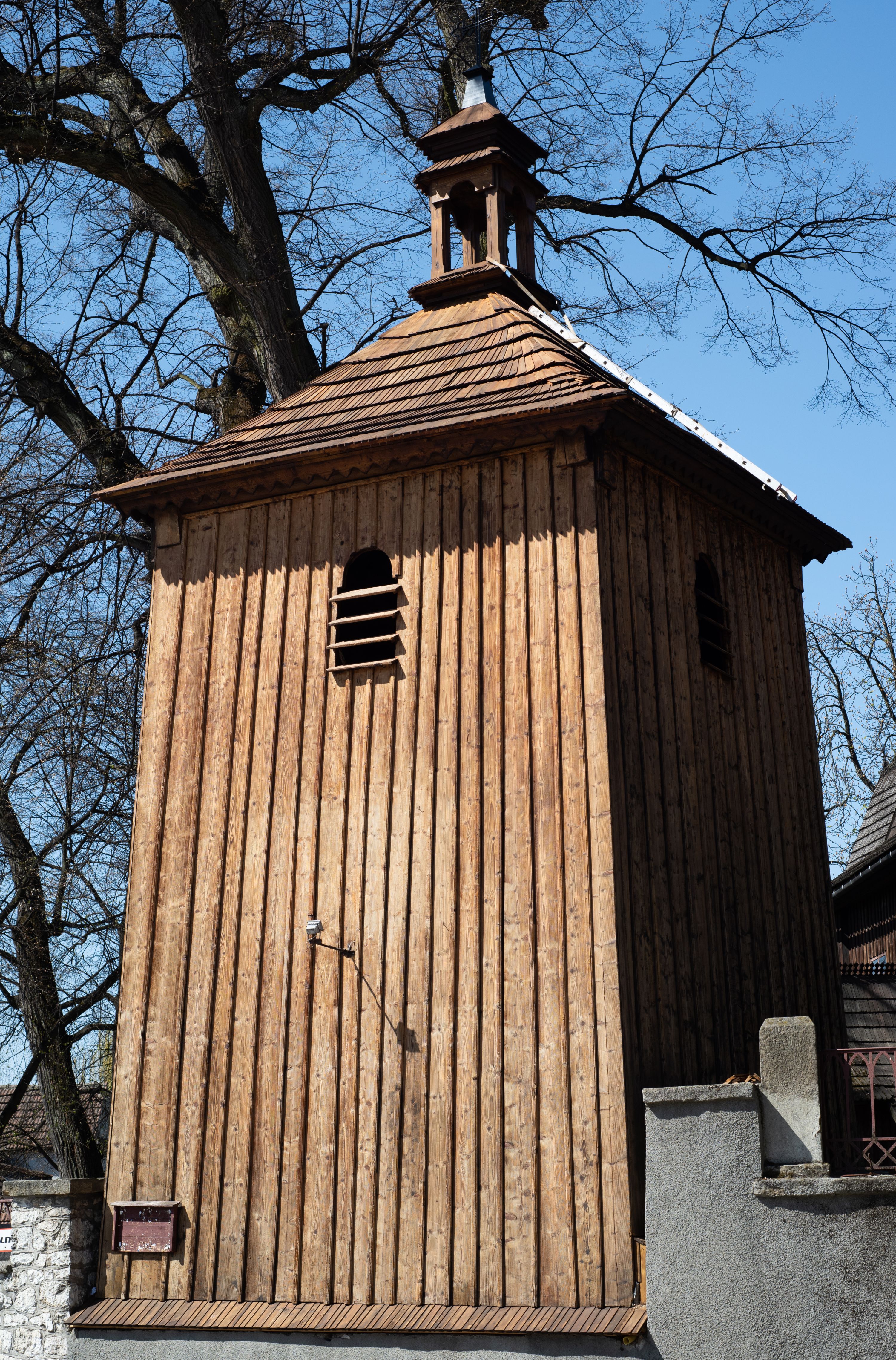 Kościół drewniany, konstrukcji zrębowej, orientowany, na rzucie krzyża łacińskiego, jednonawowy, z prostokątnym zamkniętym wielobocznie prezbiterium, przy którym murowana prostokątna zakrystia i skarbczyk; w ramionach krzyża od północy murowana kaplica grobowa (1622 r.), od południa drewniana kaplica oraz przy części zachodniej drewniana kruchta. Wewnątrz stropy, w kaplicy północnej sklepienie krzyżowe z lunetami, w zakrystii i skarbczyku kolebkowe z lunetami. Dach jednokalenicowy, dwuspadowy, z wieżyczką na sygnaturkę. Od zachodu i z prezbiterium do zakrystii odrzwia z dekoracyjnymi nadprożami. Wzniesiony w 1553 roku z inicjatywy proboszcza Jakuba Biskupca, przez małopolski warsztat ciesielski. W 1622 roku wzniesiono murowaną kaplicę grobową od północy i zakrystię ze skarbczykiem. W latach 1878-1879 nawa przedłużona ku zachodowi.