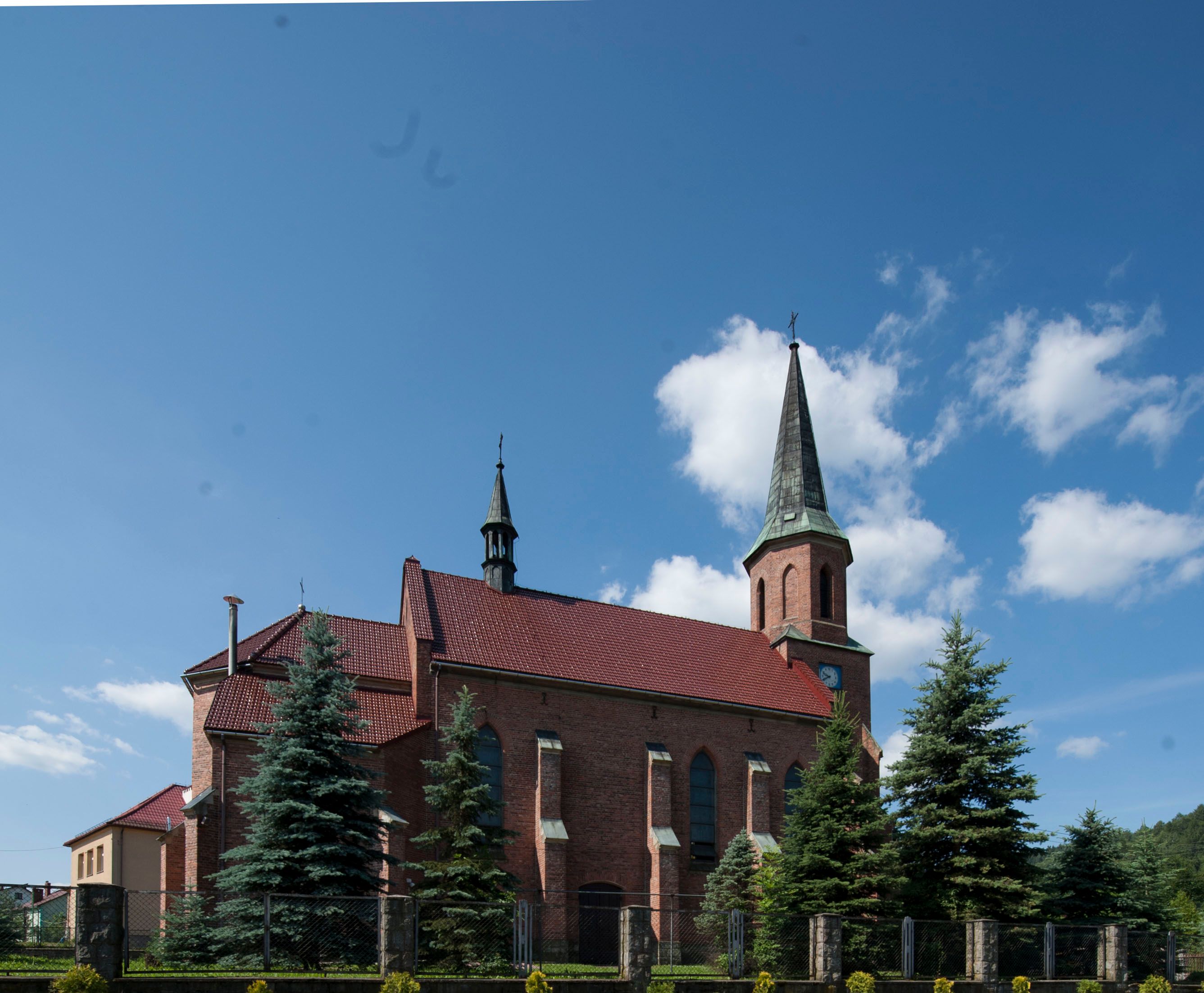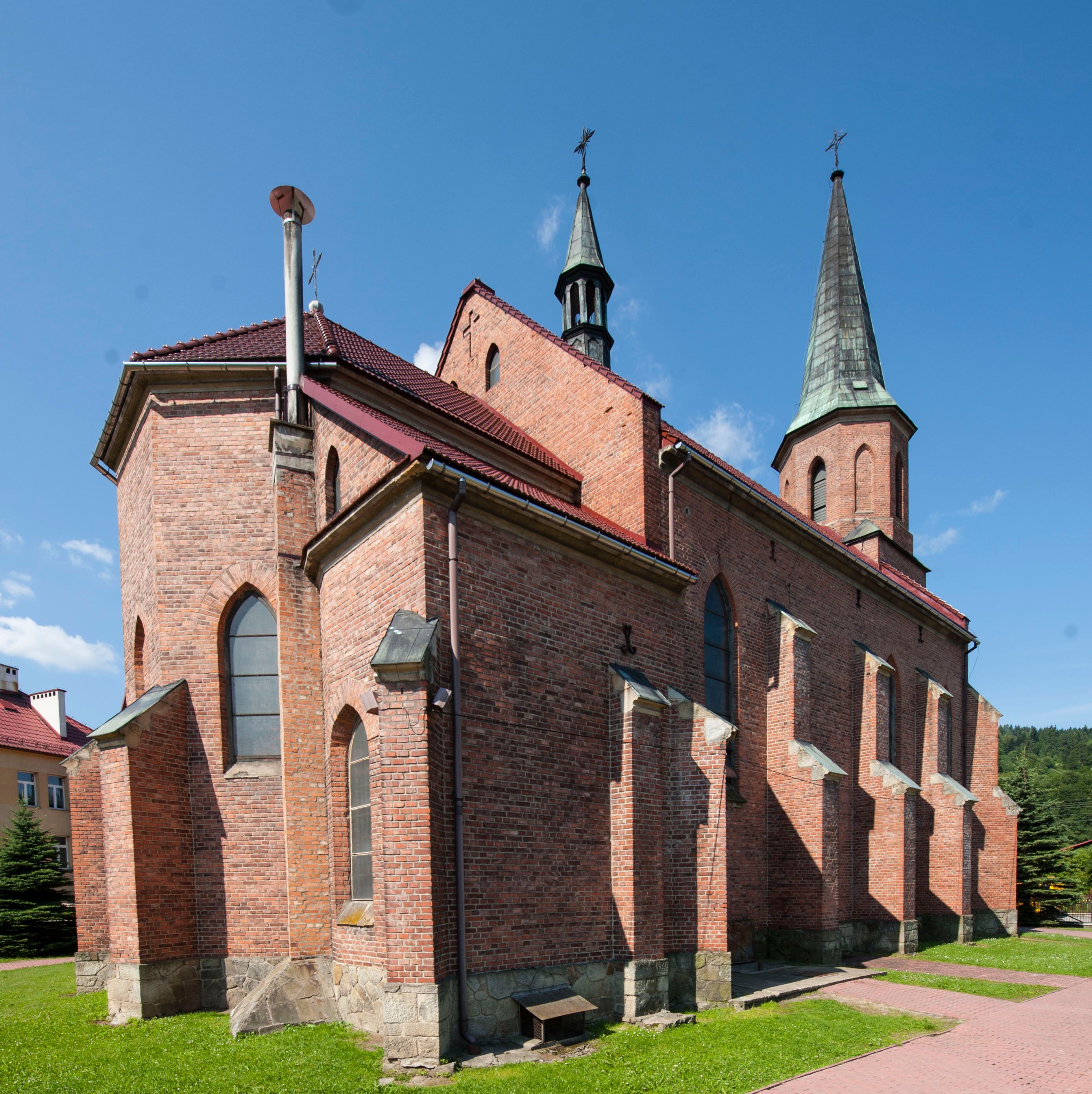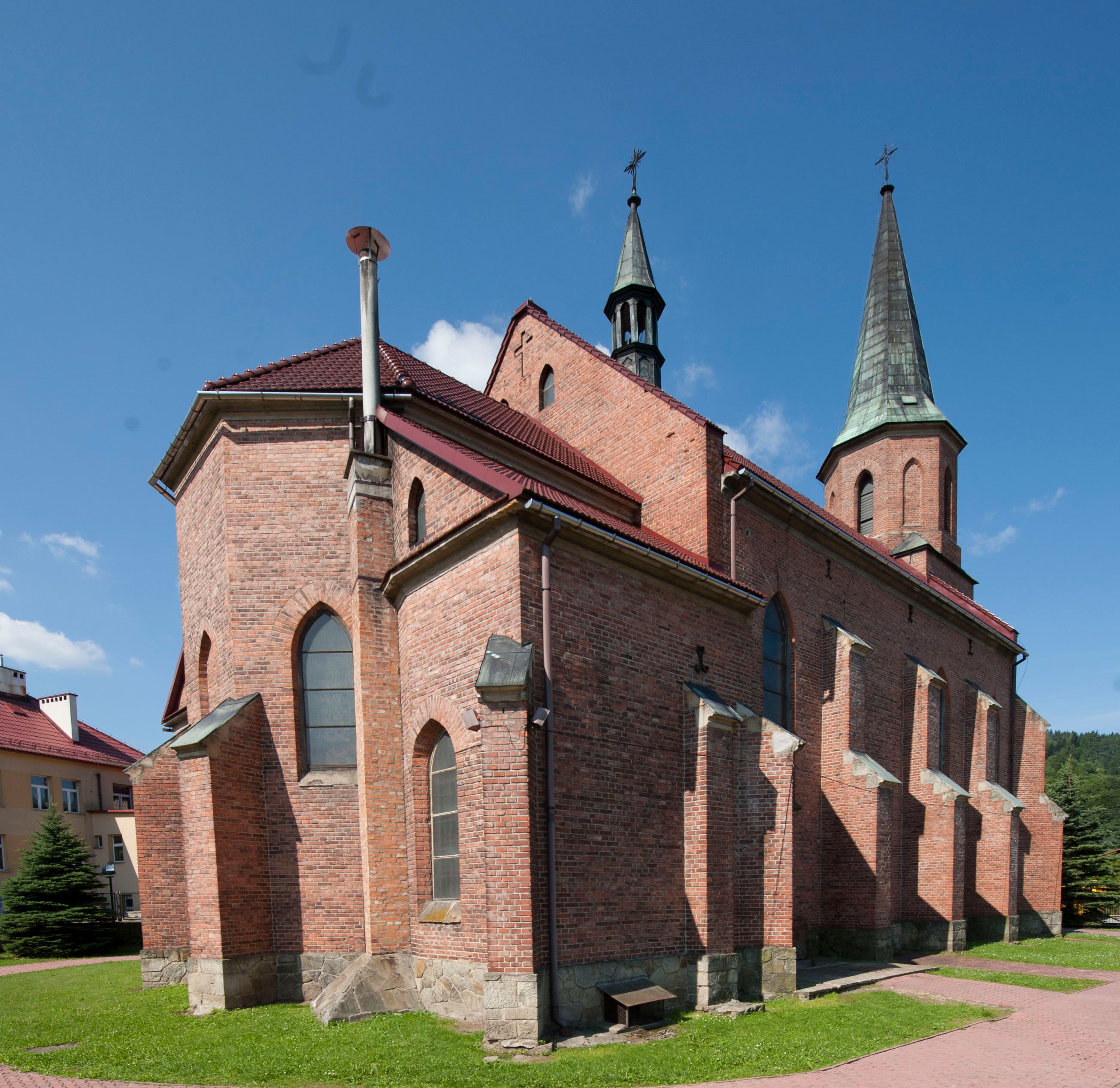 Kościół ceglany z kamiennym przyziemiem, na planie prostokąta z węższym i niższym prezbiterium flankowanym dwoma aneksami wystającymi poza lico nawy i wieżą od zachodu. Kościół orientowany, jednonawowy, czteroprzęsłowy z węższym, jednoprzęsłowym prezbiterium zamkniętym trójbocznie, z kruchtą w przyziemiu wieży. Nawa artykułowana półfilarami o ściętych narożach, przechodzących w gurty krzyżowo-żebrowego sklepienia. W nawie i prezbiterium okna prostokątne zamknięte łukiem ostrym; główne wejście od wschodu. Identyczne okna w aneksach przy prezbiterium. Aneksy dwuprzęsłowe ujęte wielobocznymi filarami, zamknięte trójbocznie z parasolowym sklepieniem. Chór muzyczny w czwartym przęśle nawy, wsparty na wielobocznych filarach z drewnianym parapetem ozdobionym ostrołukowymi blendami. Kruchta węższa od nawy, zasklepiona krzyżowo. Fasada węższa od nawy, ujęta przyporami w narożach, między którymi ostrołukowe wejście. W drugiej kondygnacji oddzielonej parapetem wysokie okno zamknięte łukiem ostrym, nad którym tarcza zegara. Nad fasadą ośmioboczna wieża. W wieży na przemian okna i płyciny, zamknięte łukiem ostrym. Trójboczne prezbiterium w narożach ujęte przyporami sięgającymi połowy wysokości, między którymi ostrołukowe okna. Aneksy na planie prostokąta z przyporami na narożach oraz jedną w części bocznej. Czteroosiowa ściana nawy i naroża oddzielone przyporami, między którymi ostrołukowo zakończone okna. Hełm wieży w formie ośmiobocznego stożka, załamującego się w partii dolnej. Nawa z dwuspadowym dachem z wieżyczką na sygnaturkę nad pierwszym przęsłem.