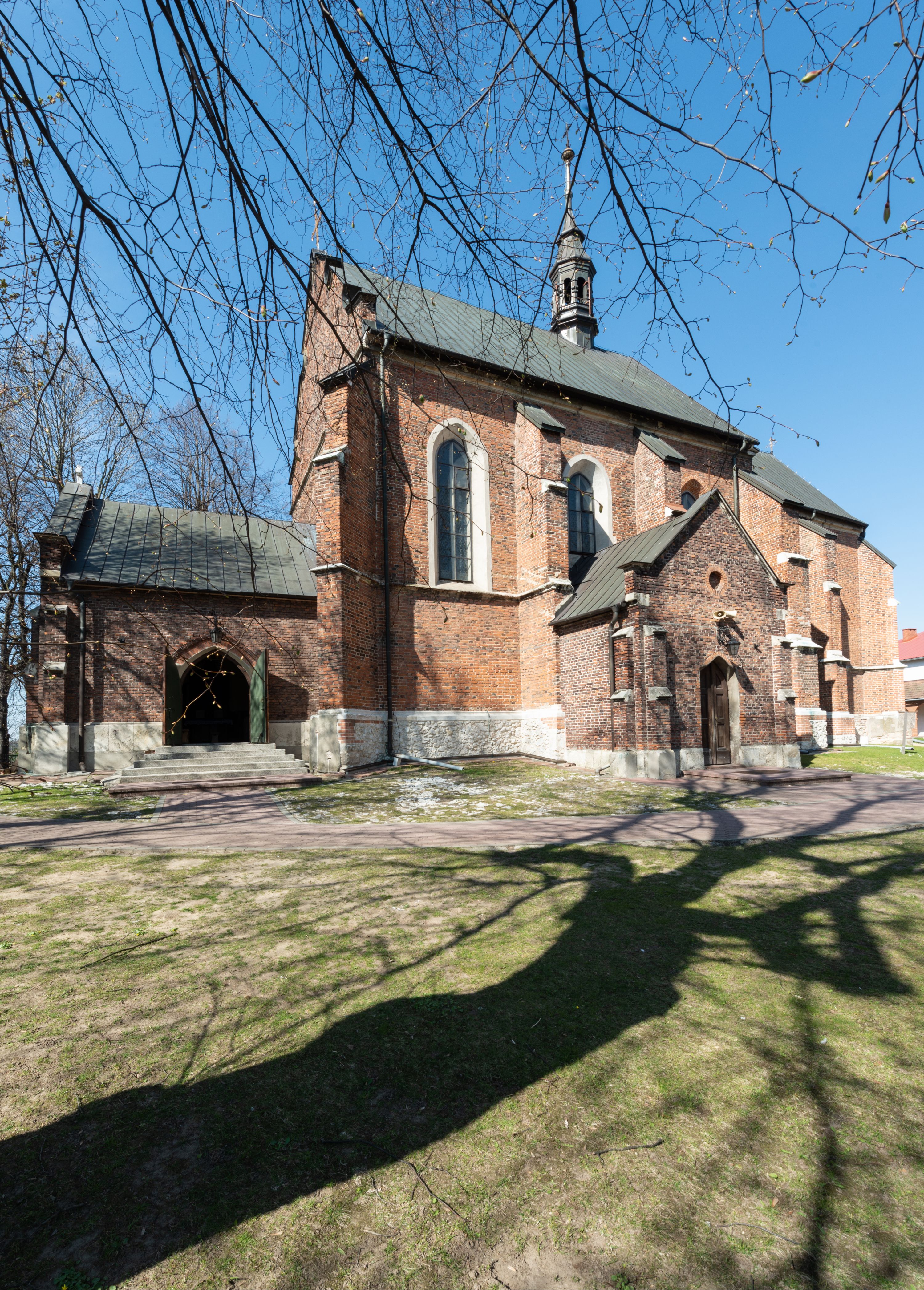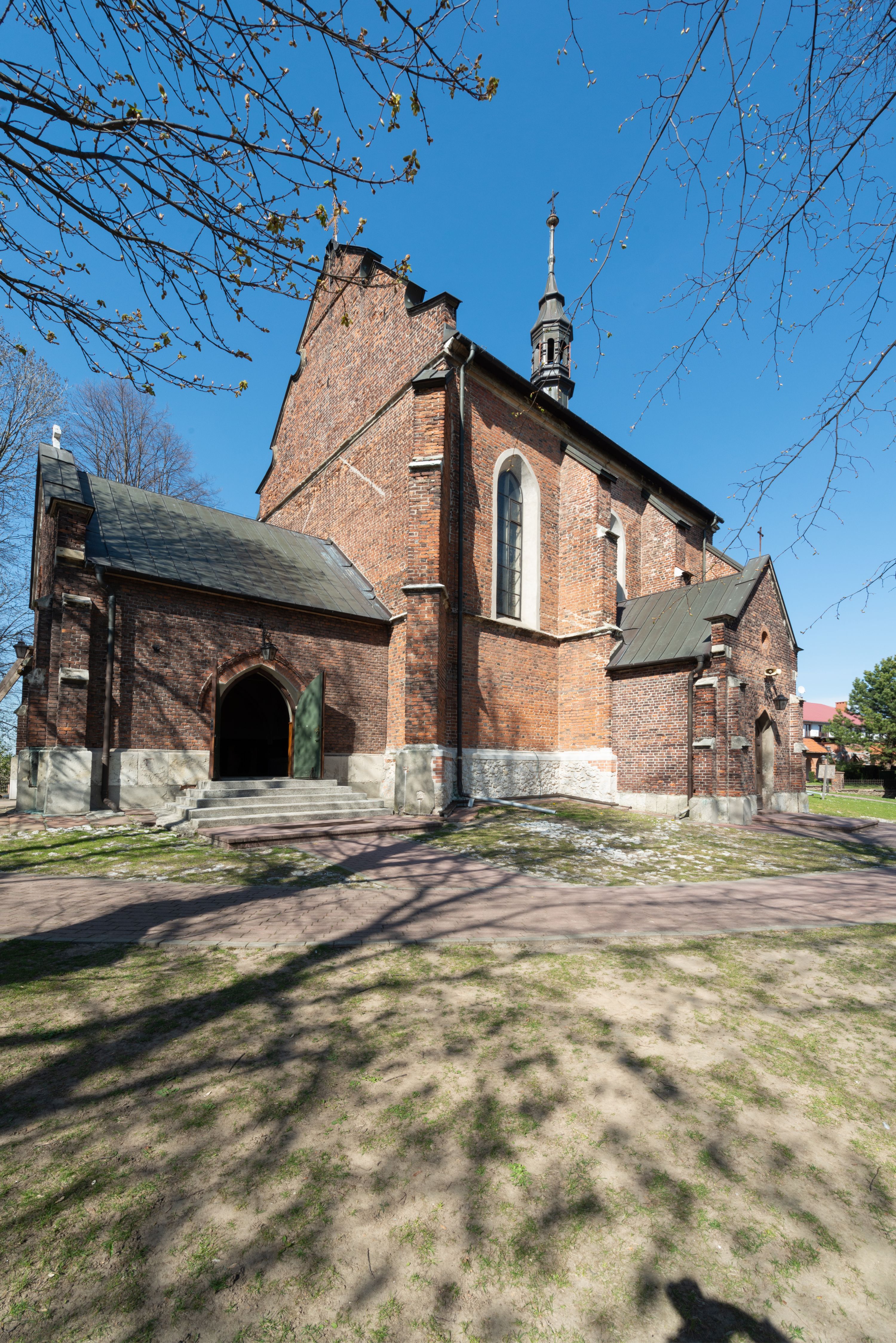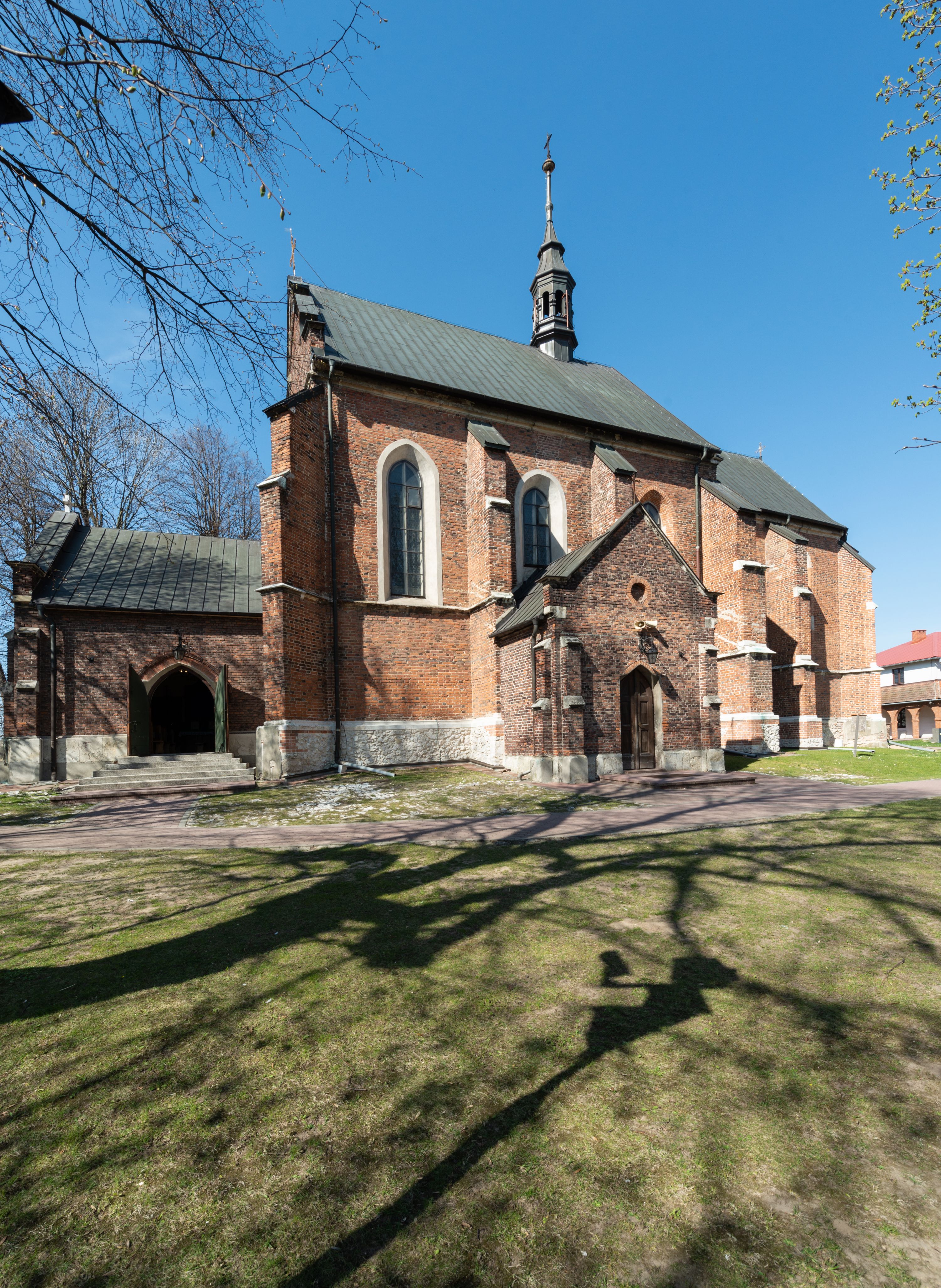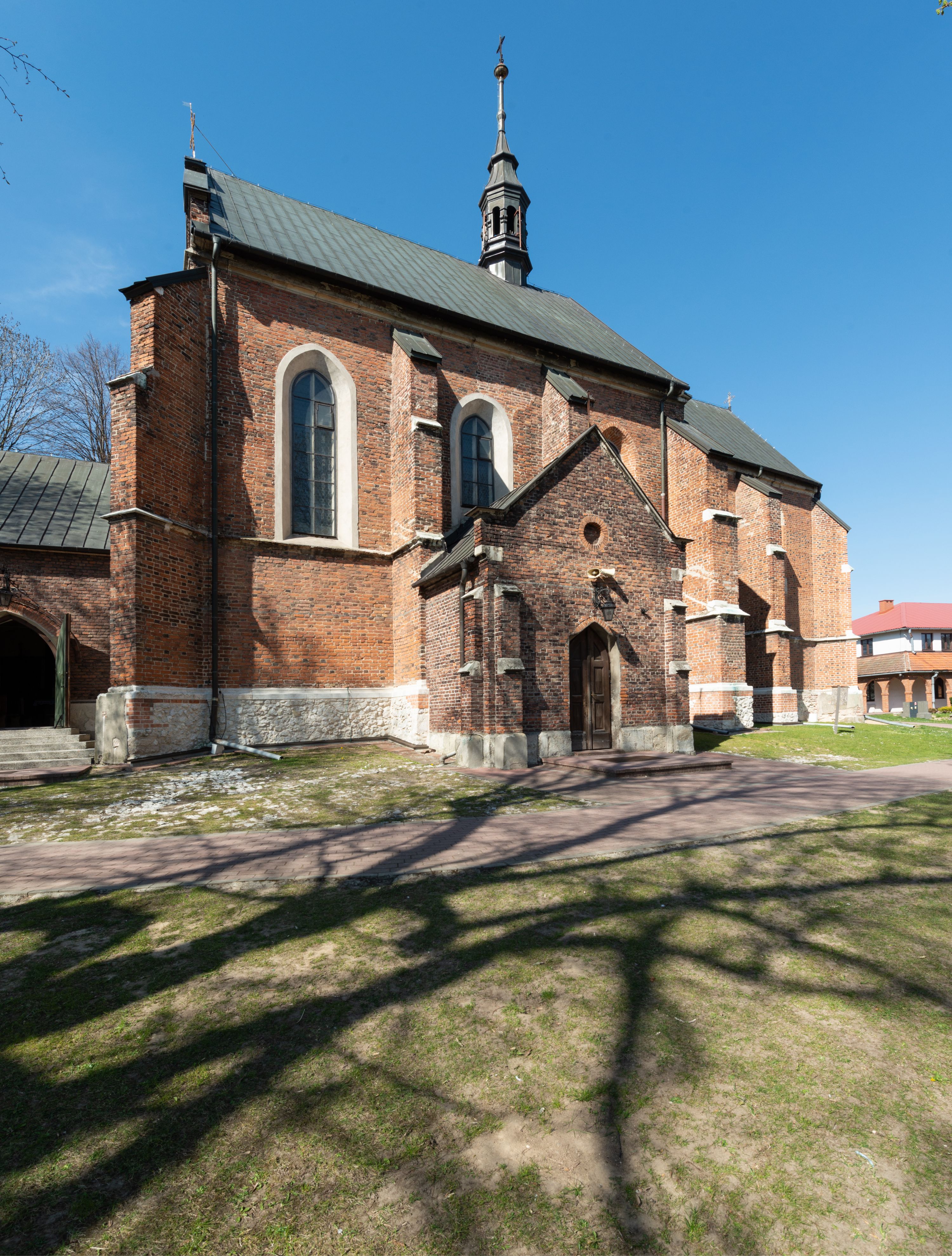 Pierwotny drewniany kościół powstał z fundacji biskupa Iwona Odrowąża. Obecny murowany wybudowano w pierwszej ćwierci XV wieku, a przed 1433 rokiem. Około 1470 roku był wzmiankowany w źródłach jako kościół wymurowany z cegły przez proboszcza Mikołaja, kanonika krakowskiego, syna Hinczy lub Hinczki. Ów proboszcz został wspomniany w dokumencie biskupa krakowskiego Wojciecha Jastrzębca w 1422 roku. Sklepienie sieciowe jest datowane na przełom XV i XVI wieku. W XV lub XVI wieku dobudowano trójboczny aneks do prezbiterium. Na murze zakrystii znajduje się data 1579. Do prezbiterium dobudowano w 1742 roku kaplicę Ogrojcową ze skarbcem na piętrze. Kruchty od południa i zachodu są neogotyckie. W latach 1906-1911 dawną zakrystię przerobiono na kaplicę św. Franciszka i dobudowano do niej kruchtą.
