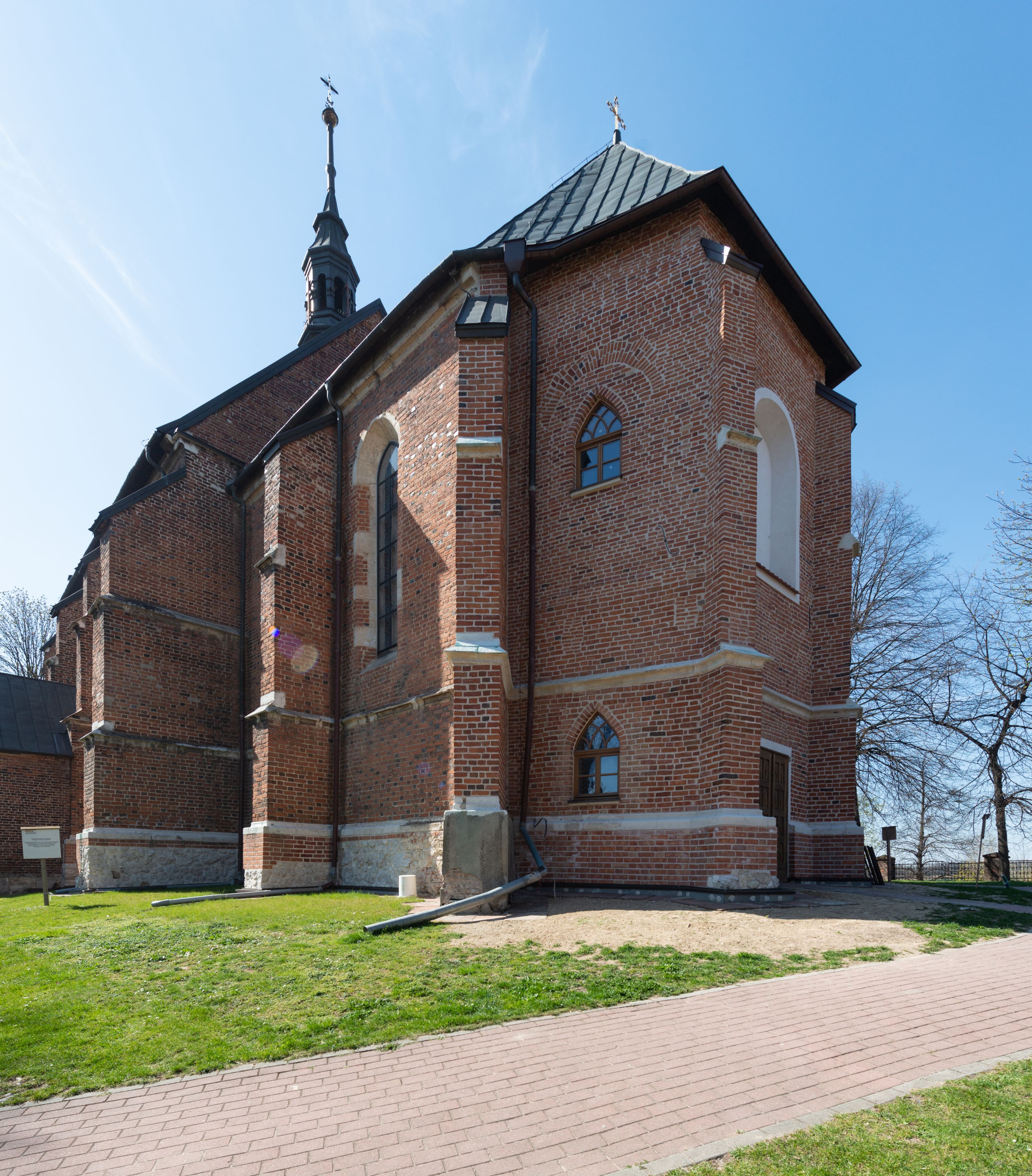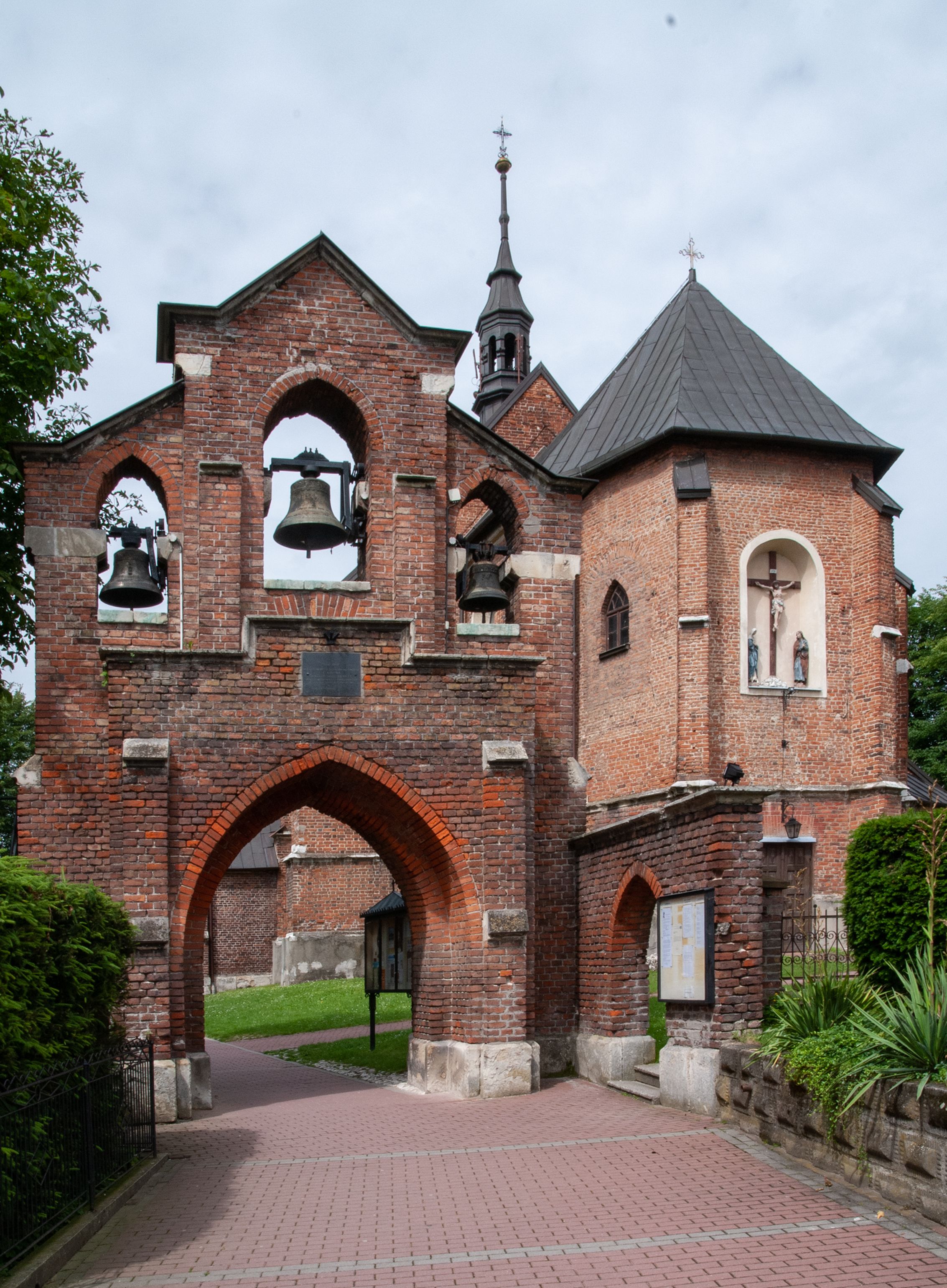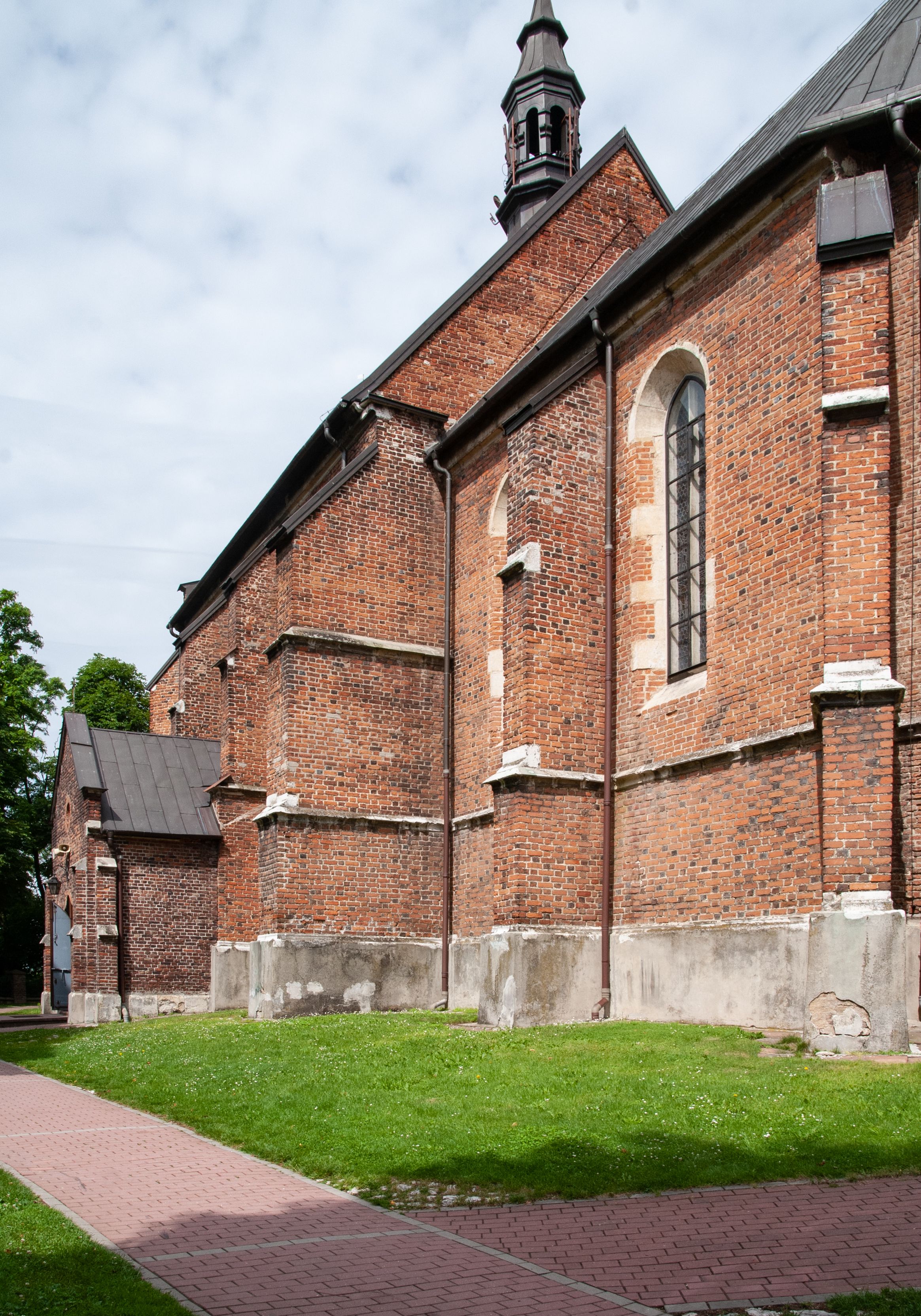 Pierwotny drewniany kościół powstał z fundacji biskupa Iwona Odrowąża. Obecny murowany wybudowano w pierwszej ćwierci XV wieku, a przed 1433 rokiem. Około 1470 roku był wzmiankowany w źródłach jako kościół wymurowany z cegły przez proboszcza Mikołaja, kanonika krakowskiego, syna Hinczy lub Hinczki. Ów proboszcz został wspomniany w dokumencie biskupa krakowskiego Wojciecha Jastrzębca w 1422 roku. Sklepienie sieciowe jest datowane na przełom XV i XVI wieku. W XV lub XVI wieku dobudowano trójboczny aneks do prezbiterium. Na murze zakrystii znajduje się data 1579. Do prezbiterium dobudowano w 1742 roku kaplicę Ogrojcową ze skarbcem na piętrze. Kruchty od południa i zachodu są neogotyckie. W latach 1906-1911 dawną zakrystię przerobiono na kaplicę św. Franciszka i dobudowano do niej kruchtą.