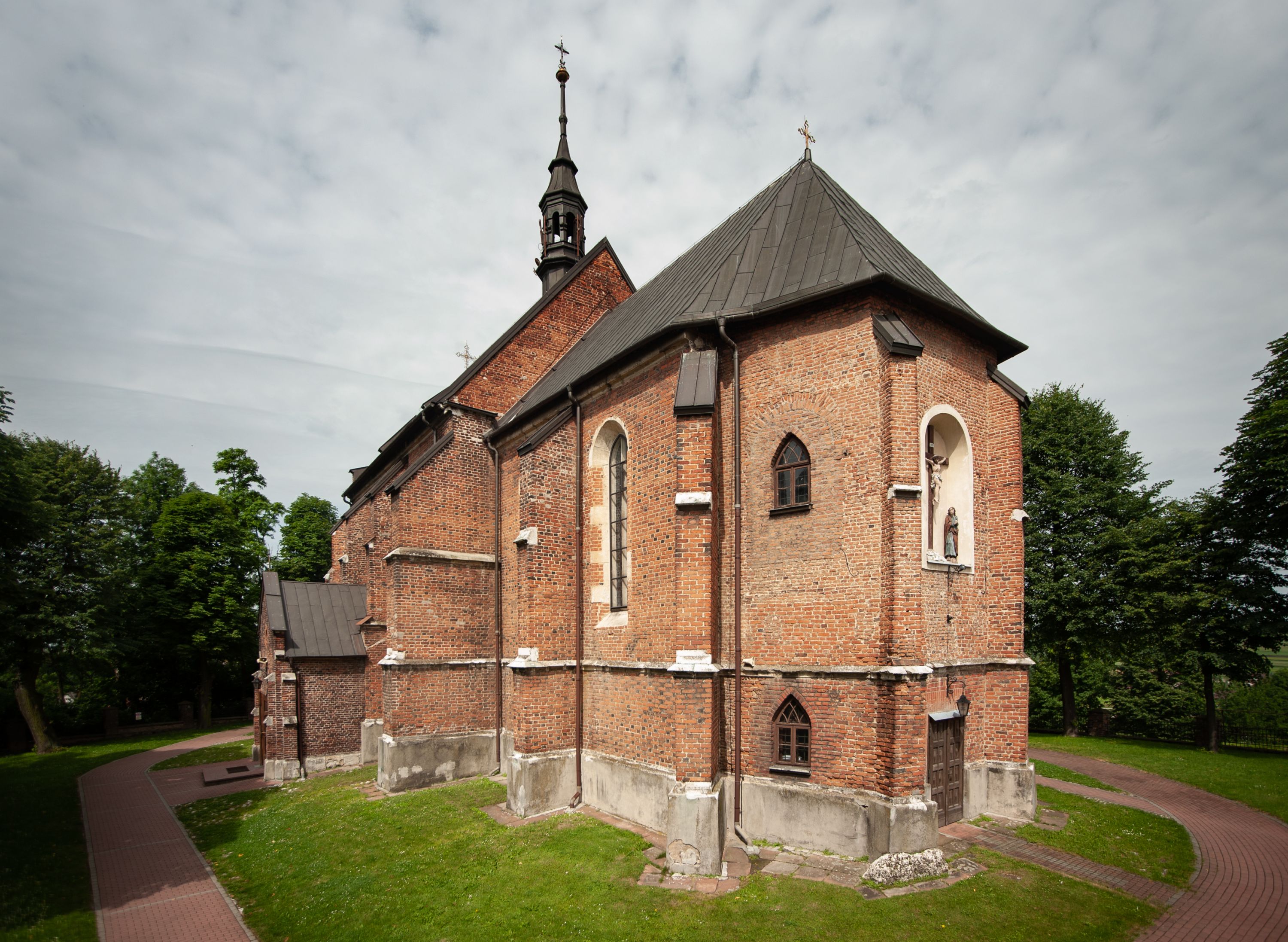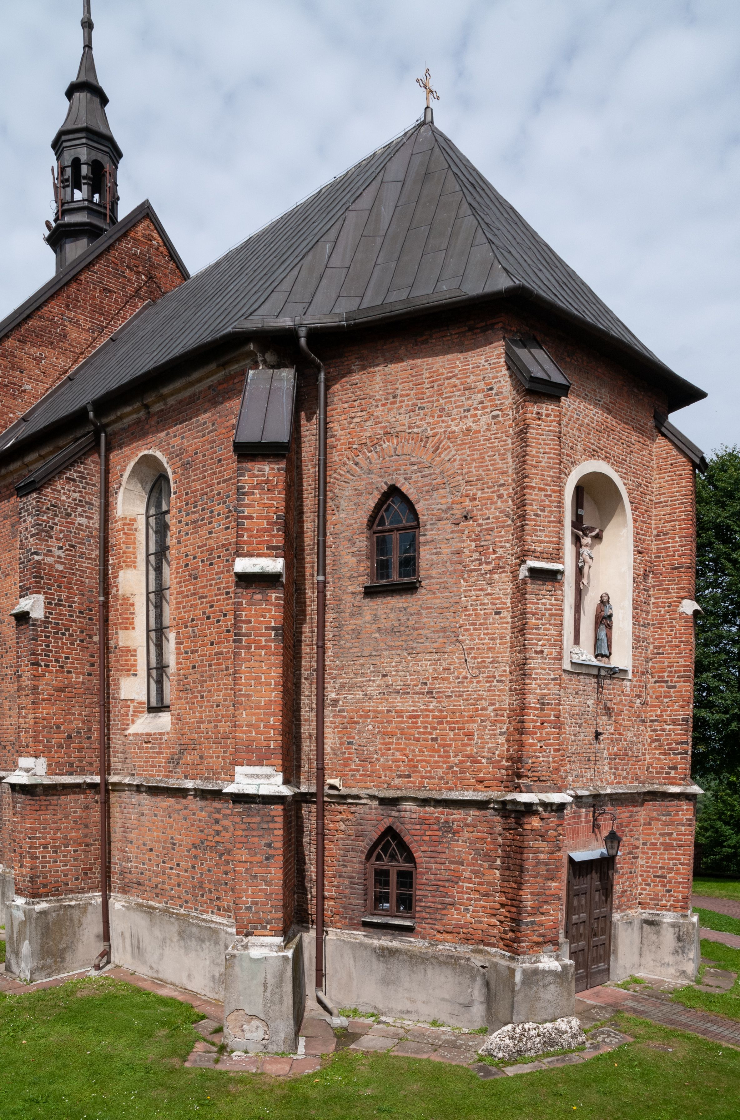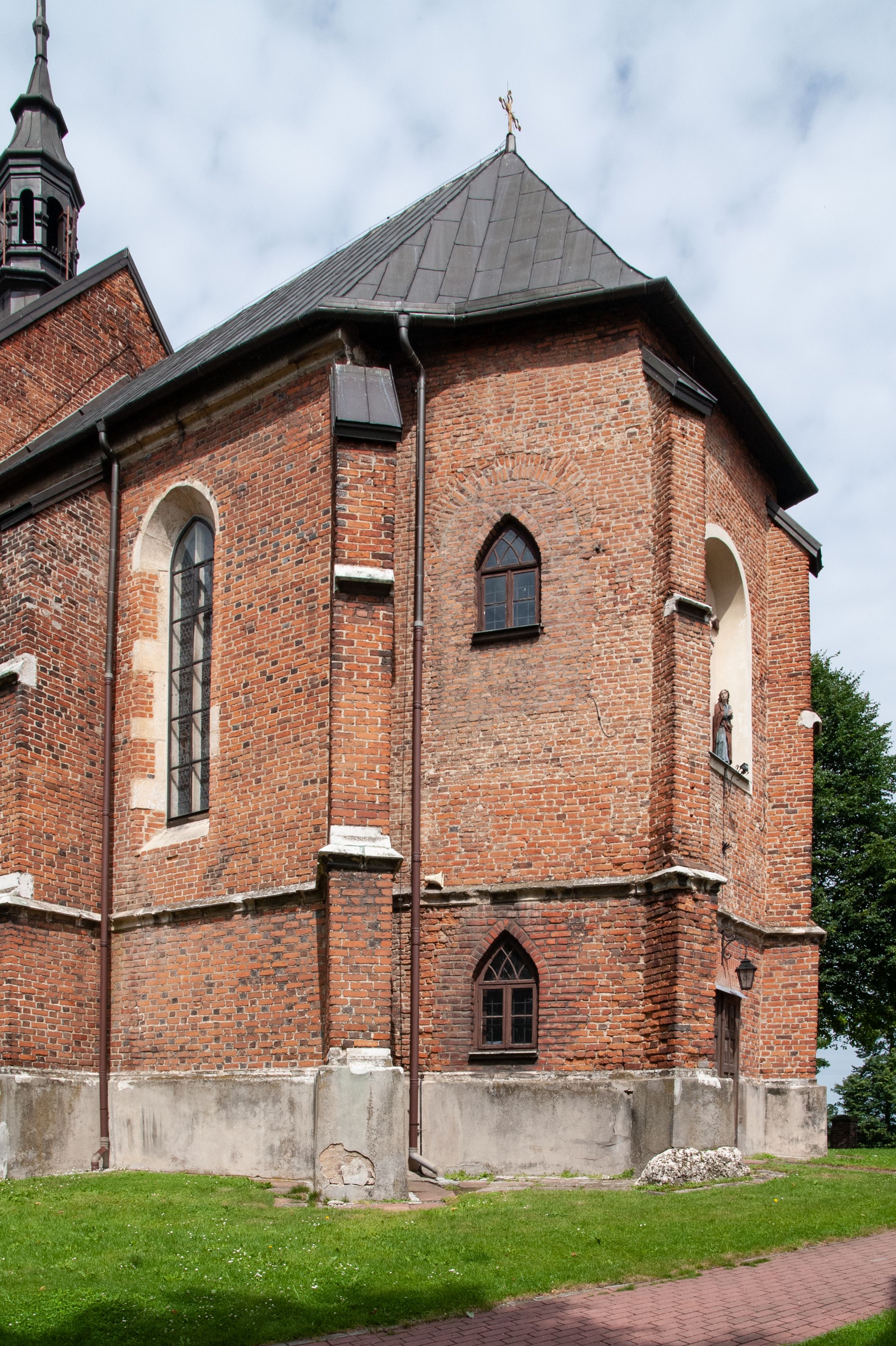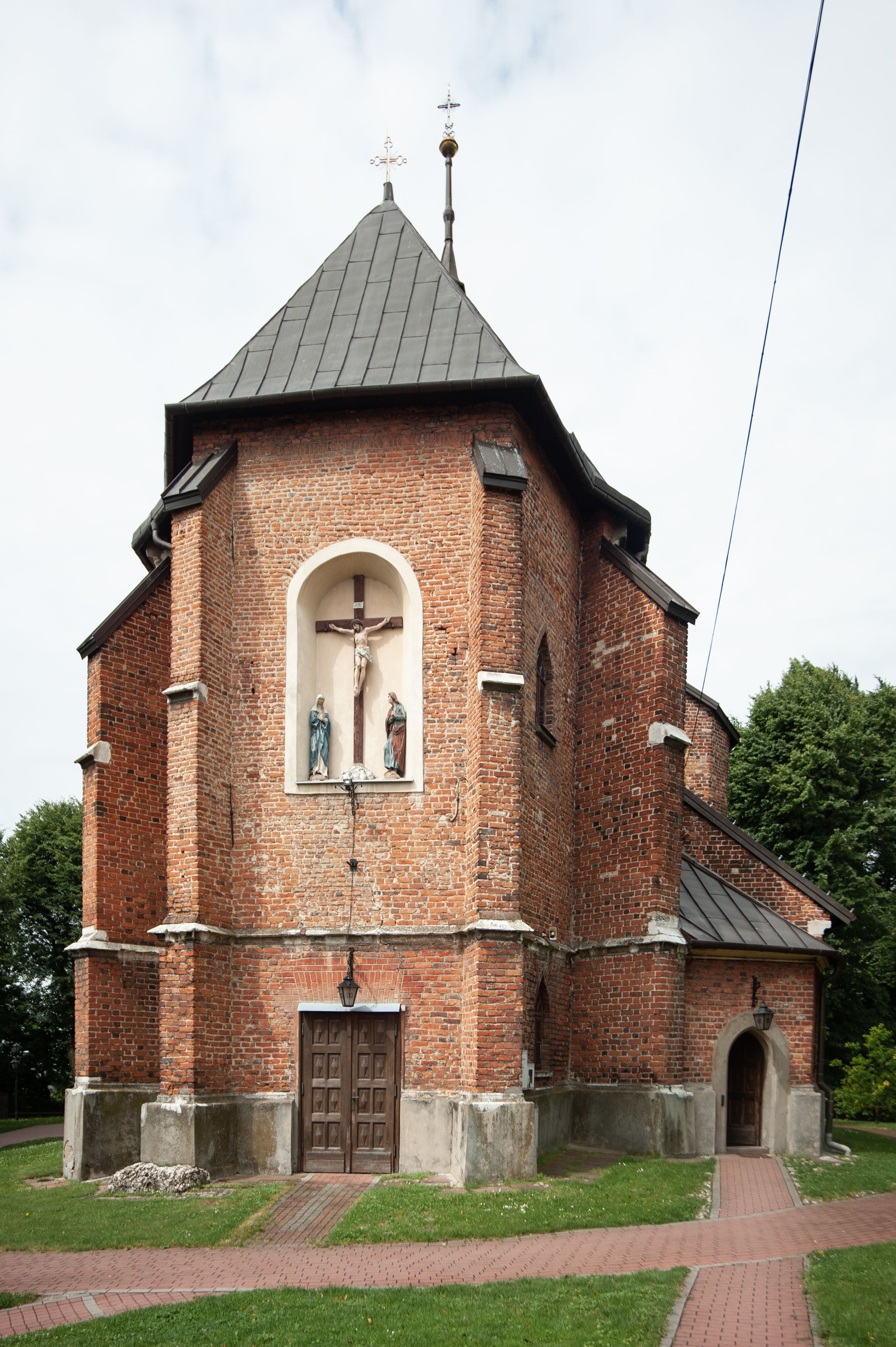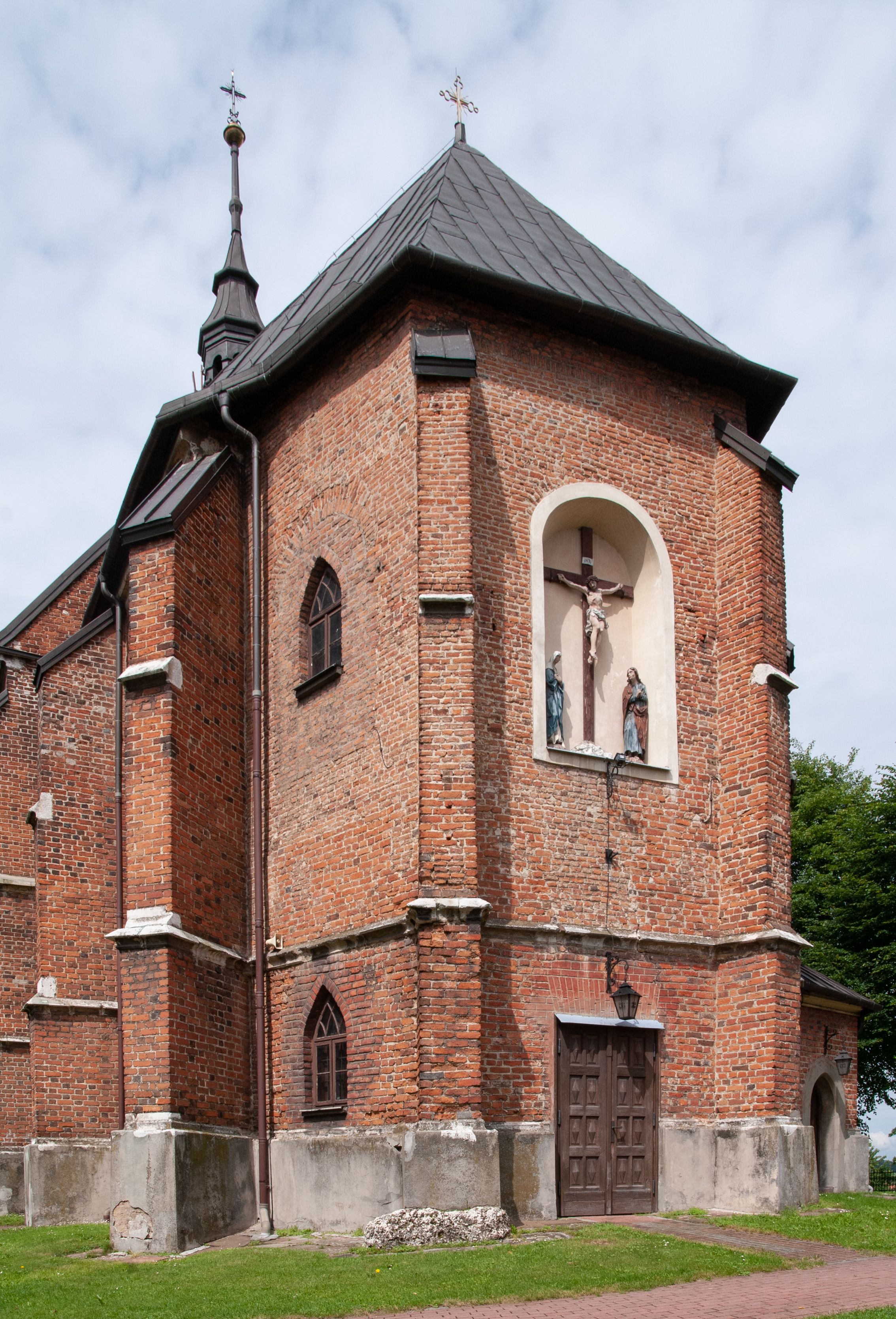 Kościół jest zlokalizowany na wzgórzu, w centrum wsi. Murowany z cegły, w wątku polskim, z zendrówką. Kościół jest orientowany, założony na planie prostokąta, jednonawowy, trójprzęsłowy, z dobudowanymi kruchtami od zachodu i południa. Prezbiterium oddzielone od nawy łukiem tęczowym, dwuprzęsłowe na planie prostokąta, zamknięte prostą ścianą, z dwukondygnacyjną przybudówką zakończoną trójbocznie. Nawa została przykryta sklepieniem sieciowym. Ściana południowa nawy przepruta trzema prostokątnymi oknami, zamkniętymi łukiem ostrym. Okna w nawie i prezbiterium dwudzielne, z sześcioma mniejszymi kwaterami. Przybudówka przy prezbiterium na parterze mieści zakrystię, a na piętrze składzik. Kruchta południowa sklepiona kolebką. Z kruchty do nawy prowadzi ostrołukowy, kamienny portal o dwóch archiwoltach. Kruchta zachodnia, obecnie kaplica św. Franciszka, sklepiona spłaszczoną, ukrytą kopułą na pendentywach. Ściana zachodnia kruchty przepruta dwoma ostrołukowymi oknami i ponad nimi okrągłym oknem. Od południa ostrołukowe wejście. Kościół o zróżnicowanej wysokości nawy i prezbiterium. Ściany opięte szkarpami. Na jednej trzeciej wysokości ścian oraz w zwieńczeniu nawy i prezbiterium profilowany gzyms. Od zachodu wklęsło-wypukły szczyt. Nawa, prezbiterium i dwie kruchty przykryte dachem dwuspadowym. Nad drugim przęsłem prezbiterium wieżyczka na sygnaturkę na planie ośmioboku, z profilowanym gzymsem i latarnią, zwieńczoną hełmem z kulą i krzyżem. Wejście do kościoła od południa i zachodu. Okna nawy i prezbiterium z kamiennym obramieniem. Nad wejściem do kruchty południowej formowany w cegle ostry łuk. Analogiczny łuk nad oknami w ścianie zachodniej i nad blendą w ścianie północnej. W przybudówce do prezbiterium dwie kondygnacje okien zamkniętych łukiem ostrym. W ścianie frontowej prostokątne wejście, a nad nim półkoliście zamknięta wnęka z grupą Ukrzyżowania.