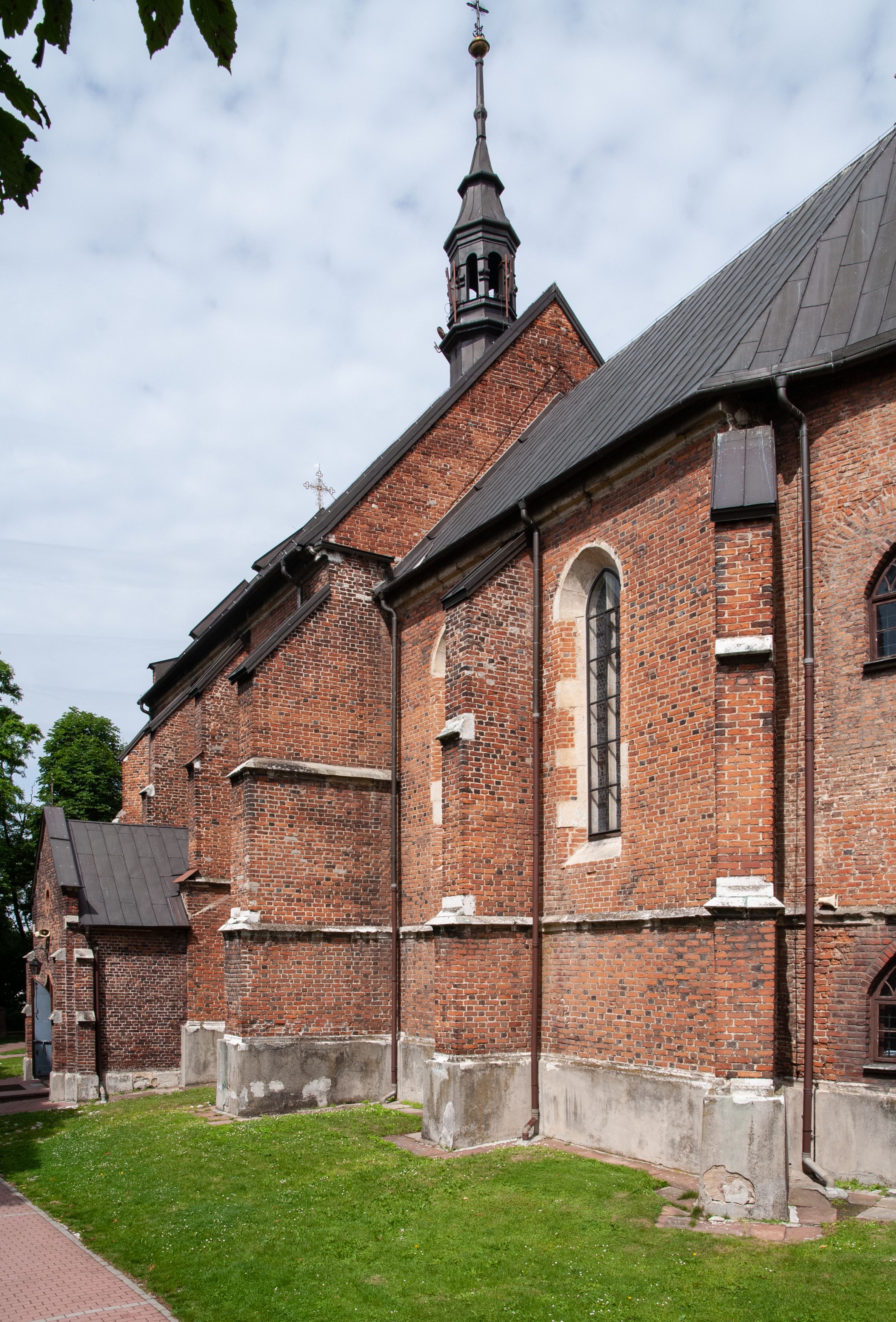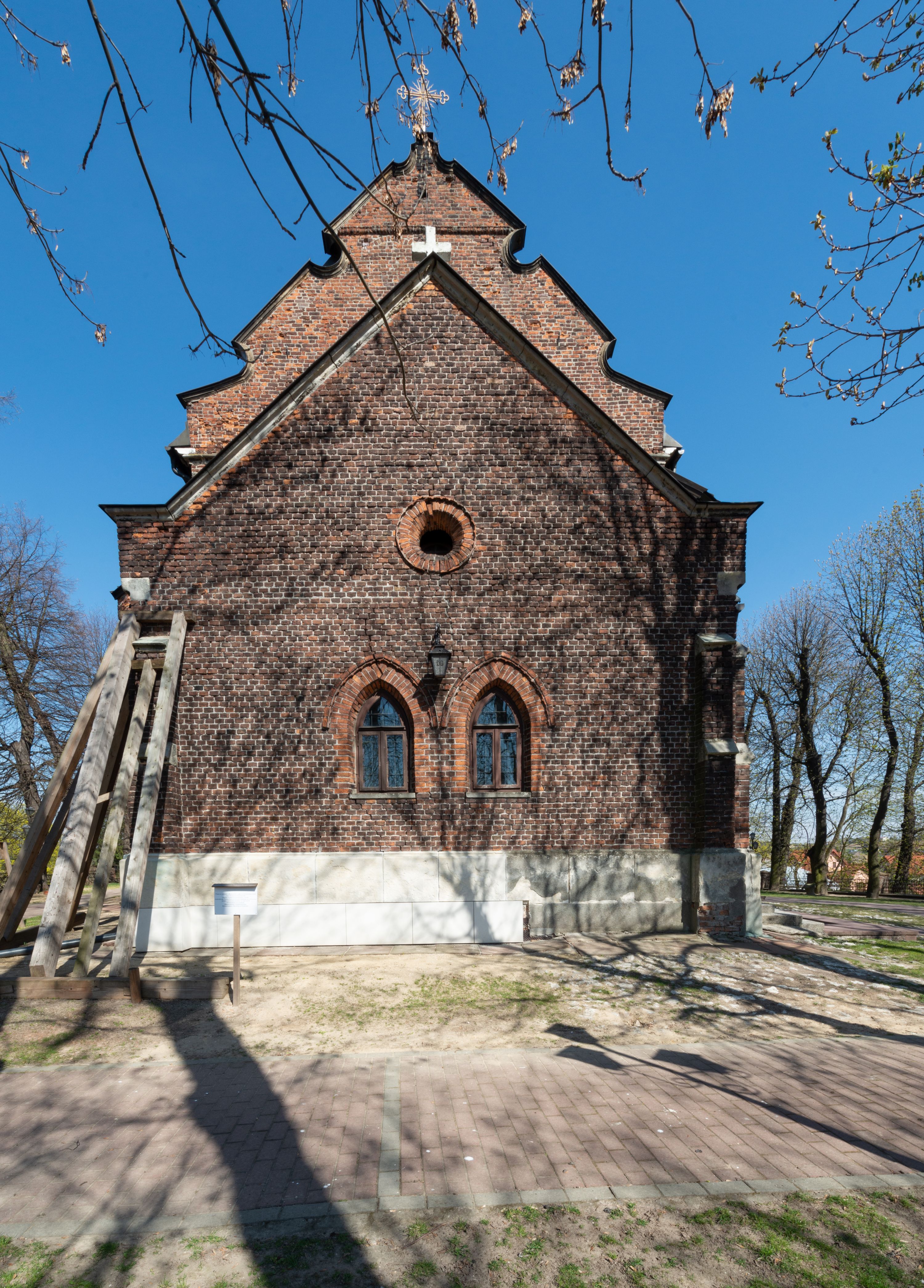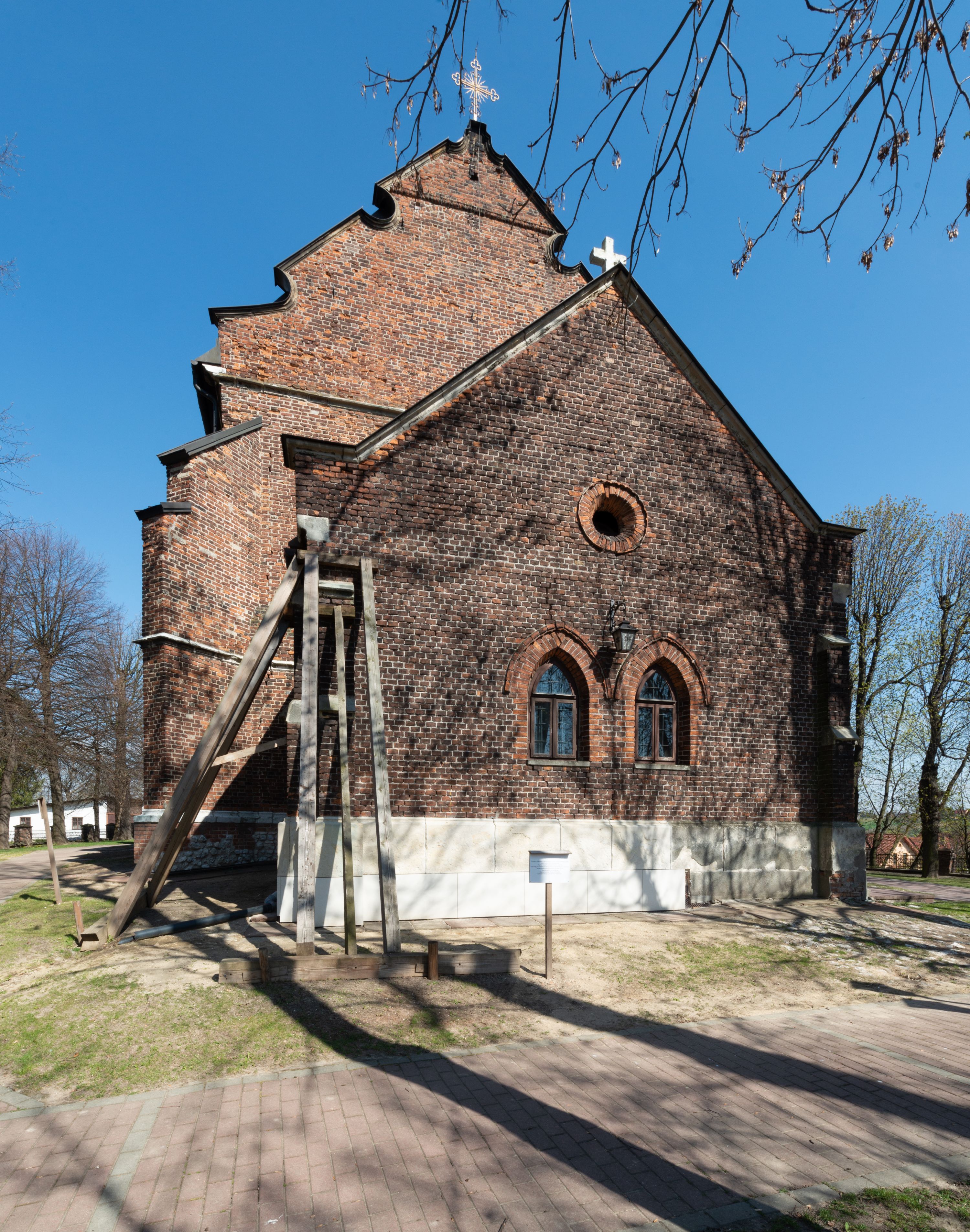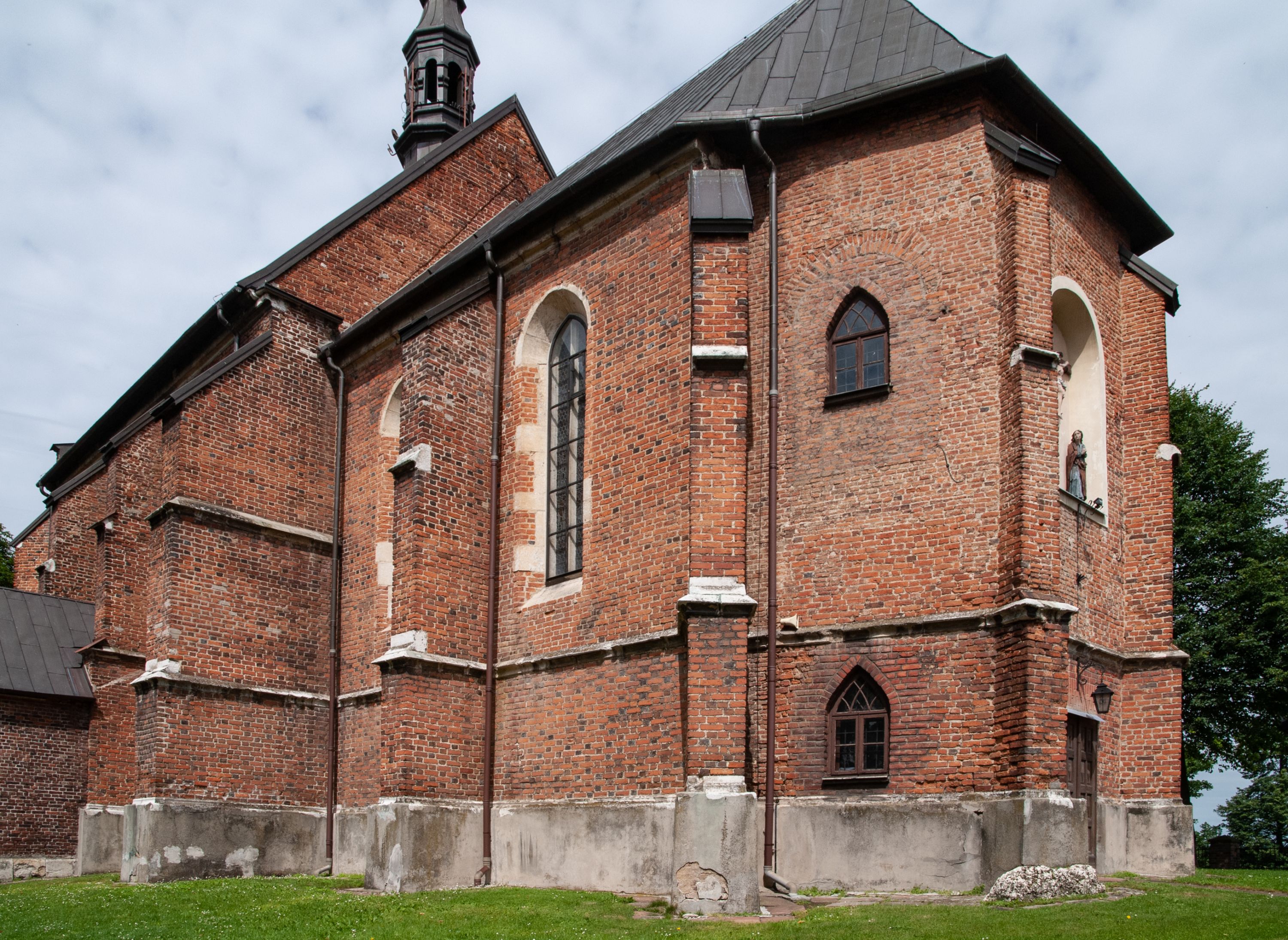 Kościół jest zlokalizowany na wzgórzu, w centrum wsi. Murowany z cegły, w wątku polskim, z zendrówką. Kościół jest orientowany, założony na planie prostokąta, jednonawowy, trójprzęsłowy, z dobudowanymi kruchtami od zachodu i południa. Prezbiterium oddzielone od nawy łukiem tęczowym, dwuprzęsłowe na planie prostokąta, zamknięte prostą ścianą, z dwukondygnacyjną przybudówką zakończoną trójbocznie. Nawa została przykryta sklepieniem sieciowym. Ściana południowa nawy przepruta trzema prostokątnymi oknami, zamkniętymi łukiem ostrym. Okna w nawie i prezbiterium dwudzielne, z sześcioma mniejszymi kwaterami. Przybudówka przy prezbiterium na parterze mieści zakrystię, a na piętrze składzik. Kruchta południowa sklepiona kolebką. Z kruchty do nawy prowadzi ostrołukowy, kamienny portal o dwóch archiwoltach. Kruchta zachodnia, obecnie kaplica św. Franciszka, sklepiona spłaszczoną, ukrytą kopułą na pendentywach. Ściana zachodnia kruchty przepruta dwoma ostrołukowymi oknami i ponad nimi okrągłym oknem. Od południa ostrołukowe wejście. Kościół o zróżnicowanej wysokości nawy i prezbiterium. Ściany opięte szkarpami. Na jednej trzeciej wysokości ścian oraz w zwieńczeniu nawy i prezbiterium profilowany gzyms. Od zachodu wklęsło-wypukły szczyt. Nawa, prezbiterium i dwie kruchty przykryte dachem dwuspadowym. Nad drugim przęsłem prezbiterium wieżyczka na sygnaturkę na planie ośmioboku, z profilowanym gzymsem i latarnią, zwieńczoną hełmem z kulą i krzyżem. Wejście do kościoła od południa i zachodu. Okna nawy i prezbiterium z kamiennym obramieniem. Nad wejściem do kruchty południowej formowany w cegle ostry łuk. Analogiczny łuk nad oknami w ścianie zachodniej i nad blendą w ścianie północnej. W przybudówce do prezbiterium dwie kondygnacje okien zamkniętych łukiem ostrym. W ścianie frontowej prostokątne wejście, a nad nim półkoliście zamknięta wnęka z grupą Ukrzyżowania.
