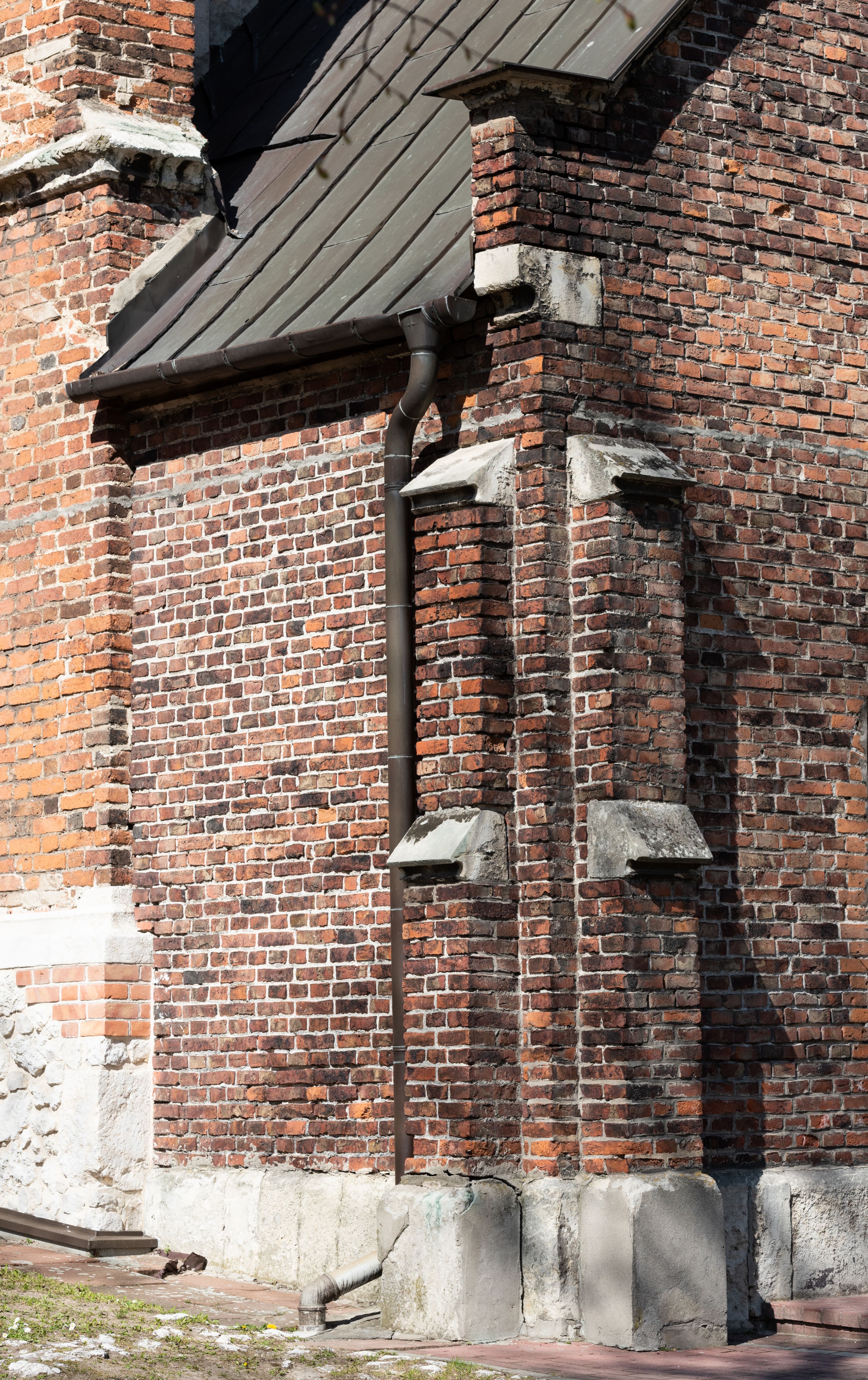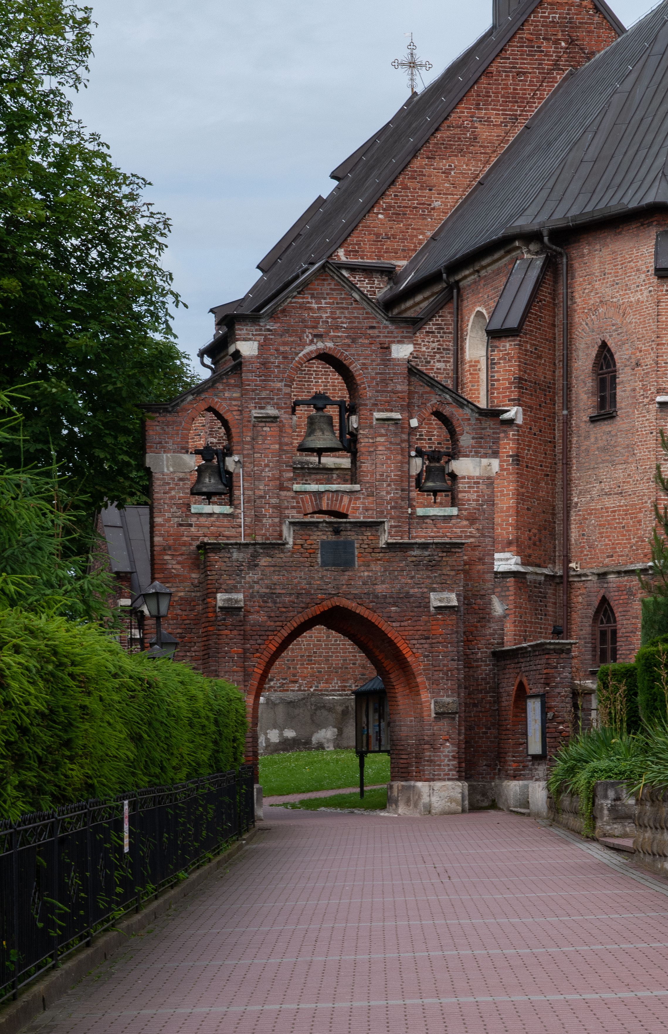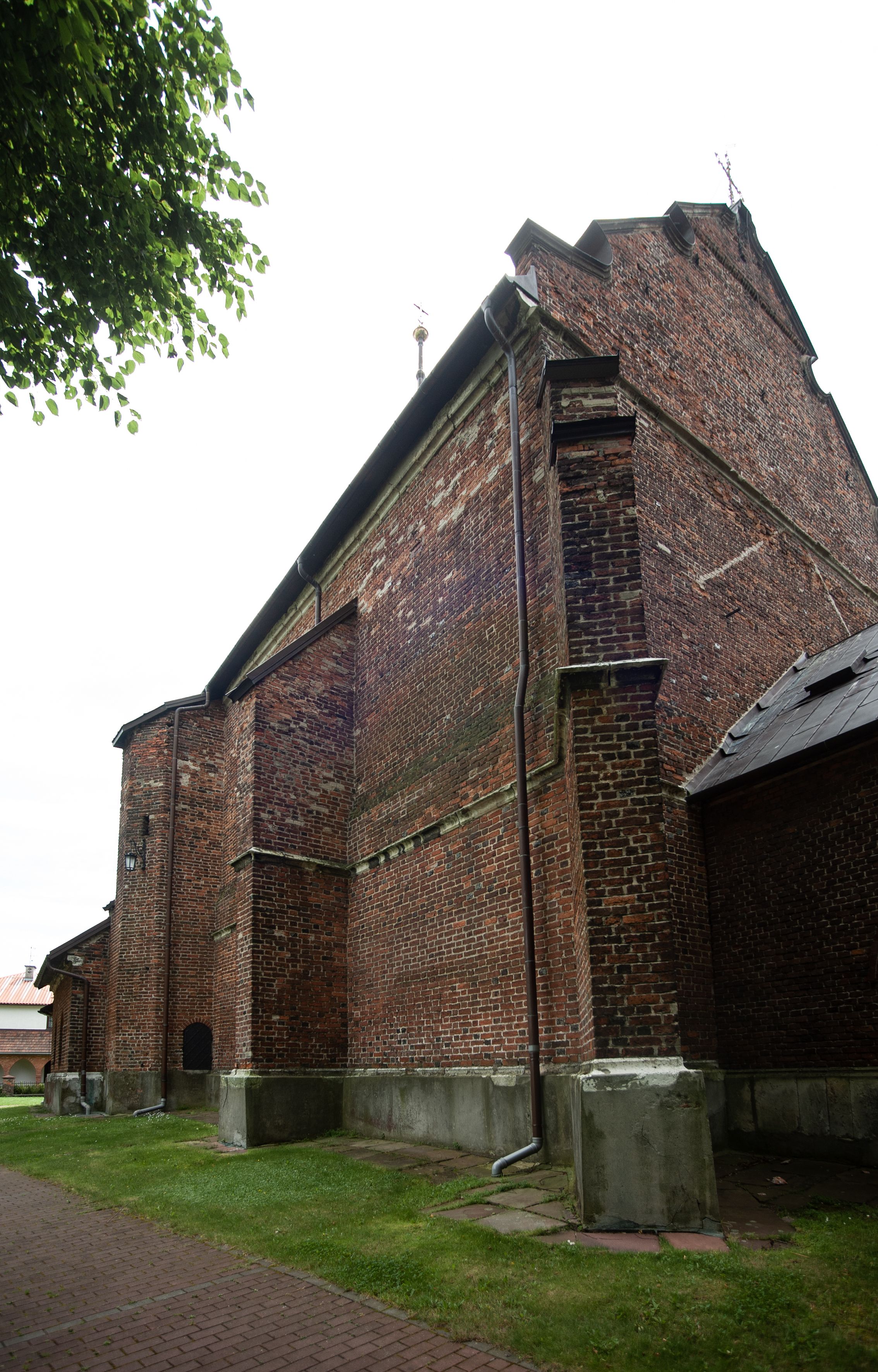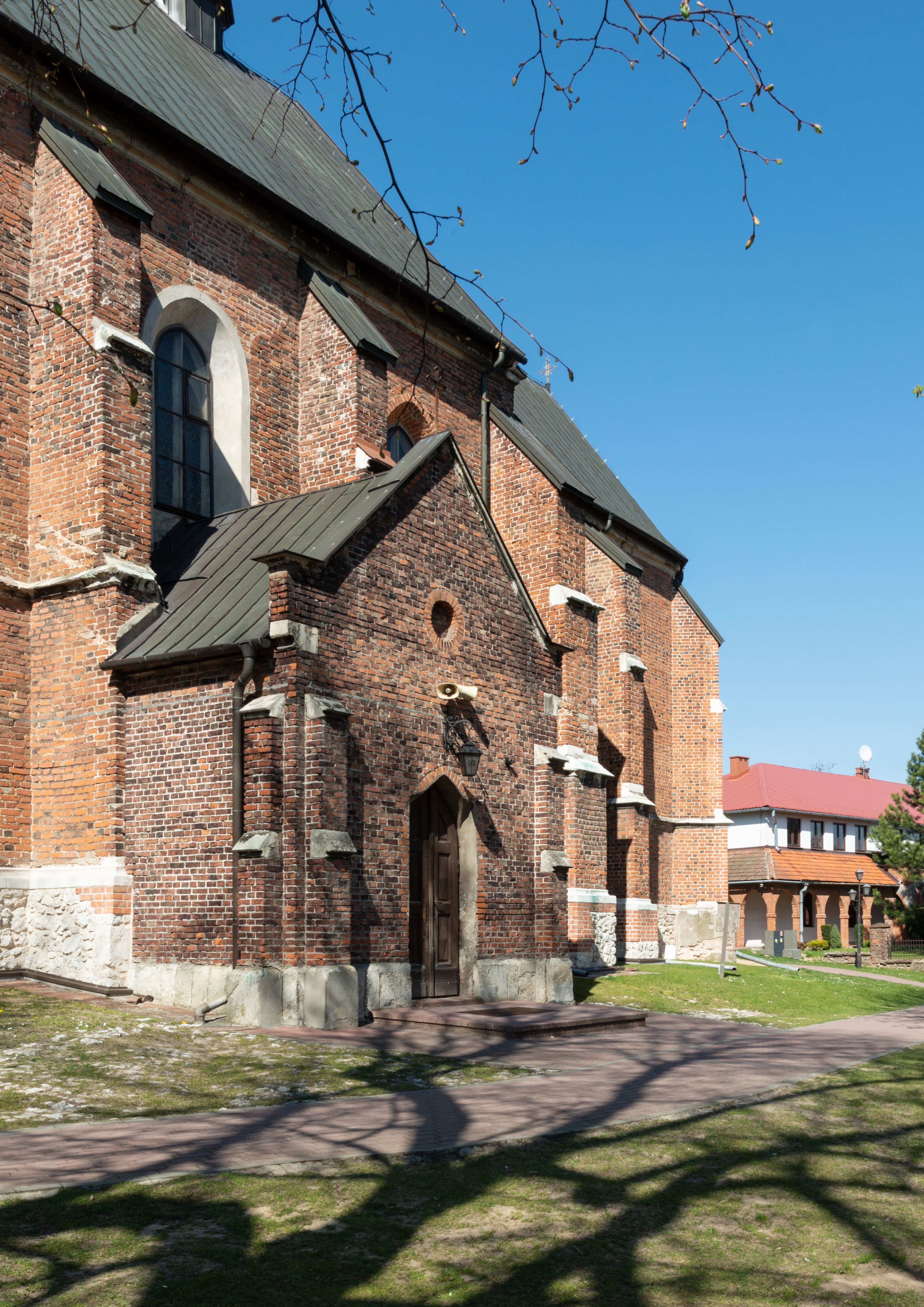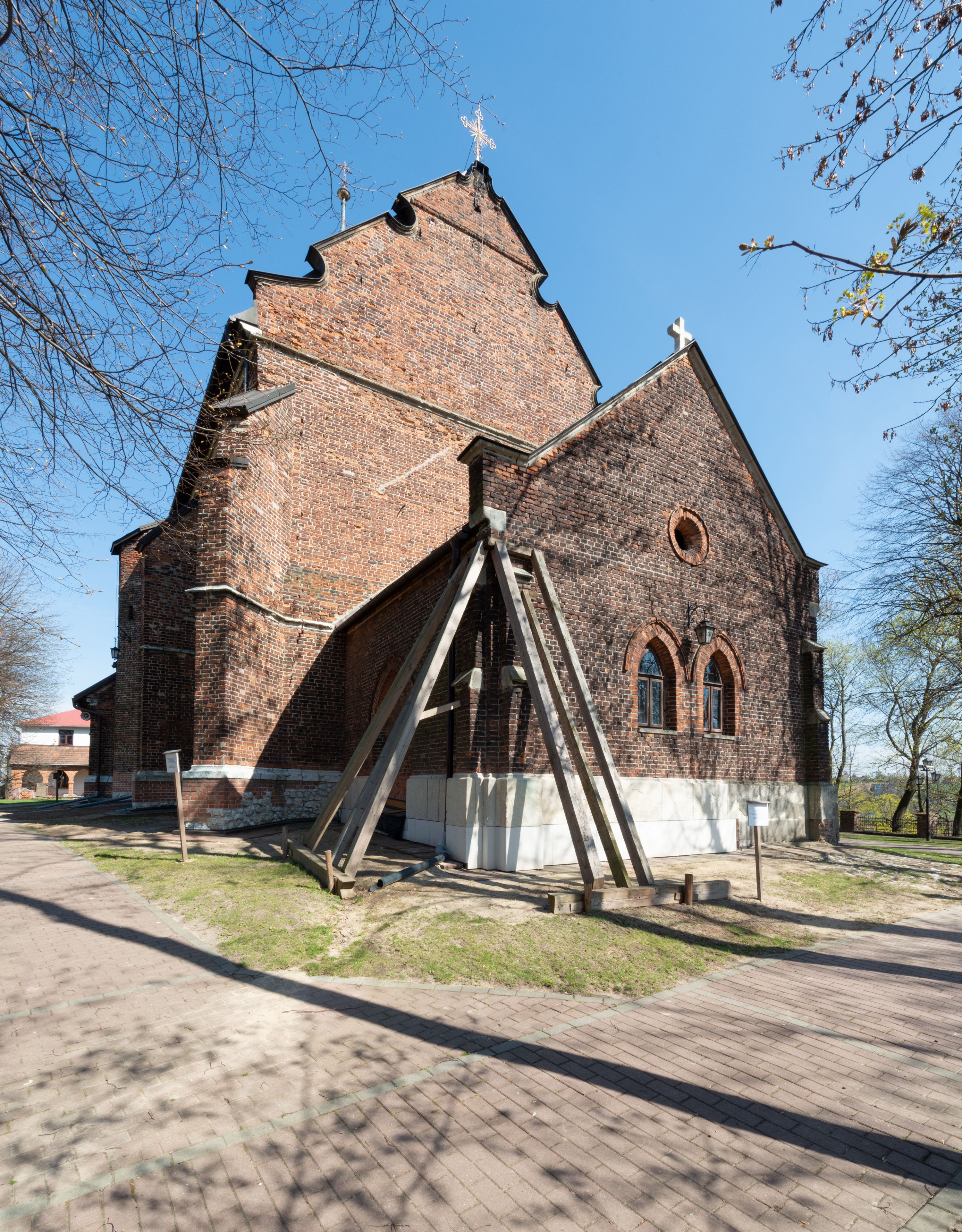 Kościół jest zlokalizowany na wzgórzu, w centrum wsi. Murowany z cegły, w wątku polskim, z zendrówką. Kościół jest orientowany, założony na planie prostokąta, jednonawowy, trójprzęsłowy, z dobudowanymi kruchtami od zachodu i południa. Prezbiterium oddzielone od nawy łukiem tęczowym, dwuprzęsłowe na planie prostokąta, zamknięte prostą ścianą, z dwukondygnacyjną przybudówką zakończoną trójbocznie. Nawa została przykryta sklepieniem sieciowym. Ściana południowa nawy przepruta trzema prostokątnymi oknami, zamkniętymi łukiem ostrym. Okna w nawie i prezbiterium dwudzielne, z sześcioma mniejszymi kwaterami. Przybudówka przy prezbiterium na parterze mieści zakrystię, a na piętrze składzik. Kruchta południowa sklepiona kolebką. Z kruchty do nawy prowadzi ostrołukowy, kamienny portal o dwóch archiwoltach. Kruchta zachodnia, obecnie kaplica św. Franciszka, sklepiona spłaszczoną, ukrytą kopułą na pendentywach. Ściana zachodnia kruchty przepruta dwoma ostrołukowymi oknami i ponad nimi okrągłym oknem. Od południa ostrołukowe wejście. Kościół o zróżnicowanej wysokości nawy i prezbiterium. Ściany opięte szkarpami. Na jednej trzeciej wysokości ścian oraz w zwieńczeniu nawy i prezbiterium profilowany gzyms. Od zachodu wklęsło-wypukły szczyt. Nawa, prezbiterium i dwie kruchty przykryte dachem dwuspadowym. Nad drugim przęsłem prezbiterium wieżyczka na sygnaturkę na planie ośmioboku, z profilowanym gzymsem i latarnią, zwieńczoną hełmem z kulą i krzyżem. Wejście do kościoła od południa i zachodu. Okna nawy i prezbiterium z kamiennym obramieniem. Nad wejściem do kruchty południowej formowany w cegle ostry łuk. Analogiczny łuk nad oknami w ścianie zachodniej i nad blendą w ścianie północnej. W przybudówce do prezbiterium dwie kondygnacje okien zamkniętych łukiem ostrym. W ścianie frontowej prostokątne wejście, a nad nim półkoliście zamknięta wnęka z grupą Ukrzyżowania.