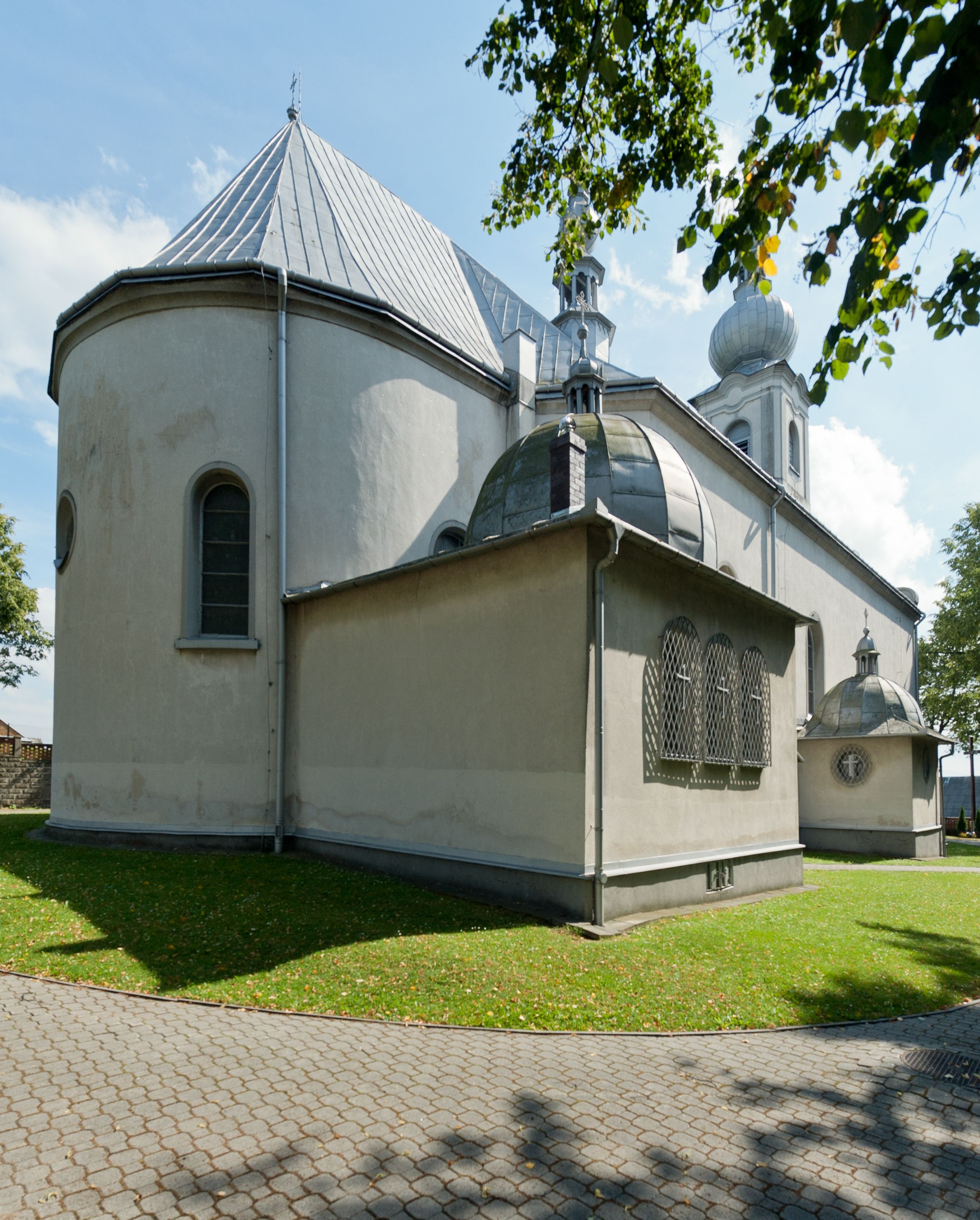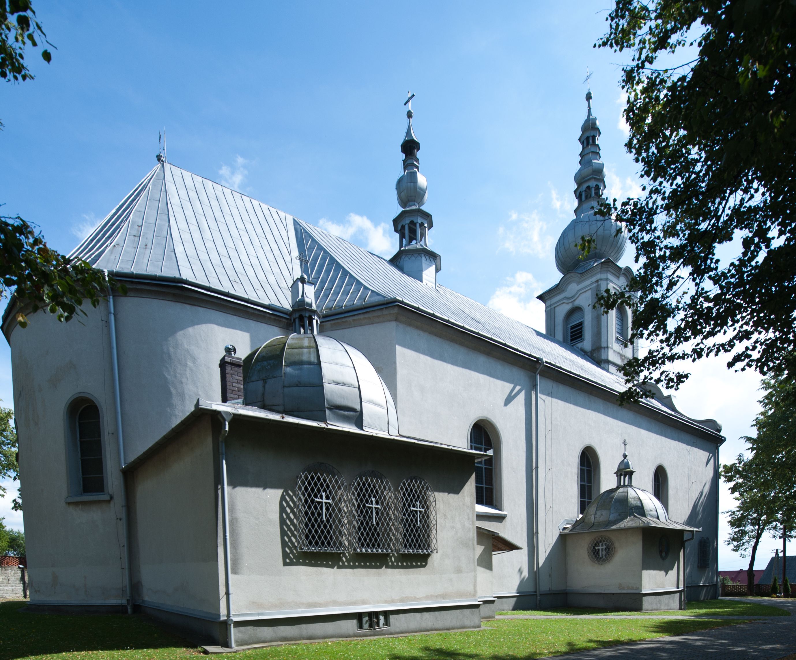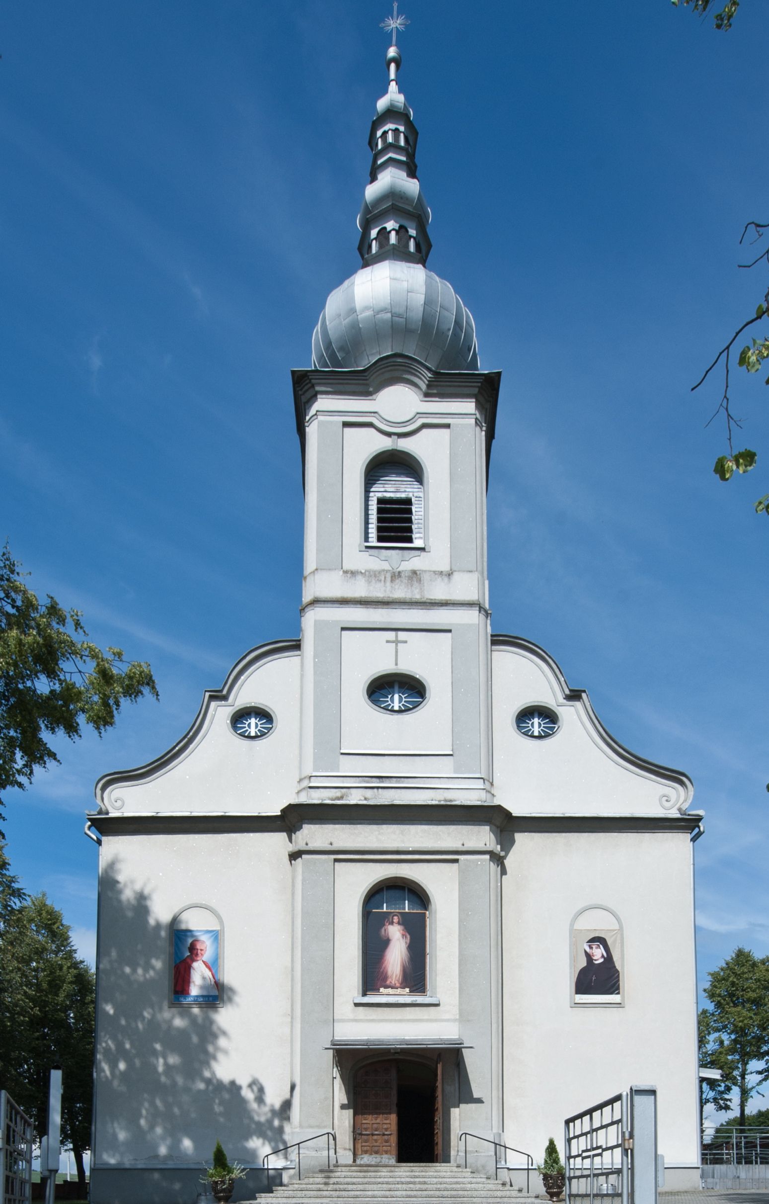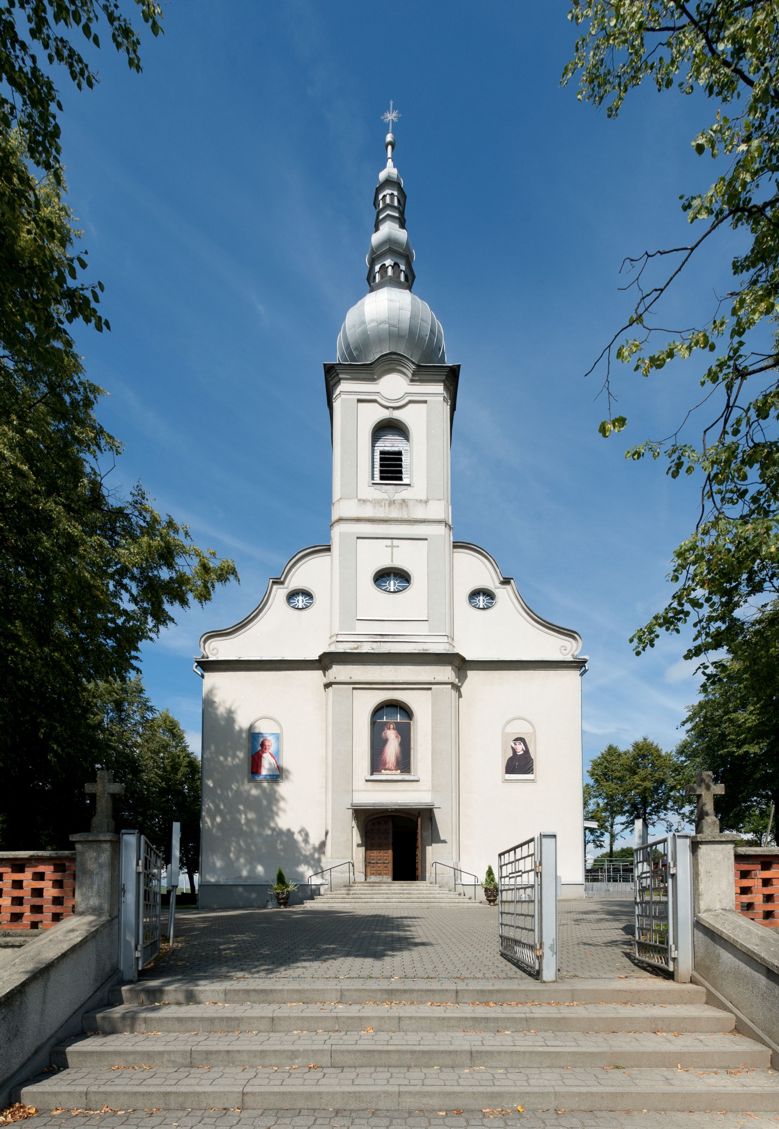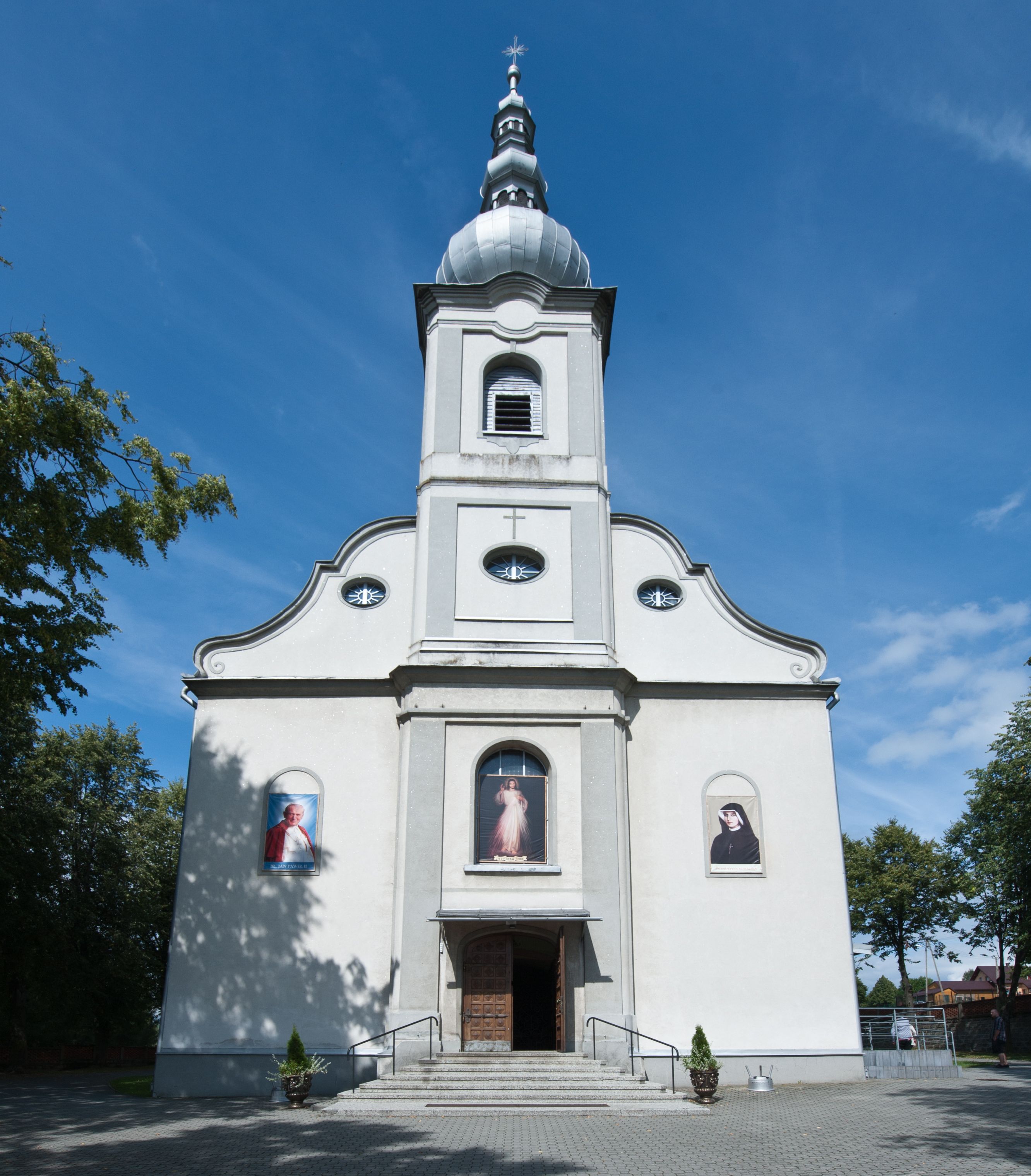 Kościół murowany, jednonawowy, na rzucie prostokąta, z późniejszymi dobudówkami. Prezbiterium usytuowane od północy, jednoprzęsłowe, węższe od korpusu, zamknięte półkolistą absydą. Do prezbiterium dobudowana zakrystia od wschodu oraz kaplica od zachodu poprzedzona niewielką kruchtą. Nawa główna trójprzęsłowa z partią wieżową niewyróżniającą się w bryle. Po bokach przęsła środkowego dostawione dwie kaplice na rzucie kwadratu: od wschodu Matki Boskiej Częstochowskiej, od zachodu św. Maksymiliana Marii Kolbego. Chór muzyczny wsparty na trzech arkadach. W prezbiterium sklepienie żaglaste, a w nawie krzyżowe, pozorne, oddzielone gurtami wychodzącymi z potężnych filarów przyściennych. Okna prostokątne, zamknięte półkoliście znajdują się w nawie, kaplicy przy prezbiterium, w wieży i w ścianach bocznych absydy. Natomiast w ścianach bocznych prezbiterium, na osi absydy i w kaplicach przy nawie okna koliste. Okna w większości wypełnione witrażami ze scenami figuralnymi, w innych ozdobne przeszklenia geometryczne. Fasada trójosiowa, na osi środkowej usytuowana wieża, delikatnie wystająca przed lico fasady, o podziałach ramowych, nakryta baniastym hełmem z dwukondygnacyjną latarnią. Osie boczne zwieńczone spływami wolutowymi. Dachy gontowe.