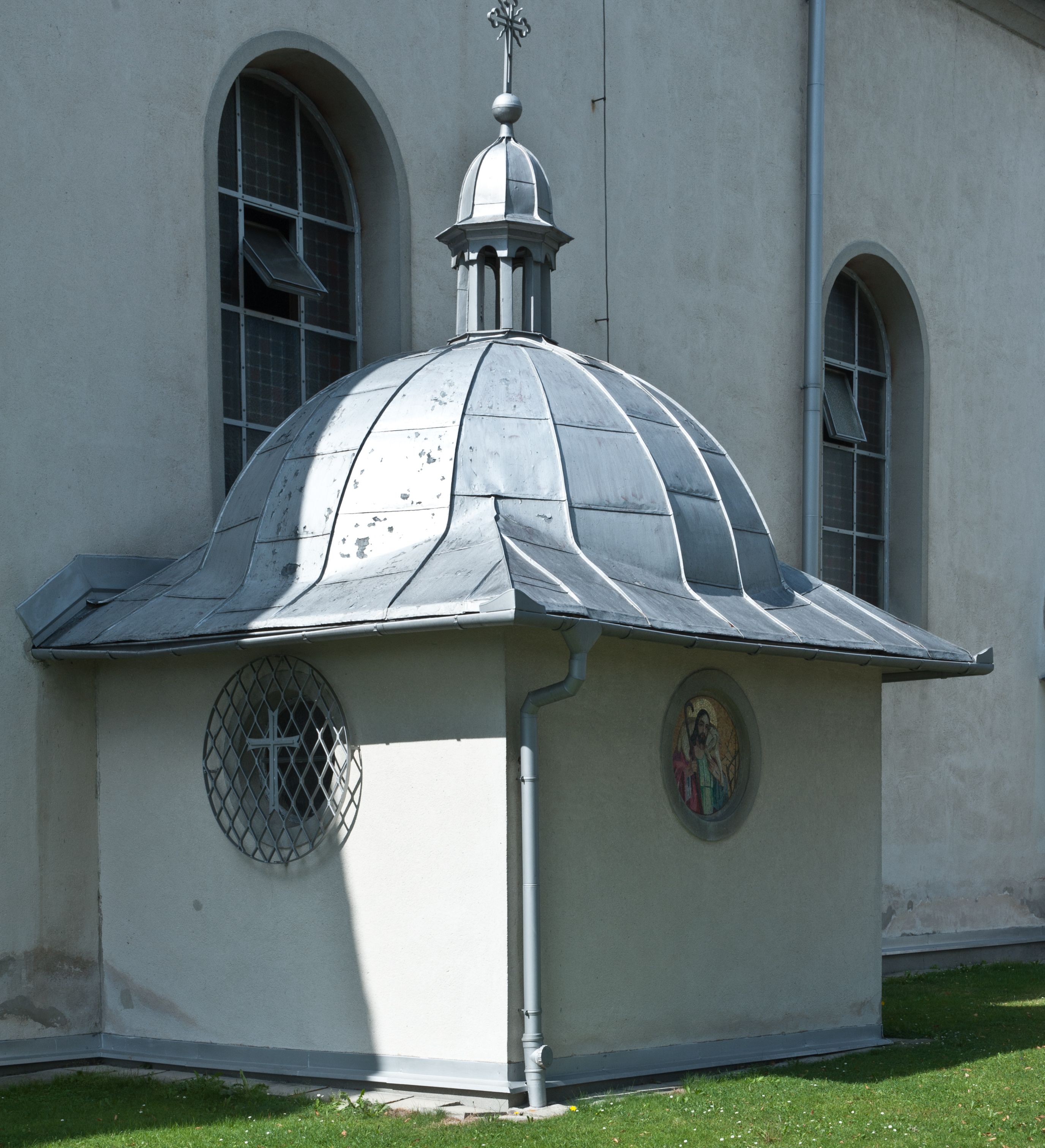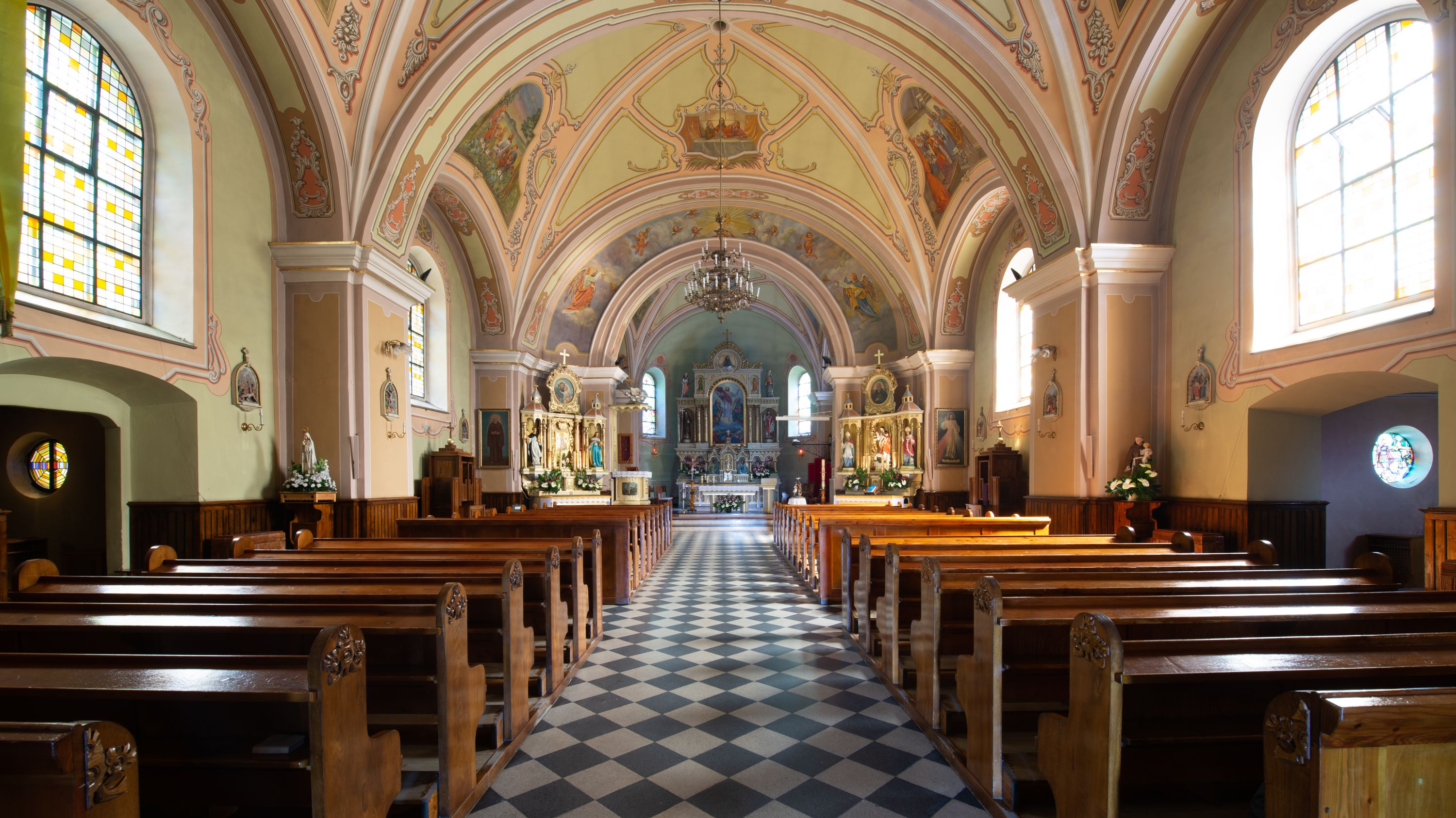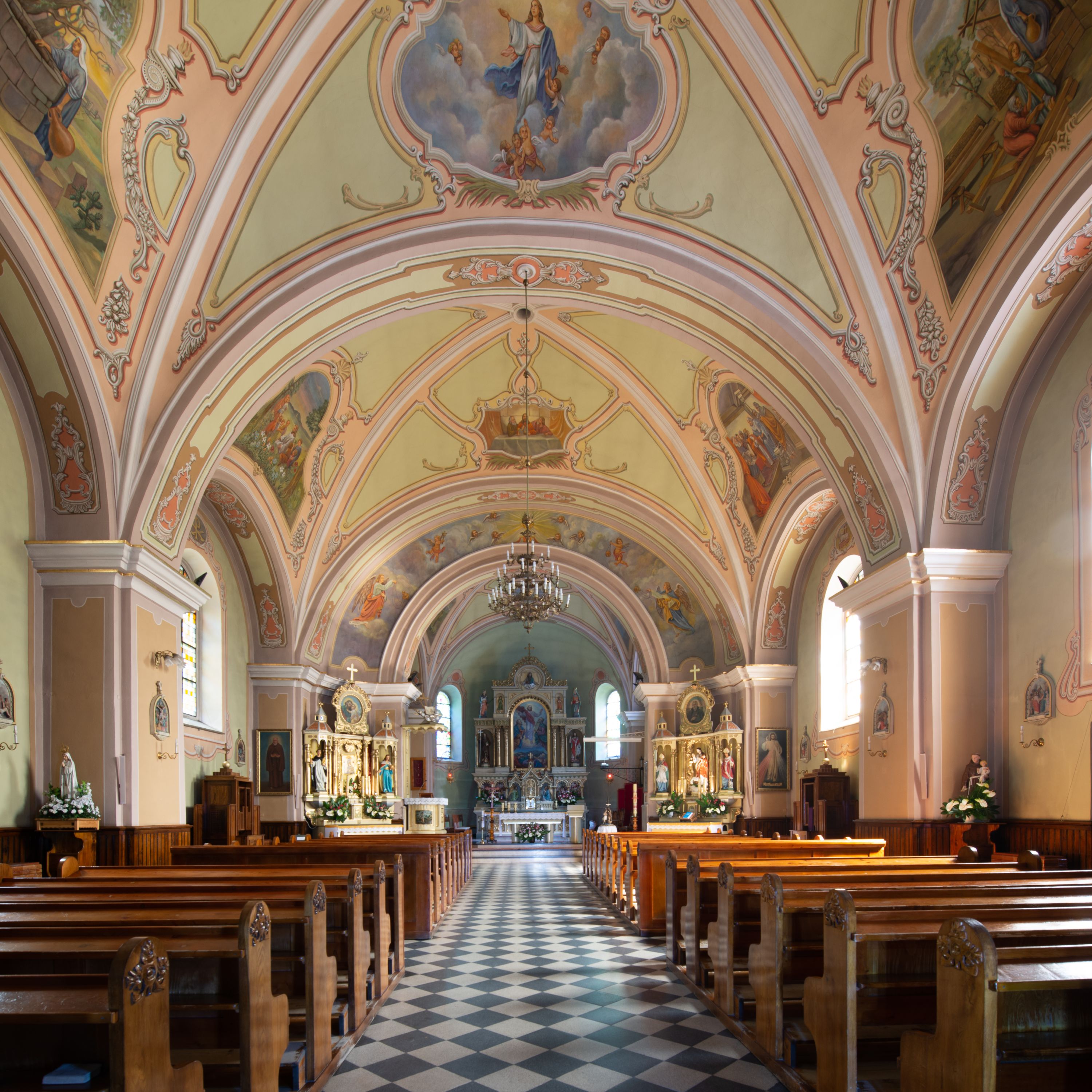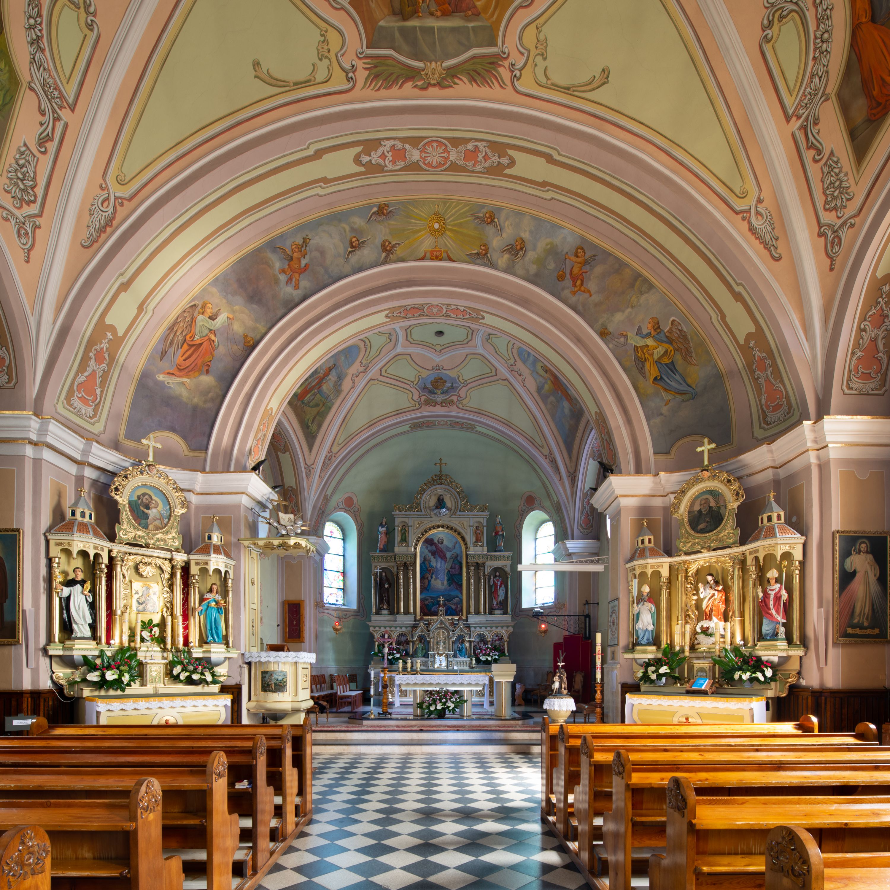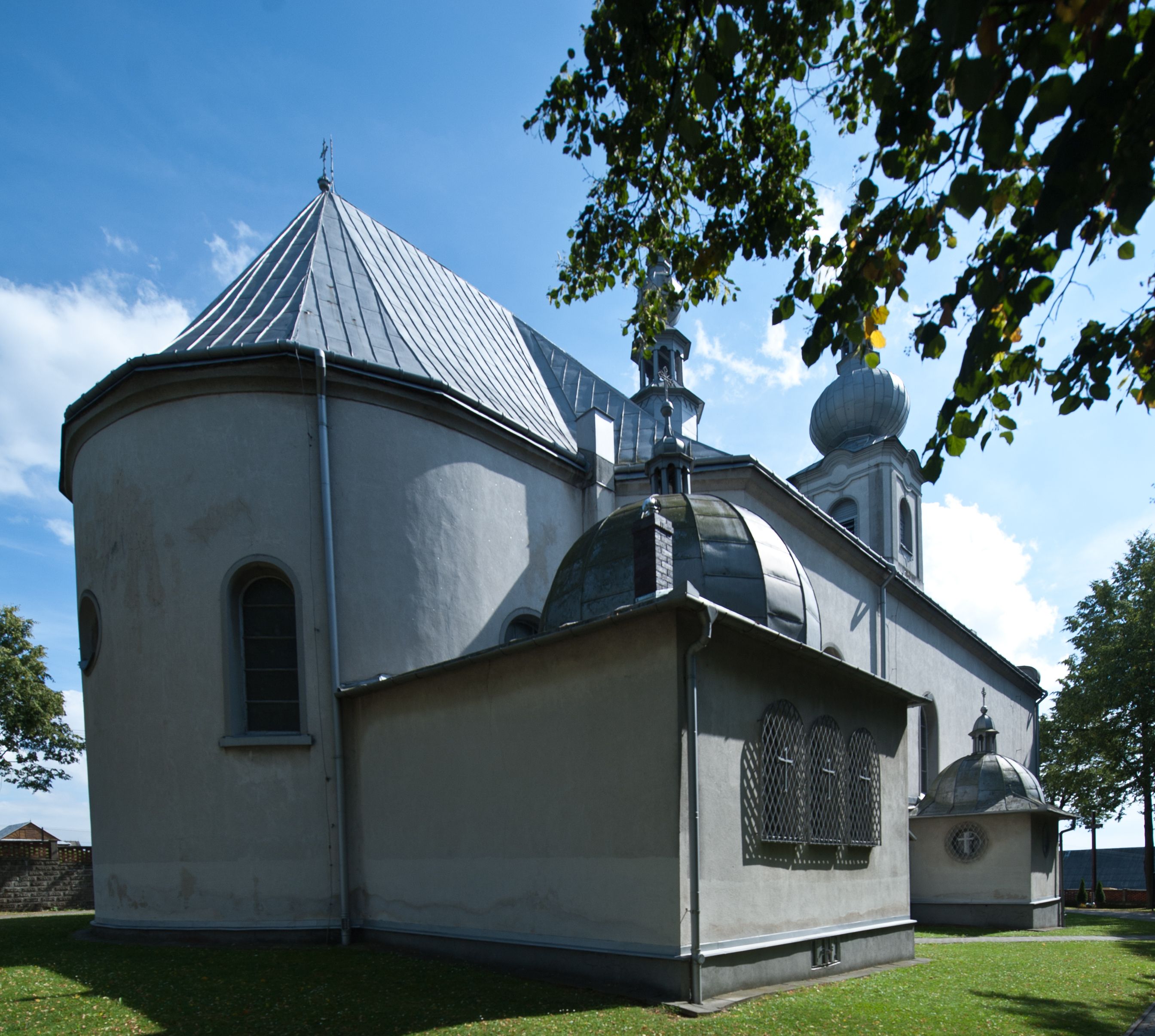 Kościół murowany, jednonawowy, na rzucie prostokąta, z późniejszymi dobudówkami. Prezbiterium usytuowane od północy, jednoprzęsłowe, węższe od korpusu, zamknięte półkolistą absydą. Do prezbiterium dobudowana zakrystia od wschodu oraz kaplica od zachodu poprzedzona niewielką kruchtą. Nawa główna trójprzęsłowa z partią wieżową niewyróżniającą się w bryle. Po bokach przęsła środkowego dostawione dwie kaplice na rzucie kwadratu: od wschodu Matki Boskiej Częstochowskiej, od zachodu św. Maksymiliana Marii Kolbego. Chór muzyczny wsparty na trzech arkadach. W prezbiterium sklepienie żaglaste, a w nawie krzyżowe, pozorne, oddzielone gurtami wychodzącymi z potężnych filarów przyściennych. Okna prostokątne, zamknięte półkoliście znajdują się w nawie, kaplicy przy prezbiterium, w wieży i w ścianach bocznych absydy. Natomiast w ścianach bocznych prezbiterium, na osi absydy i w kaplicach przy nawie okna koliste. Okna w większości wypełnione witrażami ze scenami figuralnymi, w innych ozdobne przeszklenia geometryczne. Fasada trójosiowa, na osi środkowej usytuowana wieża, delikatnie wystająca przed lico fasady, o podziałach ramowych, nakryta baniastym hełmem z dwukondygnacyjną latarnią. Osie boczne zwieńczone spływami wolutowymi. Dachy gontowe.