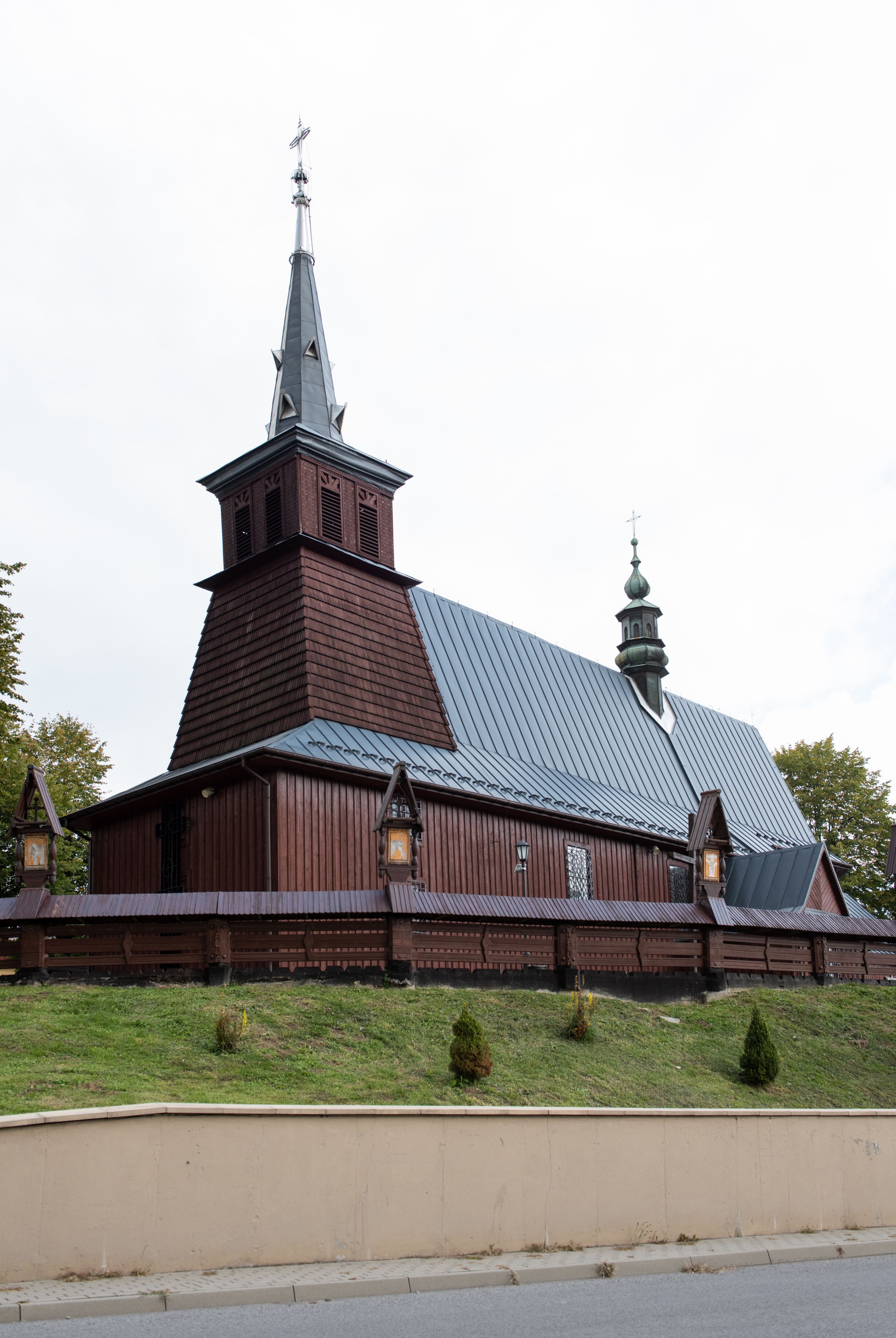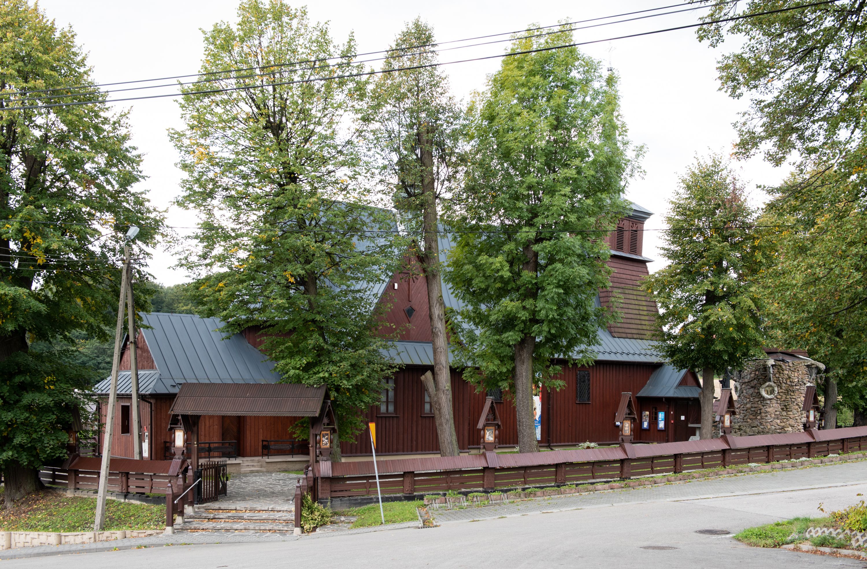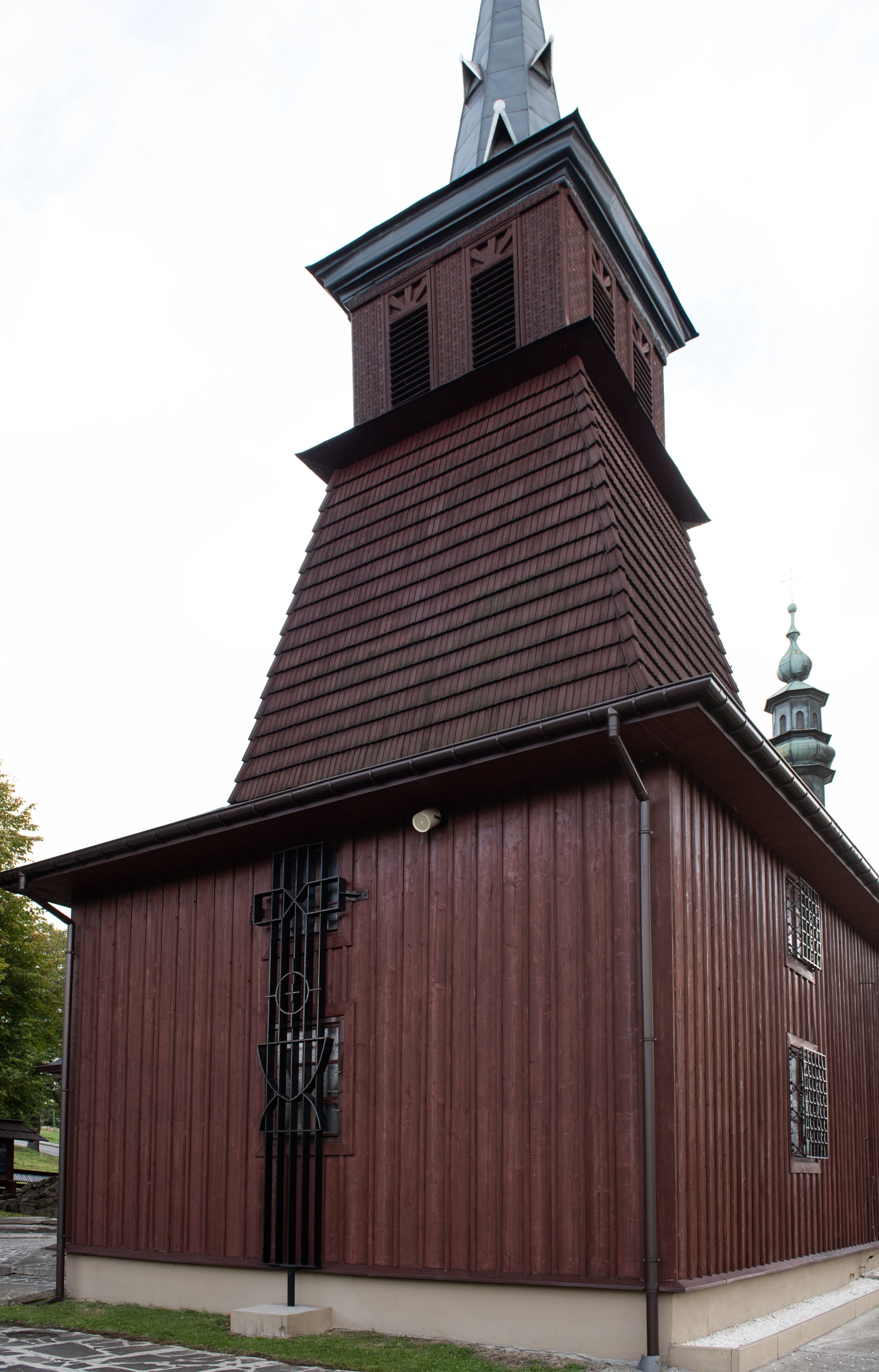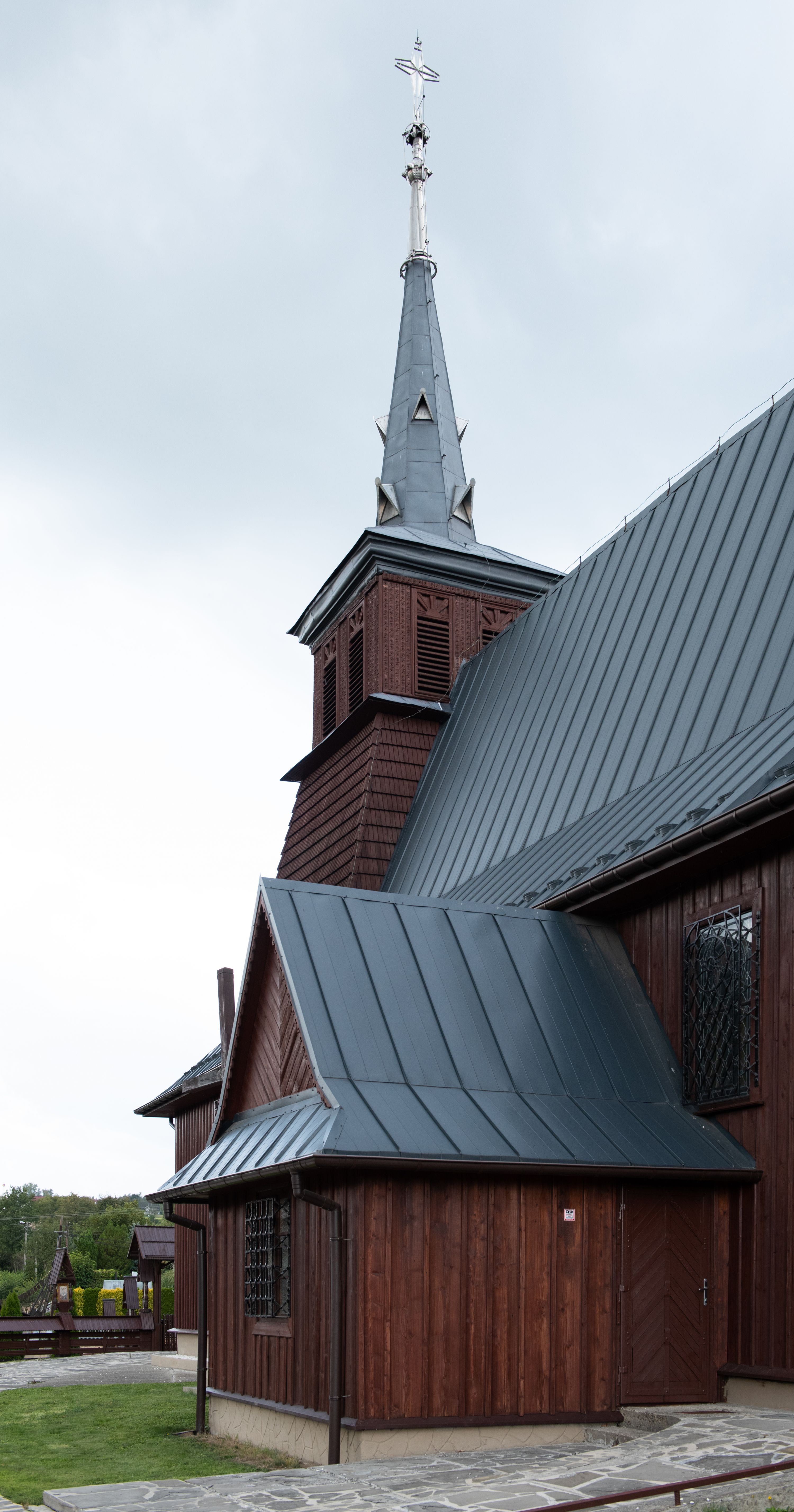 Kościół odbudowany w latach 1981-1985, utracił pierwotny wygląd szesnastowiecznej architektury, jedynie w partii wieży zachowała się części oryginalne. Wieża nawiązuje do dawnego typu wykształconego jeszcze w XVII wieku na terenie Małopolski, czyli dzwonnicy dwukondygnacyjnej o ścianach pochyłych w kondygnacji dolnej, a pionowych w górnej, oddzielonych uskokiem. Forma wieży „izbicowej”, czyli z dodatkowym piętrem na dzwony, była niezwykle trwała w XVIII wieku. Wieże takie dobudowano do kościołów w Rabce, Krzeczowie (gm. Lubień), Skomielnej Białej, Zambrzycach, Ostrowsku, Łodygowicach i wolnostojące w Tomaszowie, Jordanowie, Łapczycy, Prandocinie i Porębie Spytkowskiej.