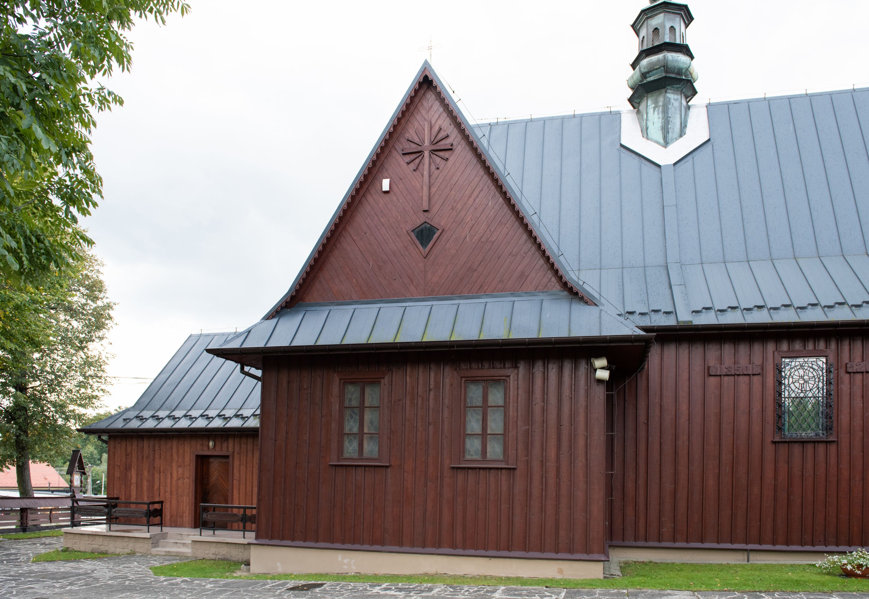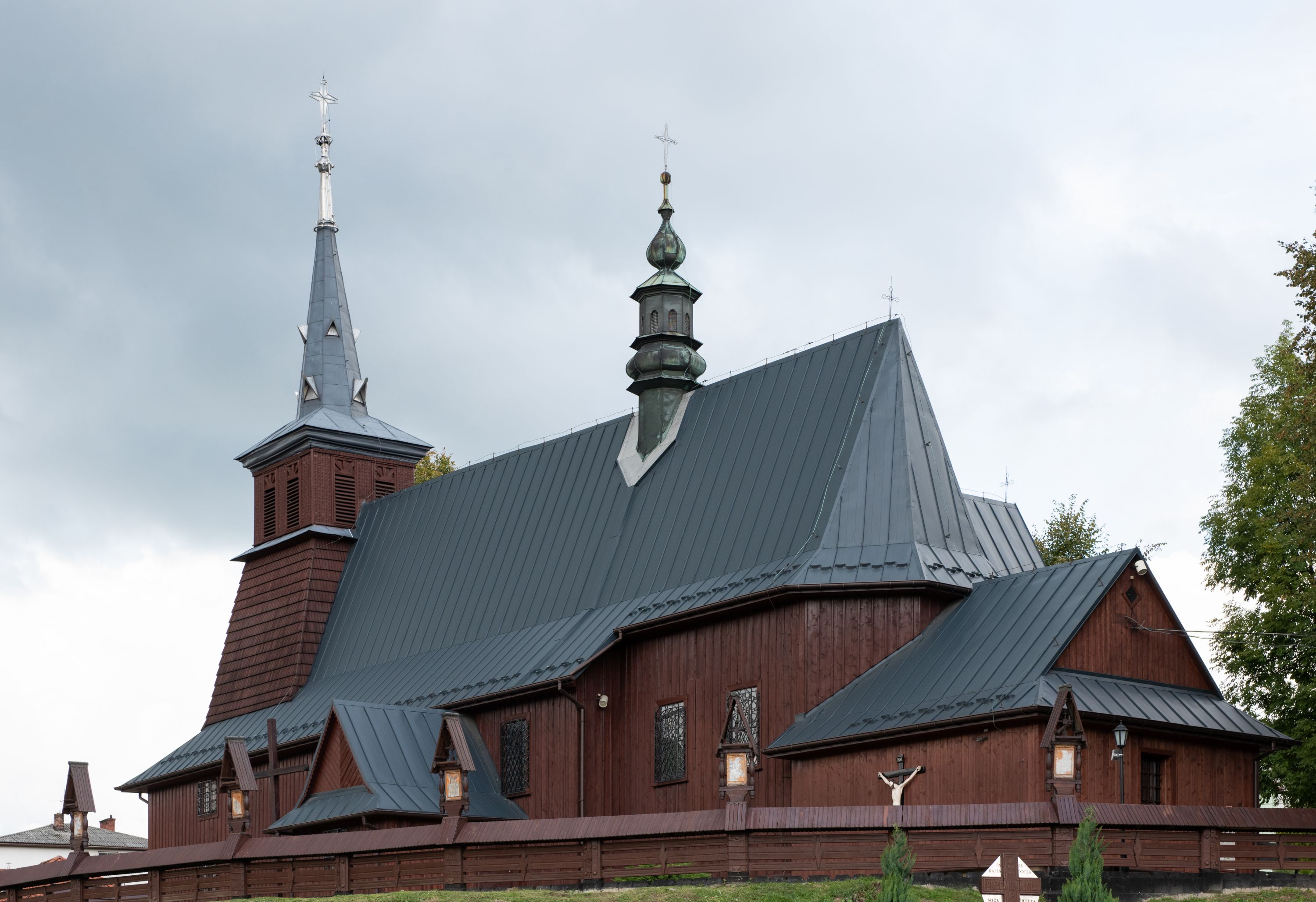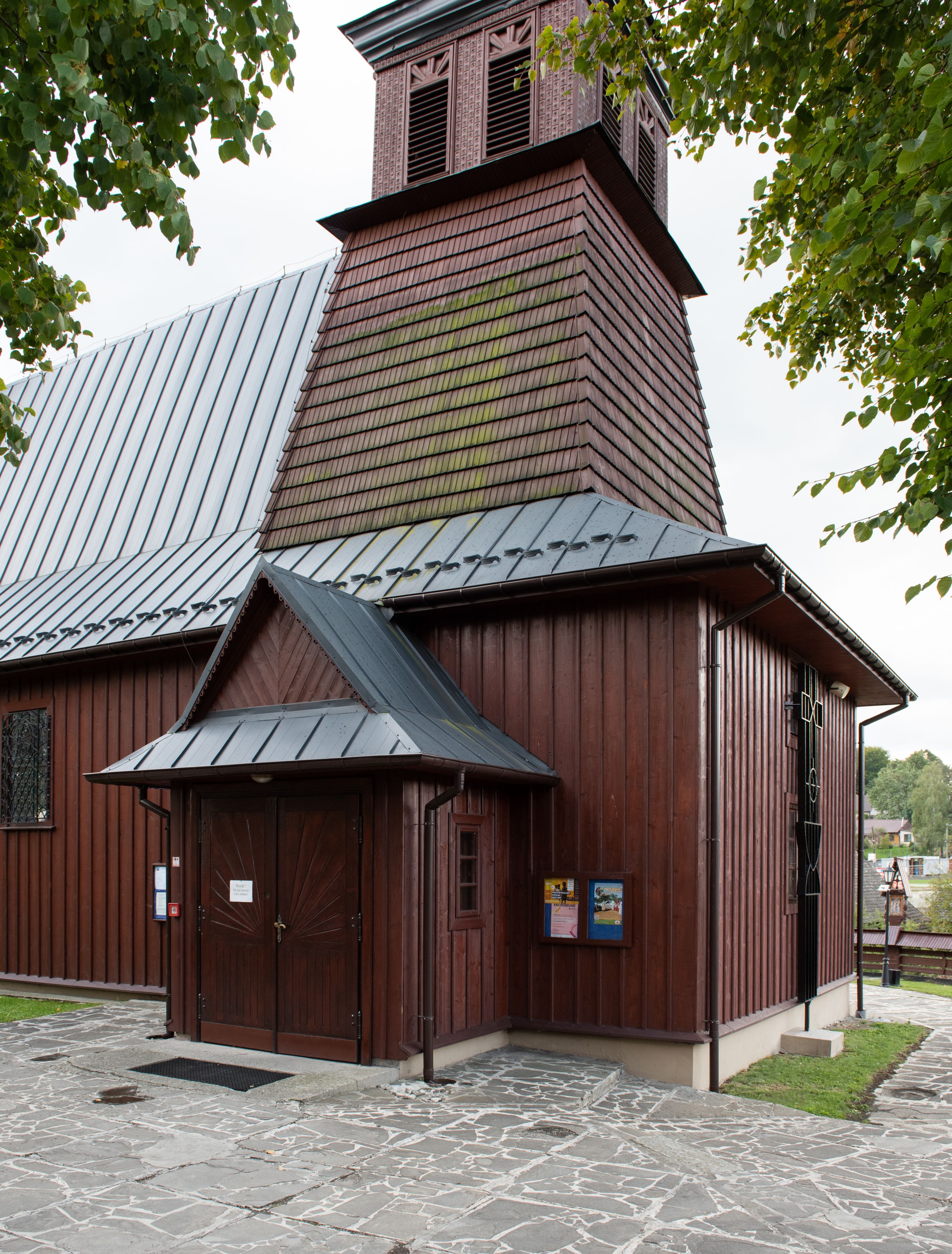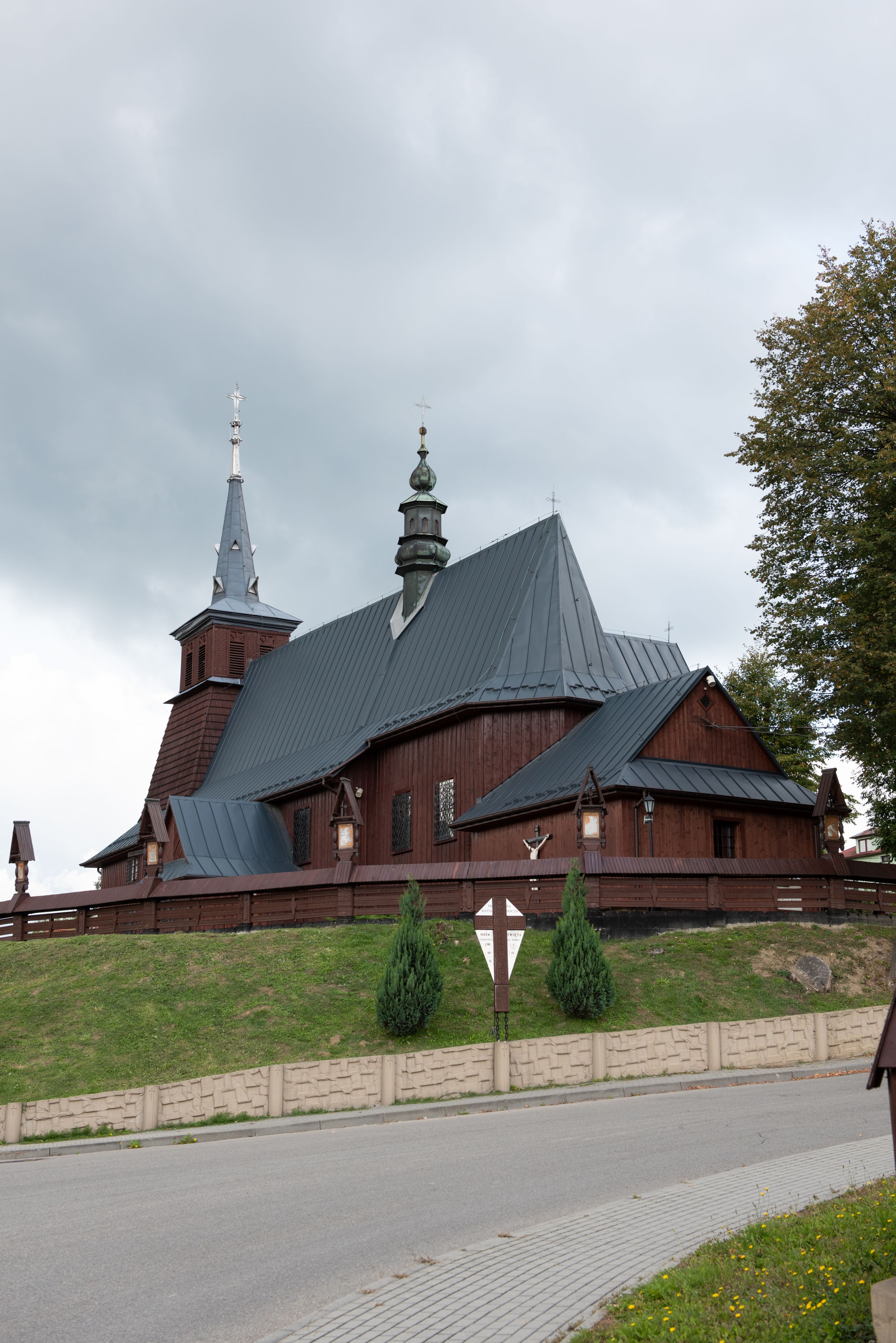 Kościół odbudowany w latach 1981-1985, utracił pierwotny wygląd szesnastowiecznej architektury, jedynie w partii wieży zachowała się części oryginalne. Wieża nawiązuje do dawnego typu wykształconego jeszcze w XVII wieku na terenie Małopolski, czyli dzwonnicy dwukondygnacyjnej o ścianach pochyłych w kondygnacji dolnej, a pionowych w górnej, oddzielonych uskokiem. Forma wieży „izbicowej”, czyli z dodatkowym piętrem na dzwony, była niezwykle trwała w XVIII wieku. Wieże takie dobudowano do kościołów w Rabce, Krzeczowie (gm. Lubień), Skomielnej Białej, Zambrzycach, Ostrowsku, Łodygowicach i wolnostojące w Tomaszowie, Jordanowie, Łapczycy, Prandocinie i Porębie Spytkowskiej.