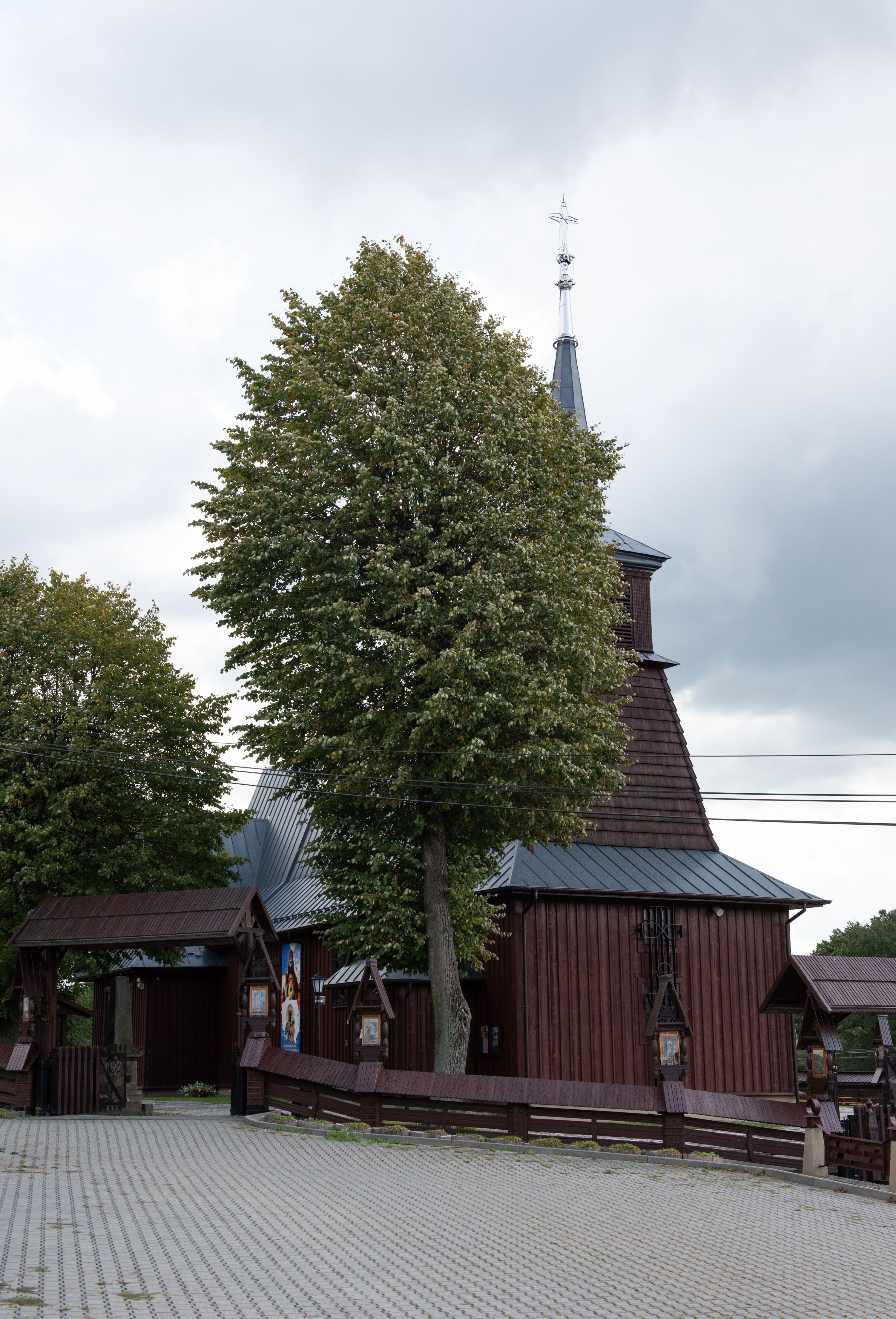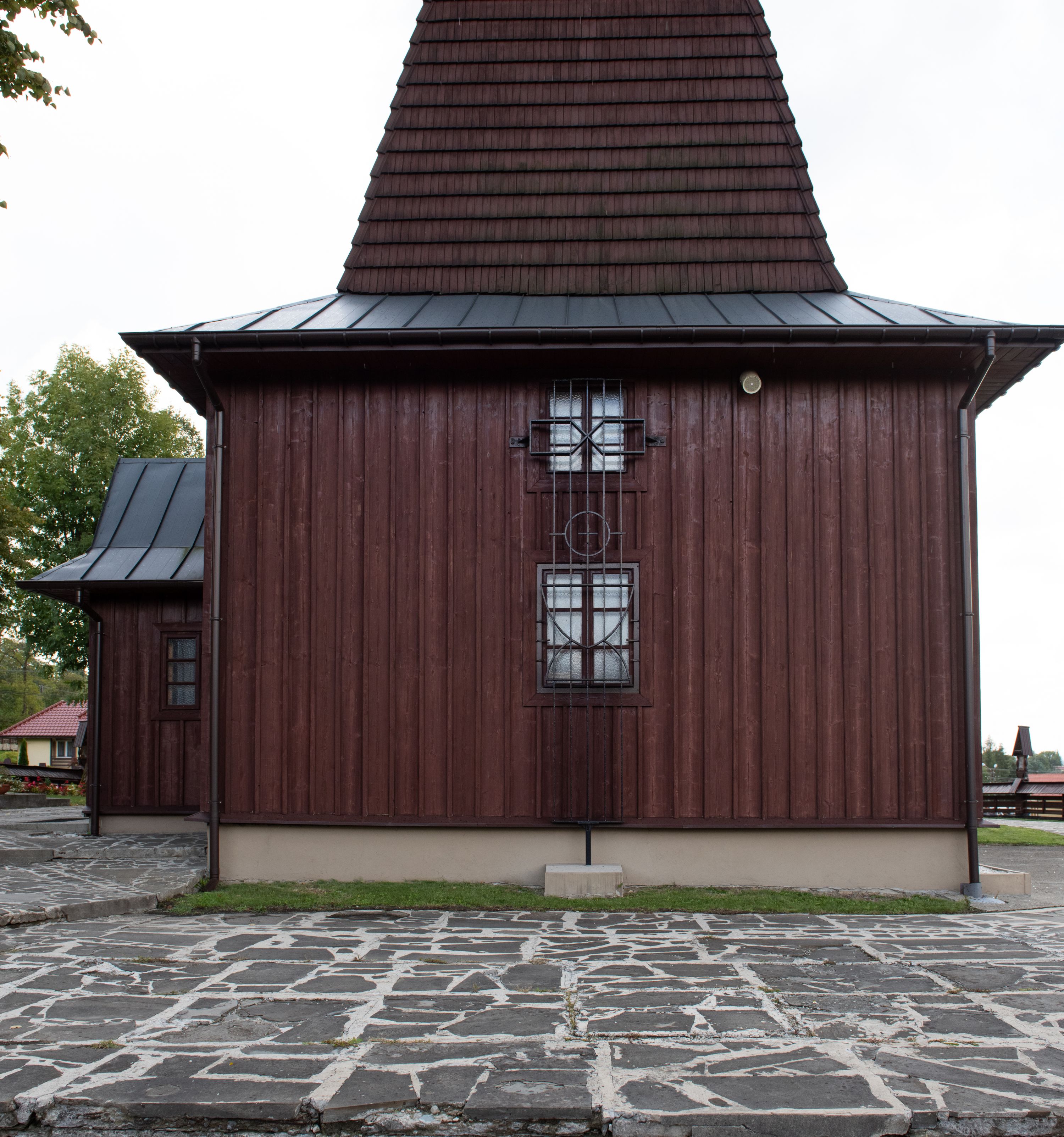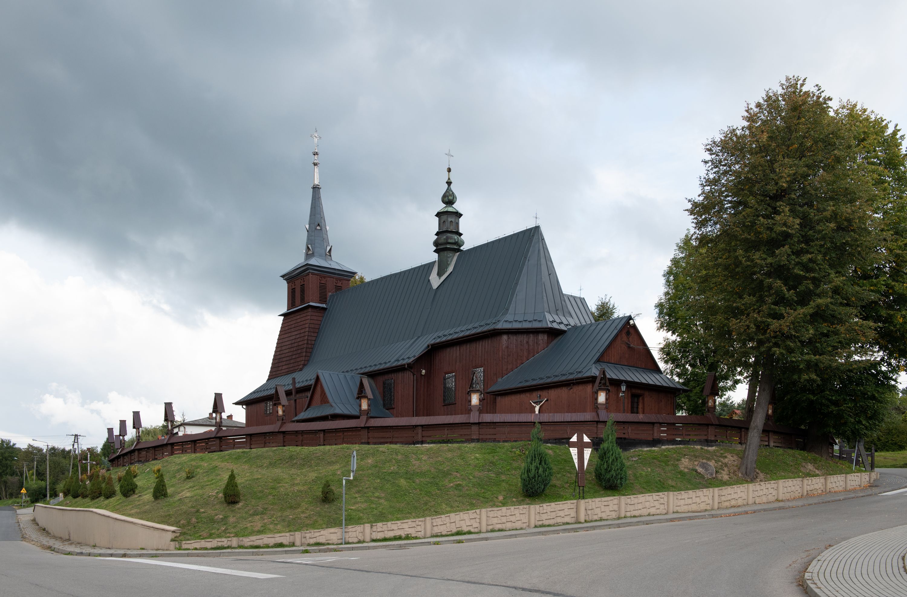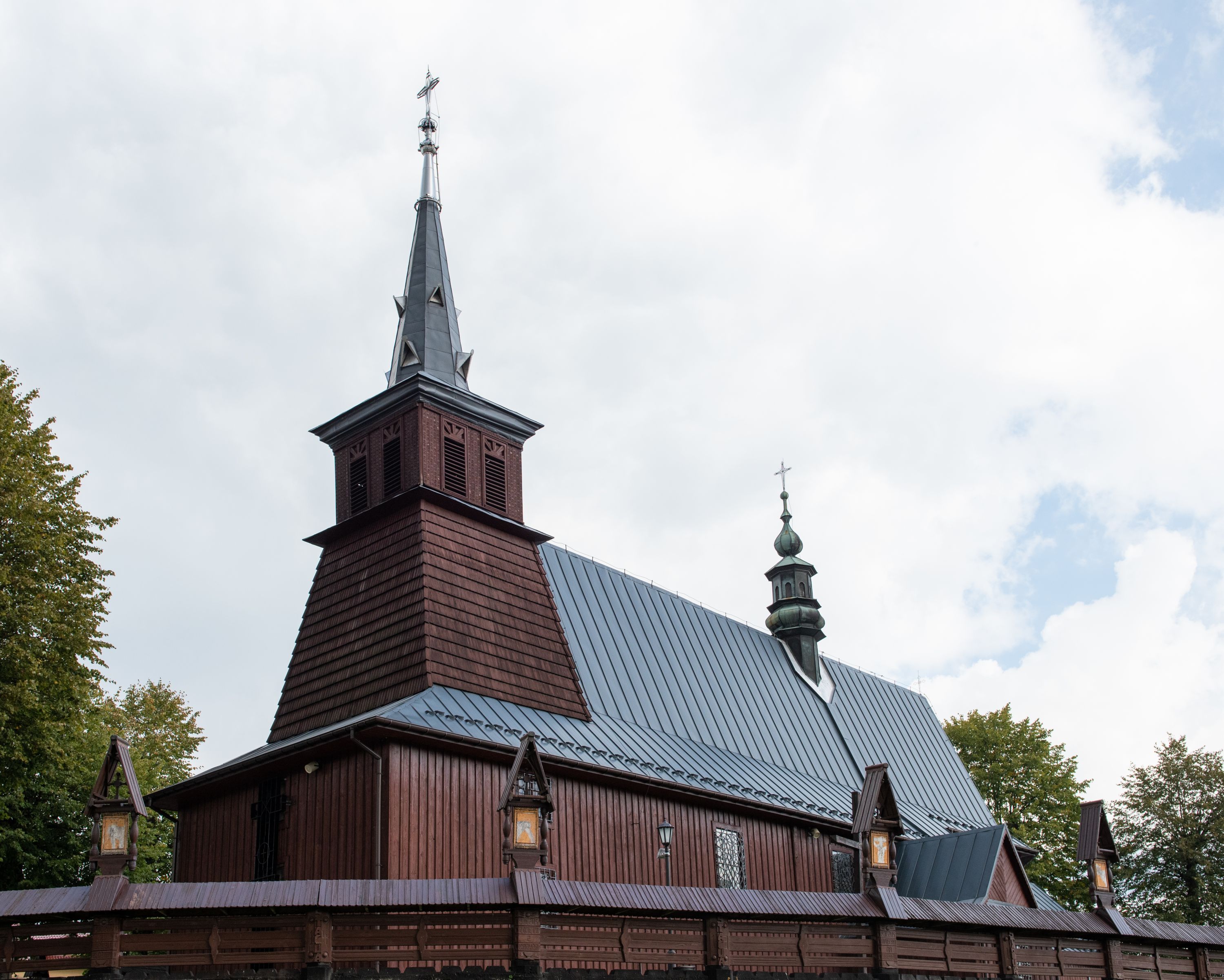 Kościół odbudowany w latach 1981-1985, utracił pierwotny wygląd szesnastowiecznej architektury, jedynie w partii wieży zachowała się części oryginalne. Wieża nawiązuje do dawnego typu wykształconego jeszcze w XVII wieku na terenie Małopolski, czyli dzwonnicy dwukondygnacyjnej o ścianach pochyłych w kondygnacji dolnej, a pionowych w górnej, oddzielonych uskokiem. Forma wieży „izbicowej”, czyli z dodatkowym piętrem na dzwony, była niezwykle trwała w XVIII wieku. Wieże takie dobudowano do kościołów w Rabce, Krzeczowie (gm. Lubień), Skomielnej Białej, Zambrzycach, Ostrowsku, Łodygowicach i wolnostojące w Tomaszowie, Jordanowie, Łapczycy, Prandocinie i Porębie Spytkowskiej.