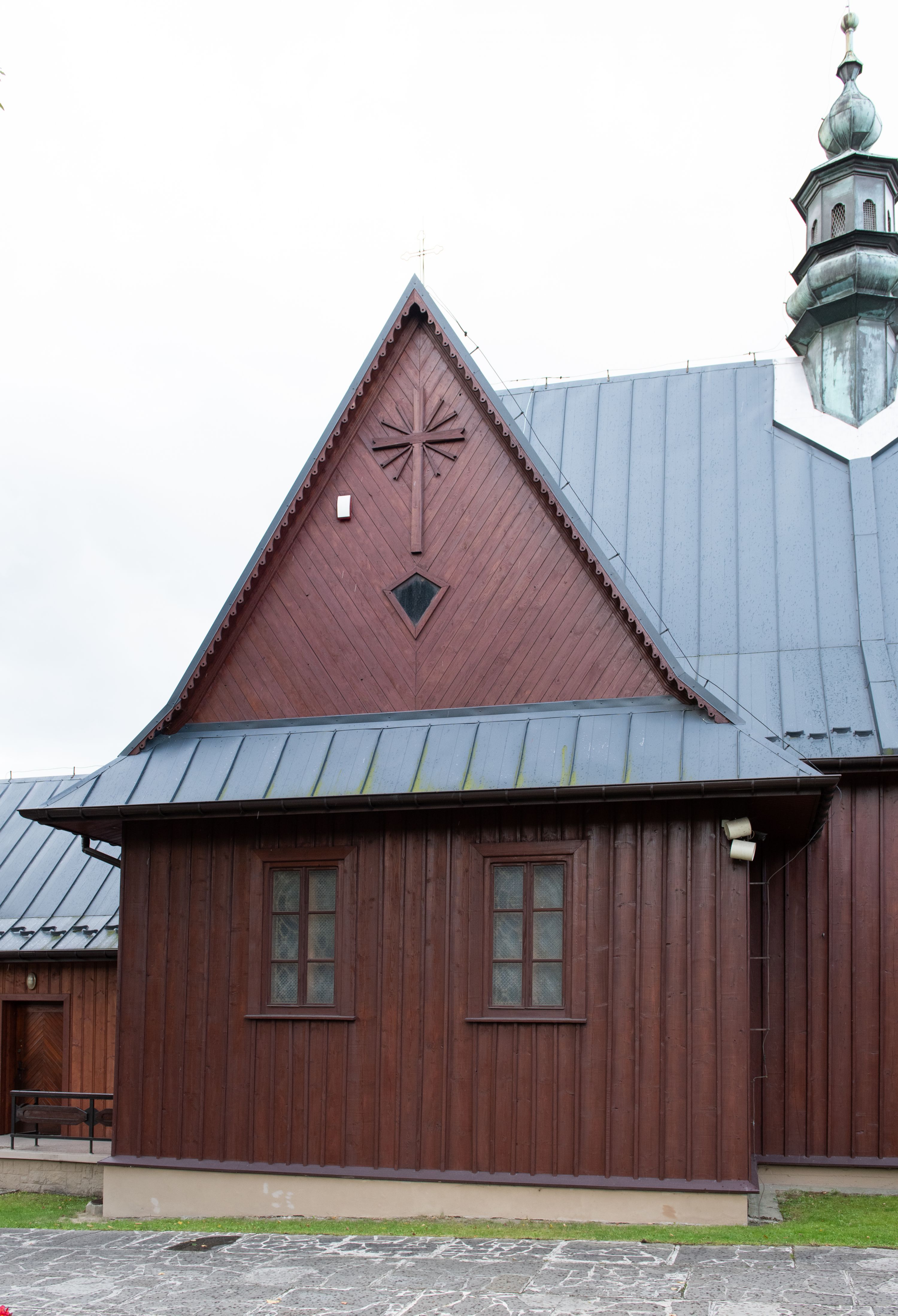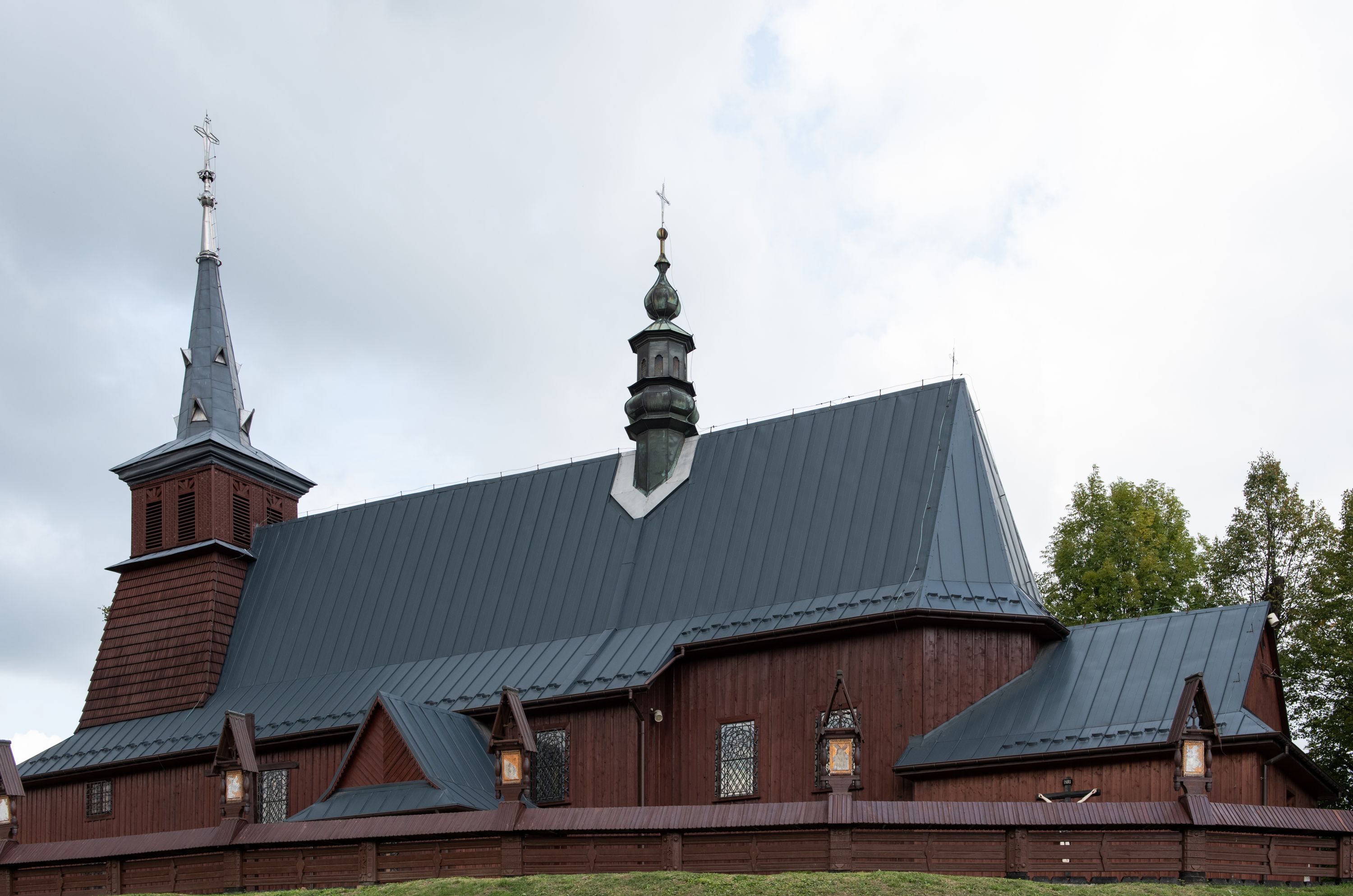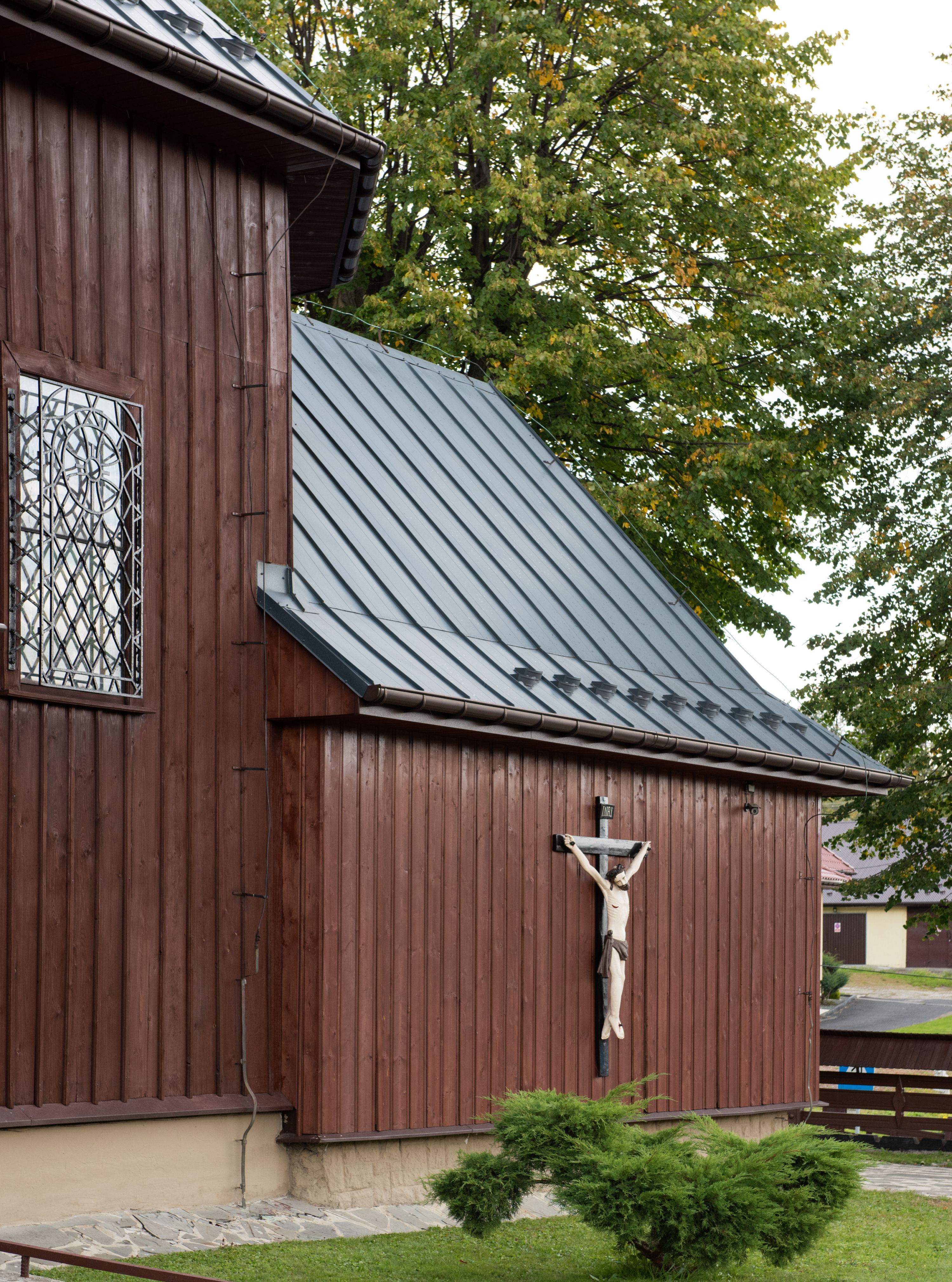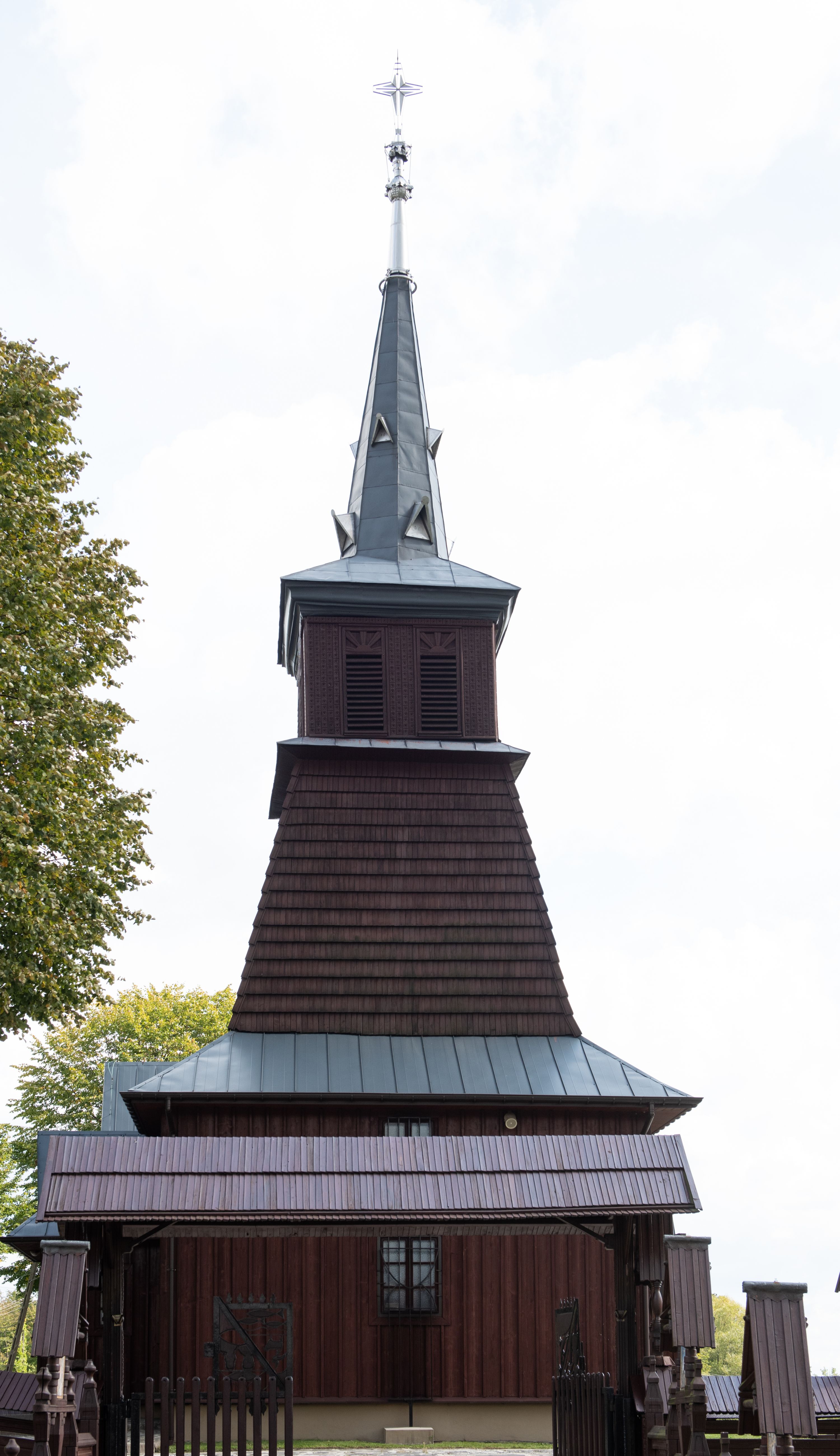 Kościół jest orientowany, drewniany o konstrukcji zrębowej z wieżą na słup, jednonawowy z krótszym prezbiterium zamkniętym trójbocznie. Przy prezbiterium od wschodu nowsza zakrystia murowana, od północy kaplica i składzik, przy nawie od południa kruchta. Wnętrze nakryte pułapem, w nawie z zaskrzynieniami. Ściana arkady tęczowej o wykroju prostokątnym ze ściętymi narożami. Do kościoła prowadzi główne wejście w wieży od strony północnej. Wnętrze świątyni oświetlają prostokątne okna od strony południowej. Dach o jednej kalenicy, kryty blachą, na środku drewniana sygnaturka, nakryta kopułką z latarnią. Od zachodu wieża w dolnej kondygnacji na planie prostokąta, ujęta po bokach daszkami; druga kondygnacja o ścianach pochyłych, pokryta gontem; trzecia kondygnacja prześwietlona prostokątnymi otworami okiennymi; wieża zakończona iglicą. Ściany na zewnątrz pokryte szalunkiem pionowym.