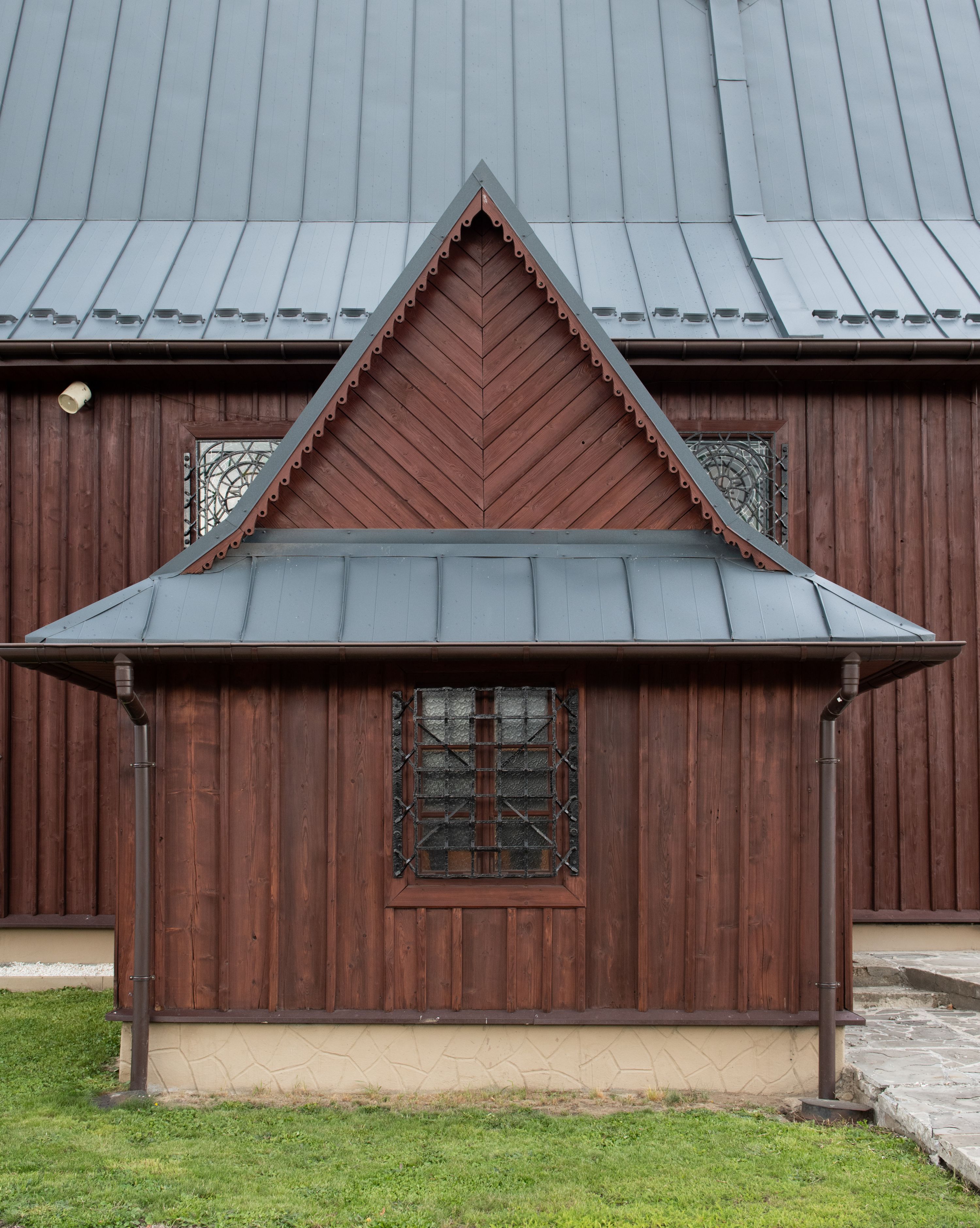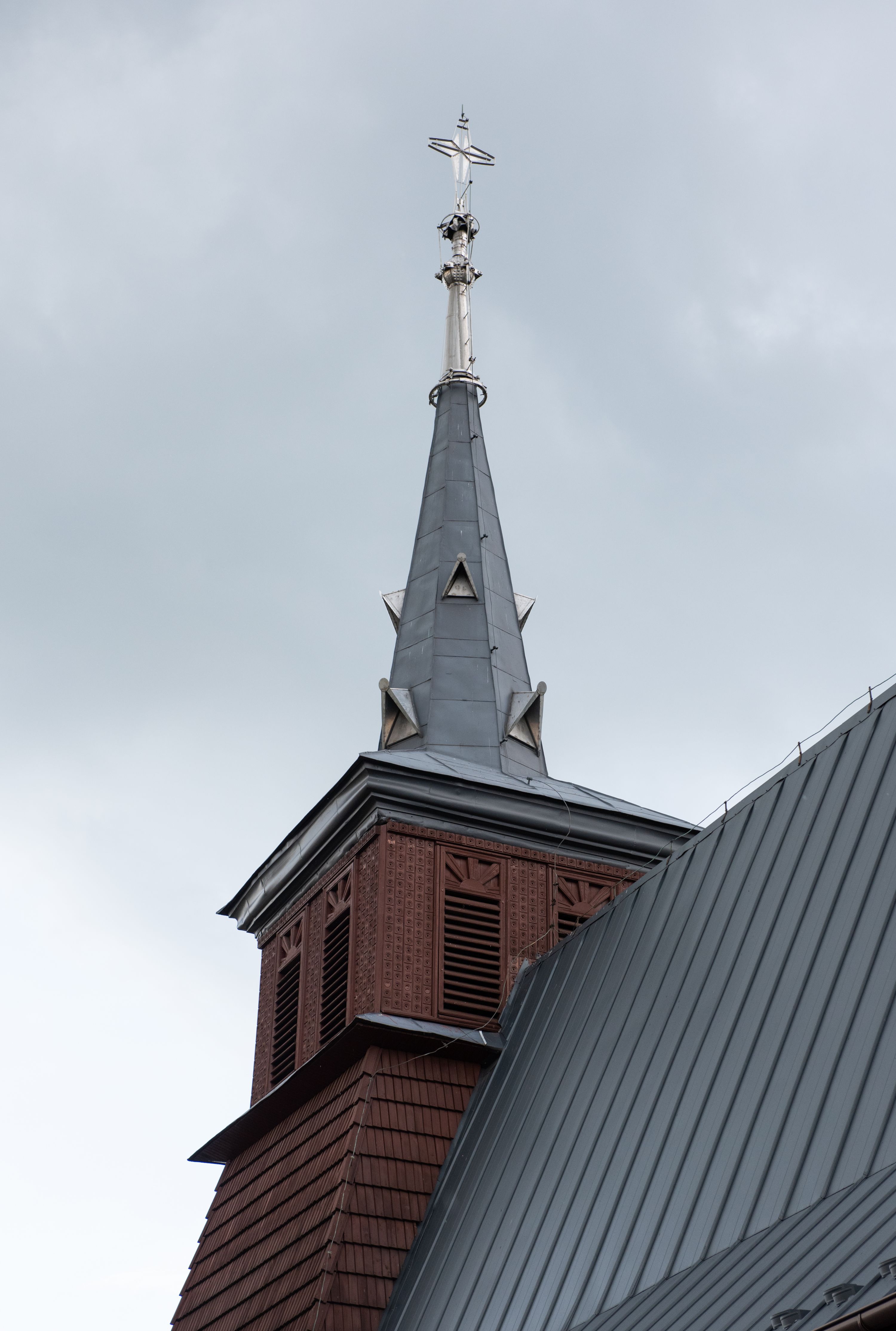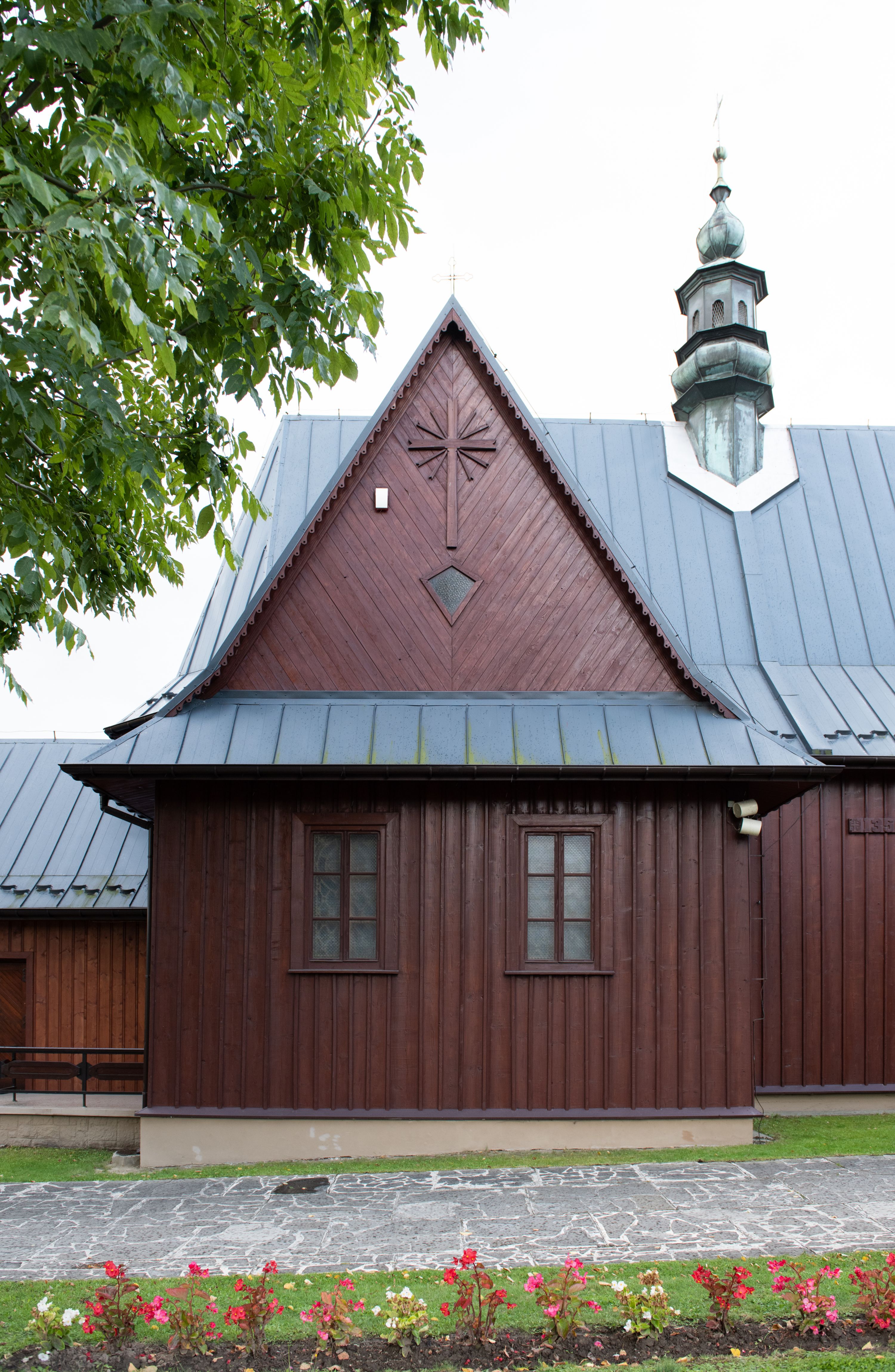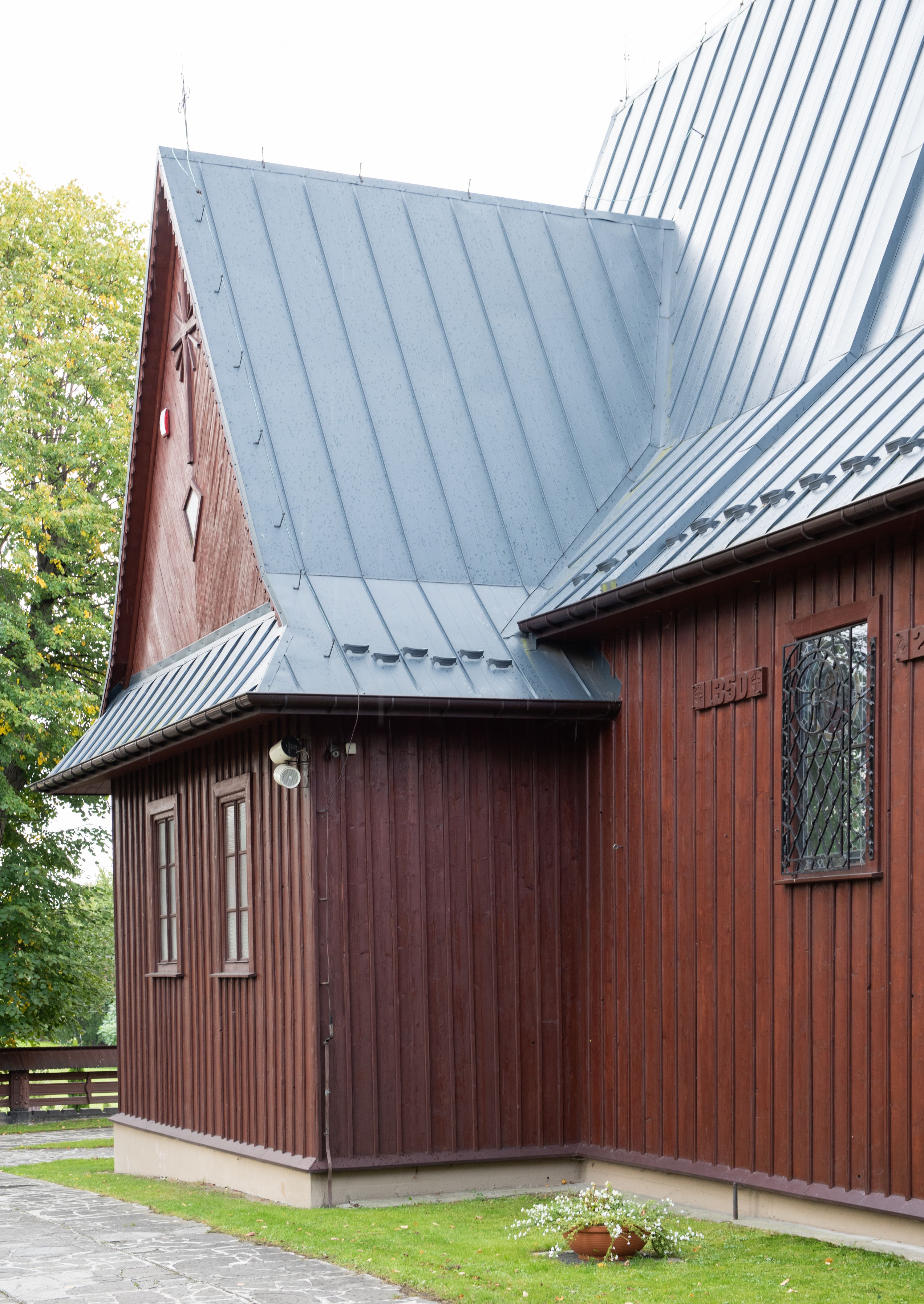 Kościół jest orientowany, drewniany o konstrukcji zrębowej z wieżą na słup, jednonawowy z krótszym prezbiterium zamkniętym trójbocznie. Przy prezbiterium od wschodu nowsza zakrystia murowana, od północy kaplica i składzik, przy nawie od południa kruchta. Wnętrze nakryte pułapem, w nawie z zaskrzynieniami. Ściana arkady tęczowej o wykroju prostokątnym ze ściętymi narożami. Do kościoła prowadzi główne wejście w wieży od strony północnej. Wnętrze świątyni oświetlają prostokątne okna od strony południowej. Dach o jednej kalenicy, kryty blachą, na środku drewniana sygnaturka, nakryta kopułką z latarnią. Od zachodu wieża w dolnej kondygnacji na planie prostokąta, ujęta po bokach daszkami; druga kondygnacja o ścianach pochyłych, pokryta gontem; trzecia kondygnacja prześwietlona prostokątnymi otworami okiennymi; wieża zakończona iglicą. Ściany na zewnątrz pokryte szalunkiem pionowym.