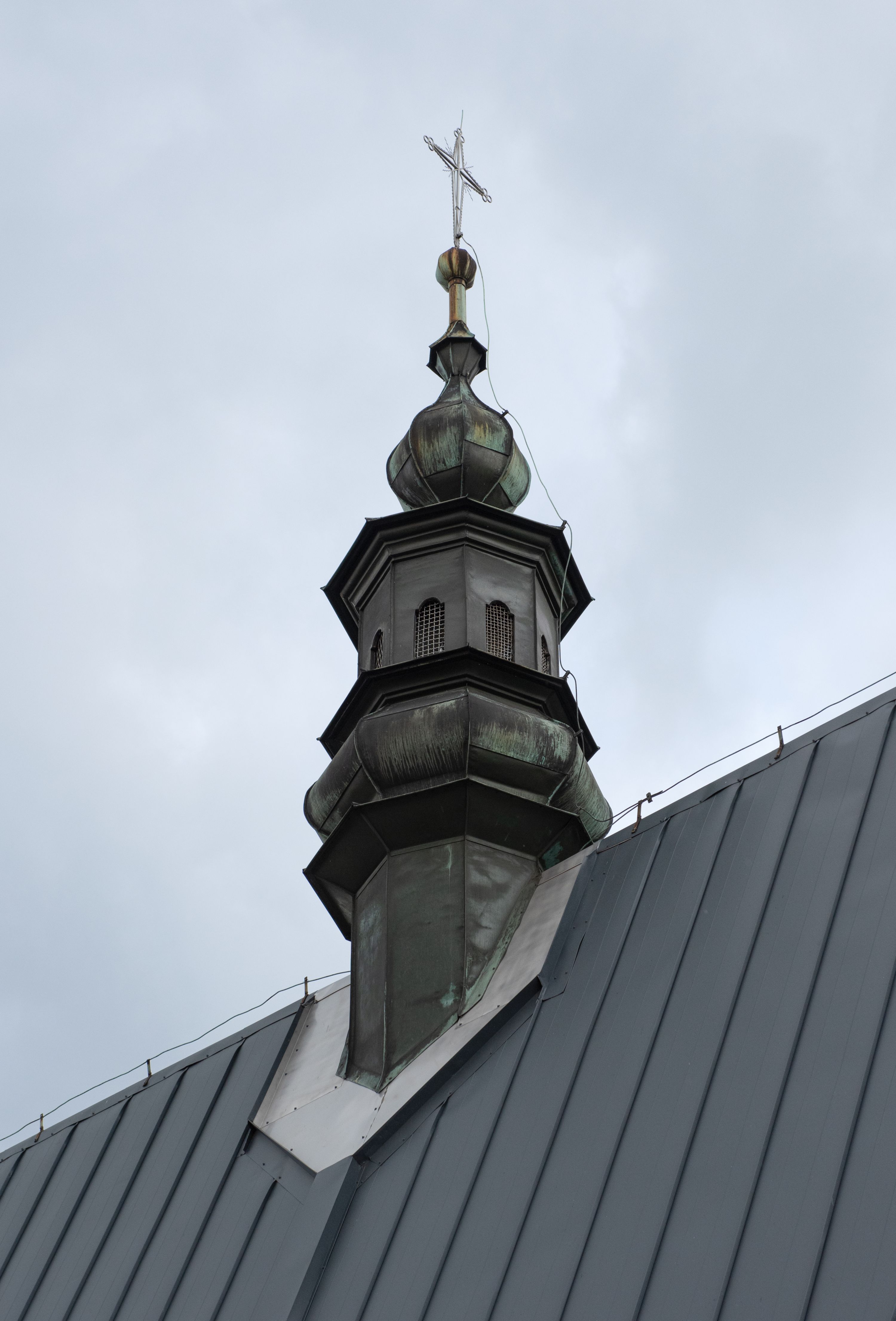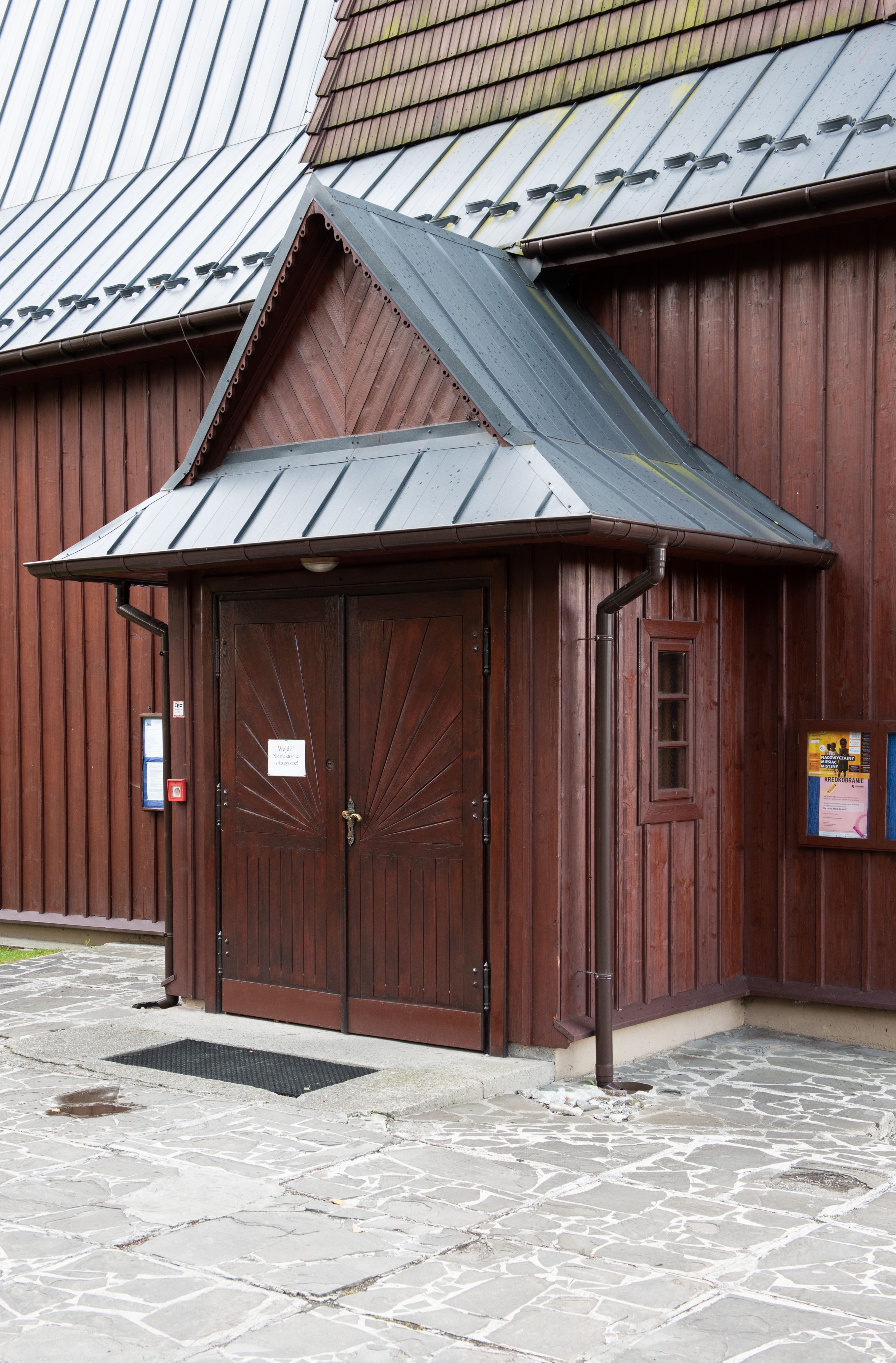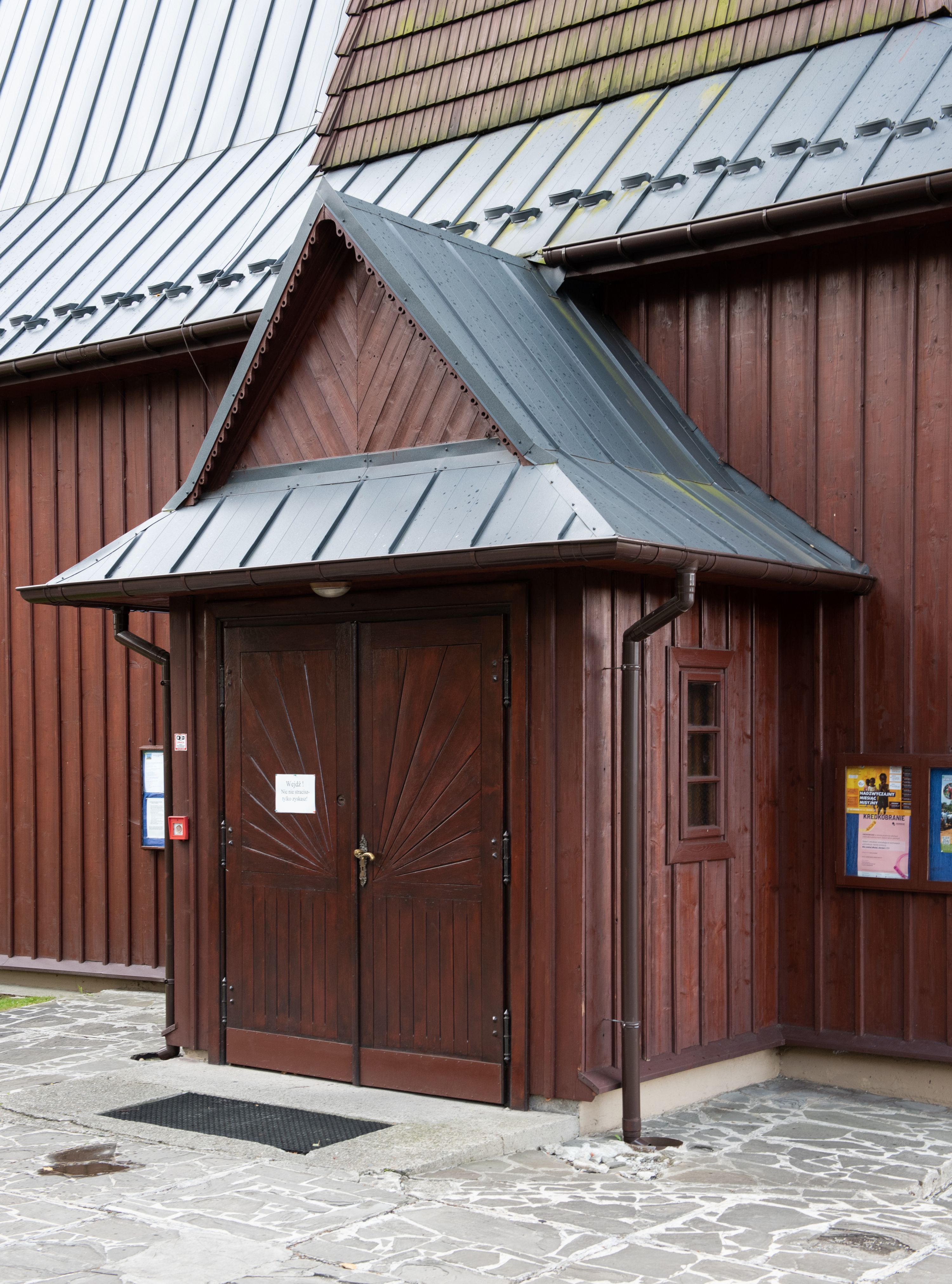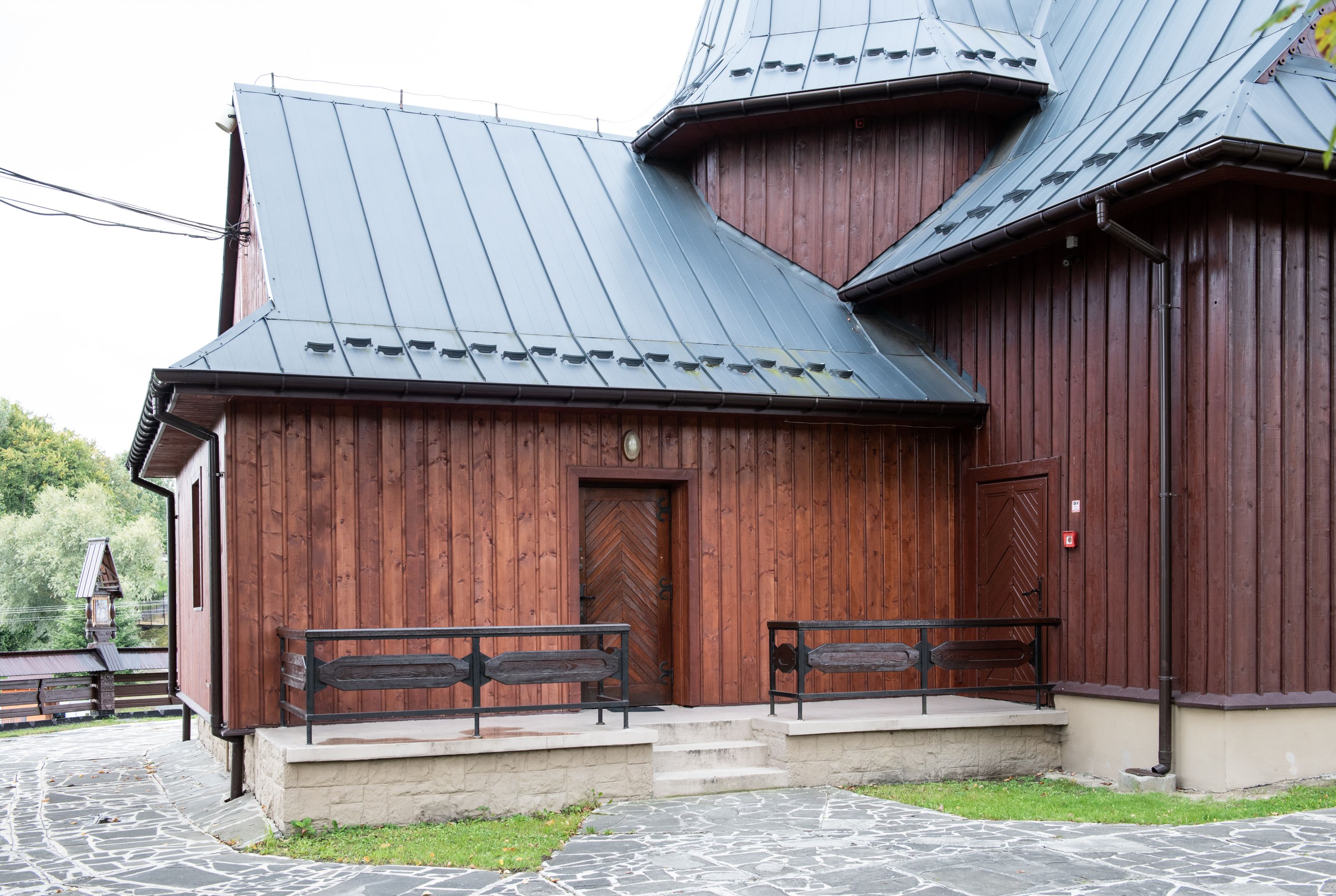 Kościół jest orientowany, drewniany o konstrukcji zrębowej z wieżą na słup, jednonawowy z krótszym prezbiterium zamkniętym trójbocznie. Przy prezbiterium od wschodu nowsza zakrystia murowana, od północy kaplica i składzik, przy nawie od południa kruchta. Wnętrze nakryte pułapem, w nawie z zaskrzynieniami. Ściana arkady tęczowej o wykroju prostokątnym ze ściętymi narożami. Do kościoła prowadzi główne wejście w wieży od strony północnej. Wnętrze świątyni oświetlają prostokątne okna od strony południowej. Dach o jednej kalenicy, kryty blachą, na środku drewniana sygnaturka, nakryta kopułką z latarnią. Od zachodu wieża w dolnej kondygnacji na planie prostokąta, ujęta po bokach daszkami; druga kondygnacja o ścianach pochyłych, pokryta gontem; trzecia kondygnacja prześwietlona prostokątnymi otworami okiennymi; wieża zakończona iglicą. Ściany na zewnątrz pokryte szalunkiem pionowym.