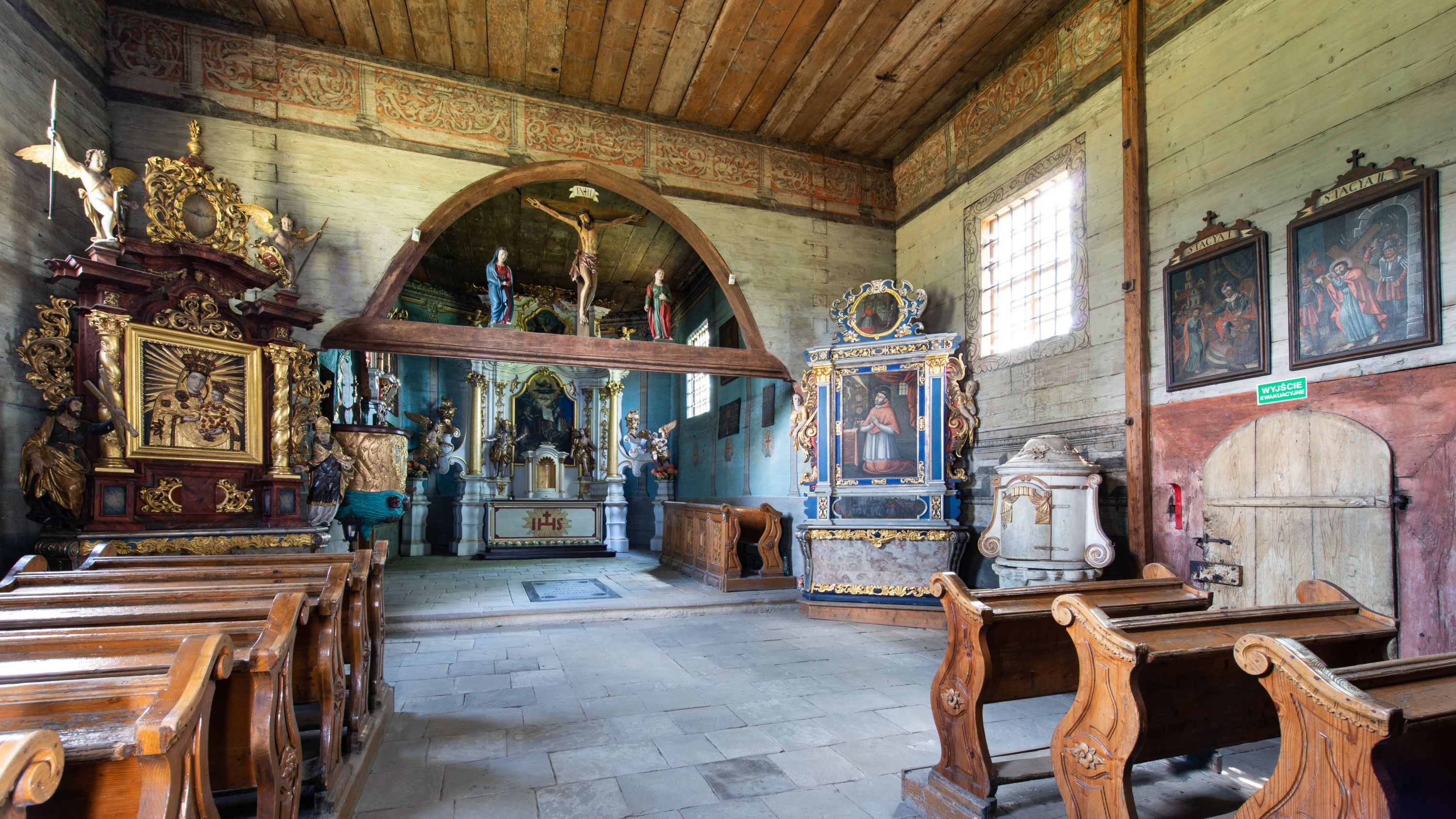 Kościół jest usytuowany ustronnie na stoku wzniesienia, otoczony starodrzewiem i parkanem, ujmującym stary cmentarz z nielicznymi mogiłami i nagrobkami. Orientowaną świątynię w całości wzniesiono z drewna. Zastosowano konstrukcję zrębową na murowanej podwalinie z murowaną kryptą pod prezbiterium. Nawa kościoła jest prawie kwadratowa. Od wchodu przylega do niej węższe prezbiterium zamknięte trójbocznie. Przy jego północnej ścianie wzniesiono bezokienną zakrystię z wejściem od strony wschodniej. Od zachodu z nawą łączy się wieża na rzucie kwadratu wzniesiona na tzw. słup. Ma pochyłe ściany, szalowane w dolnej części deskami, a w górnej podbite gontem. Wieża zakończona jest nadwieszoną izbicą, zwieńczoną ostrosłupowym hełmem gontowym. W połowie wysokości wieżę opasa pulpitowy daszek gontowy łączący się po bokach z dachem nawy. Pod wieżą urządzono obszerną kruchtę. Wysokie i spadziste dachy kościoła pokryte są gontem. Więźba ma konstrukcję storczykową. Ponad wschodnim szczytem nawy usytuowano nadwieszoną wieżyczkę na sygnaturkę o kształcie cebulastym z latarnią zwieńczoną krzyżem. Całość bryły kościoła (z wyjątkiem wieży) obiegają otwarte soboty, w które przed zakrystią od wschodu wbudowano nowy przedsionek. W nawie od południa znajduje się profilowany portal z nadprożem wykrojonym w ośli grzbiet. Umieszczone w nim drzwi zostały zaopatrzone w stare okucia i antabę. Wnętrze nawy i prezbiterium nakryto płaskimi stropami z pozostałościami późnorenesansowych malowideł z motywem kasetonów z rozetami. Łuk tęczowy jest ostry. Spływa na profilowaną belkę, która jest wsparta na kroksztynach. Na belce tęczowej został ustawiony krucyfiks oraz figury Matki Boskiej i św. Jana Apostoła. Chór muzyczny z dekorowanym malarsko parapetem został wsparty na dwóch słupach. W świątyni znajduje się rokokowy ołtarz główny z obrazem ze sceną Zwiastowania NMP. Dwa ołtarze boczne ustawione zostały przy łuku tęczowym. Prawy ołtarz boczny św. Karola Boromeusza pochodzi z drugiej połowy XVII wieku. Na to miejsce trafił on w połowie XX wieku z kaplicy pałacu w Osieku. Lewy ołtarz boczny jest późnobarokowy z około 1700 roku. W jego centrum umieszczono obraz Matki Boskiej Piekarskiej. Na północnej ścianie nad wejściem do zakrystii zawieszono epitafium Mikołaja i Beaty z Mirowa Porębskich z 1611 roku. Wcześniej epitafium pełniło rolę retabulum w miejscu stojącego dziś ołtarza św. Karola Boromeusza. W prezbiterium przy łuku tęczowym zawieszono rokokową ambonę w kształcie łodzi, na którą wejście prowadzi z zakrystii. Przy wejściu do nawy znajduje się kamienna chrzcielnica z początku XVI wieku, ozdobiona herbem Fogelweder, z drewnianą, późnobarokową nakrywą. W zakrystii zachował się także rokokowy drewniany lawetarz z drugiej połowy XVIII wieku.