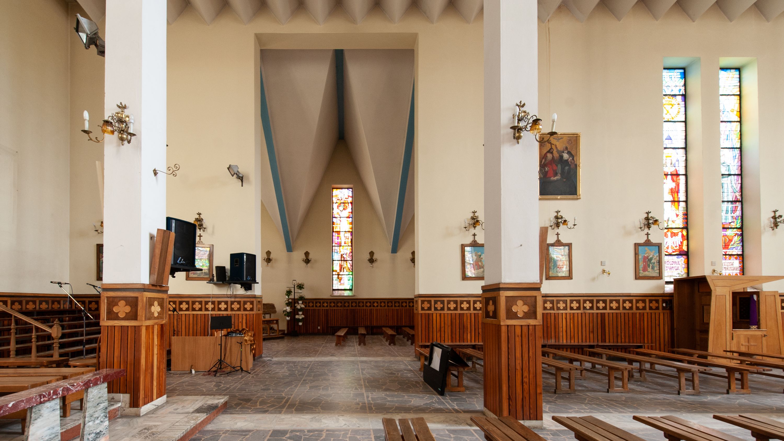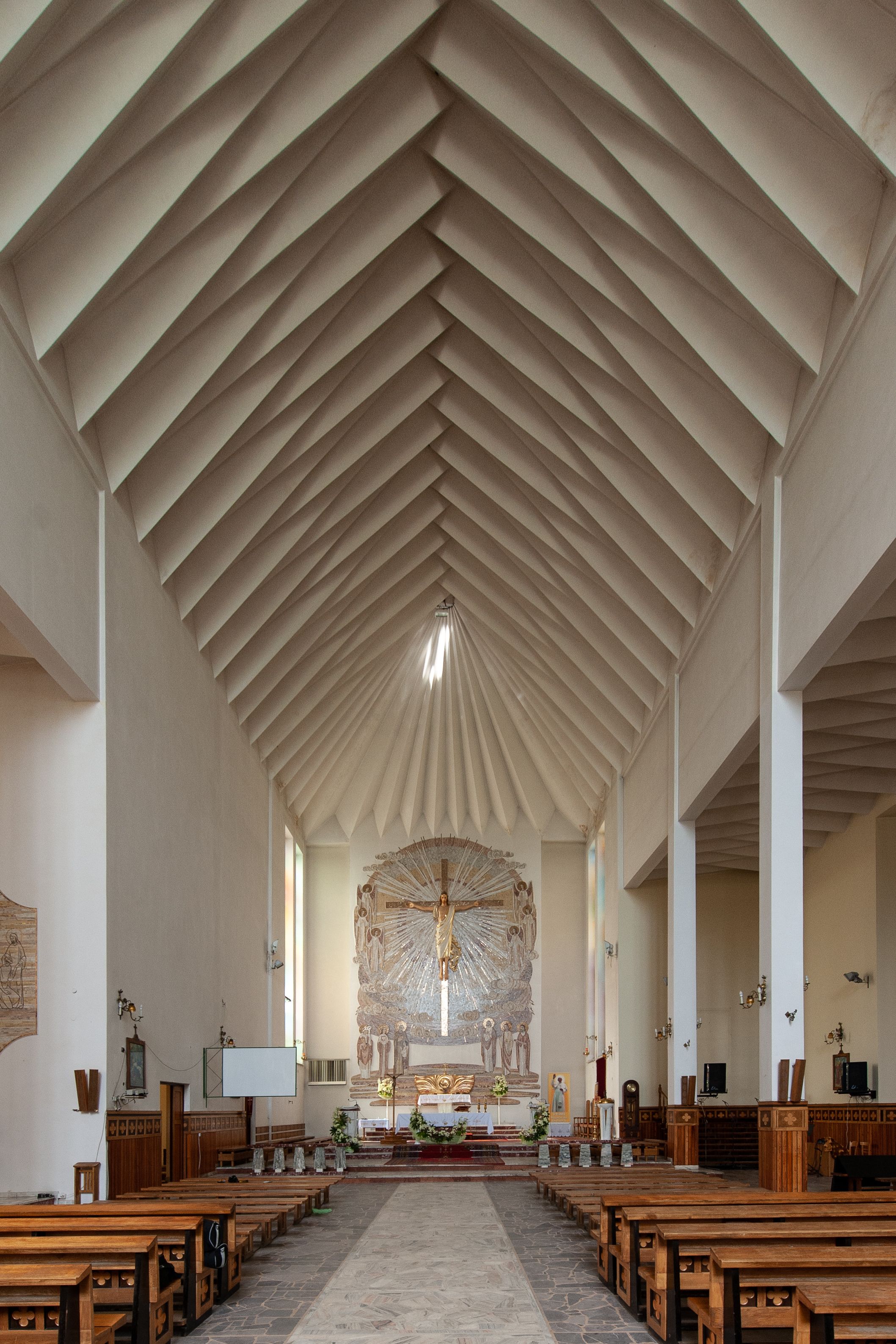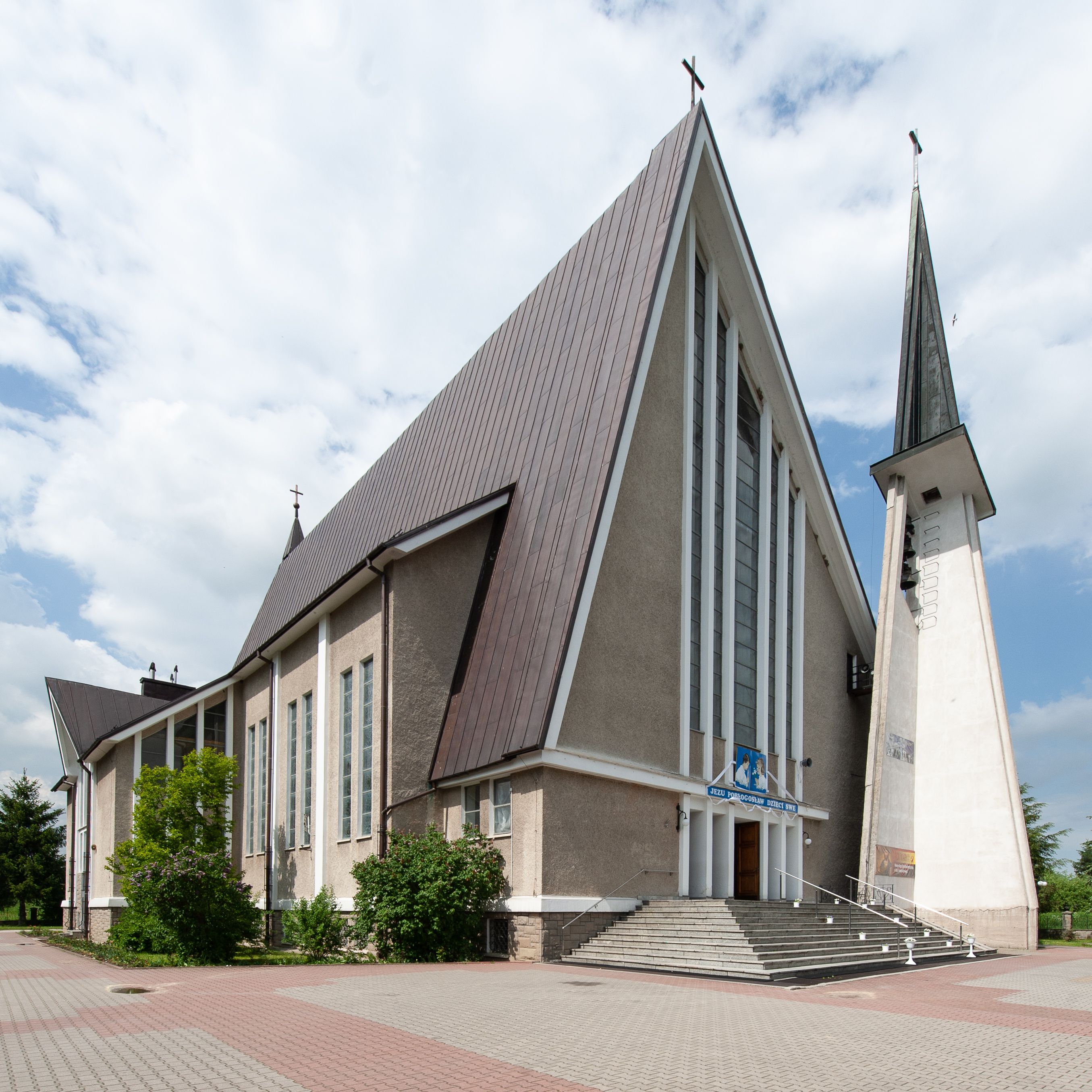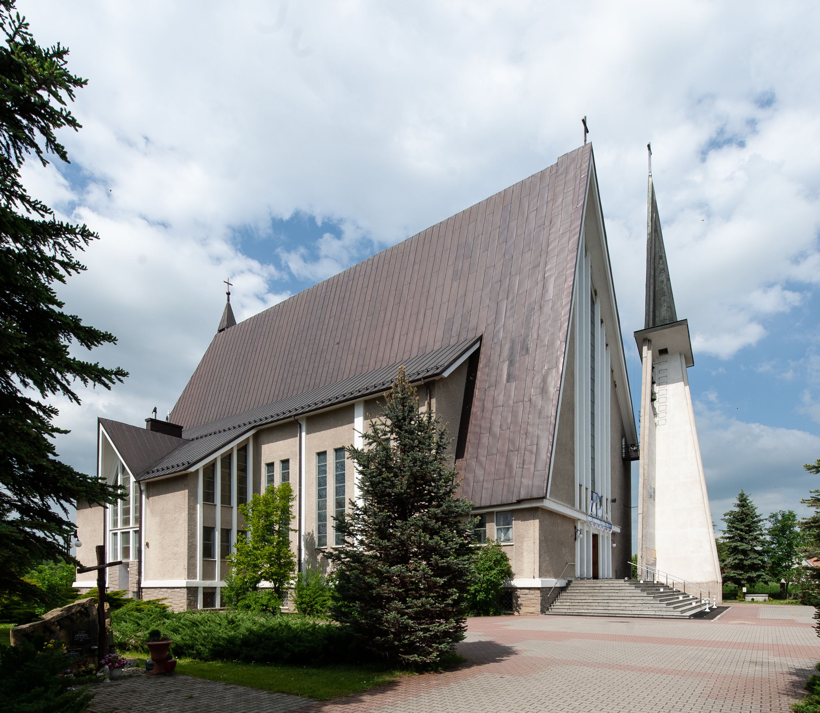 Świątynia trójnawowa, ośmioprzęsłowa o konstrukcji żelbetowej, tynkowana. Prezbiterium zamknięte prostą ścianą, umieszczone na kilkustopniowym podwyższeniu. Prostokątna zakrystia od strony wschodniej oraz prostokątna kaplica od strony zachodniej. Nawy, z których środkowa wyższa i szersza od bocznych wydzielone smukłymi filarami na rzucie prostokąta. Nakryte ekspresyjnym, żelbetowym stropem o rzeźbiarskiej formie. Chór muzyczny od strony południowej o konstrukcji żelbetowej z prostym parapetem zamkniętym od góry drewnianą poręczą. Fasada dwukondygnacyjna z umieszczonym w przyziemiu pięcioosiowym wejściem w formie prostokątnych otworów drzwiowych dostępnych wysokimi schodami. Otwory drzwiowe wydzielone żelbetowymi lizenami, podziały kontynuowane także w drugiej kondygnacji, gdzie w miejsce otworów drzwiowych wysokie, prostokątne okna. Elewacja zamknięta ścianą szczytową w kształcie trójkąta o nierównych bokach i zwieńczona prostym krzyżem. Od zachodu do elewacji dostawiona wieża dzwonna na rzucie trójkąta zwężającego się ku górze i nakryta strzelistym, ostrosłupowym hełmem zwieńczonym krzyżem. Elewacje boczne ośmioosiowe, artykułowane lizenami. W czterech pierwszych osiach od południa i na szerokości prezbiterium po dwa wysokie i prostokątne okna, w pozostałych pojedyncze okna i trójkątne szczyty. Od wschodu dach kryty blachą, dwuspadowy o nierównych połaciach; nad nawą boczną od strony wschodniej jednopołaciowy. Niewielka wieżyczka na sygnaturkę na kalenicy dachu od strony północnej.