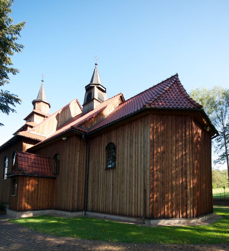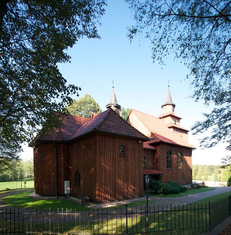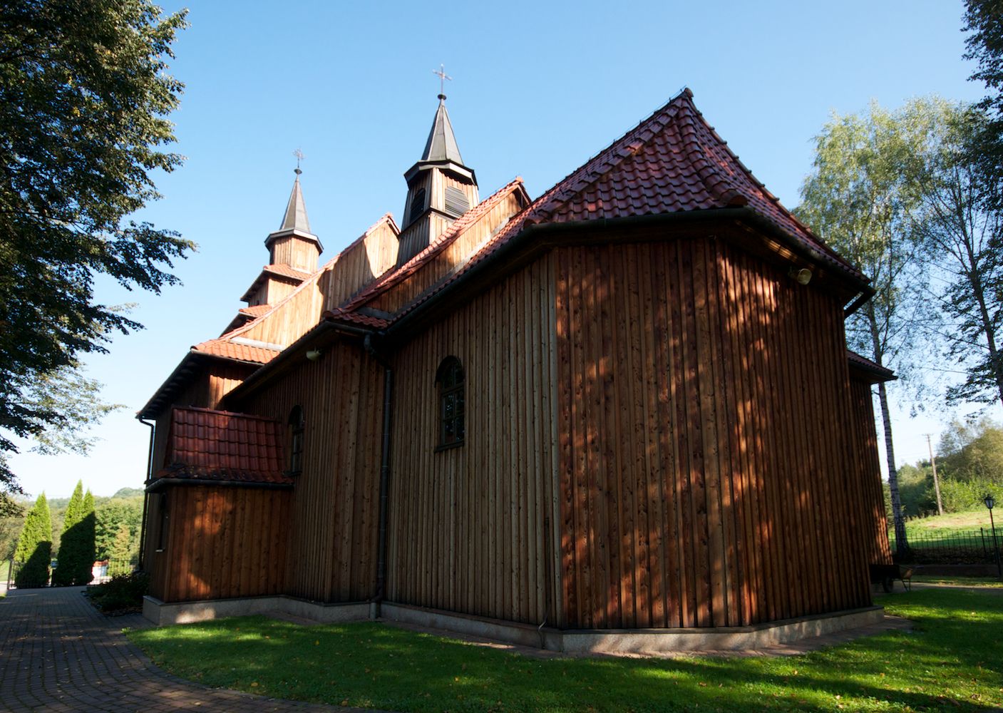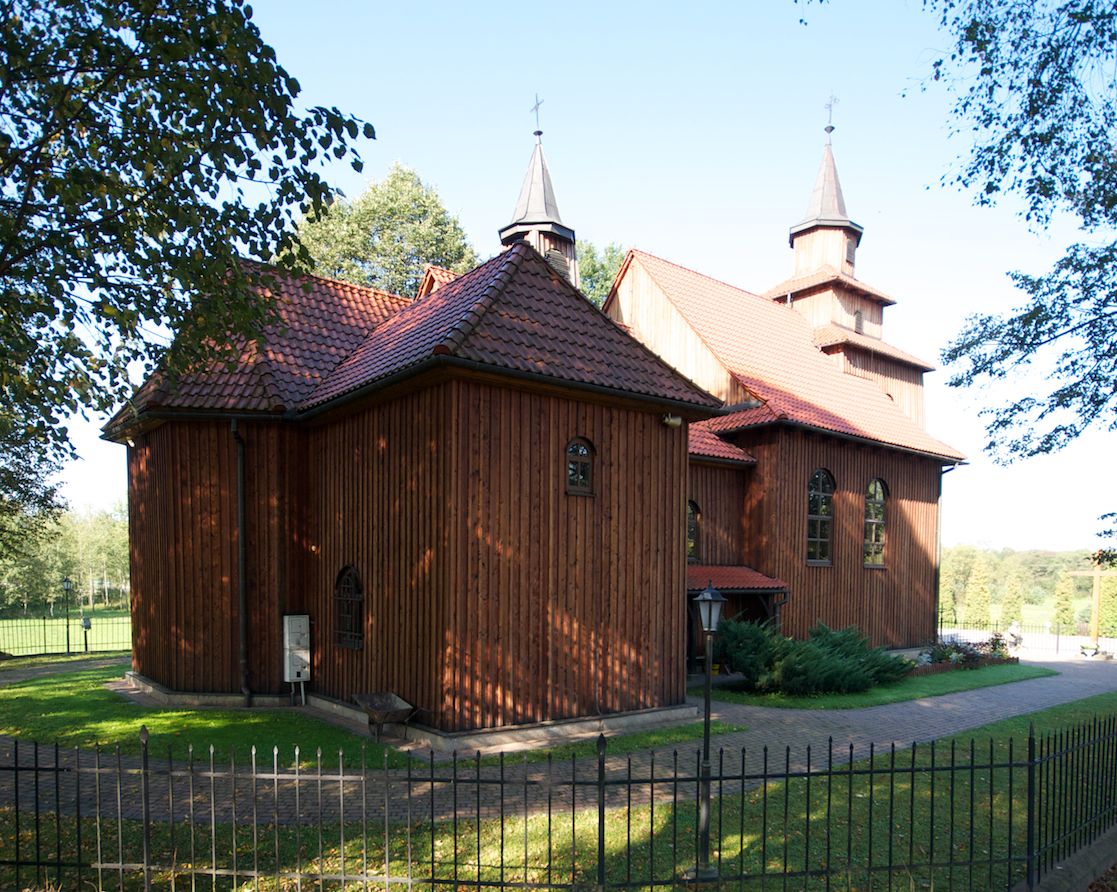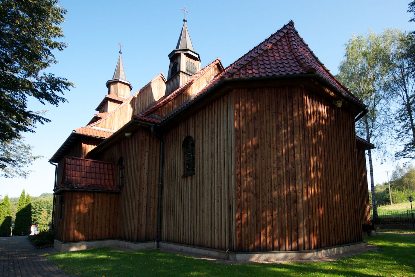 Bryła kościoła nawiązuje do rozwiązań barokowych stosowanych w sakralnym budownictwie drewnianym w XVII i XVIII wieku. Jej dominantę stanowi masywna wieża o nieznacznie tylko zwężających się ścianach. Natomiast korpus złożony jest z pojedynczych pomieszczeń różnej wielkości i wysokości, a poszczególne jego części nakryte są dachami o odrębnych kalenicach. Zgodnie z osiemnastowieczną tendencją ściany zewnętrzne oszalowano, na dachu wzniesiono wieżyczkę na sygnaturkę, a pomieszczenia przepruto oknami po obu stronach.