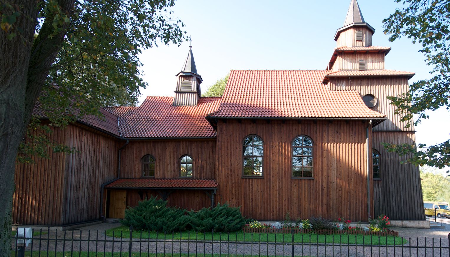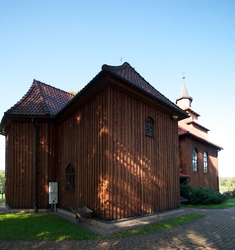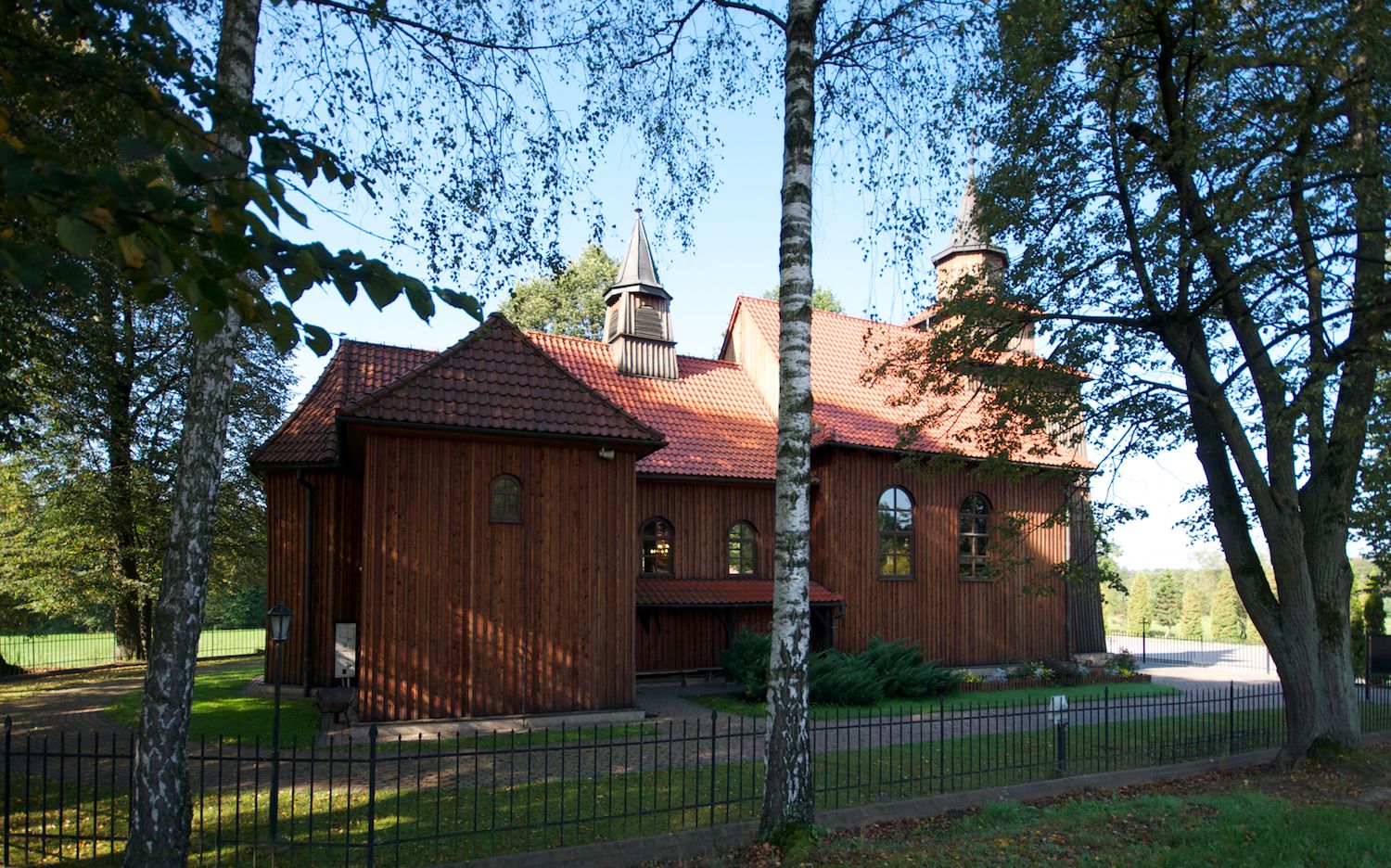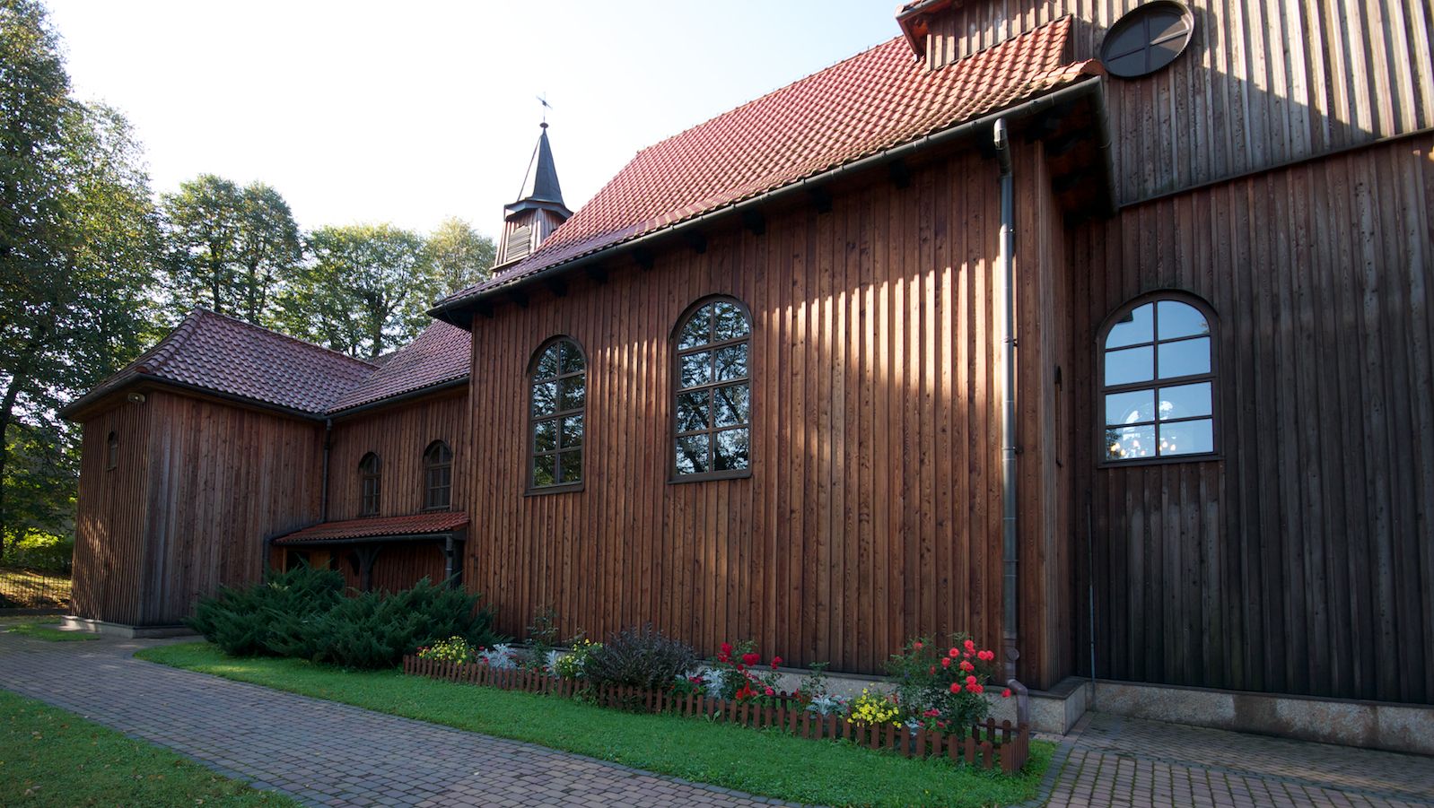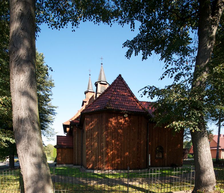 Bryła kościoła nawiązuje do rozwiązań barokowych stosowanych w sakralnym budownictwie drewnianym w XVII i XVIII wieku. Jej dominantę stanowi masywna wieża o nieznacznie tylko zwężających się ścianach. Natomiast korpus złożony jest z pojedynczych pomieszczeń różnej wielkości i wysokości, a poszczególne jego części nakryte są dachami o odrębnych kalenicach. Zgodnie z osiemnastowieczną tendencją ściany zewnętrzne oszalowano, na dachu wzniesiono wieżyczkę na sygnaturkę, a pomieszczenia przepruto oknami po obu stronach.