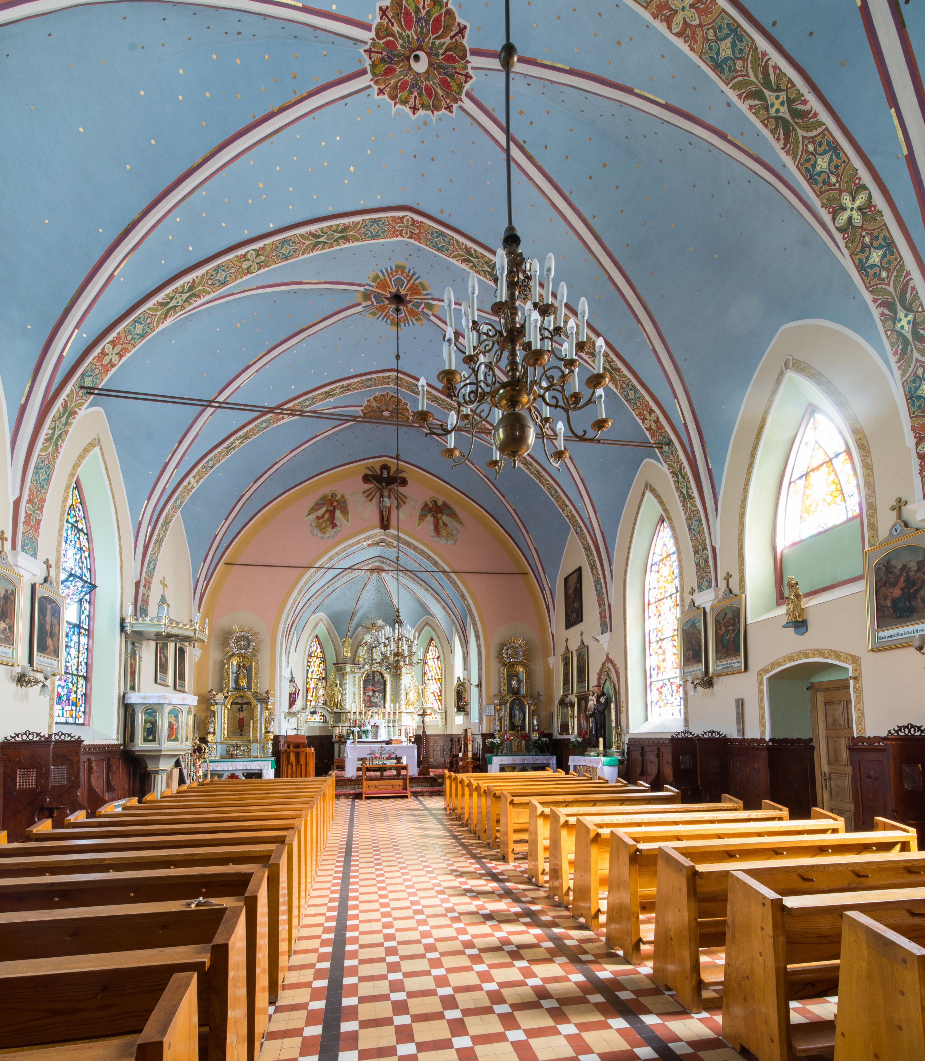 Kościół jest orientowany, murowany, otynkowany, jednonawowy z czworoboczną wieżą w fasadzie z prezbiterium zamkniętym trójbocznie. Dwuprzęsłowe prezbiterium oddziela od nawy szeroka ściana arkady tęczowej, zamknięte ostrołukowo. Nawa jest szersza i dłuższa, pięcioprzęsłowa. Wnętrze artykułowane jest dużymi i szerokimi oknami w kształcie stojących prostokątów, zamkniętych ostrołukowo, wypełnionych witrażami. Od południa do nawy przylega niewielka kruchta, a do prezbiterium od północy zakrystia. Na zachodniej ścianie nawy chór muzyczny wsparty na dwóch filarach, dostępny schodami od południowej strony nawy. Do kościoła prowadzi główne wejście od strony zachodniej oraz dwa mniejsze od strony południowej przez kruchtę i od strony północnej przez zakrystię.