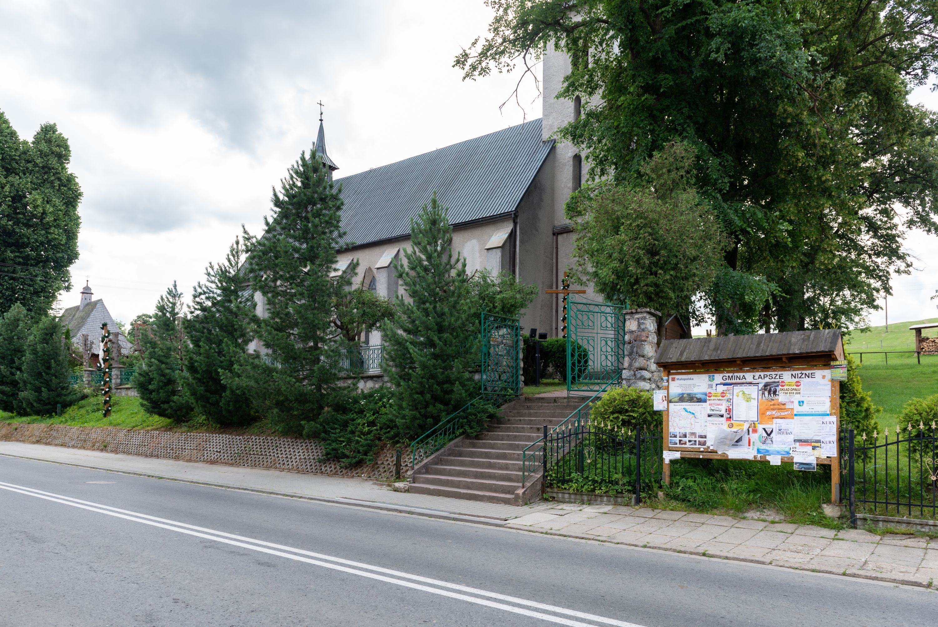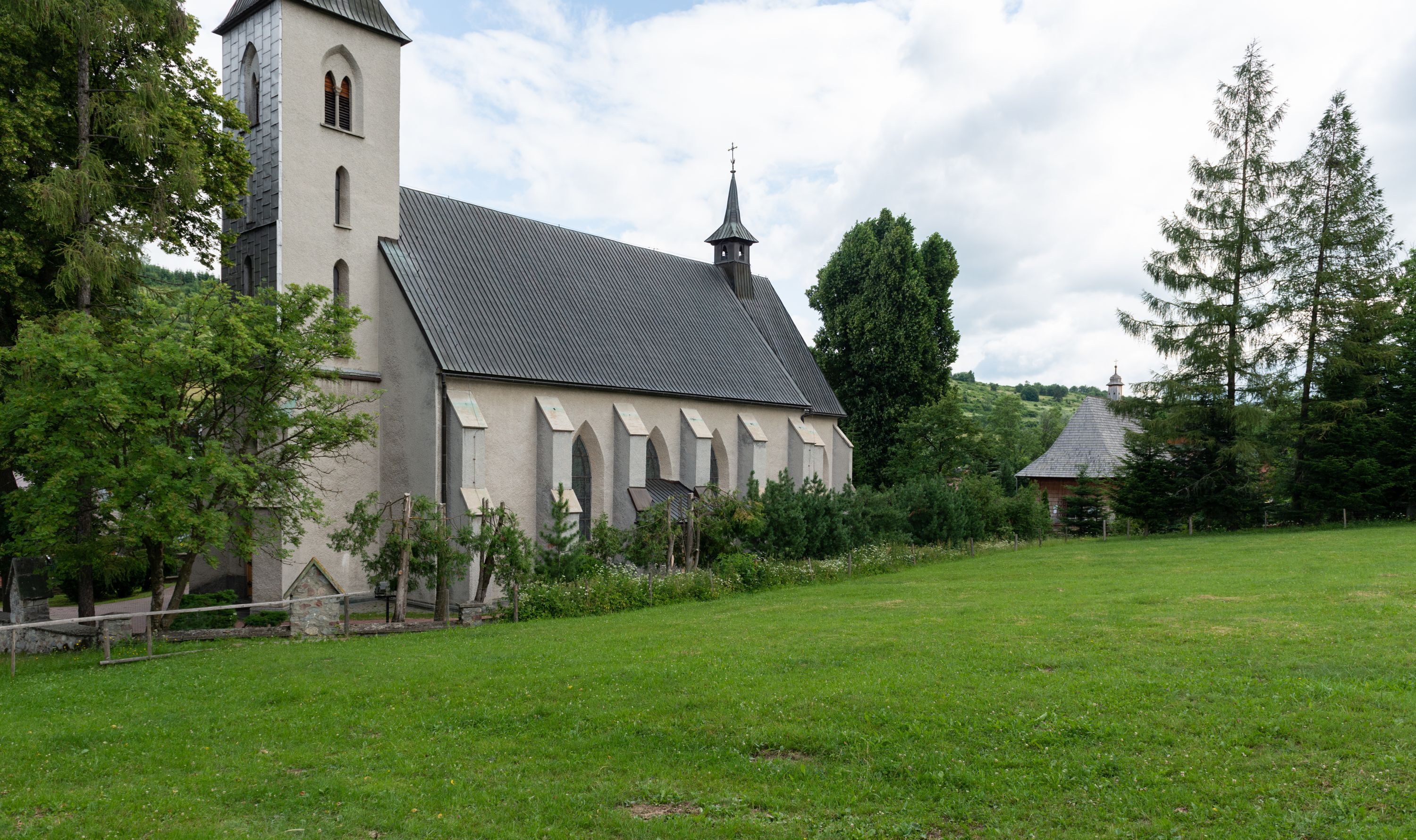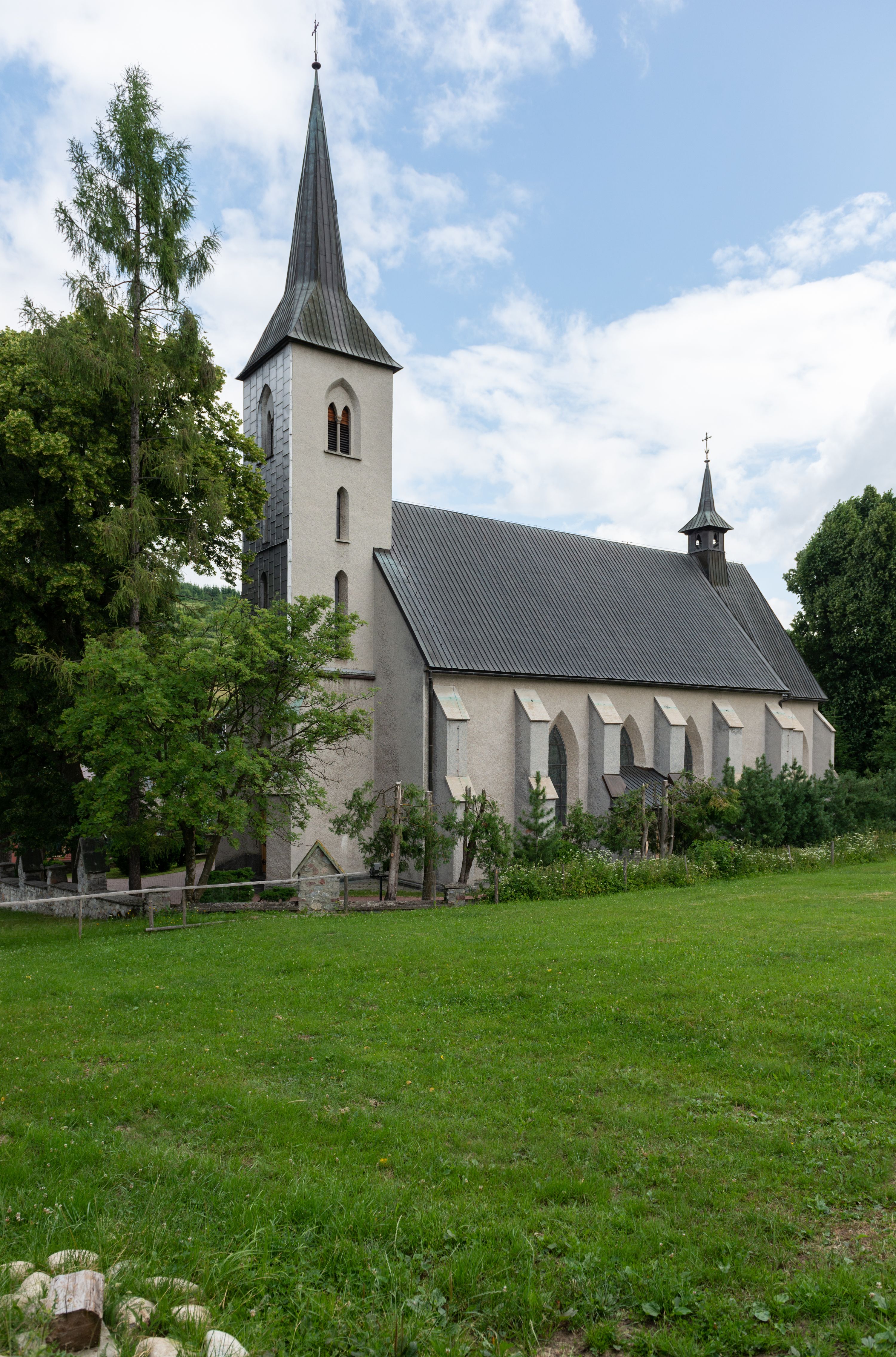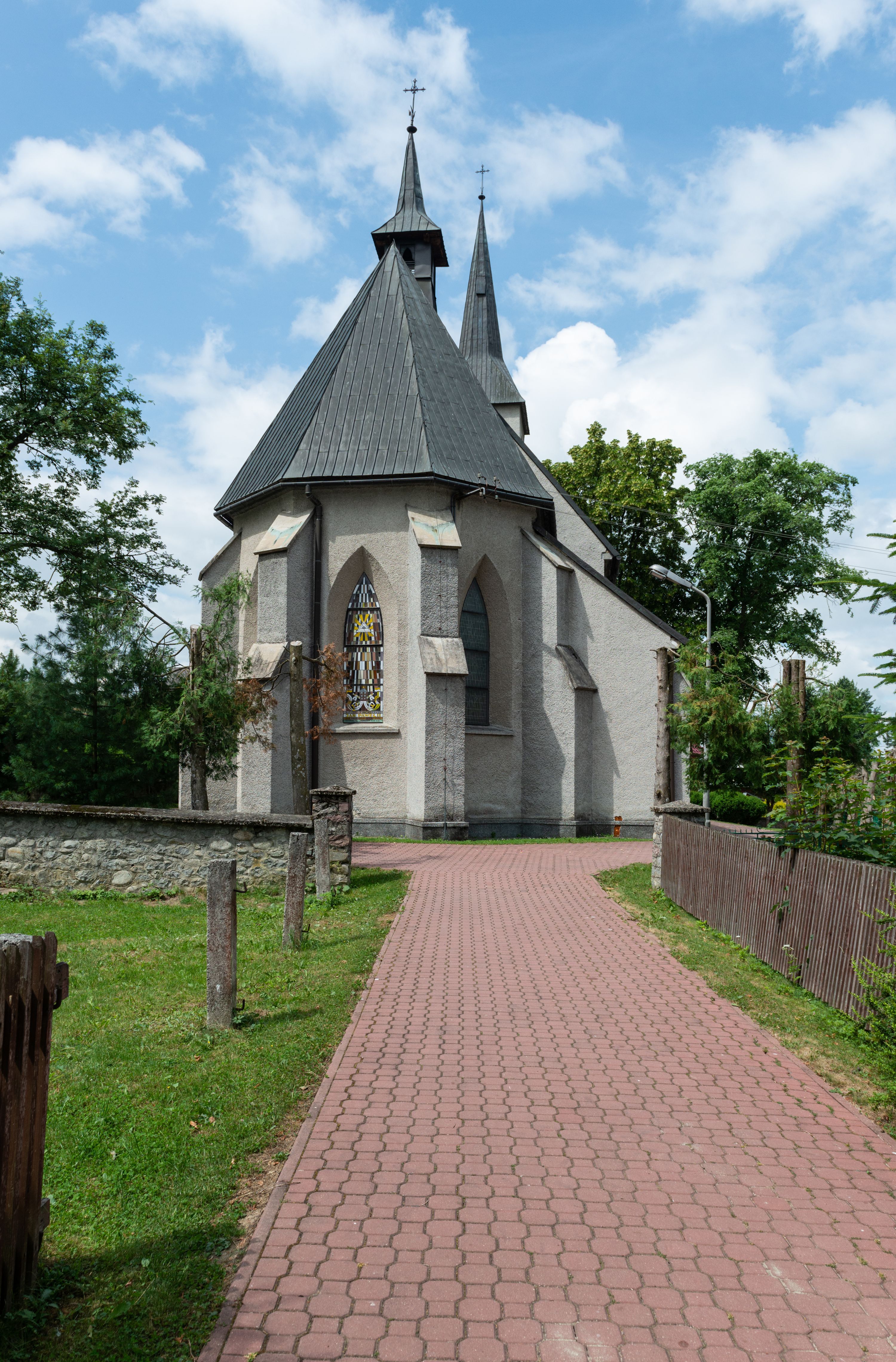 W zewnętrznej elewacji kościoła widoczny jest niewysoki cokół, powyżej kościół otynkowany. Prezbiterium, o tej samej wysokości co nawa, lecz węższe z sygnaturką zwieńczoną iglicą. Nawa i prezbiterium oszkarpowane, nakryte dachem dwuspadowym. Do zachodniej fasady kościoła dostawiona jest wysoka założona na planie kwadratu wieża-dzwonnica. W dolnej kondygnacji na osi kościoła prostokątne wejście do kruchty, flankowane dwiema szkarpami. Fasada wieży w całości pokryta blachą, przechodzącą nad głównym wejściem do kościoła w daszek. Wieża zwieńczona iglicą.