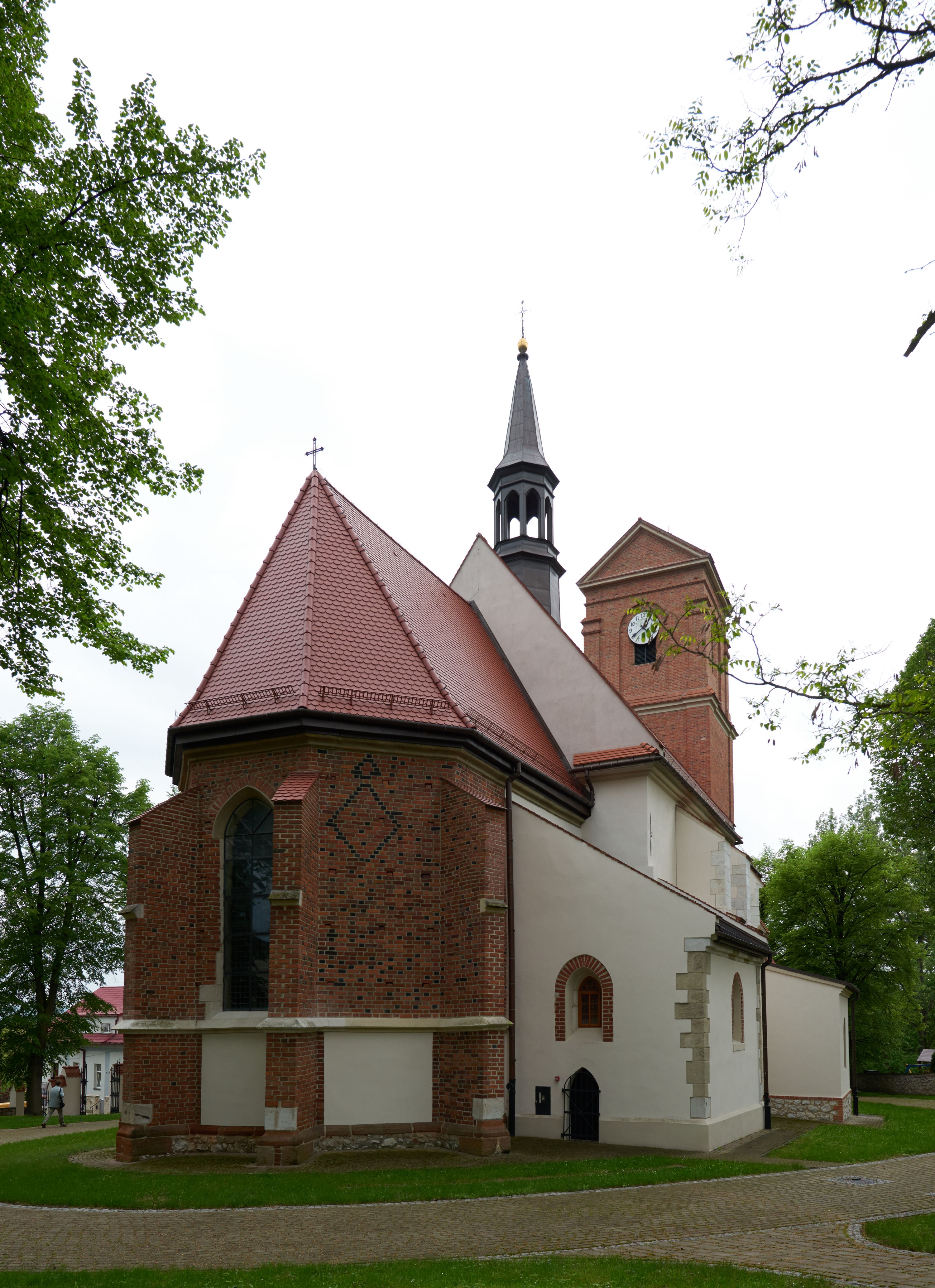 Kościół orientowany, murowany z cegły i kamienia, jednonawowy, na rzucie wydłużonego prostokąta z prezbiterium zamkniętym trójbocznie, wieżą na osi, zakrystią przy północnej ścianie prezbiterium, kruchtą przy południowej ścianie nawy i kaplicą od północy. Nawa pięcioprzęsłowa, ściany gładkie, sklepienie kolebkowe z lunetami, gurt między drugim, a trzecim przęsłem, pięć okien po stronie południowej, po północnej blendy odpowiadające wielkością i kształtem przeciwległym otworom okiennym. Prezbiterium oddzielone ścianą tęczową przeprutą łukiem o kształcie lekko zaostrzonym, dwuprzęsłowe, o sklepieniu krzyżowym, z dwoma ostrołukowymi oknami w ścianie południowej; zakrystia o sklepieniu sieciowym/gwiaździstym. Od zachodu chór wsparty arkadami z łukami o profilu lekko zaostrzonym, z balustradą zdobioną motywem rombu wypełnionego czworoliściem. Pod chórem skarbiec. Wejście główne od zachodu, boczne od południa z kruchtą (w nim kamienny portal z 1673 roku), kolejne od zakrystii, między zakrystią, a prezbiterium gotycki ostrołukowy portal z żelaznymi drzwiami z kratownicą rombową.