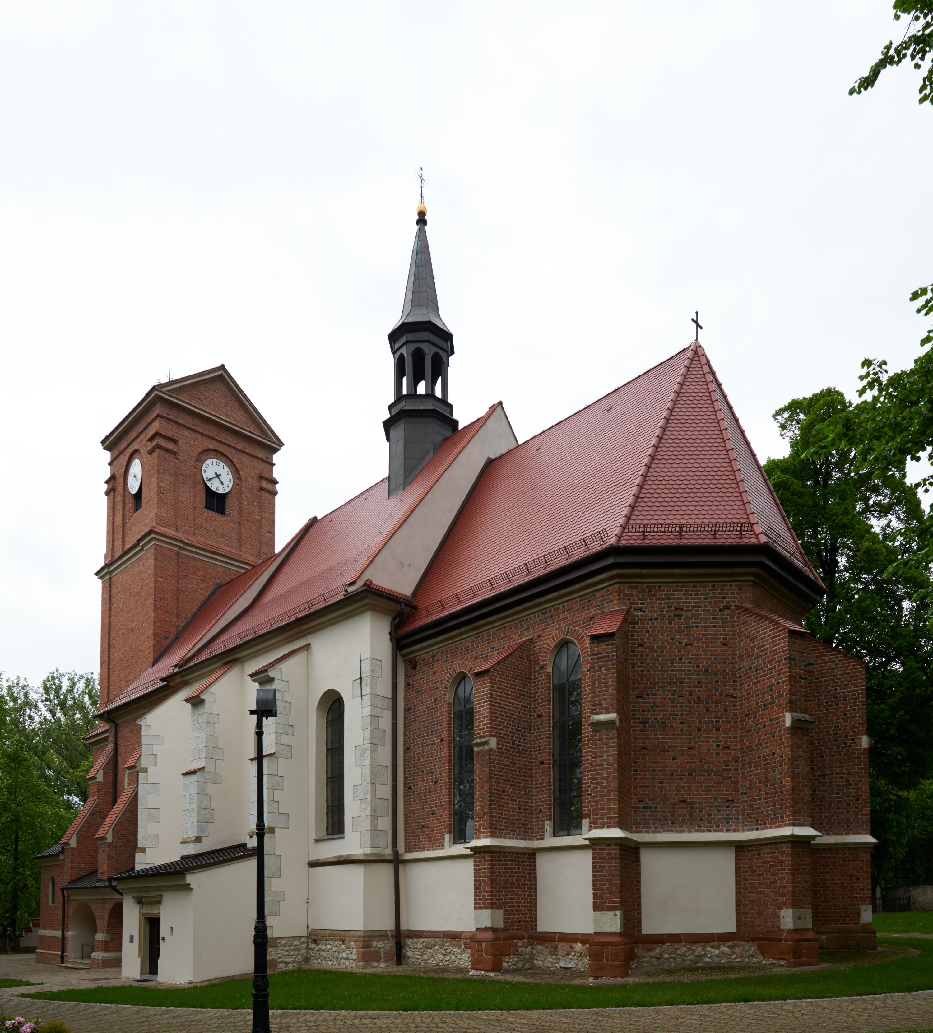 Bryła rozczłonkowana; całość budynku obiega cokół, fragmentami kamienny, elewacje boczne oraz prezbiterium wsparte przyporami. Trzy przęsła nawy głównej otynkowane, reszta z cegły. Dachy dwuspadowe, nad pierwszymi dwoma przęsłami nawy niższy niż nad pozostałymi. Nad czwartym przęsłem nawy wieloboczna wieżyczka na sygnaturkę przepruta arkadami, przykryta dachem ostrosłupowym zakończonym kulą z krzyżem łacińskim.