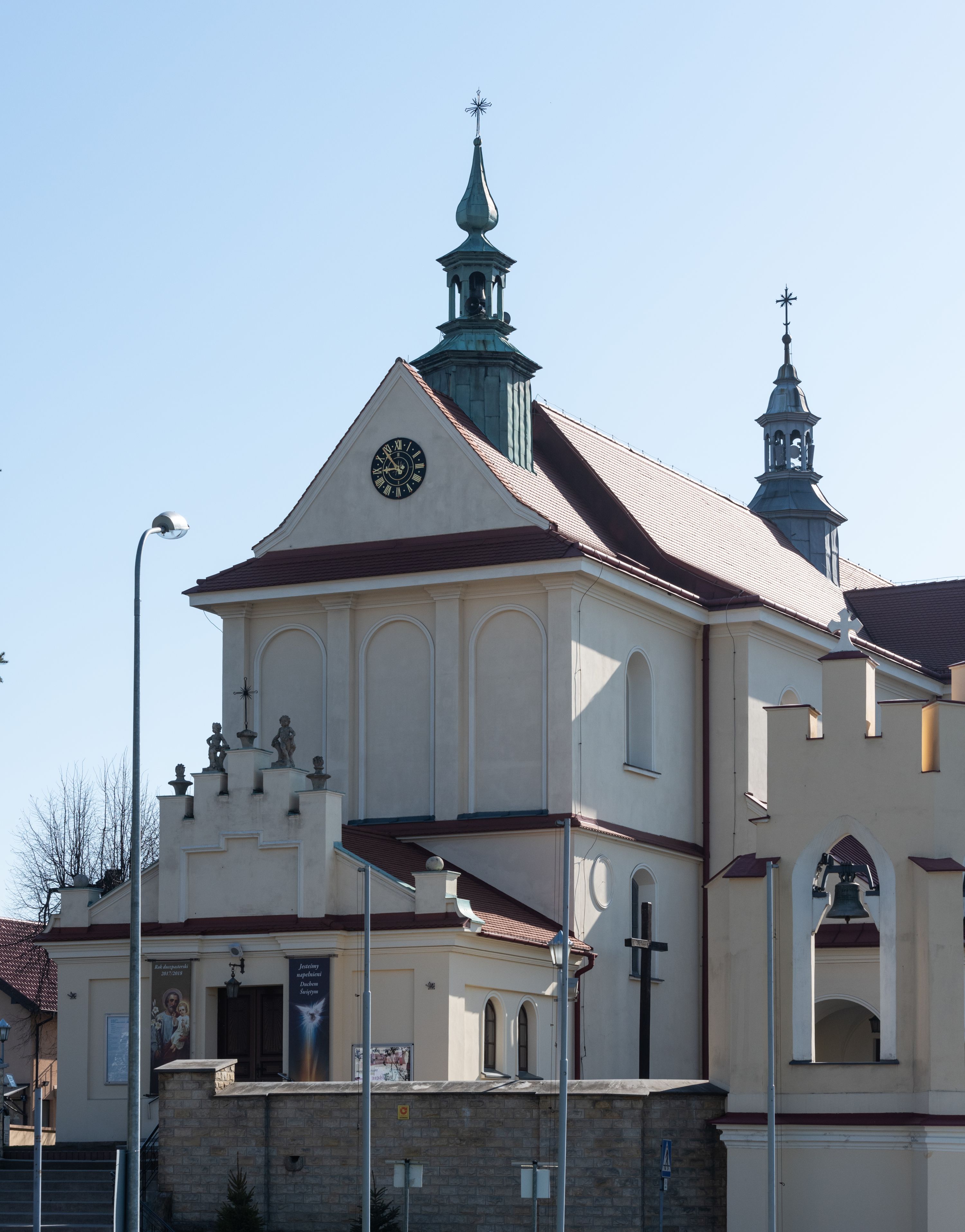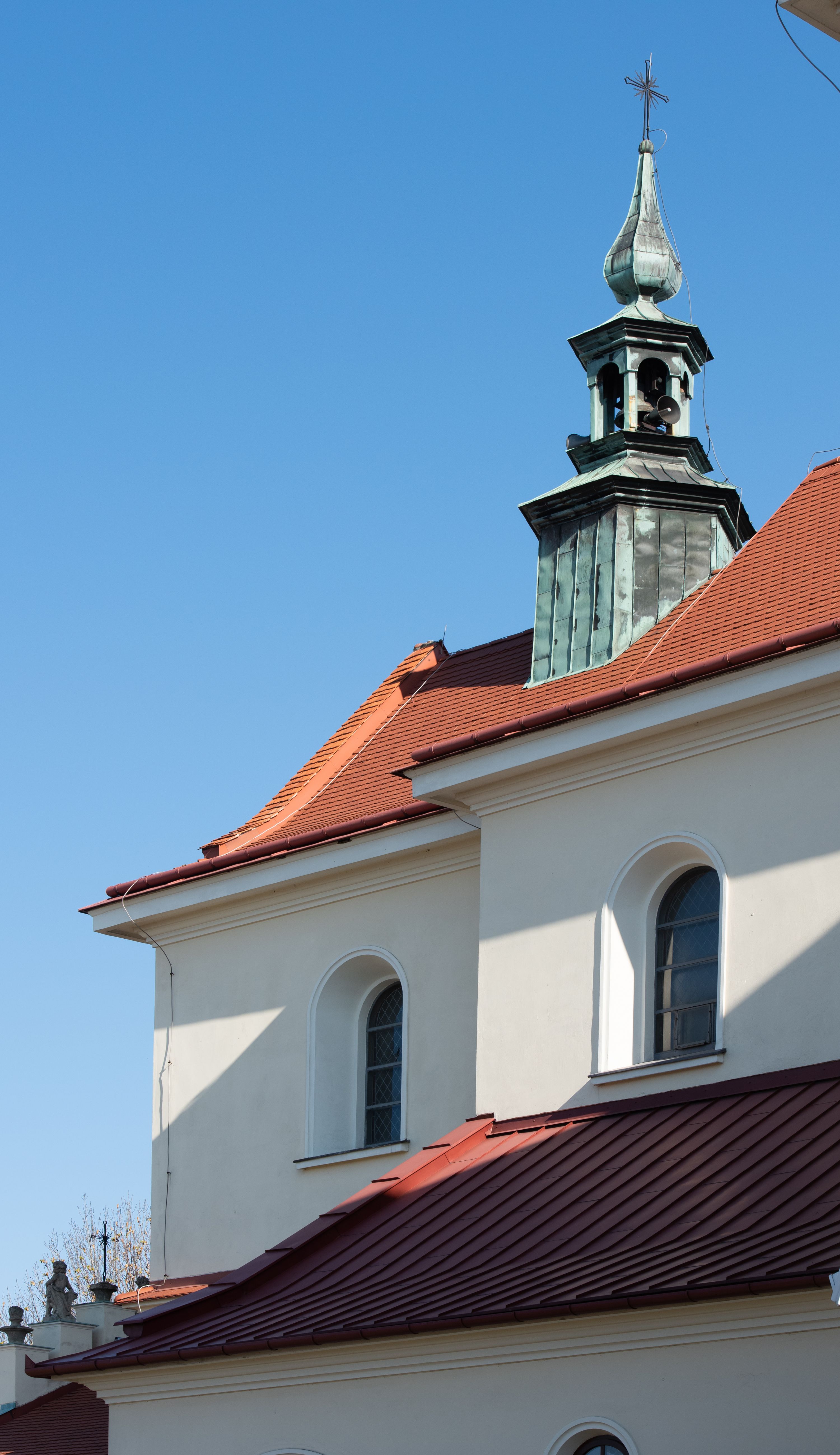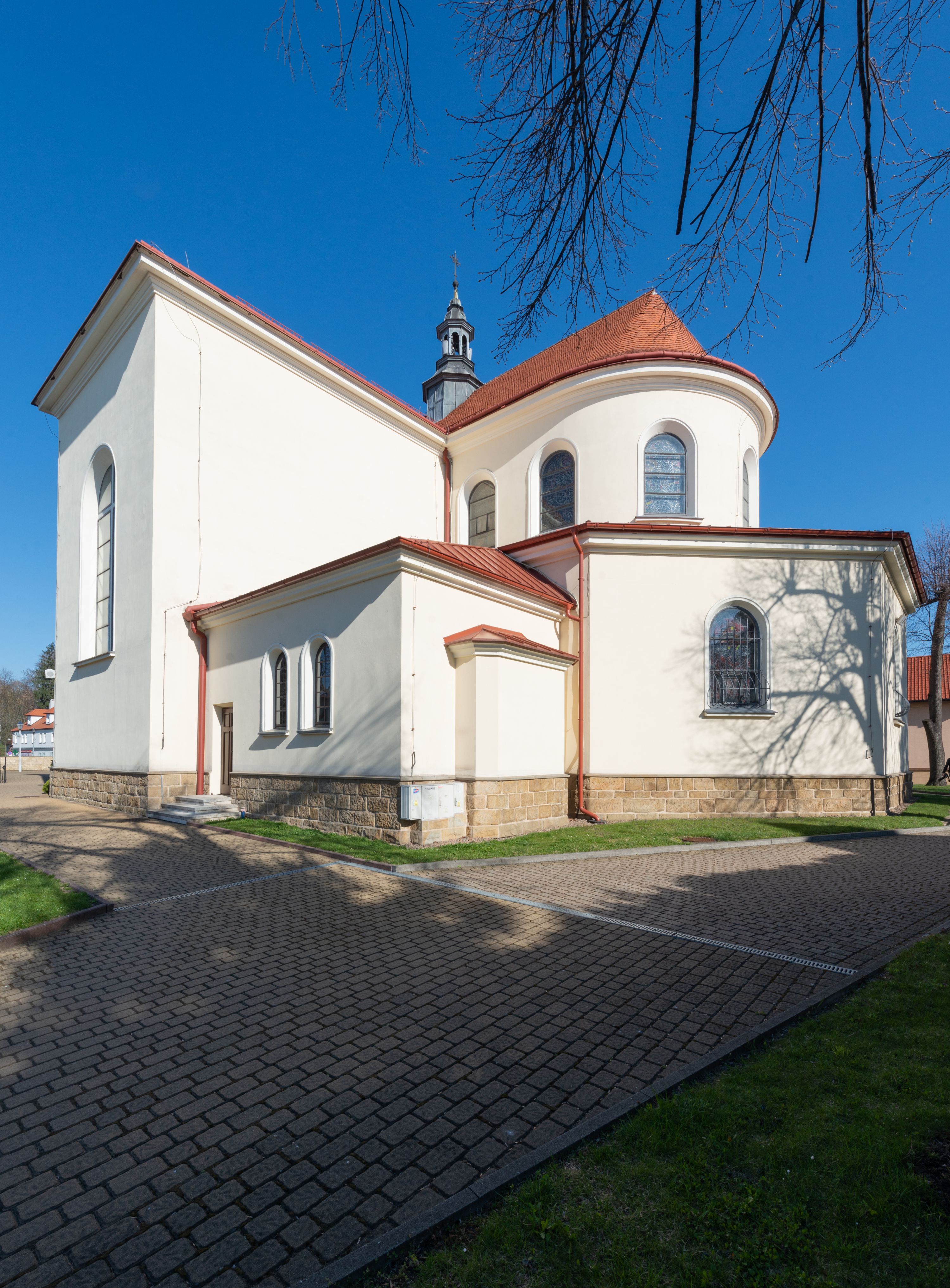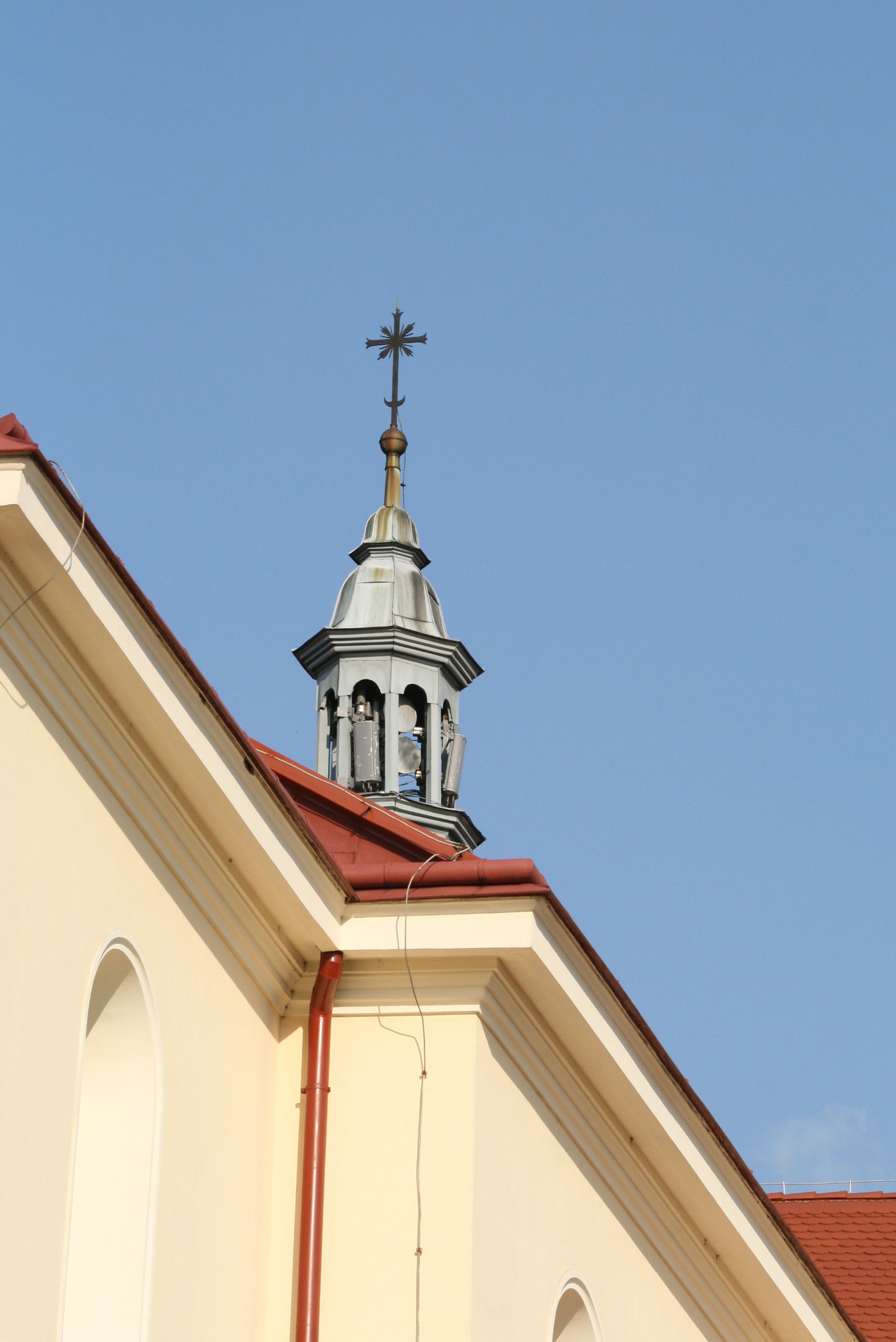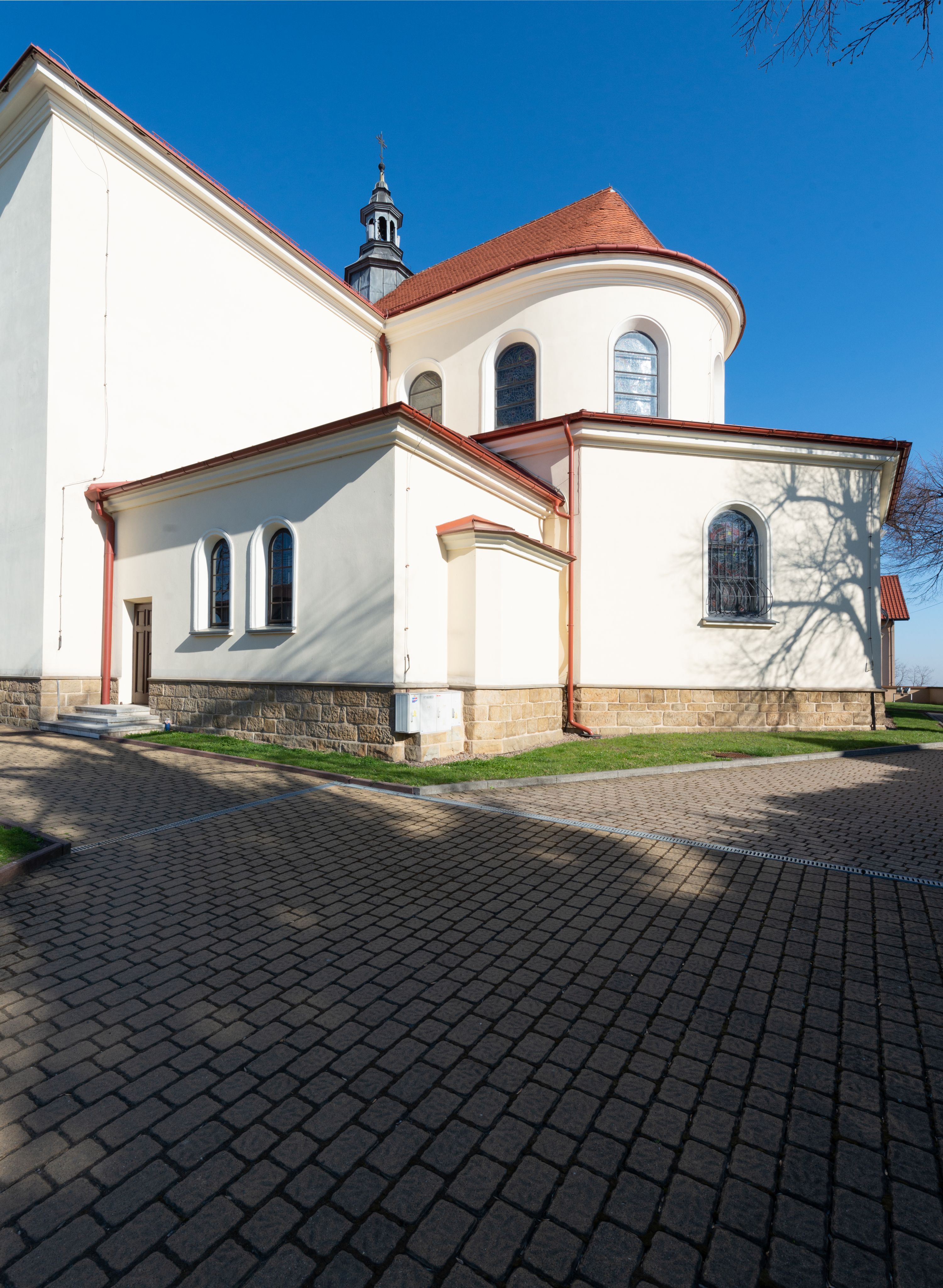 Nad nawą główną, na kalenicy, wieżyczka na sygnaturkę z latarnią i baniastym hełmem, druga na skrzyżowaniu naw, z latarnią i hełmem zakończonym krzyżem. Dach nad nawą główną i przedsionkiem dwuspadowy, nad ramionami transeptu trójspadowym,nad prezbiterium zakończony wielobocznie, na przybudówkach dachy pulpitowe, dwuspadowe i wielospadowe. Dachy kryte dachówką ceramiczną, wieżyczki blachą.