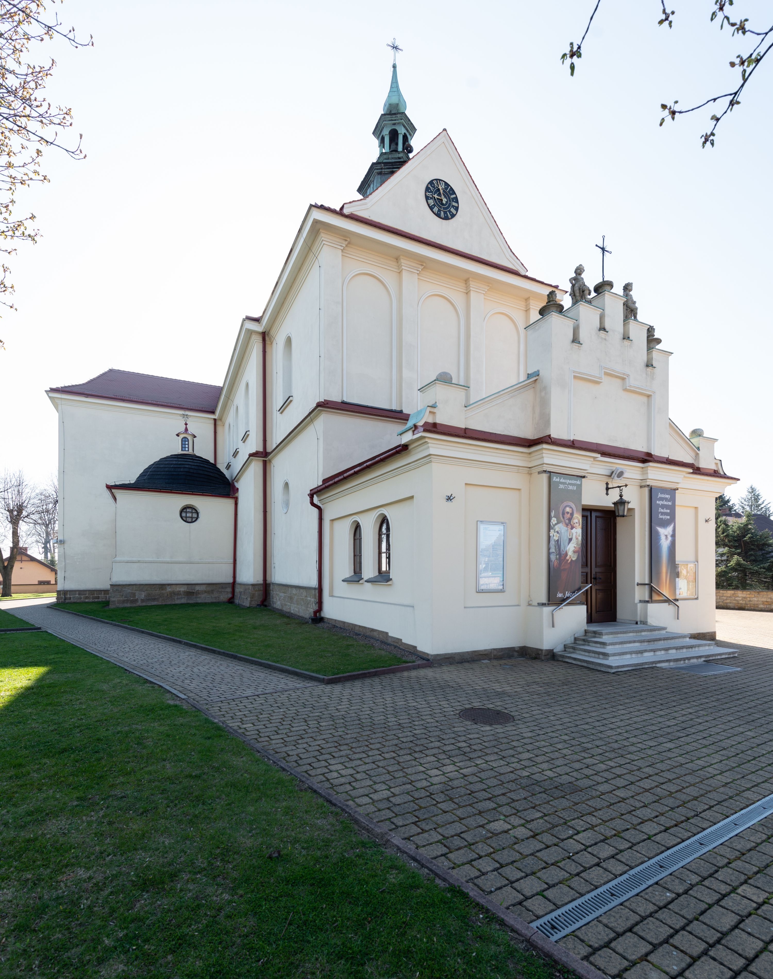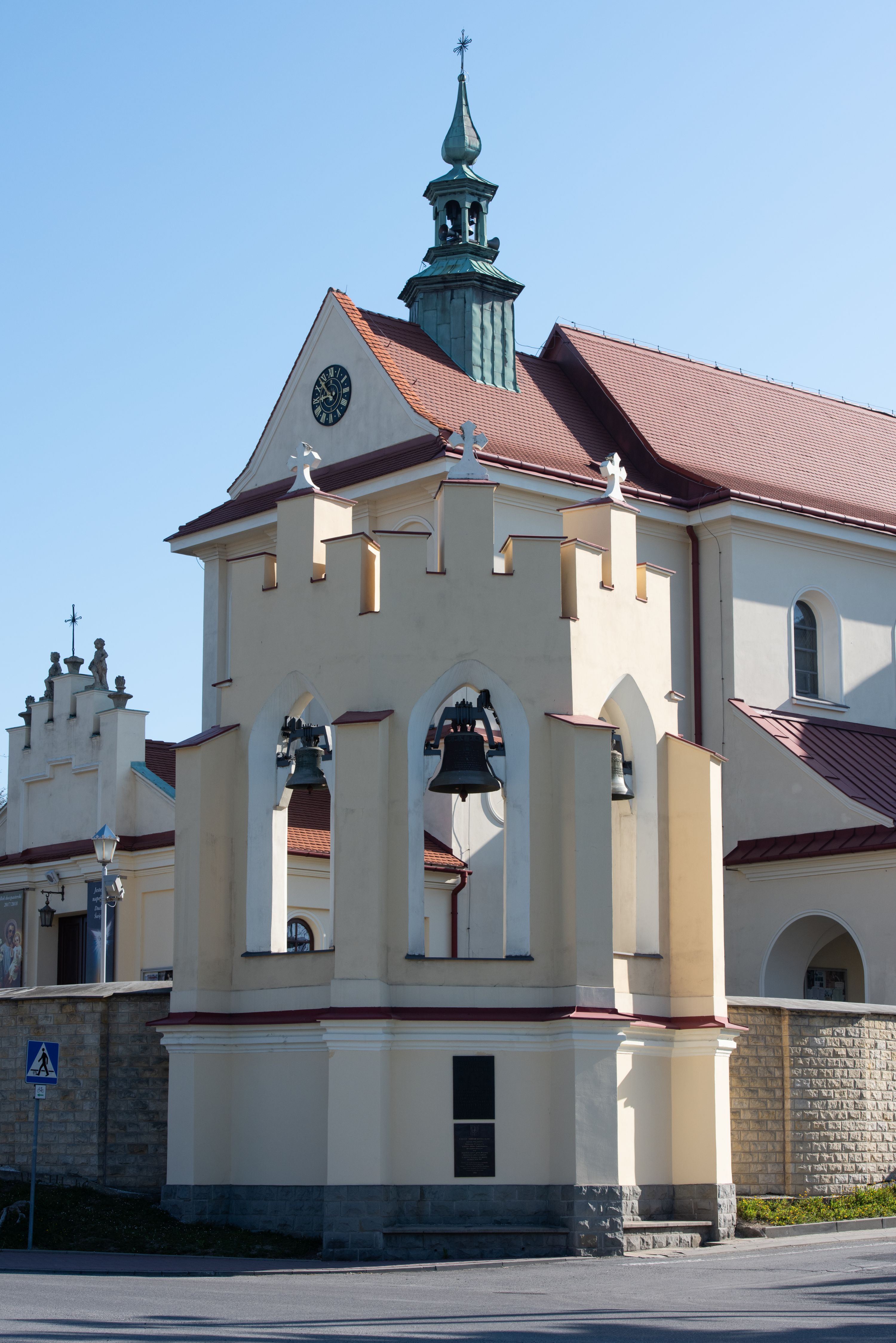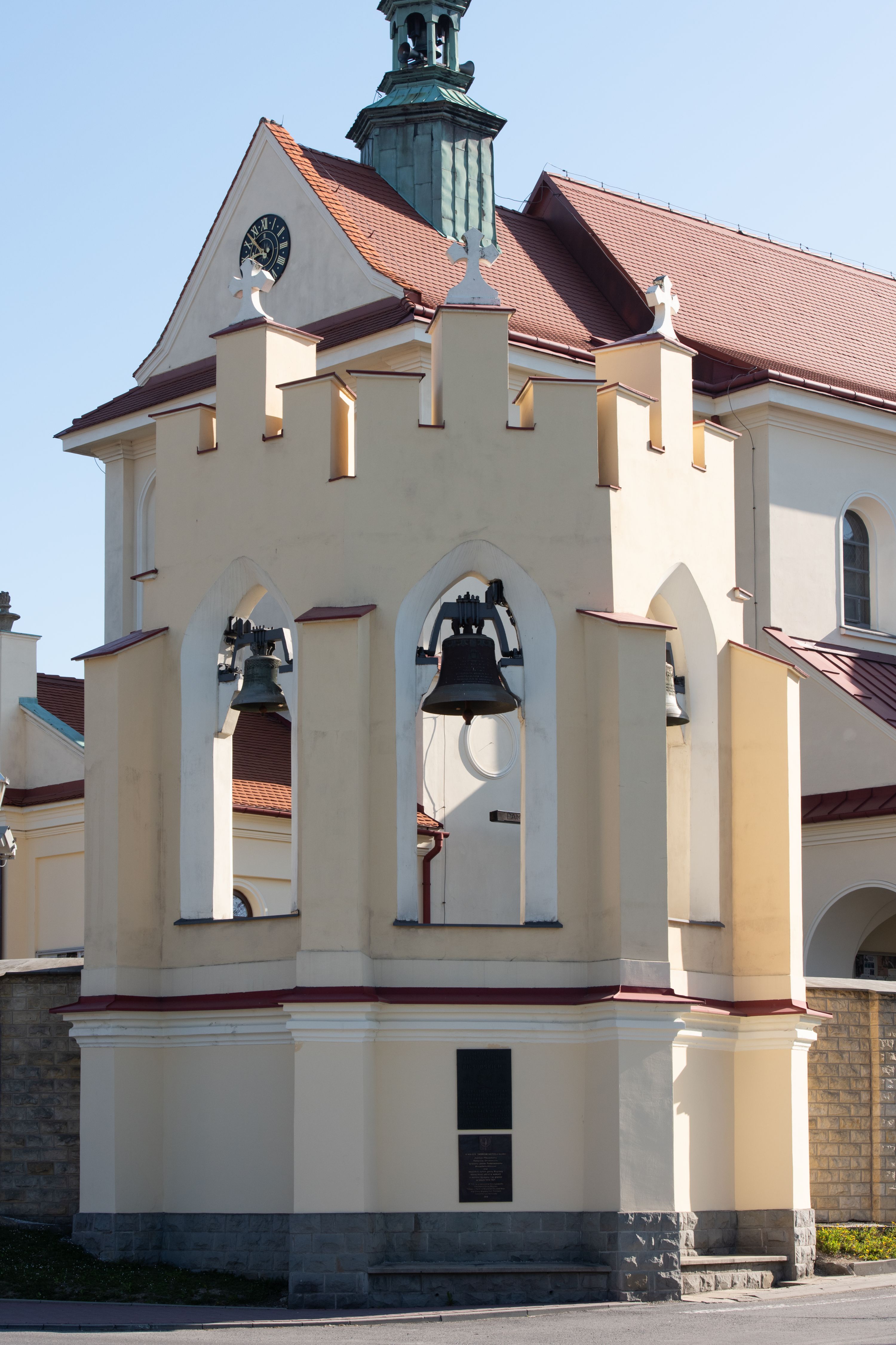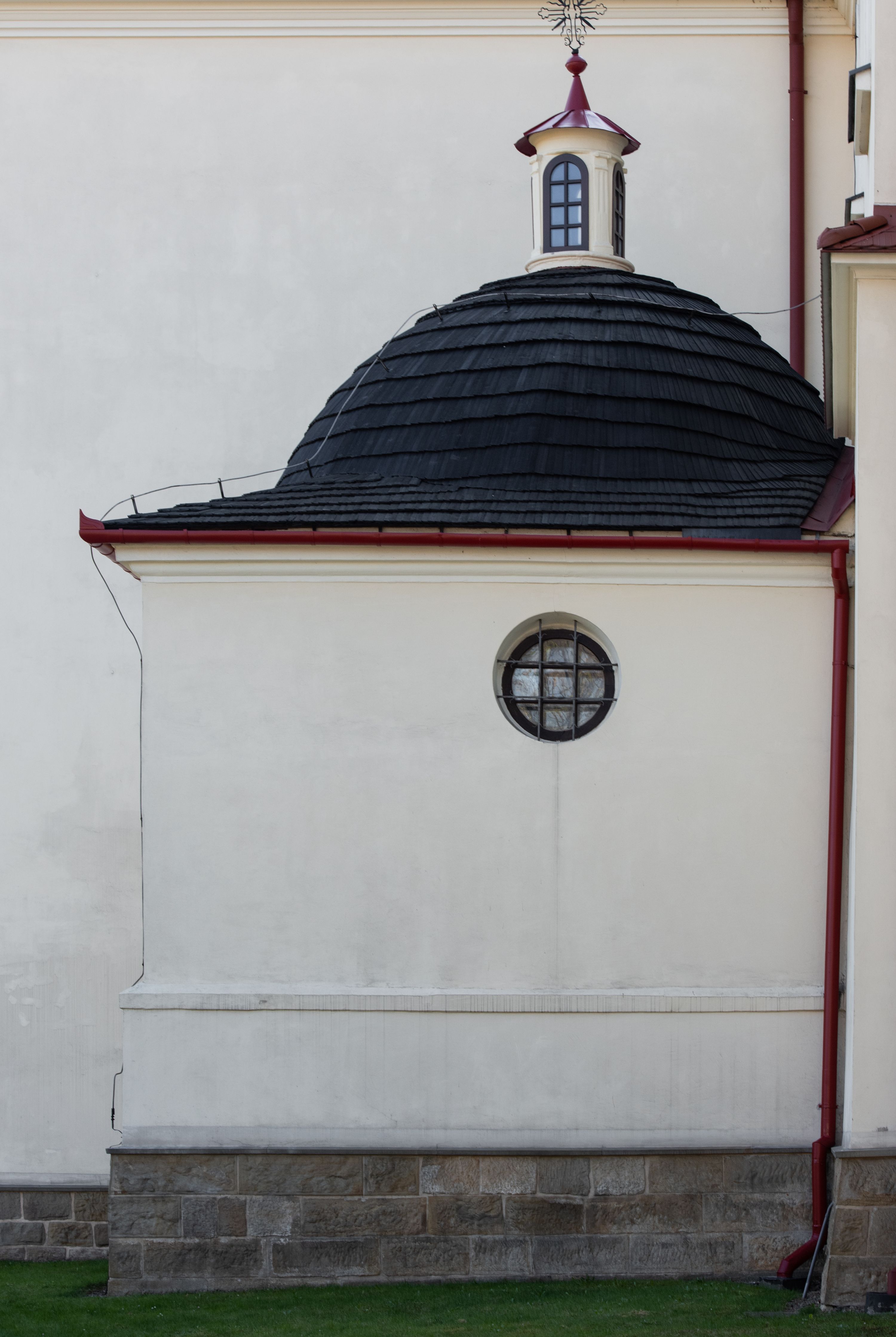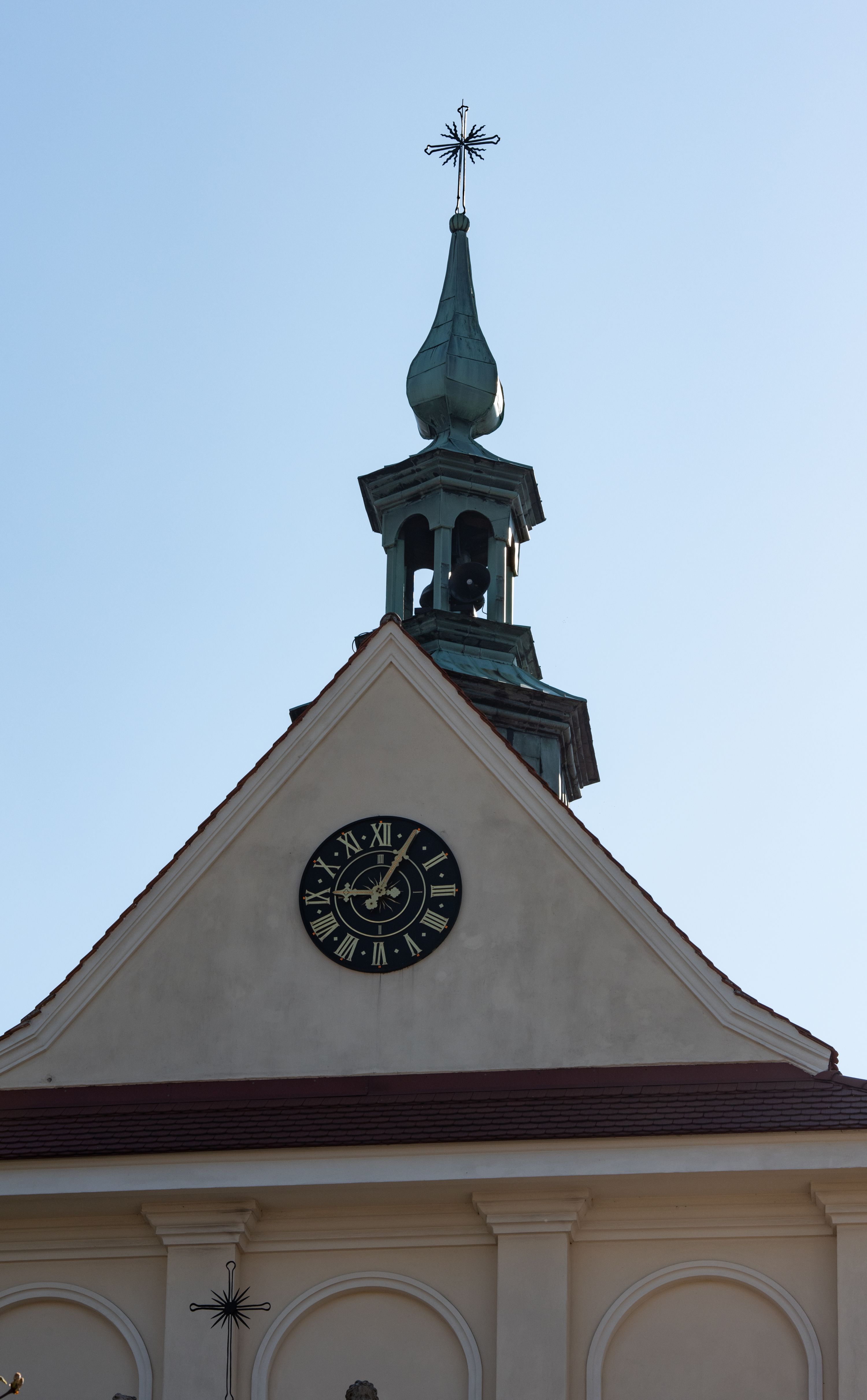 Nad nawą główną, na kalenicy, wieżyczka na sygnaturkę z latarnią i baniastym hełmem, druga na skrzyżowaniu naw, z latarnią i hełmem zakończonym krzyżem. Dach nad nawą główną i przedsionkiem dwuspadowy, nad ramionami transeptu trójspadowym,nad prezbiterium zakończony wielobocznie, na przybudówkach dachy pulpitowe, dwuspadowe i wielospadowe. Dachy kryte dachówką ceramiczną, wieżyczki blachą.