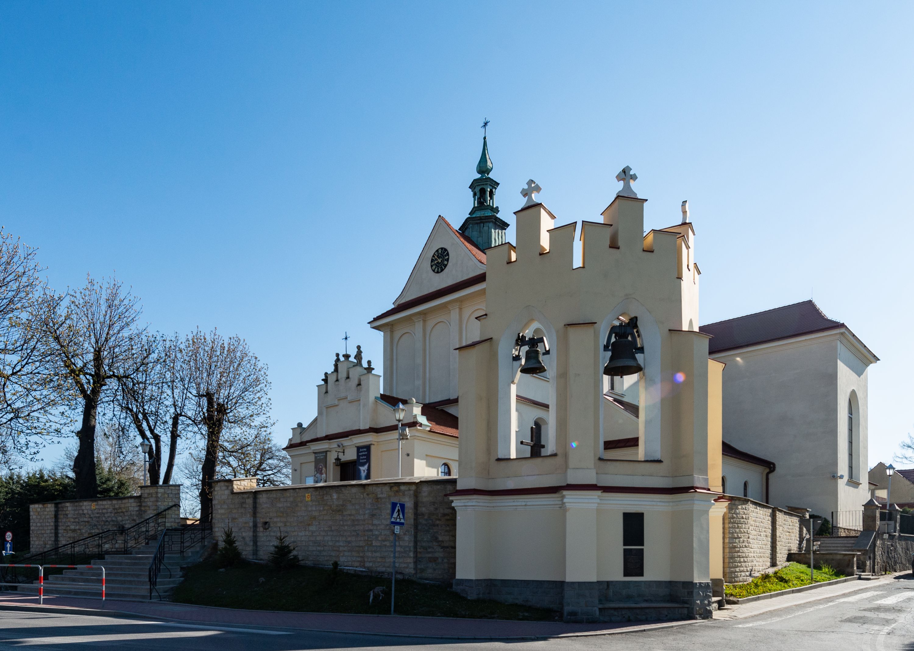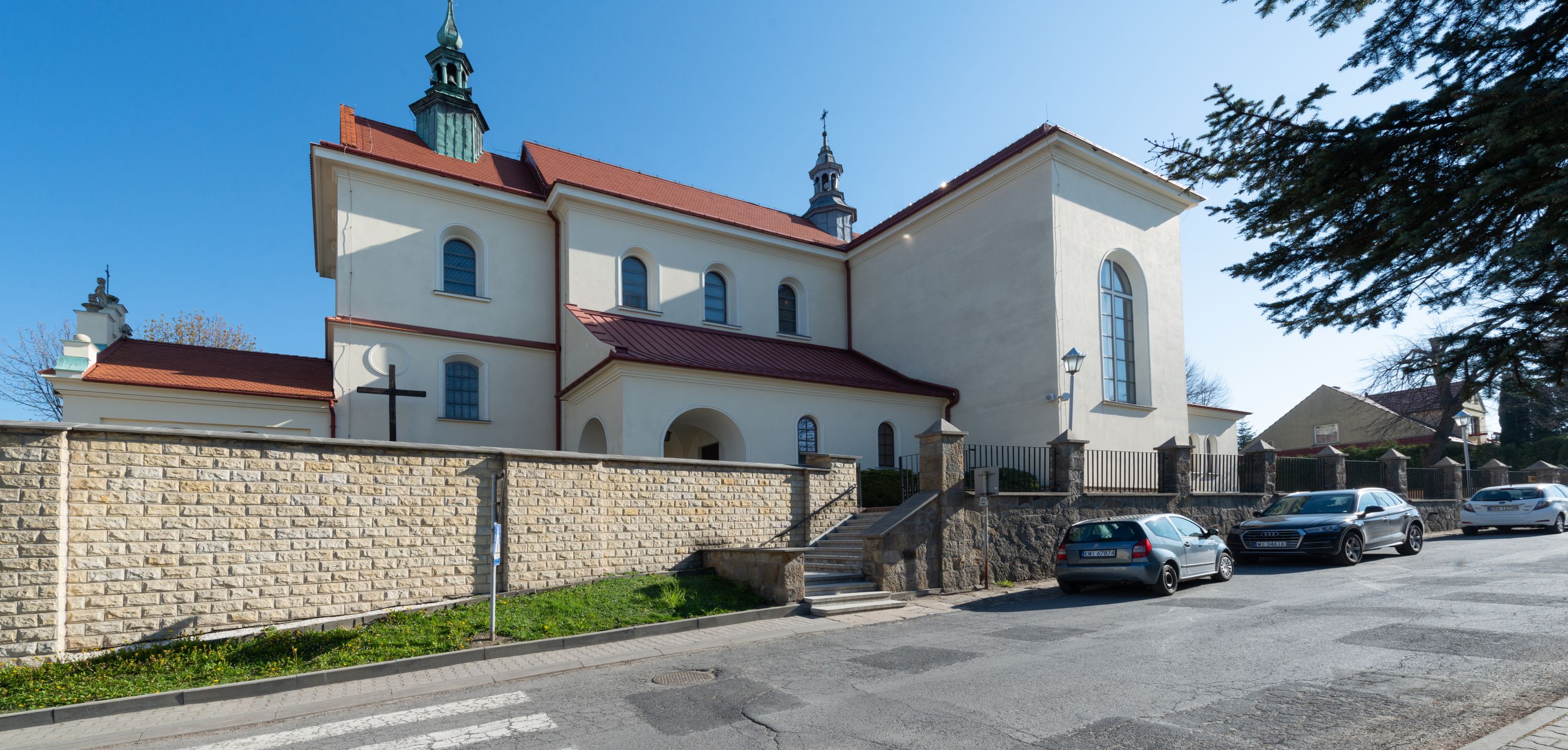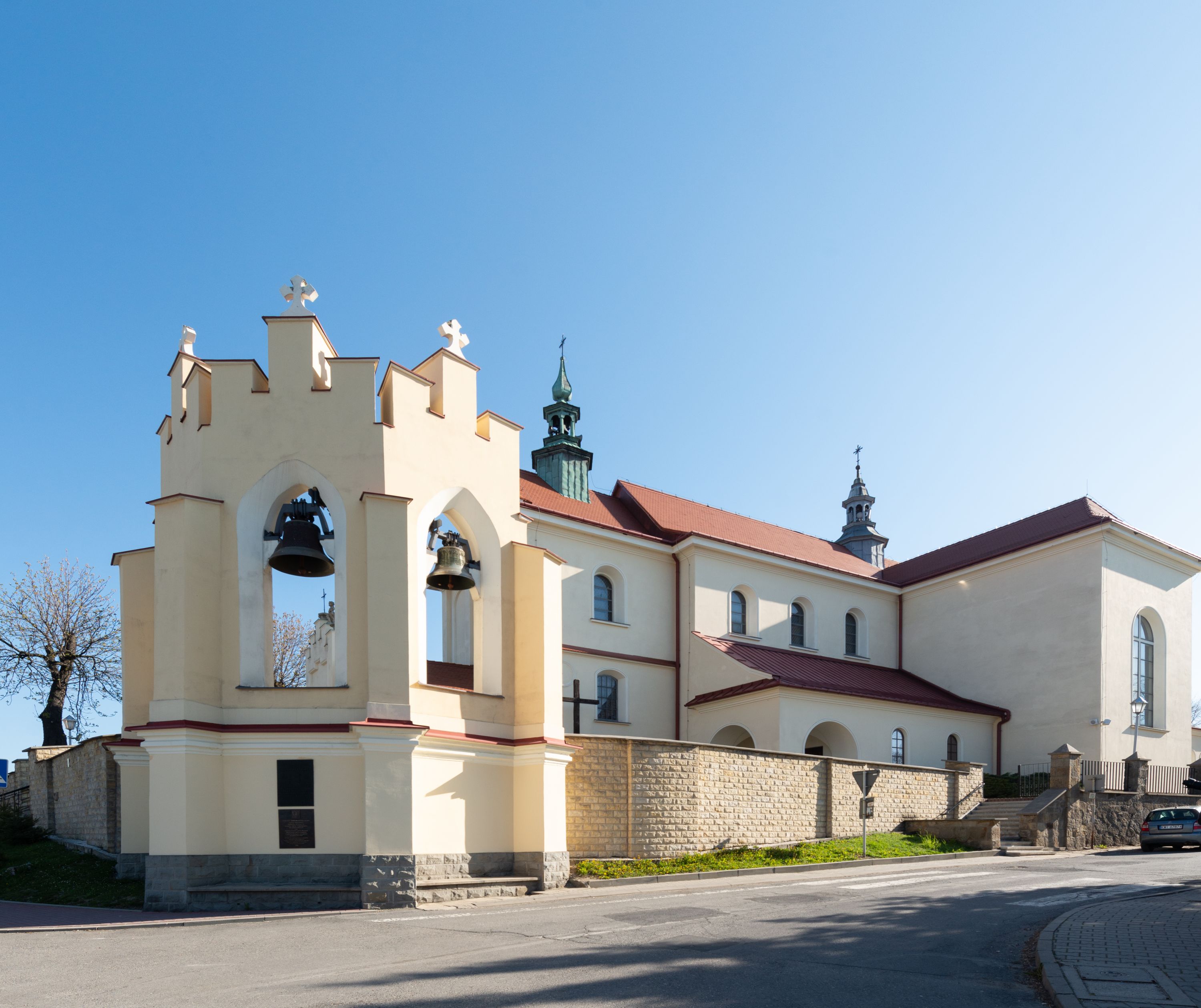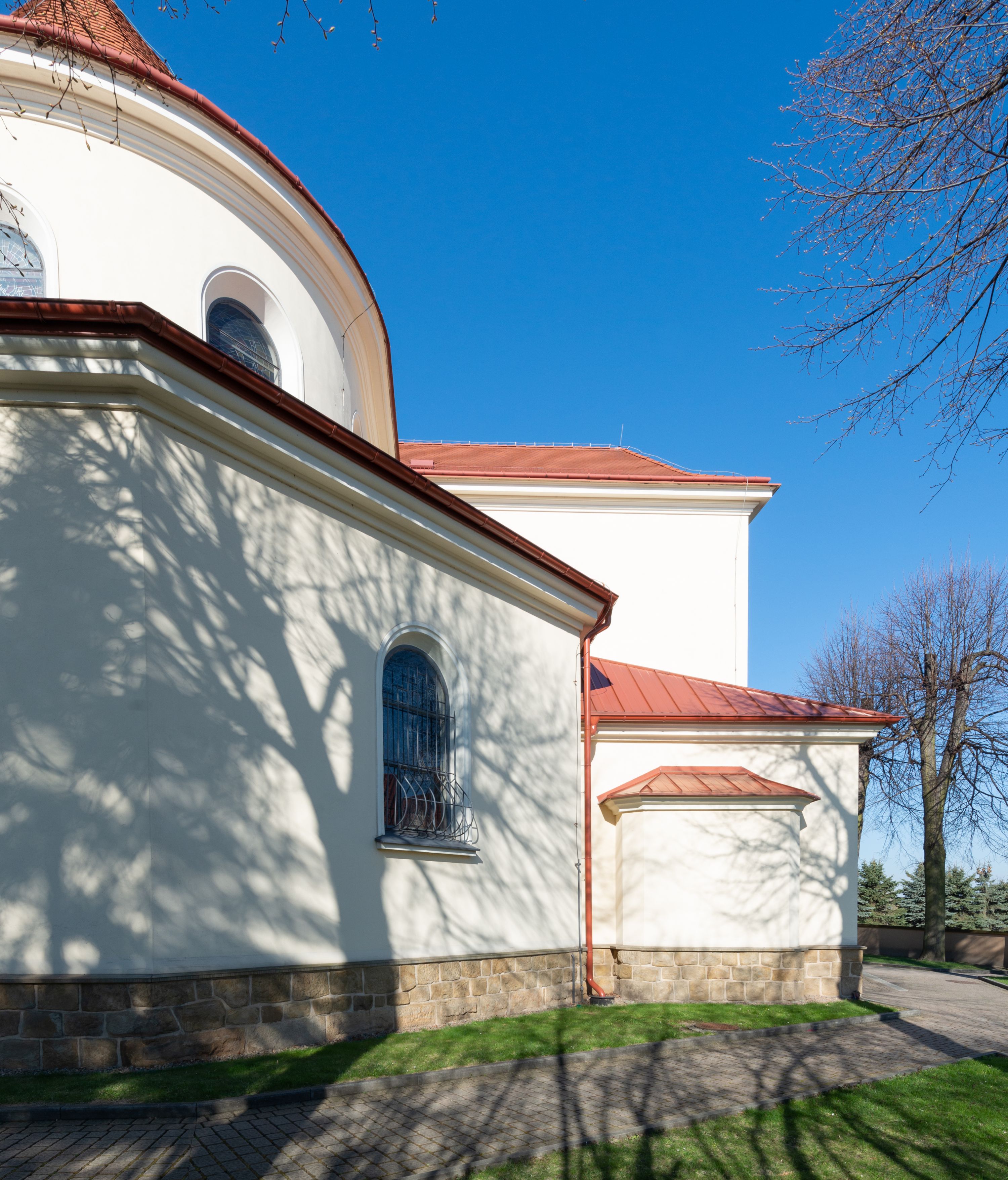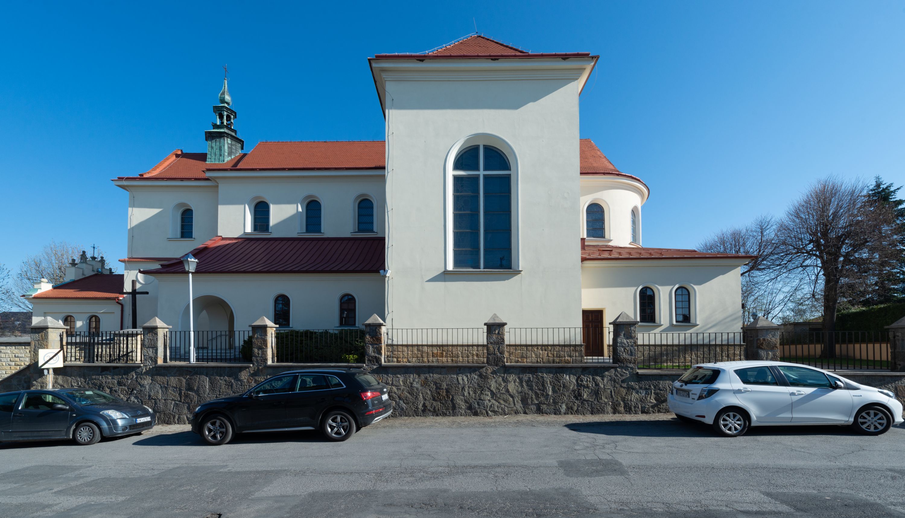Nad nawą główną, na kalenicy, wieżyczka na sygnaturkę z latarnią i baniastym hełmem, druga na skrzyżowaniu naw, z latarnią i hełmem zakończonym krzyżem. Dach nad nawą główną i przedsionkiem dwuspadowy, nad ramionami transeptu trójspadowym,nad prezbiterium zakończony wielobocznie, na przybudówkach dachy pulpitowe, dwuspadowe i wielospadowe. Dachy kryte dachówką ceramiczną, wieżyczki blachą.