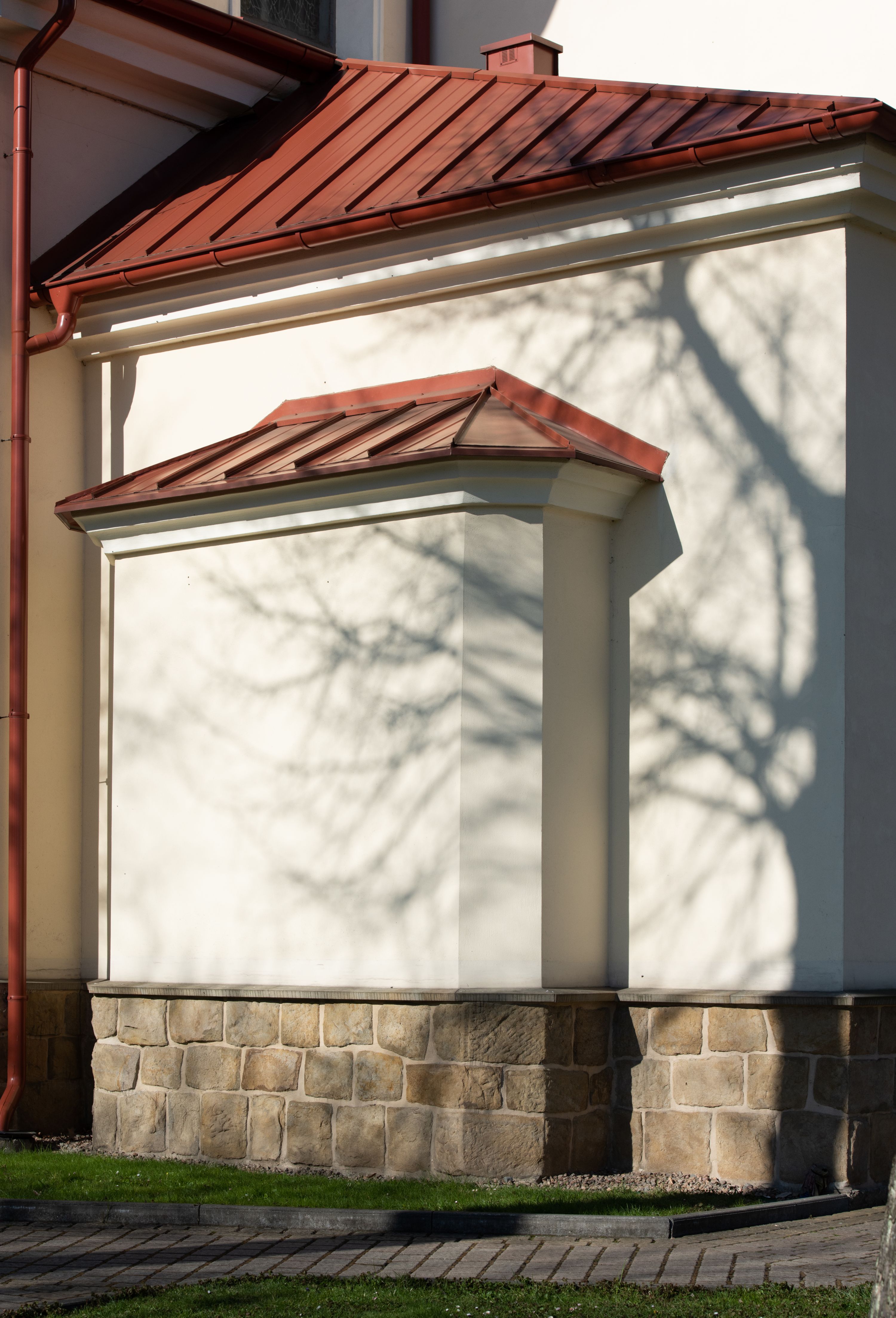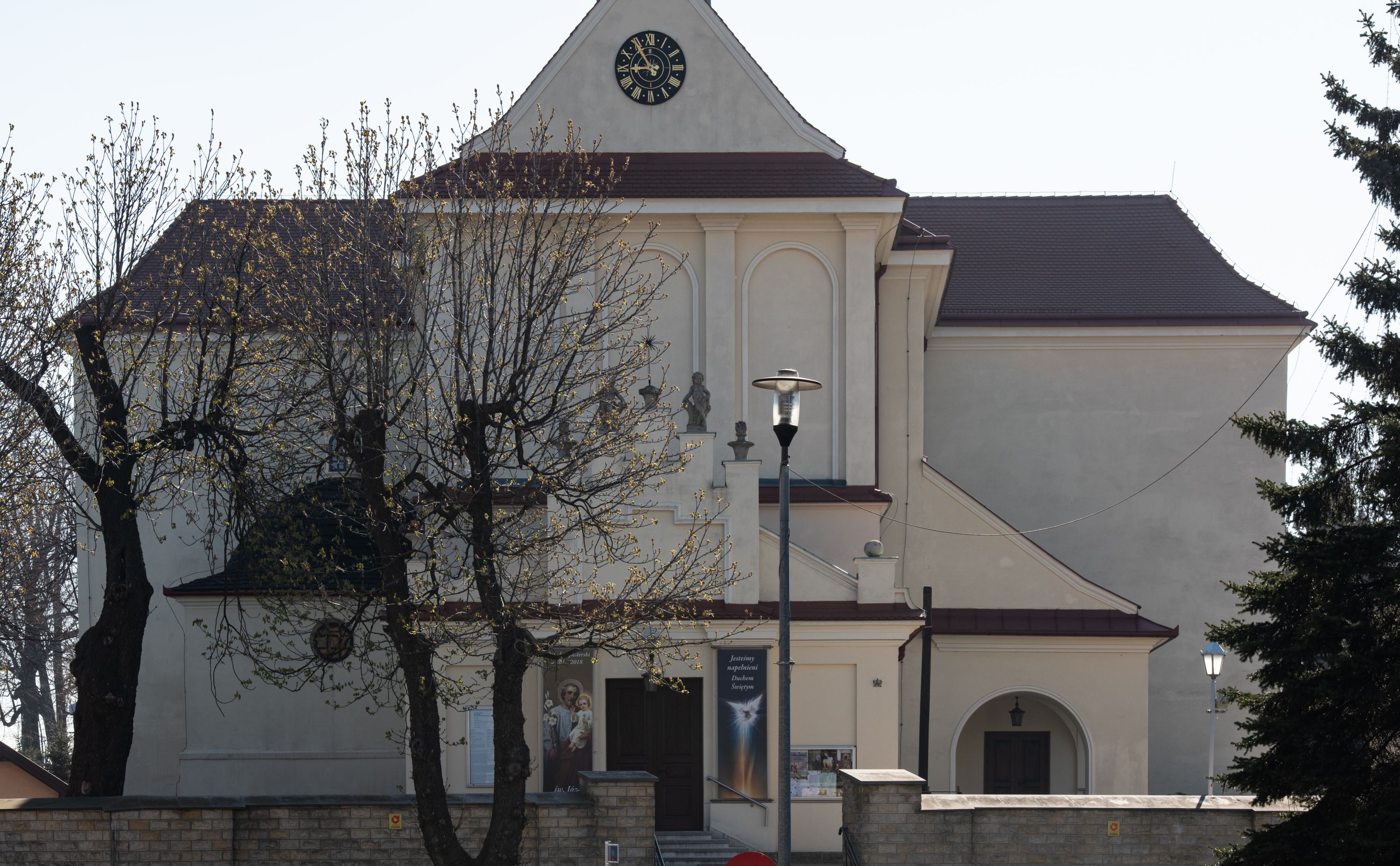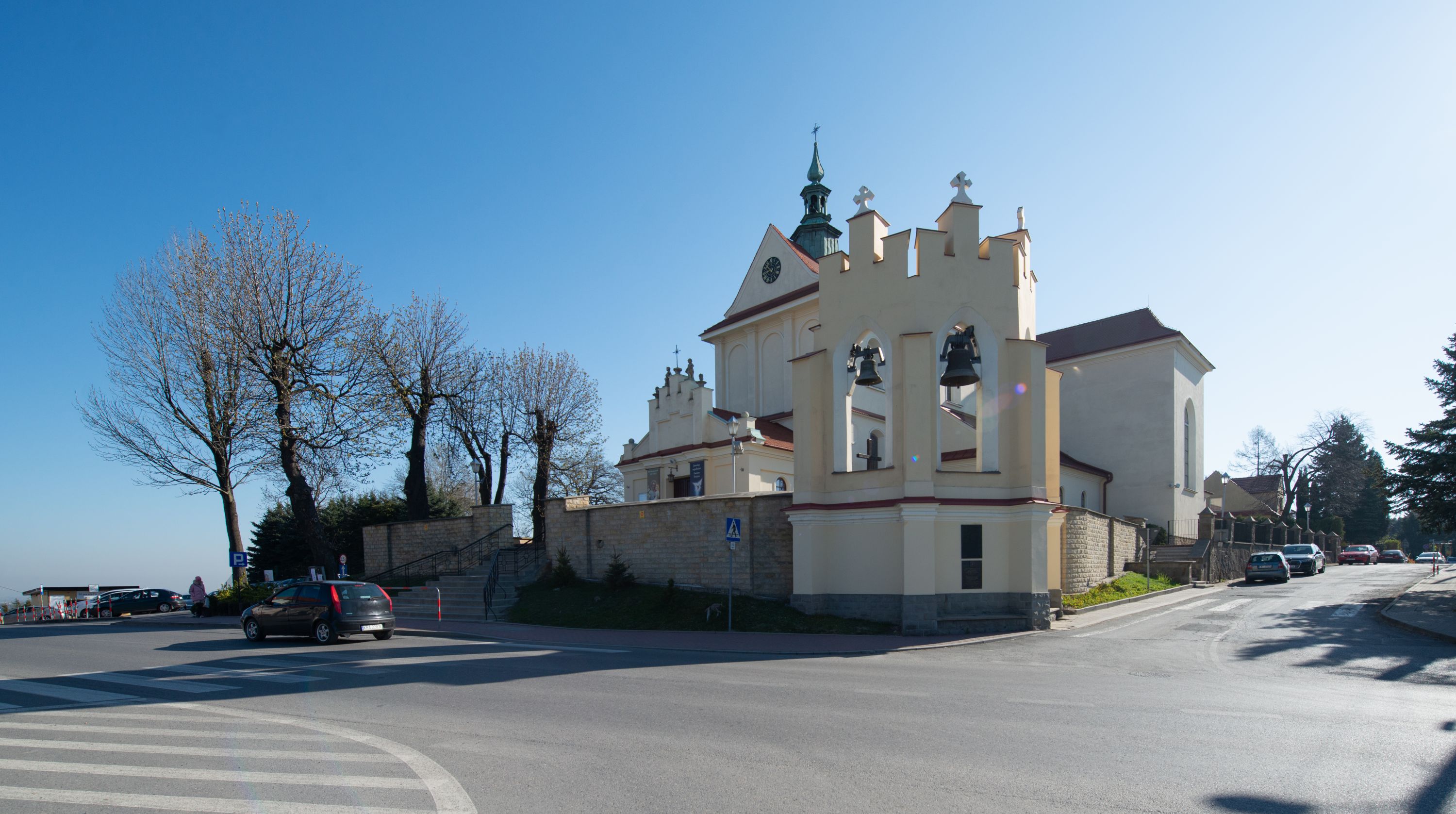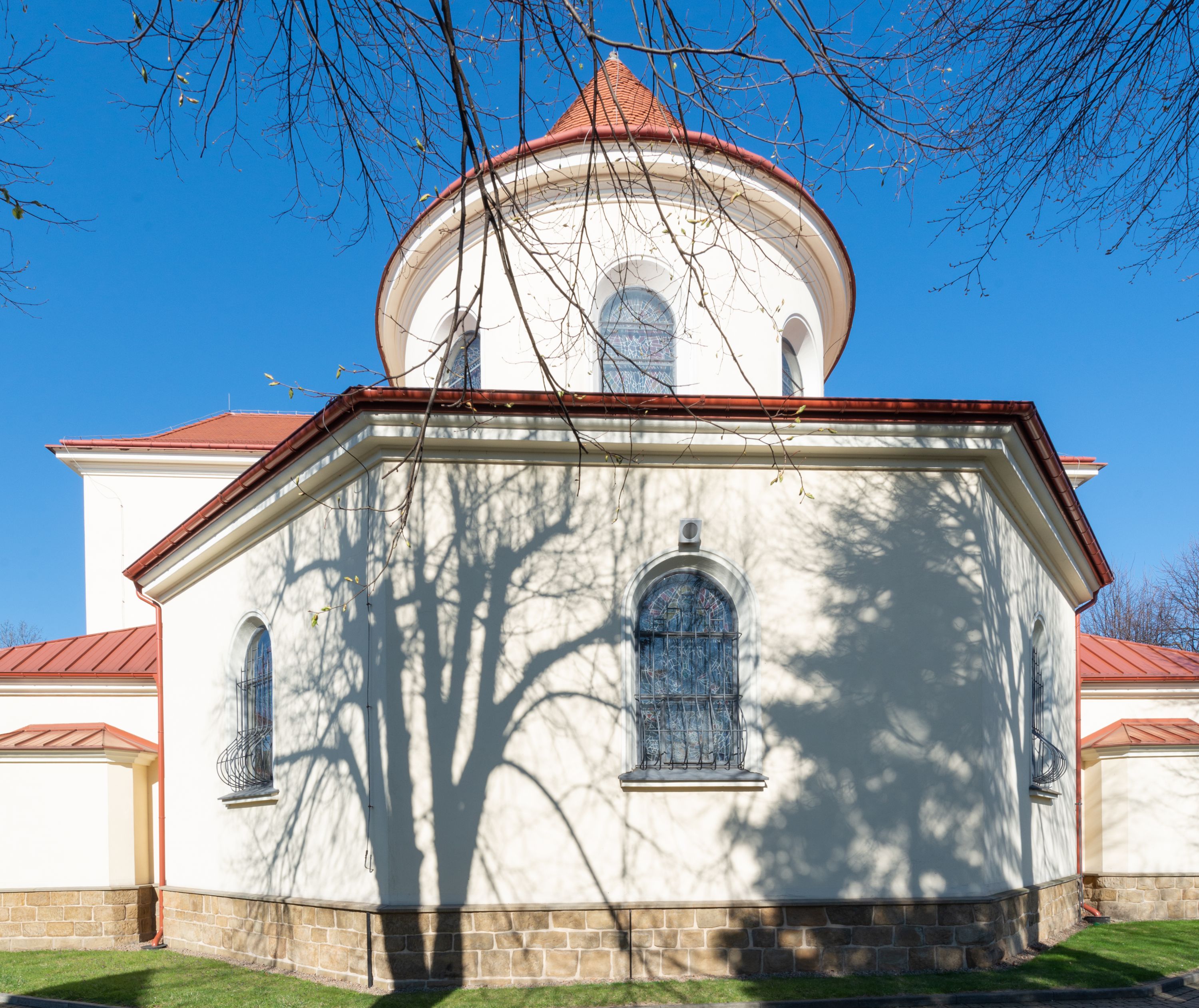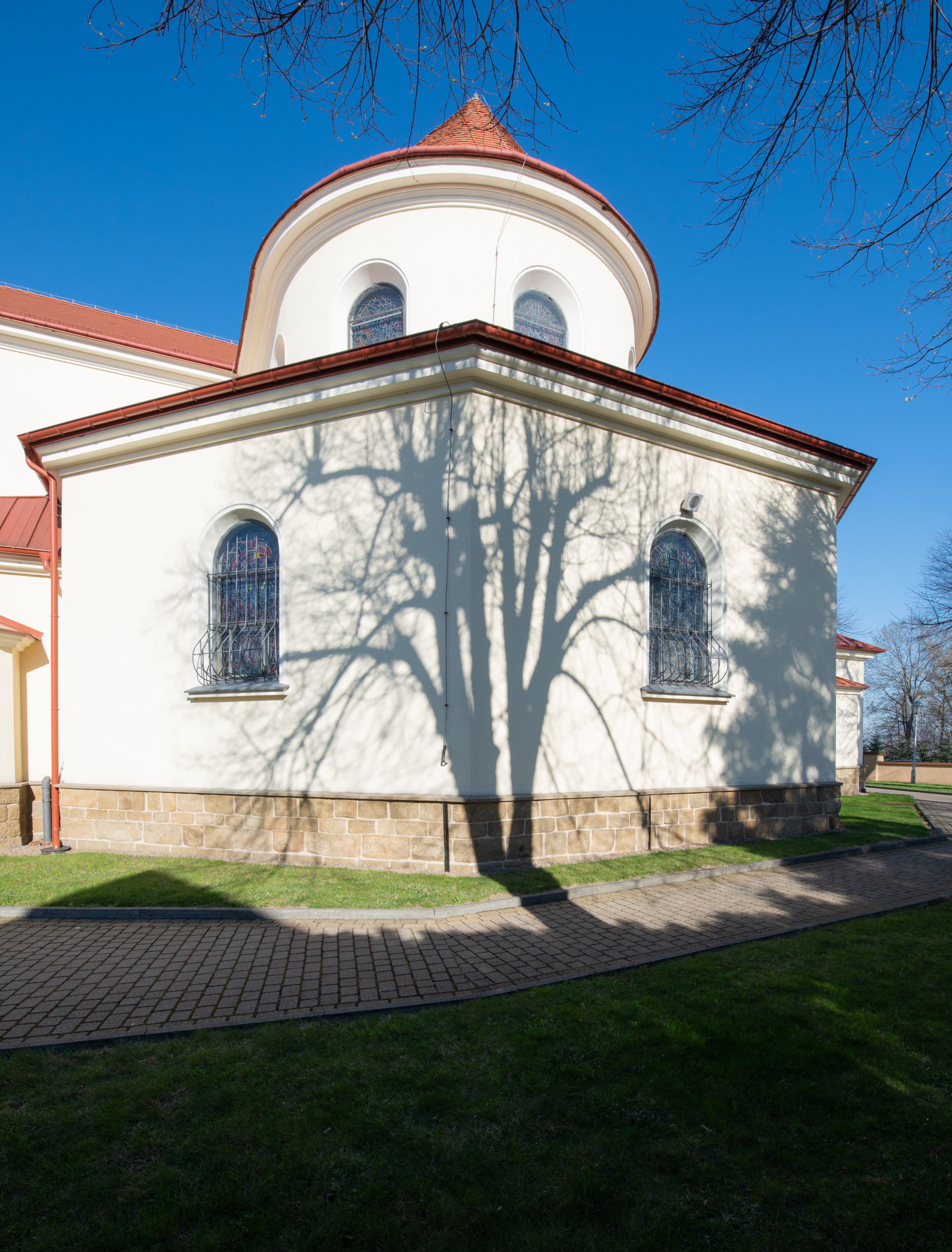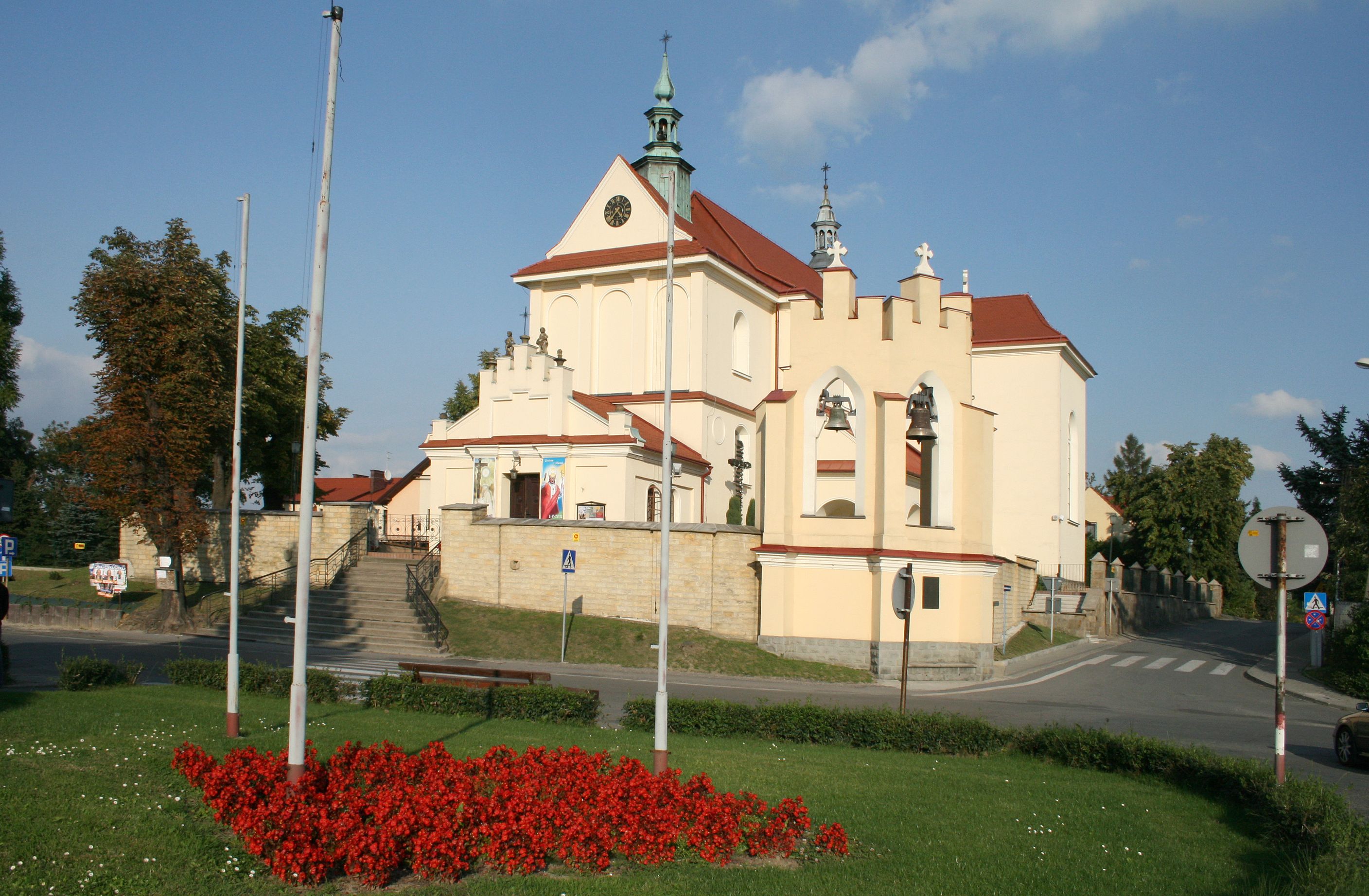 Nad nawą główną, na kalenicy, wieżyczka na sygnaturkę z latarnią i baniastym hełmem, druga na skrzyżowaniu naw, z latarnią i hełmem zakończonym krzyżem. Dach nad nawą główną i przedsionkiem dwuspadowy, nad ramionami transeptu trójspadowym,nad prezbiterium zakończony wielobocznie, na przybudówkach dachy pulpitowe, dwuspadowe i wielospadowe. Dachy kryte dachówką ceramiczną, wieżyczki blachą.