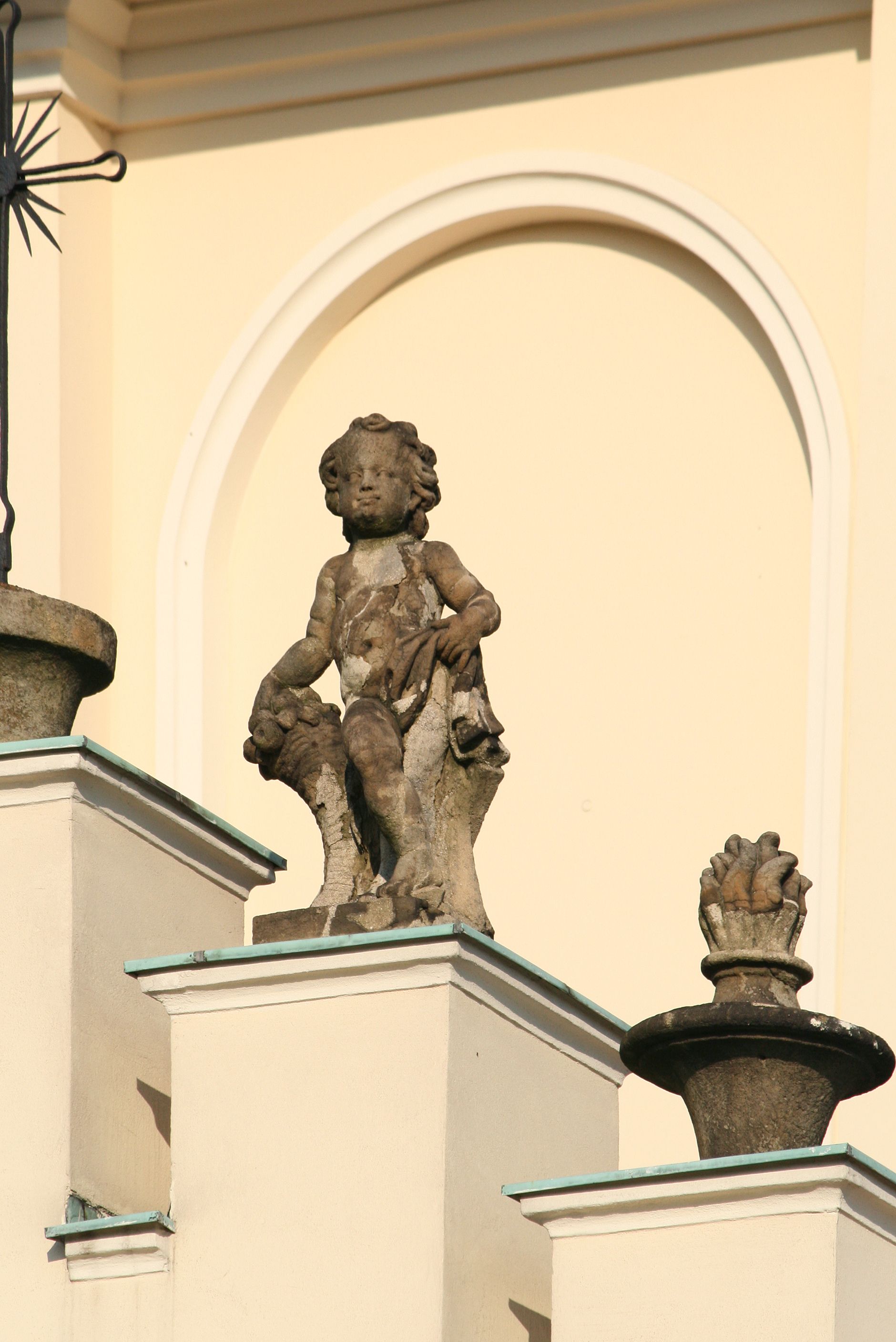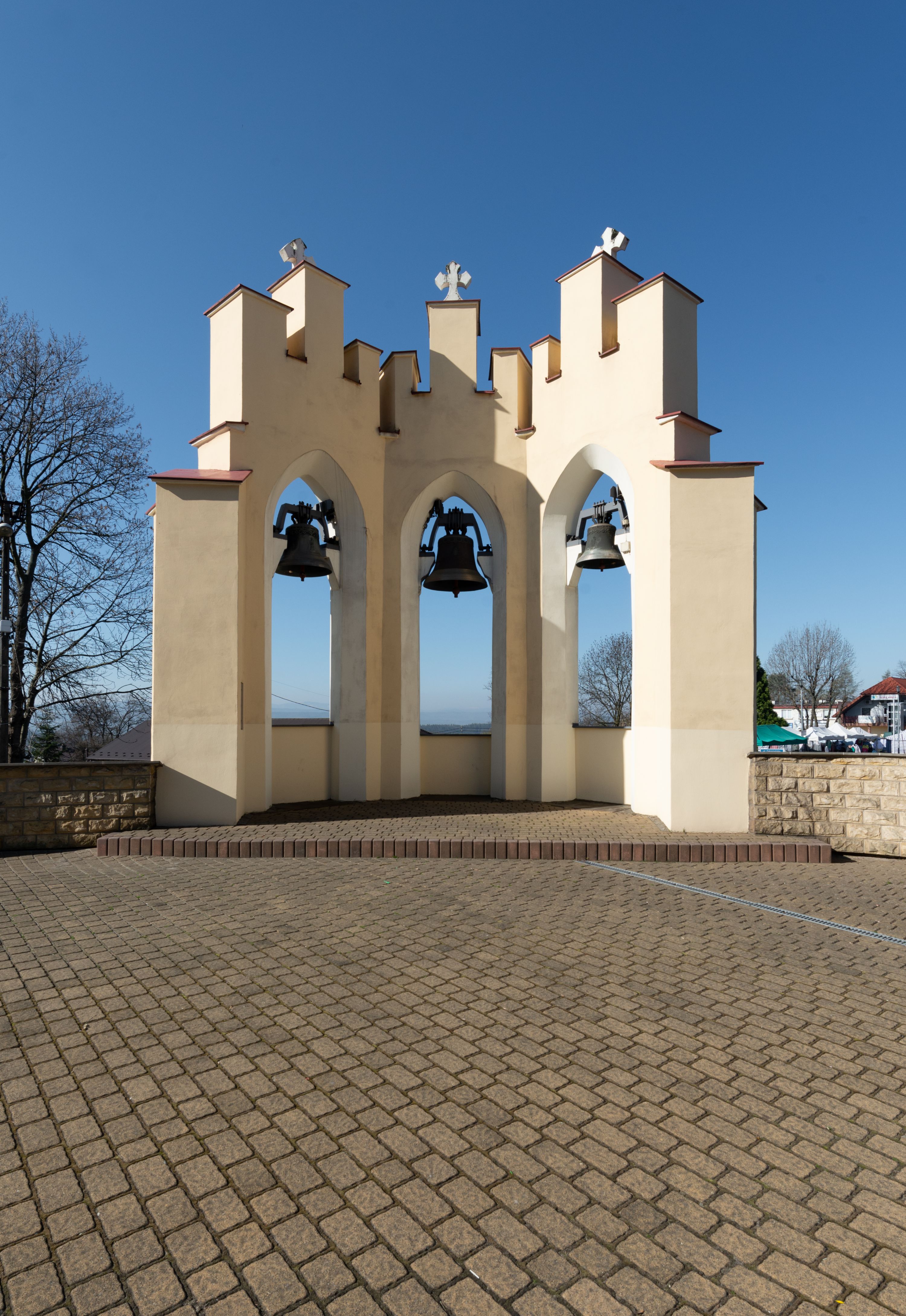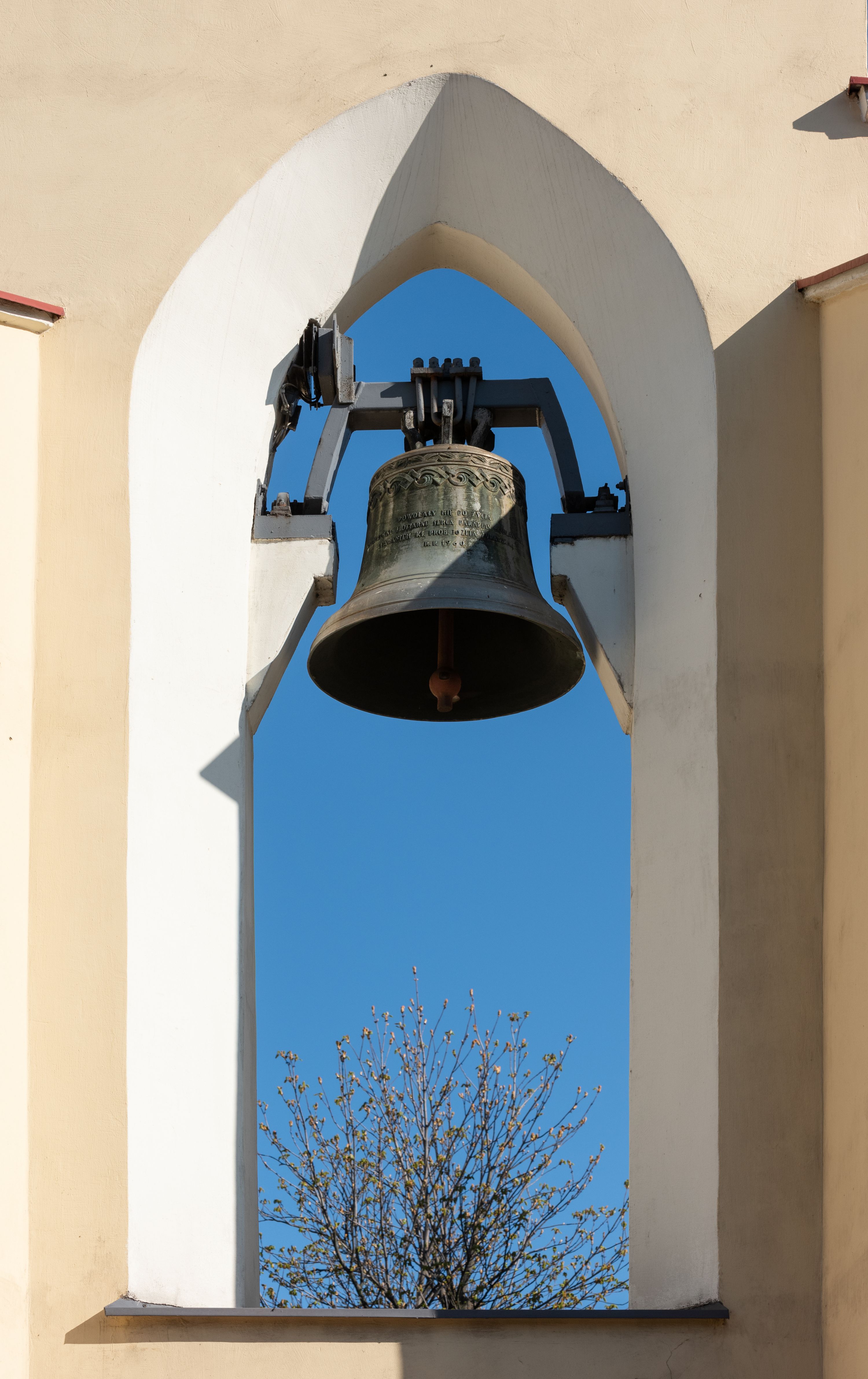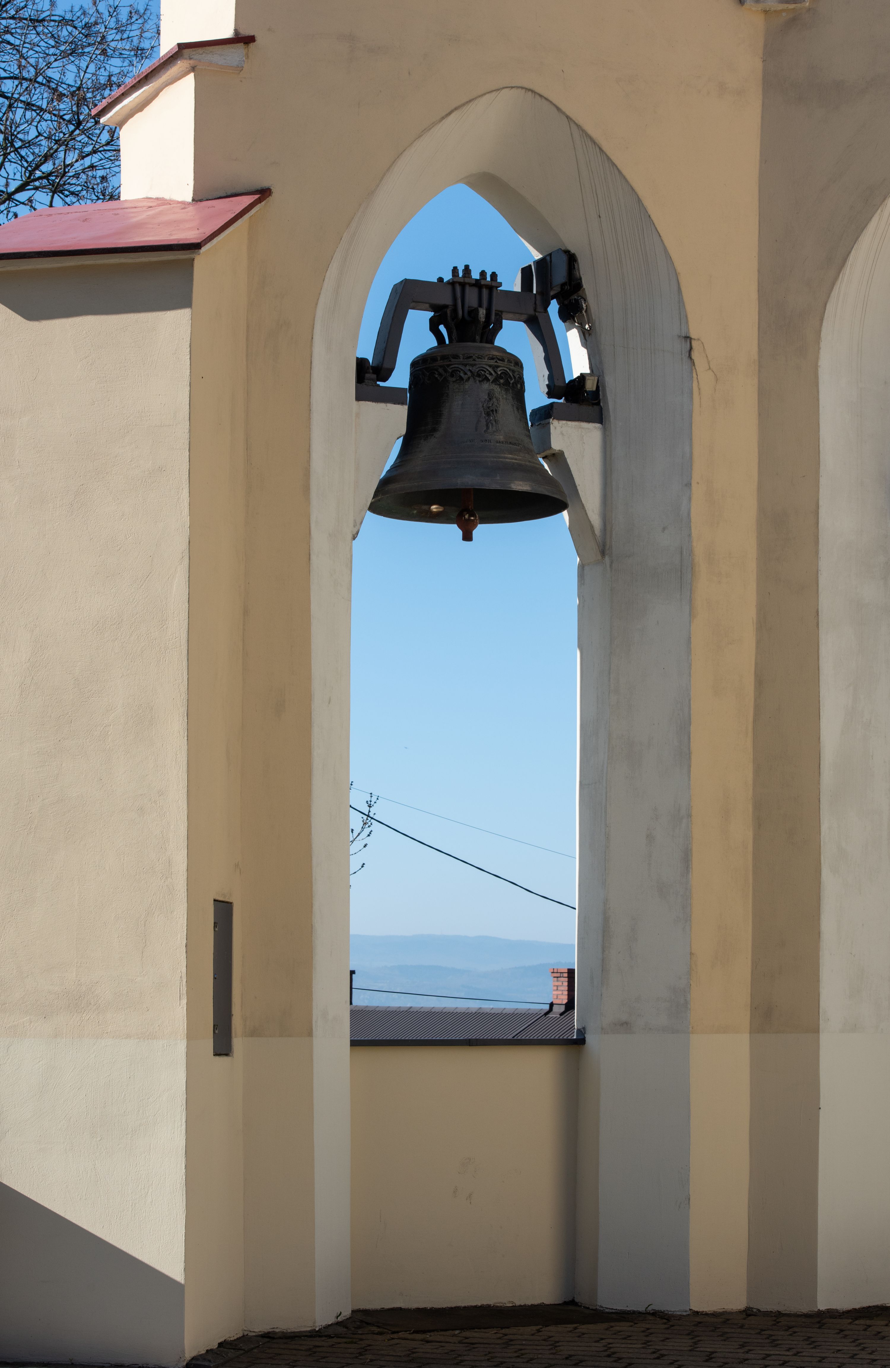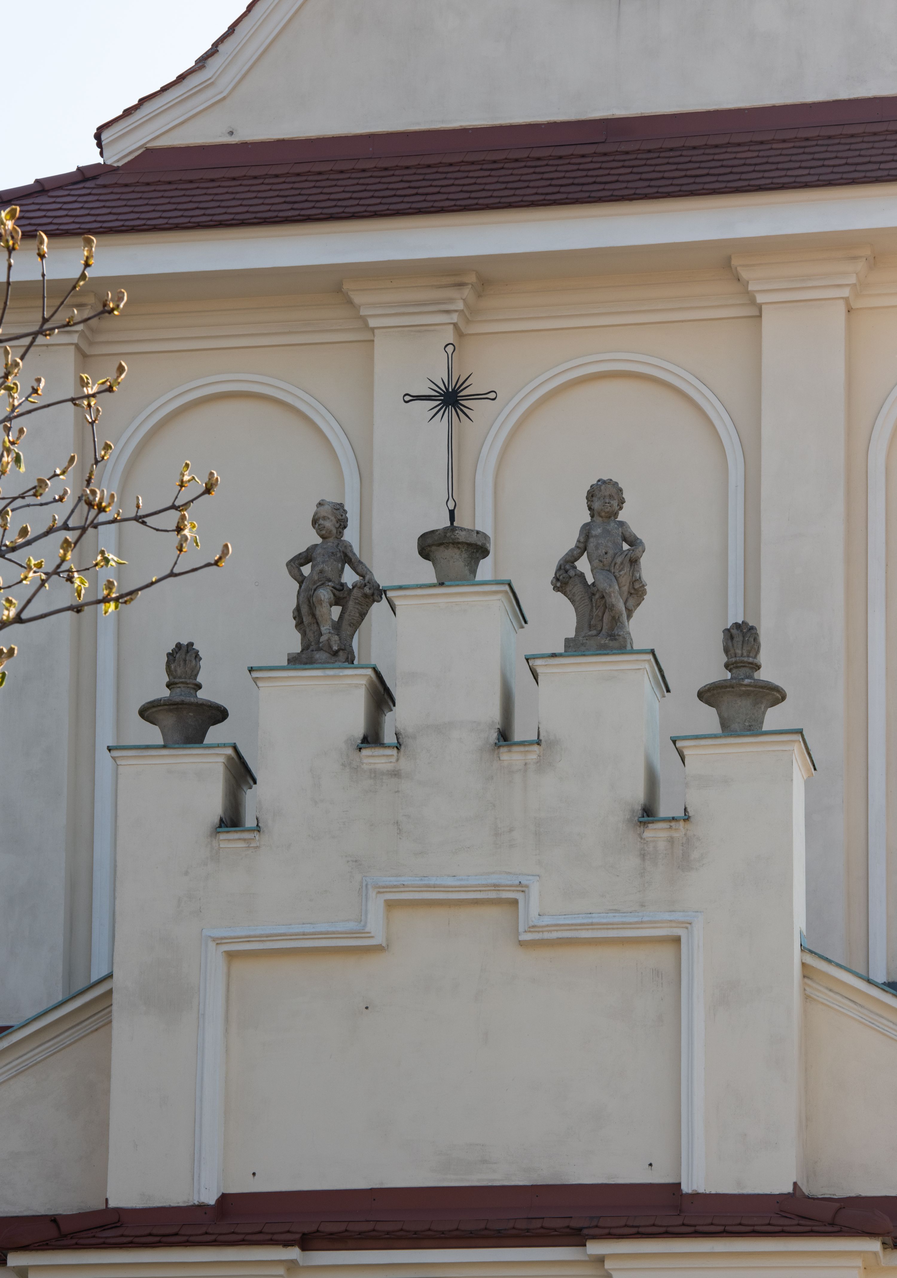 Nad nawą główną, na kalenicy, wieżyczka na sygnaturkę z latarnią i baniastym hełmem, druga na skrzyżowaniu naw, z latarnią i hełmem zakończonym krzyżem. Dach nad nawą główną i przedsionkiem dwuspadowy, nad ramionami transeptu trójspadowym,nad prezbiterium zakończony wielobocznie, na przybudówkach dachy pulpitowe, dwuspadowe i wielospadowe. Dachy kryte dachówką ceramiczną, wieżyczki blachą.