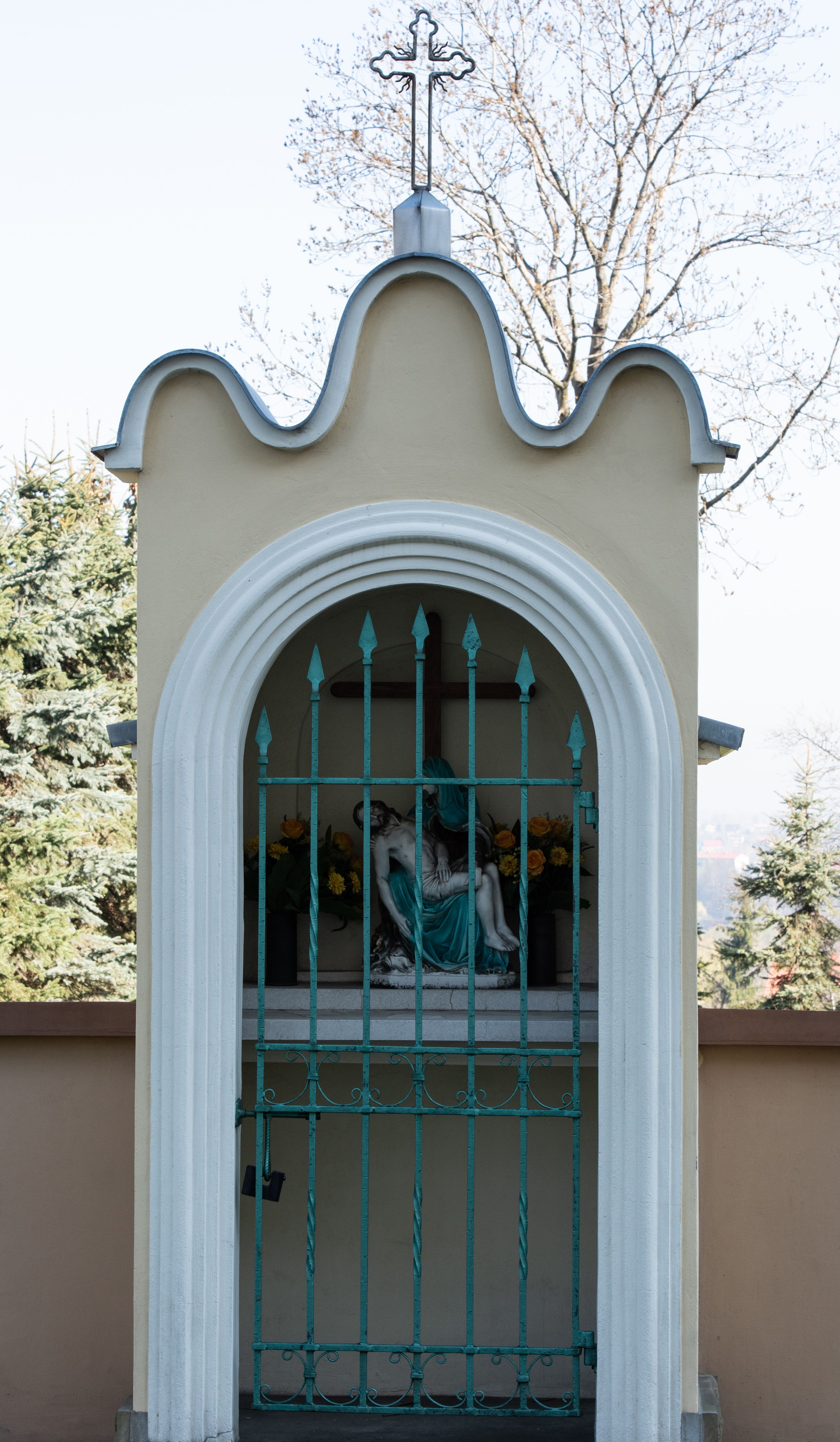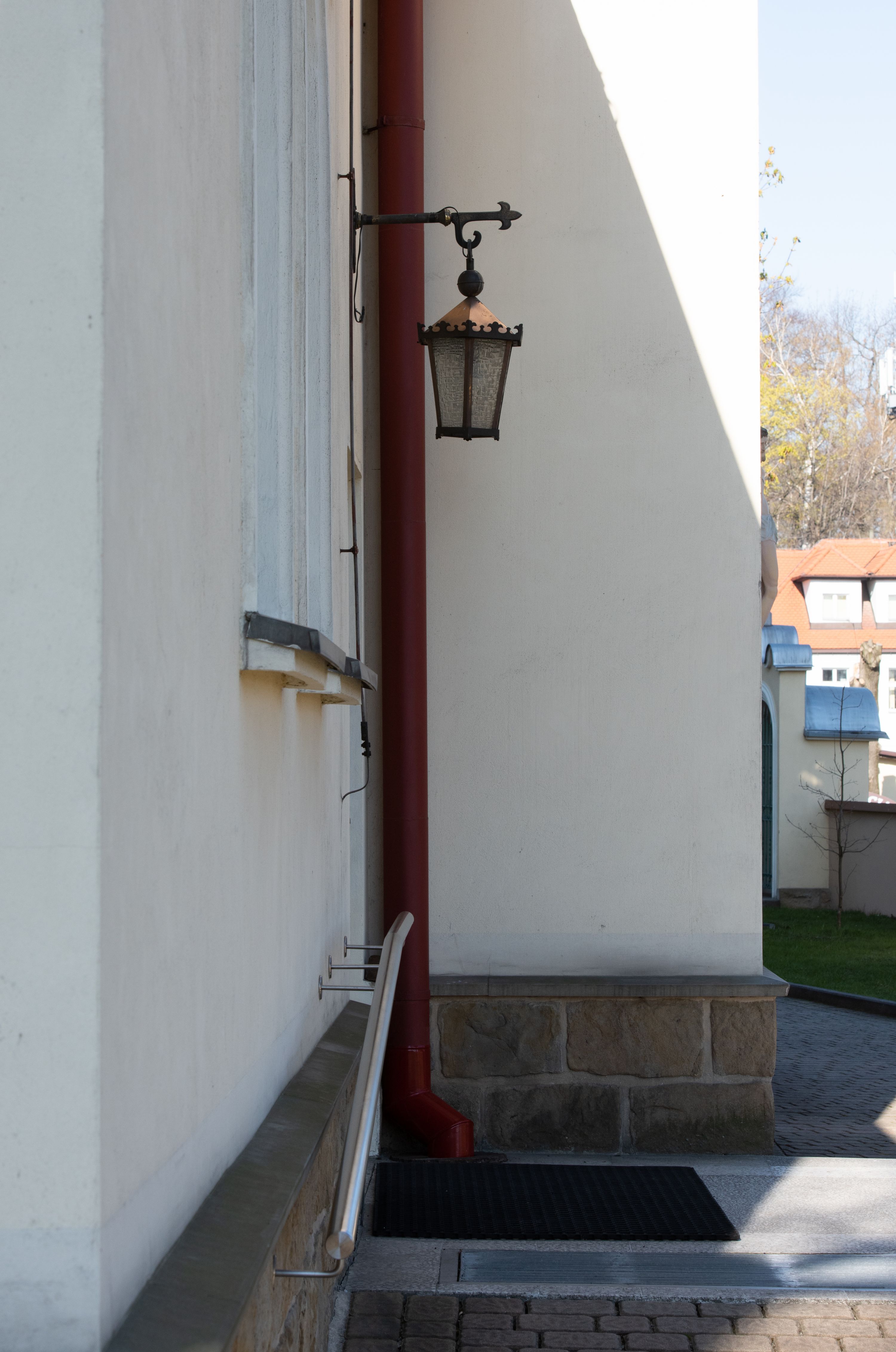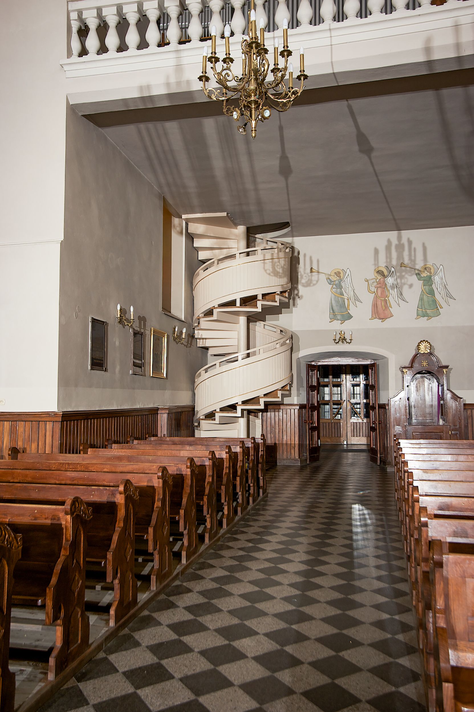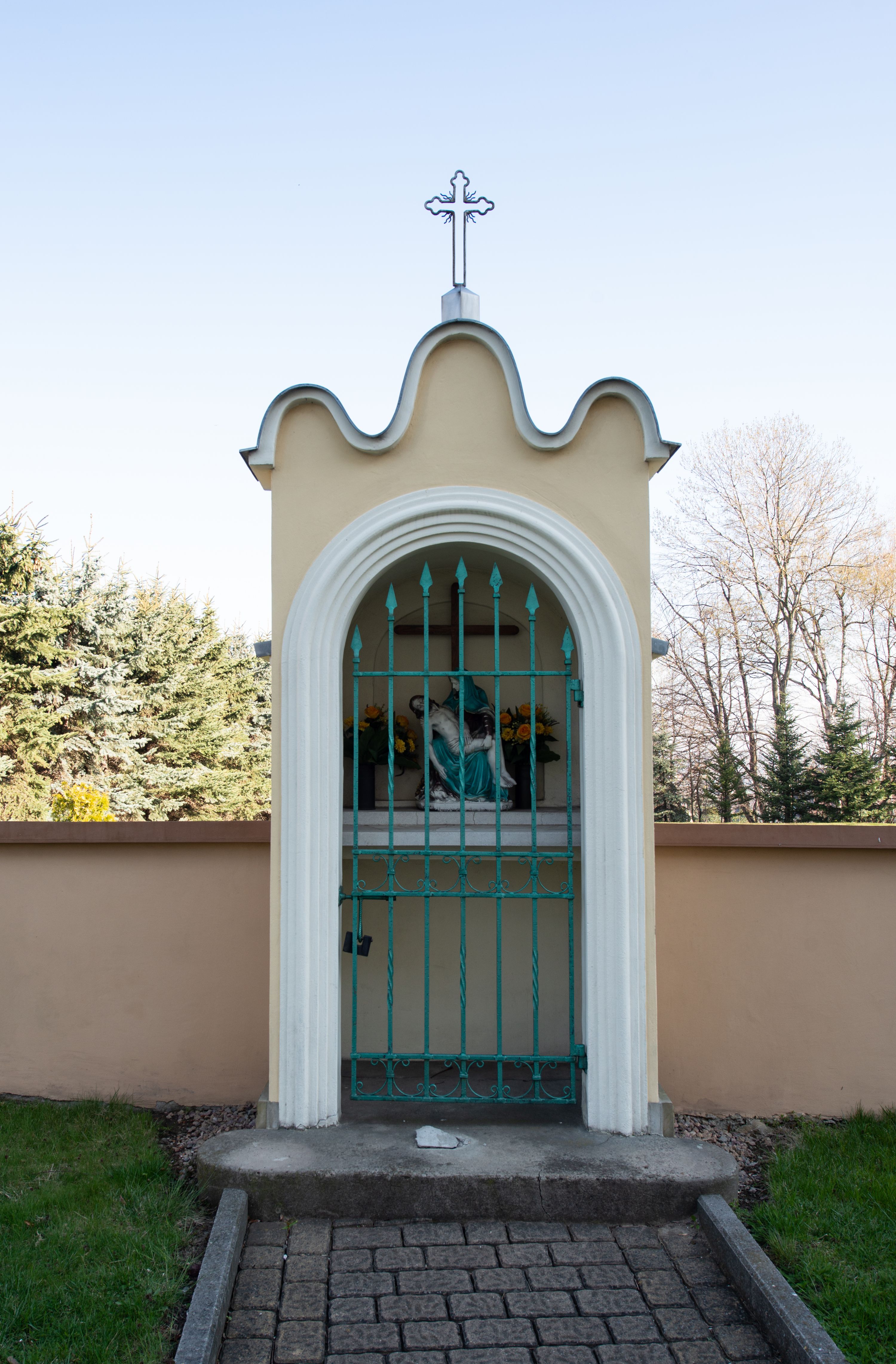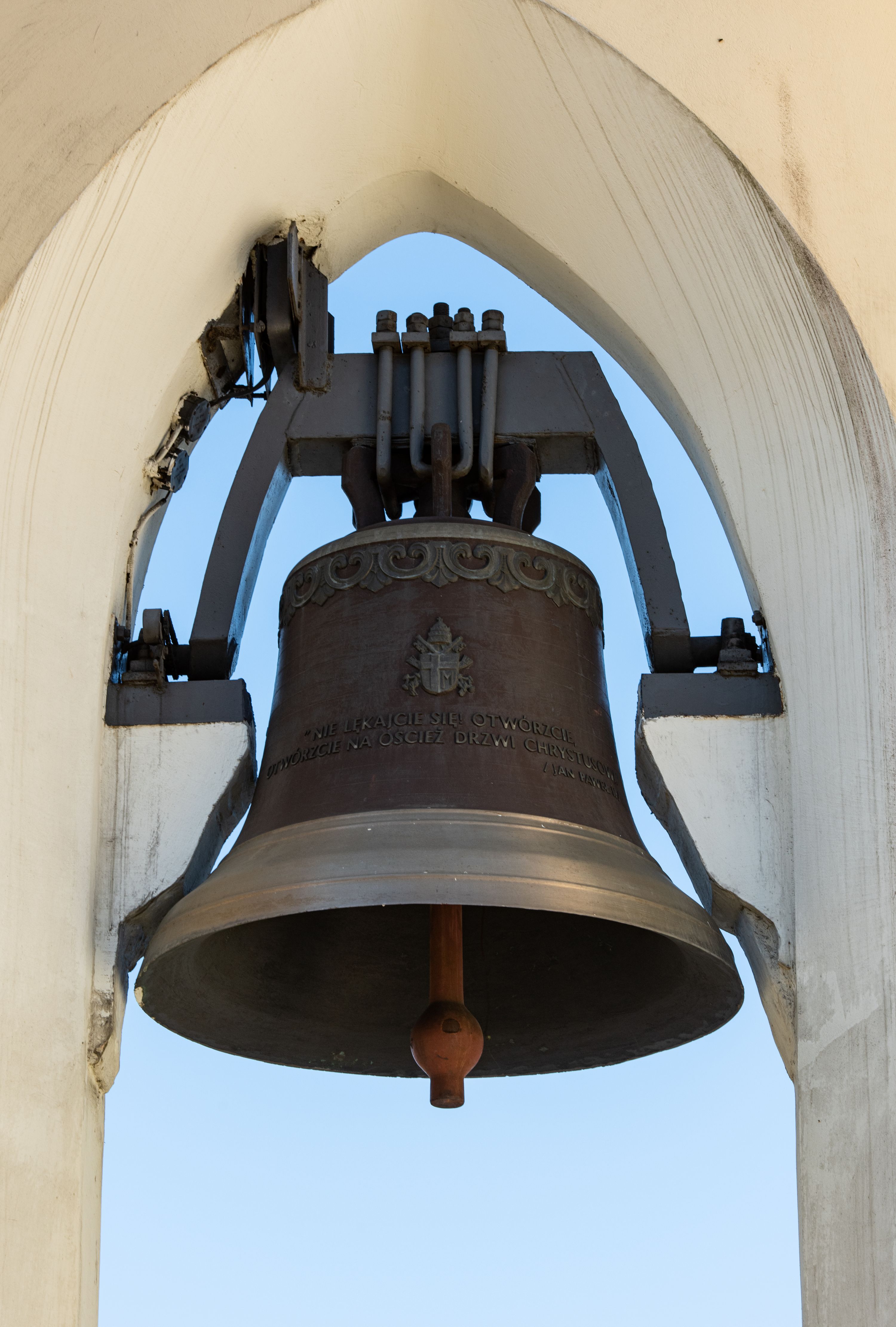 Nad nawą główną, na kalenicy, wieżyczka na sygnaturkę z latarnią i baniastym hełmem, druga na skrzyżowaniu naw, z latarnią i hełmem zakończonym krzyżem. Dach nad nawą główną i przedsionkiem dwuspadowy, nad ramionami transeptu trójspadowym,nad prezbiterium zakończony wielobocznie, na przybudówkach dachy pulpitowe, dwuspadowe i wielospadowe. Dachy kryte dachówką ceramiczną, wieżyczki blachą.
