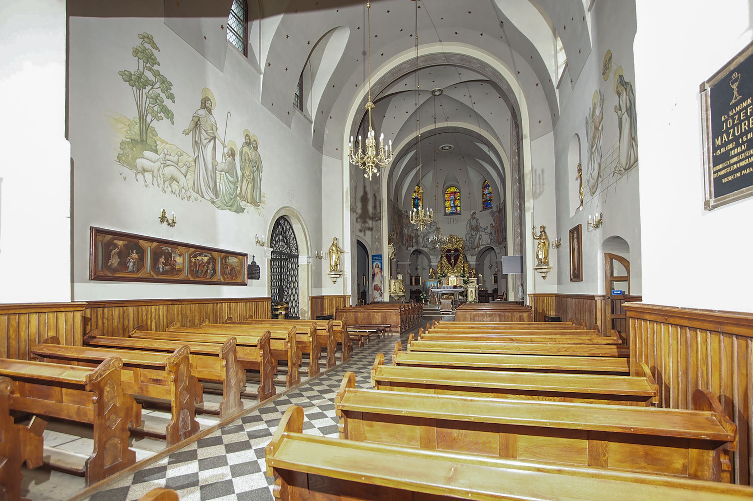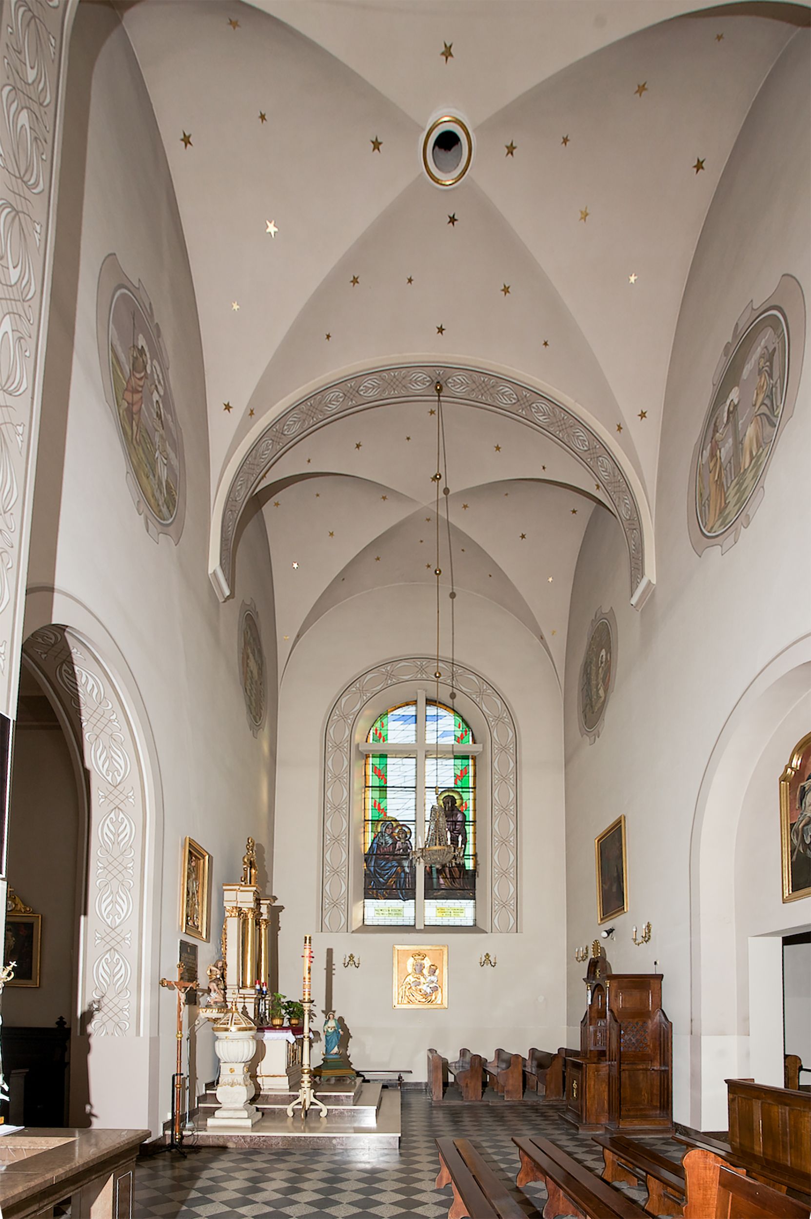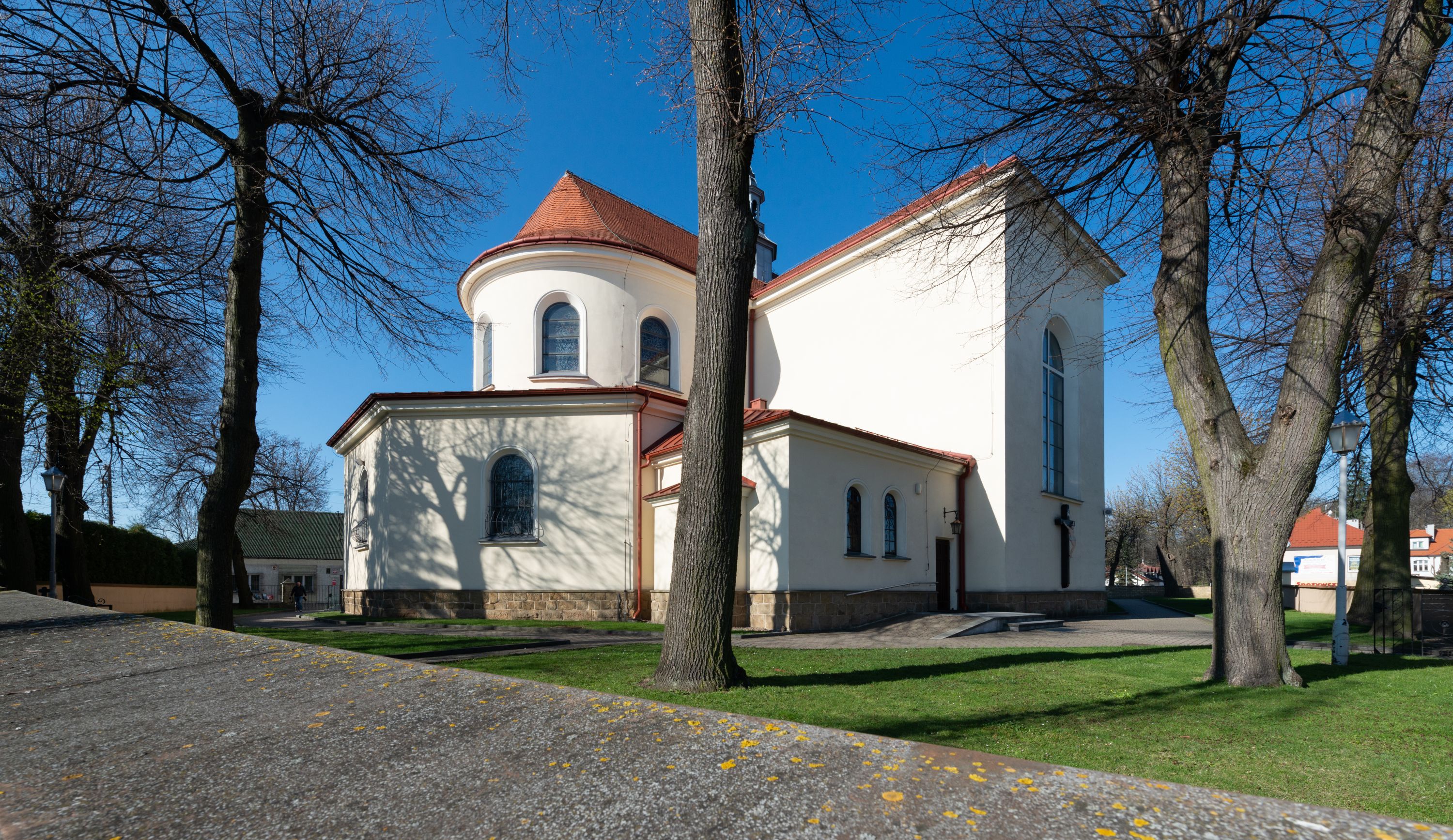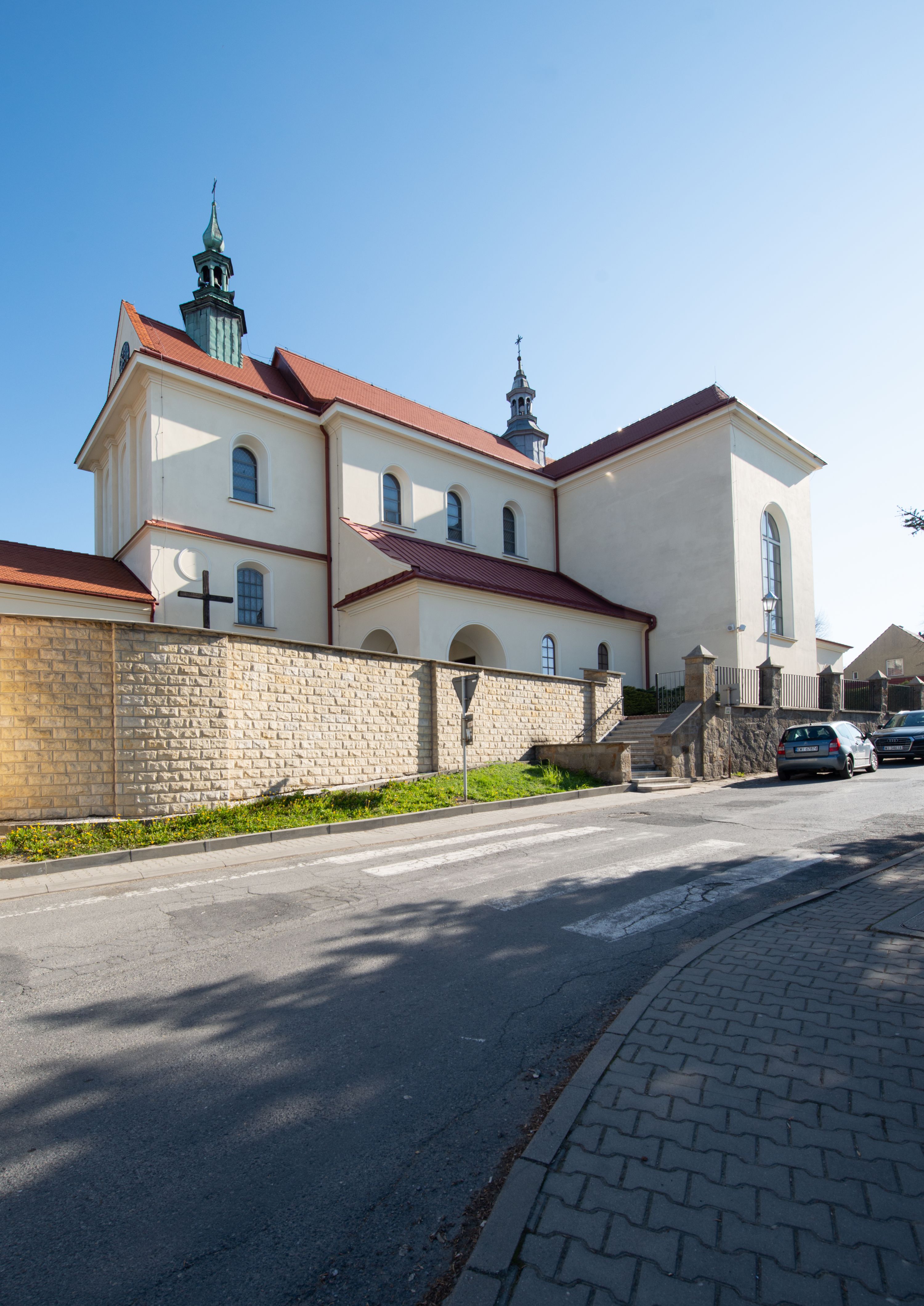 Prezbiterium zamknięte półokrągło, z obejściem przeprutym do niego arkadami wspartymi na filarach. Ściany nawy i prezbiterium gładkie, przekryte sklepieniem kolebkowym z lunetami, w których mieszczą się okna. Transept i przecięcie naw sklepione krzyżowo. Na ścianach polichromia figuralna ze scenami z Nowego Testamentu, w partii sklepienia drobne, złote gwiazdki. Od zachodu chór zatopiony w występującym asymetrycznie murze, z tralkową balustradą. W prezbiterium siedem okien w kształcie stojącego prostokąta zamkniętego łukiem pełnym wypełnionych witrażami, w nawie sześć okien, w ramionach transeptu po jednym, czterodzielnym, wypełnionym witrażem, na wysokości chóru po dwa z każdej strony. Główne wejście od zachodu przez kruchtę. Fasada poprzedzona przedsionkiem o podziałach ramowych, z prostokątnym wejściem na osi, flankowanym parą pilastrów i prostokątnymi płycinami. Kondygnację wieńczy pełne belkowanie z wysuniętym gzymsem podtrzymującym daszek i trójkątny, schodkowy szczyt zakończony postumentami. Na centralnym krzyż, na sąsiadujących figury dzieci z rogami obfitości, a na zewnętrznych wazony płomieniste; szczyt ujmują postumenty z kulami. Fasada dwukondygnacyjna ze szczytem. Kondygnacja trójosiowa, rozdzielona pilastrami, o polach wypełnionych blendami w kształcie stojących prostokątów zamkniętych łukiem pełnym; szczyt trójkątny, z tarczą zegarową pośrodku. Budynek kościoła o wyraźnych podziałach na bryły składowe, ściany gładkie, przeprute oknami, z gzymsami pod krawędziami dachu.